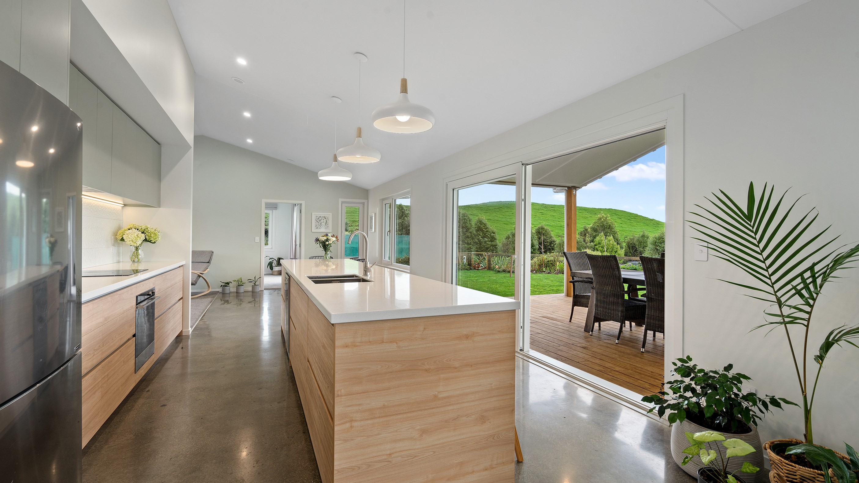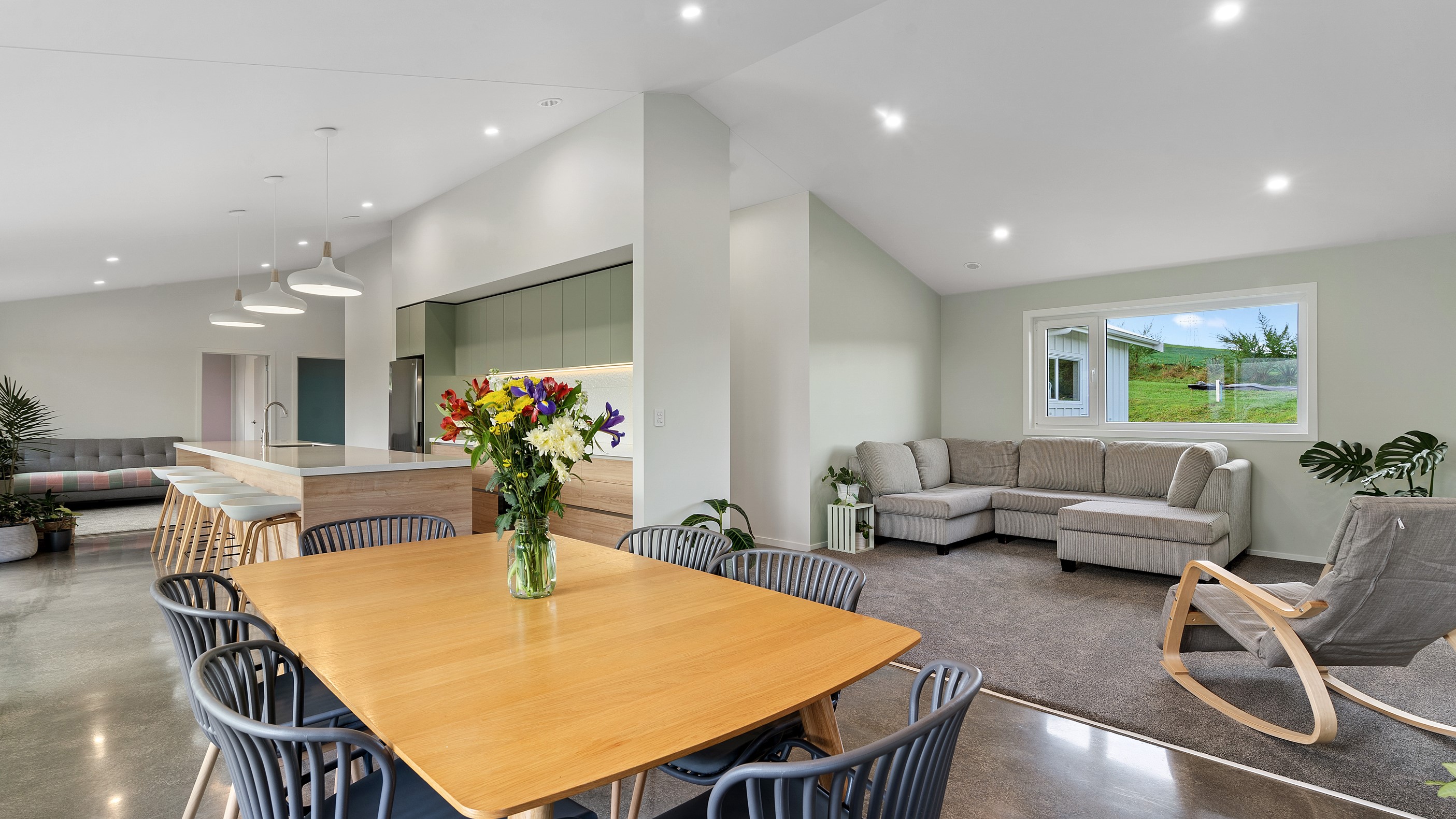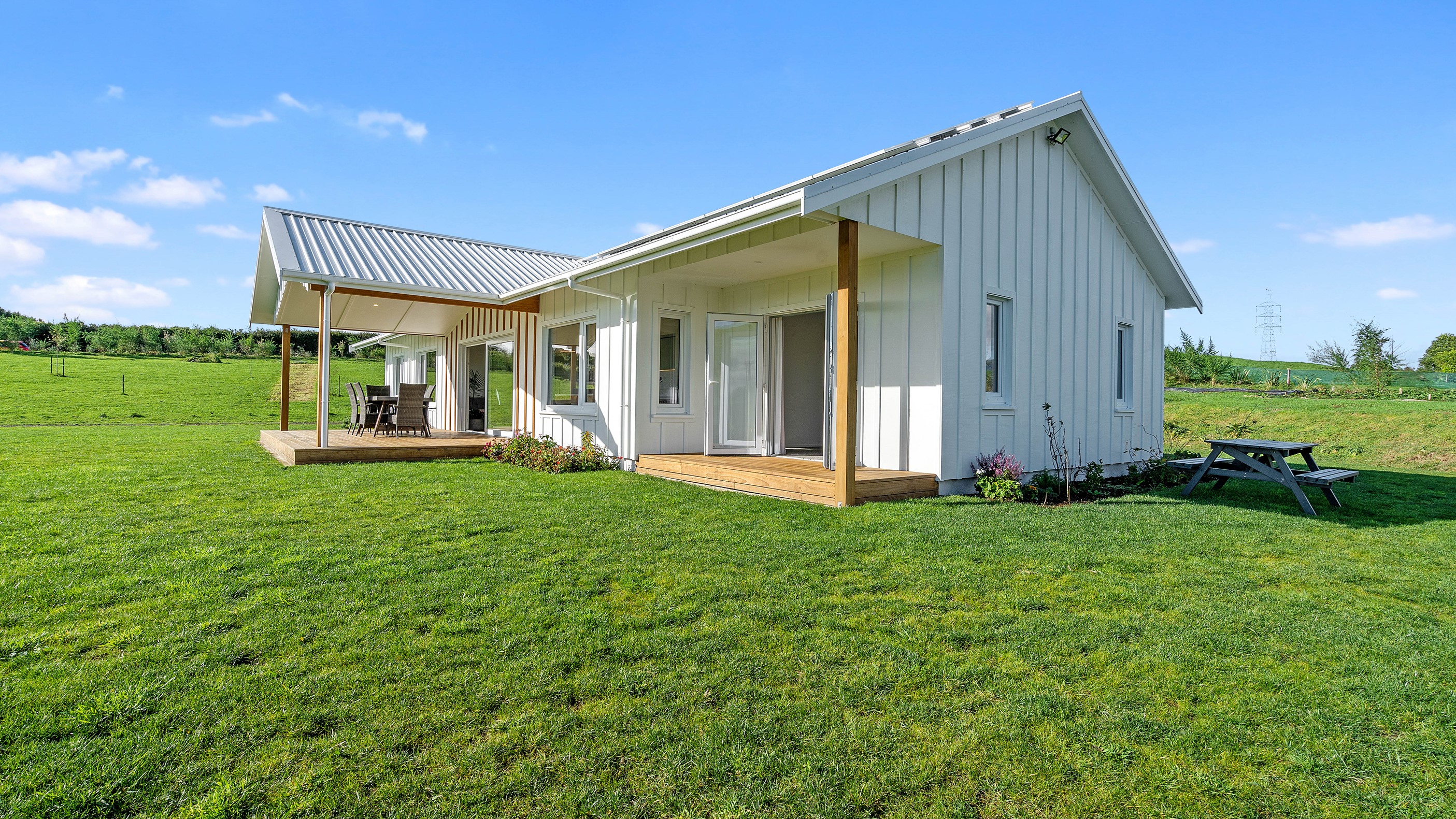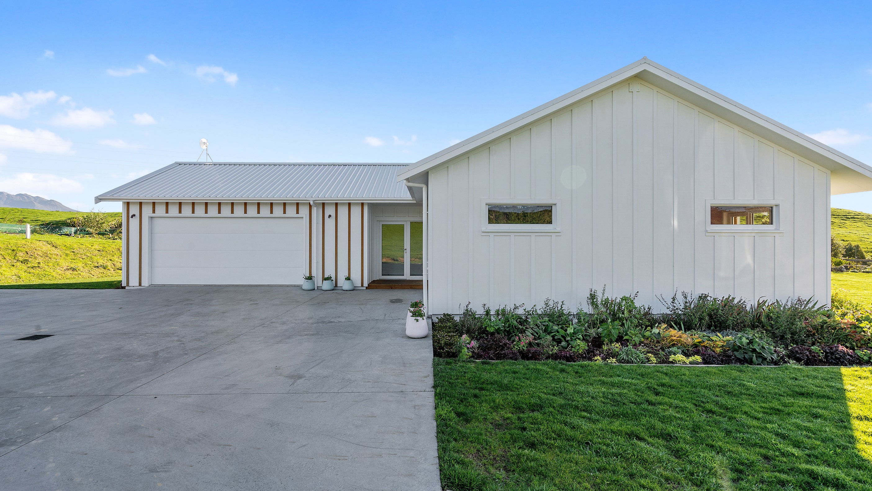 With a backdrop of rolling green hills and tranquil countryside, this four-bedroom, two-bathroom rural home is perfectly positioned for a young family. The design, with a 200sqm footprint, has been cleverly thought out to minimise wasted space and maximise family harmony. High-raking ceilings combine with open-plan living and large windows to create a sense of space and light. The living area opens out to a portico for all-weather entertaining. Meeting the internationally recognised Passive House standard, the home delivers comfort, health and energy efficiency to the occupants. The heat recovery ventilation system works quietly in the background, allowing for a constant supply of fresh air. In addition, uPVC joinery adds to the energy efficiency of the home, while enhancing the cottage-vibe aesthetic. Outside, white board-and-batten cladding with natural detailing and a gabled portico give a nod to Mount Taranaki sitting majestically in the background. With an orchard and edible gardens, the homeowners can enjoy healthy eating and time outdoors.