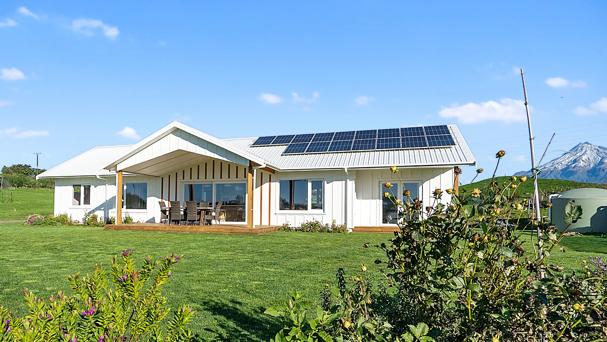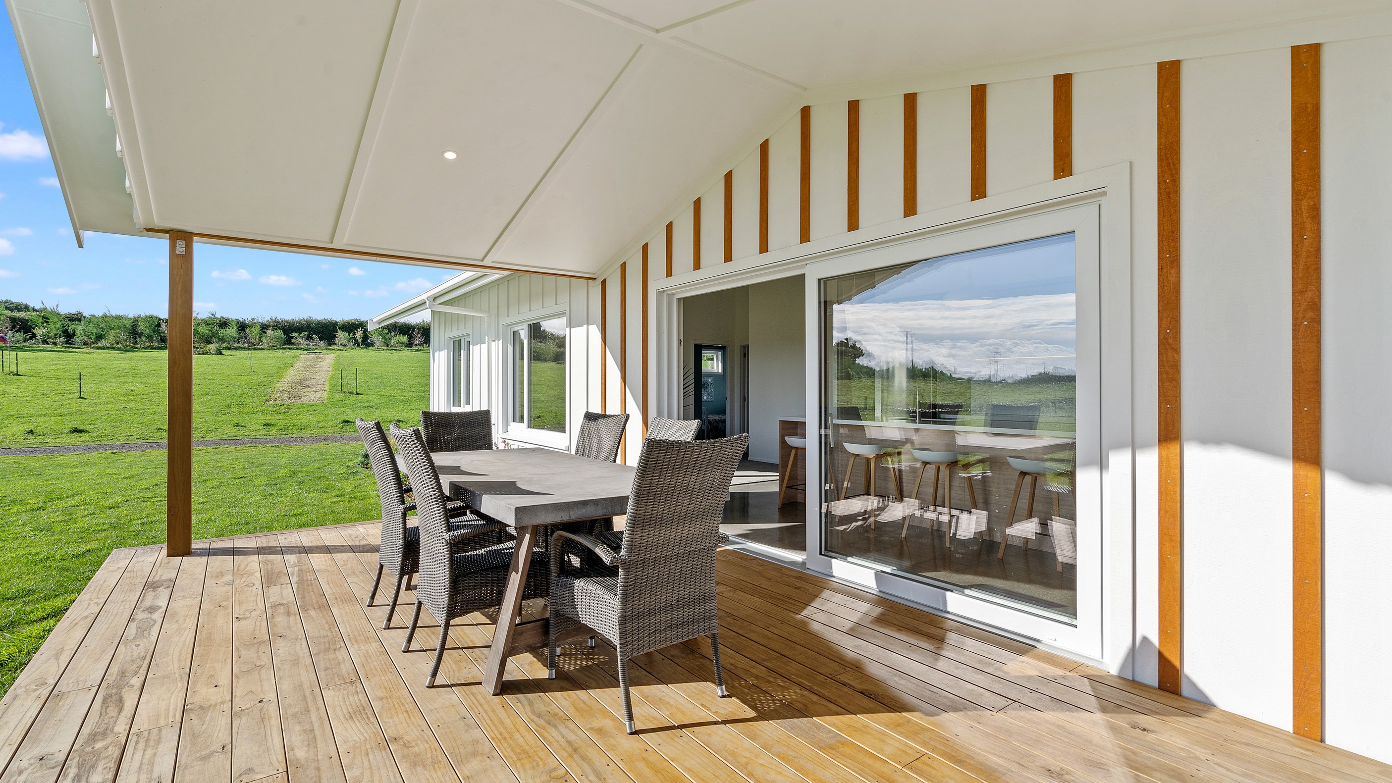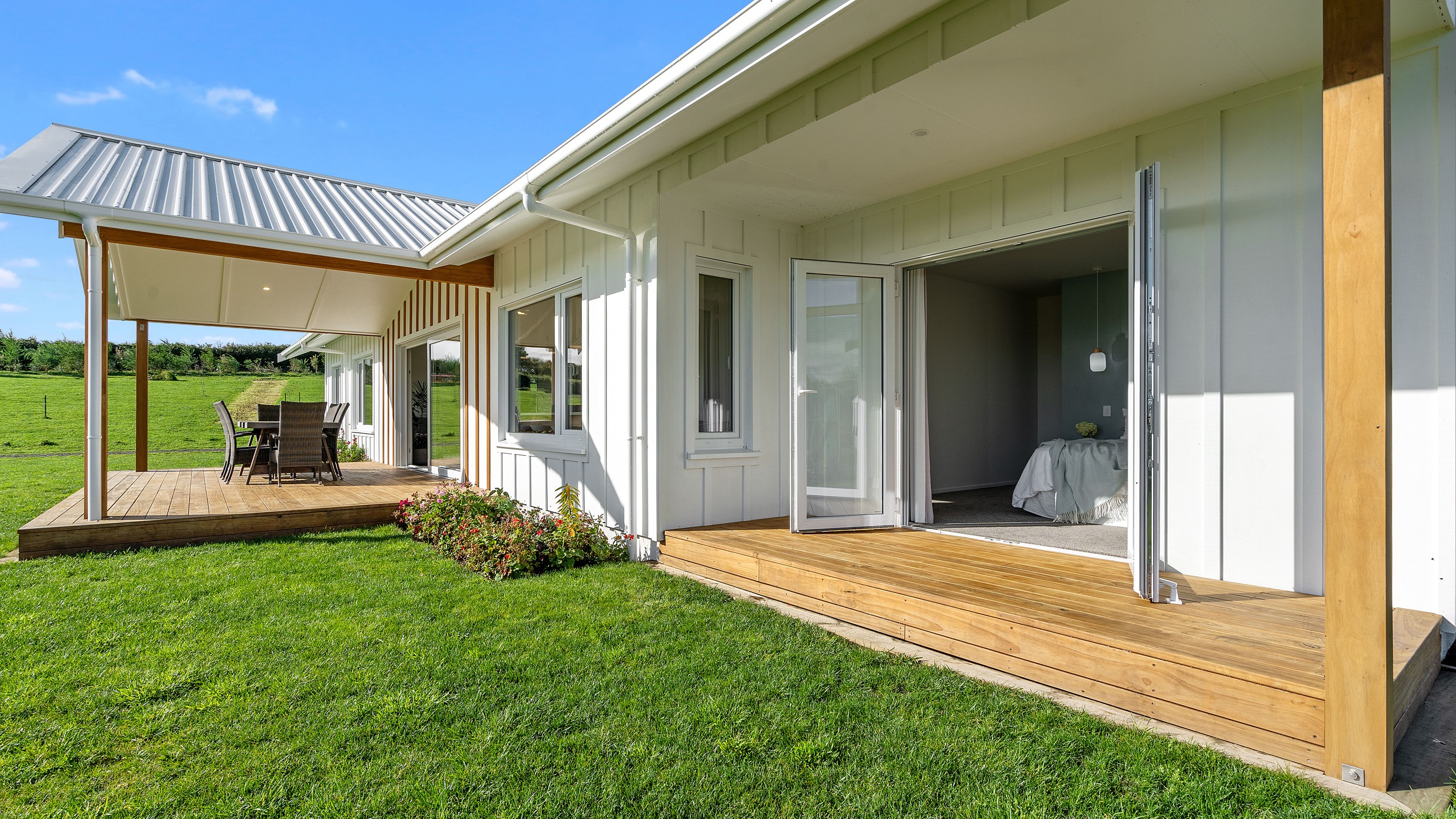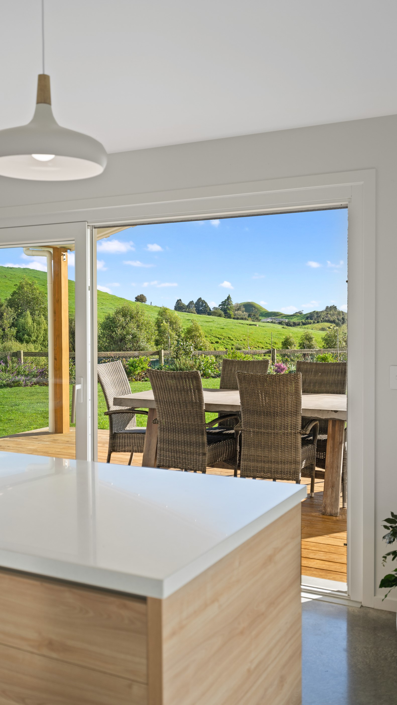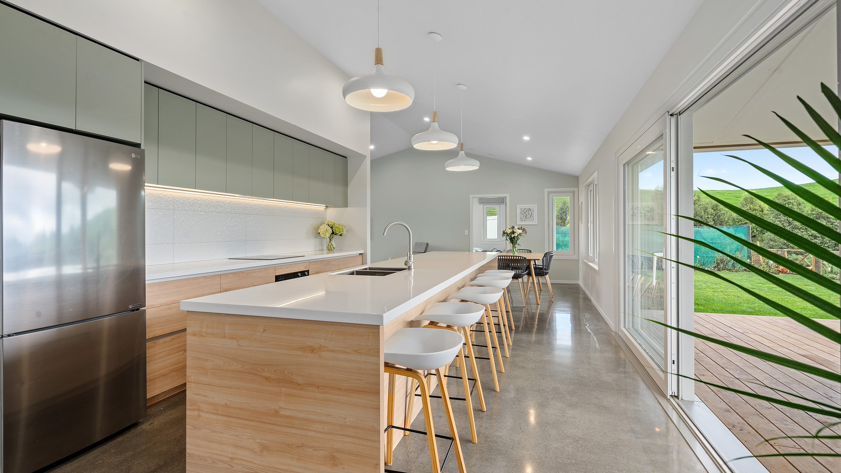 With a backdrop of rolling green hills and tranquil countryside, this four-bedroom, two-bathroom rural home is perfectly positioned for a young family. The design, with a 200sqm footprint, has been cleverly thought out to minimise wasted space and maximise family harmony. High-raking ceilings combine with open-plan living and large windows to create a sense of space and light. The living area opens out to a portico for all-weather entertaining. Meeting the internationally recognised Passive House standard, the home delivers comfort, health and energy efficiency to the occupants. The heat recovery ventilation system works quietly in the background, allowing for a constant supply of fresh air. In addition, uPVC joinery adds to the energy efficiency of the home, while enhancing the cottage-vibe aesthetic. Outside, white board-and-batten cladding with natural detailing and a gabled portico give a nod to Mount Taranaki sitting majestically in the background. With an orchard and edible gardens, the homeowners can enjoy healthy eating and time outdoors.