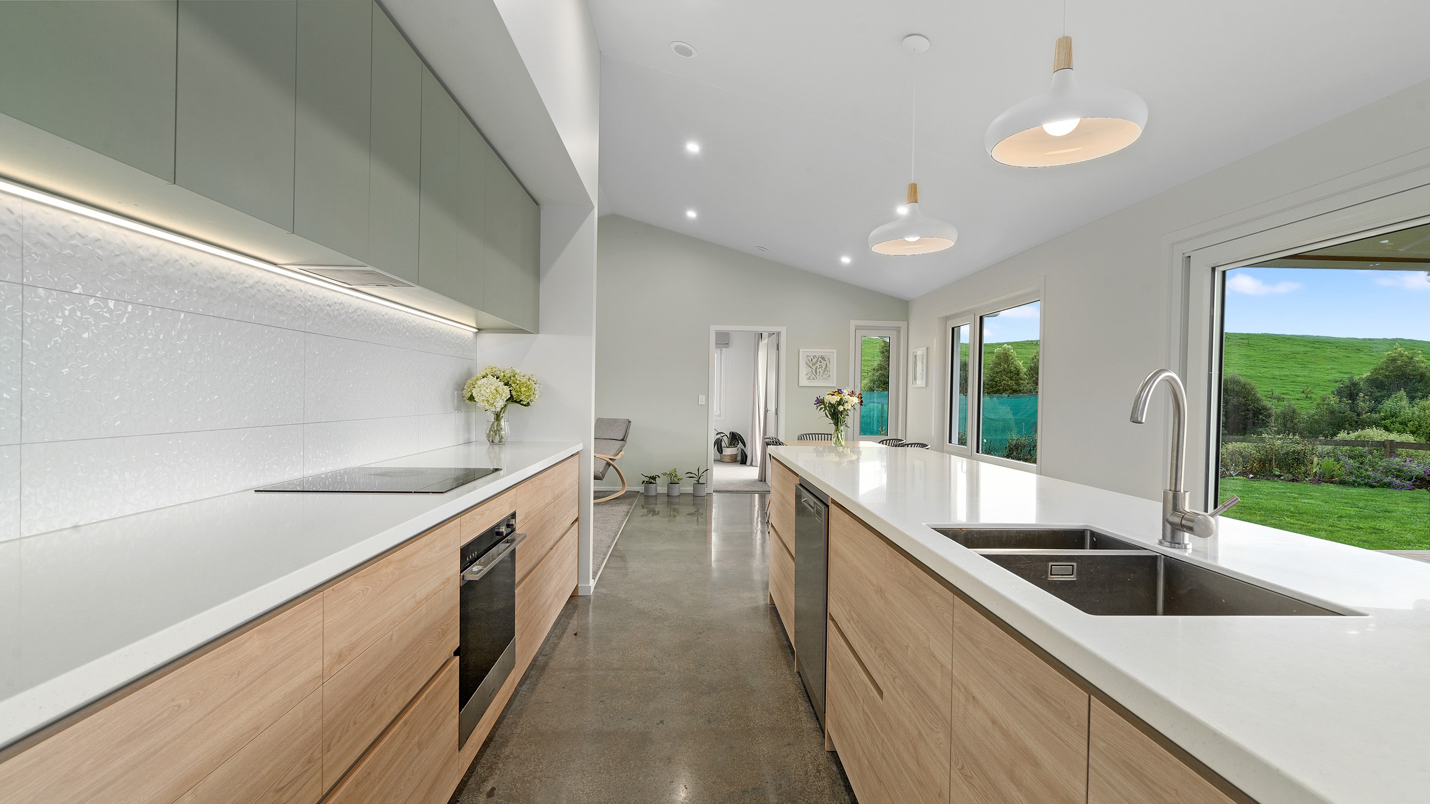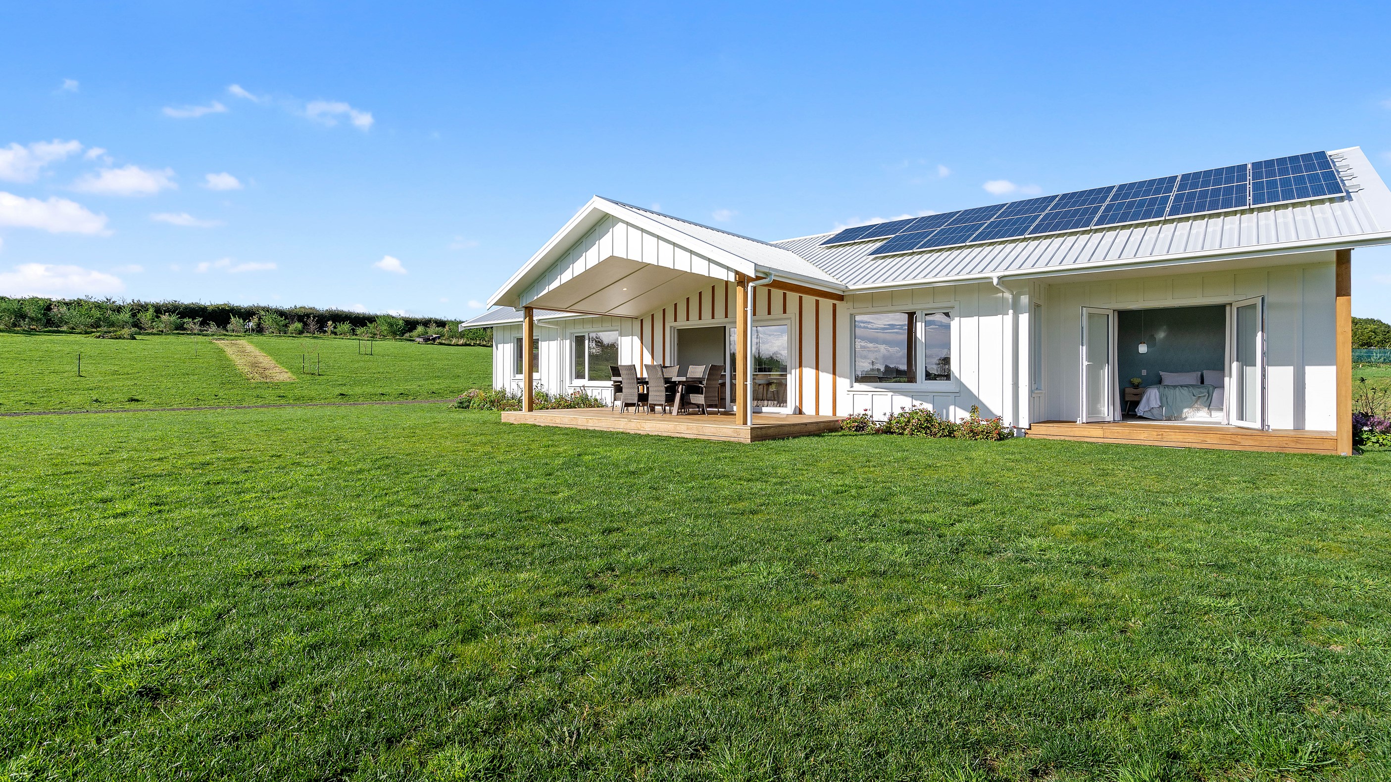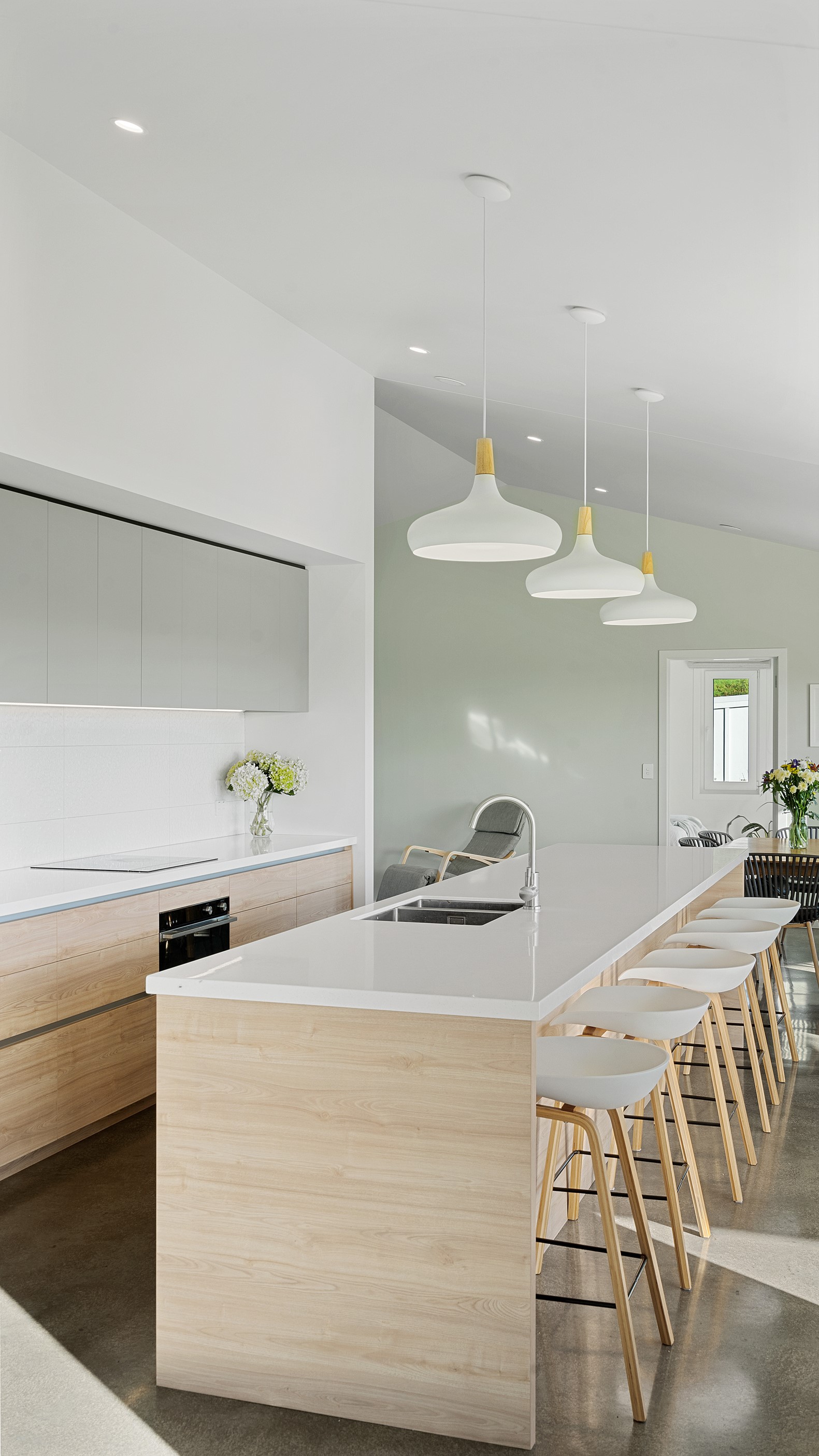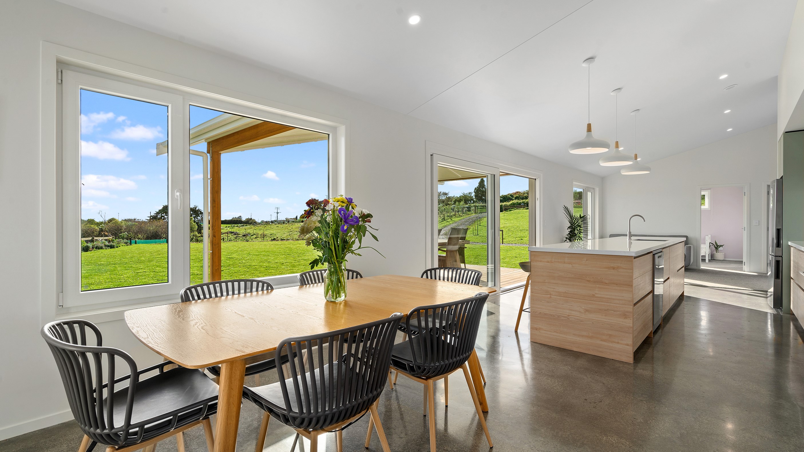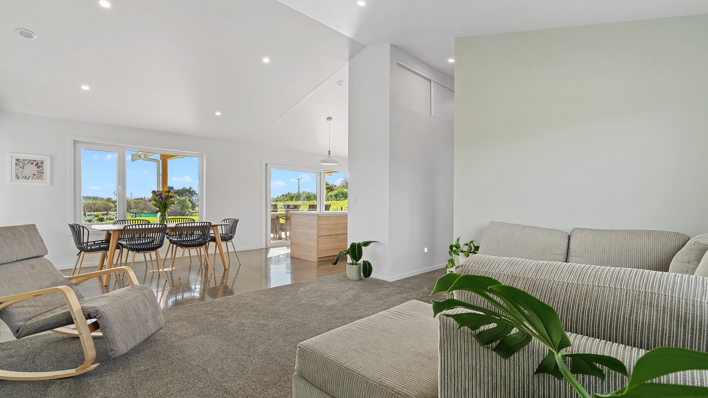 With a backdrop of rolling green hills and tranquil countryside, this four-bedroom, two-bathroom rural home is perfectly positioned for a young family. The design, with a 200sqm footprint, has been cleverly thought out to minimise wasted space and maximise family harmony. High-raking ceilings combine with open-plan living and large windows to create a sense of space and light. The living area opens out to a portico for all-weather entertaining. Meeting the internationally recognised Passive House standard, the home delivers comfort, health and energy efficiency to the occupants. The heat recovery ventilation system works quietly in the background, allowing for a constant supply of fresh air. In addition, uPVC joinery adds to the energy efficiency of the home, while enhancing the cottage-vibe aesthetic. Outside, white board-and-batten cladding with natural detailing and a gabled portico give a nod to Mount Taranaki sitting majestically in the background. With an orchard and edible gardens, the homeowners can enjoy healthy eating and time outdoors.
