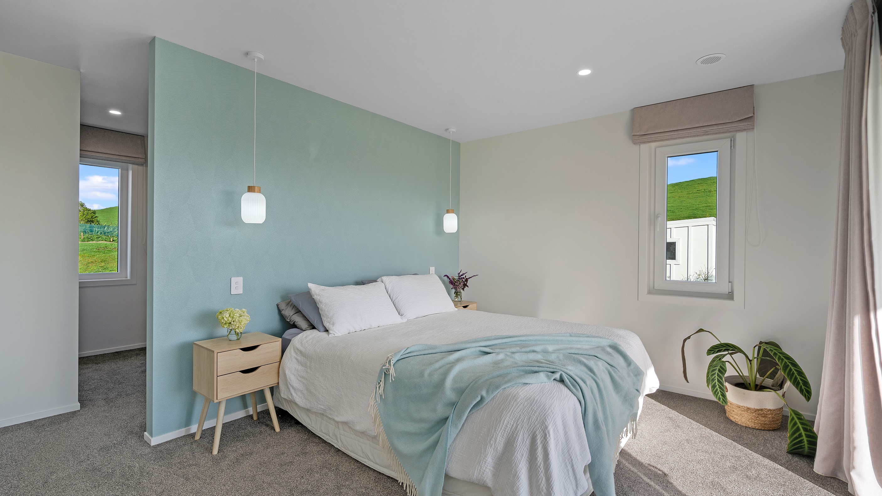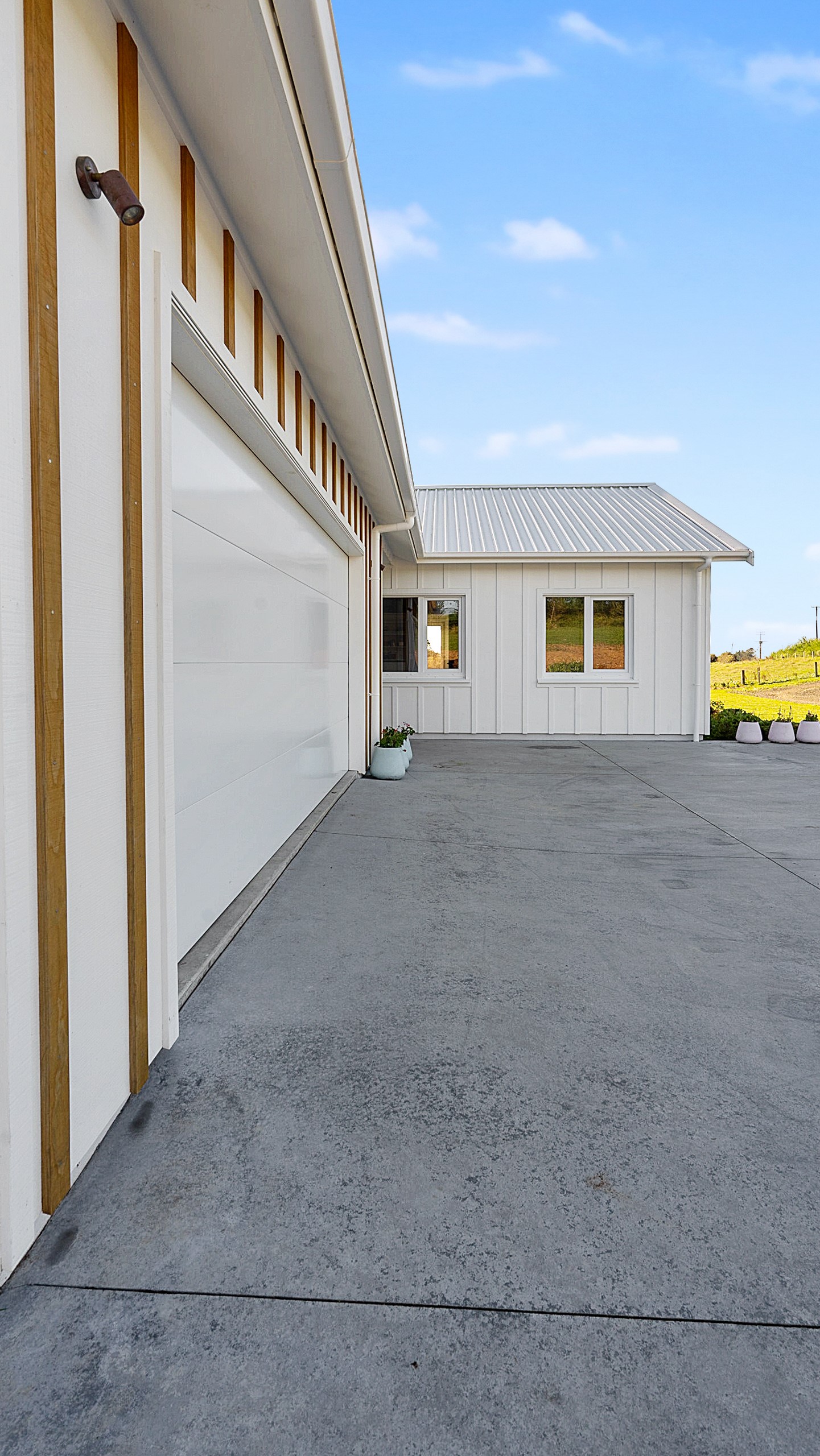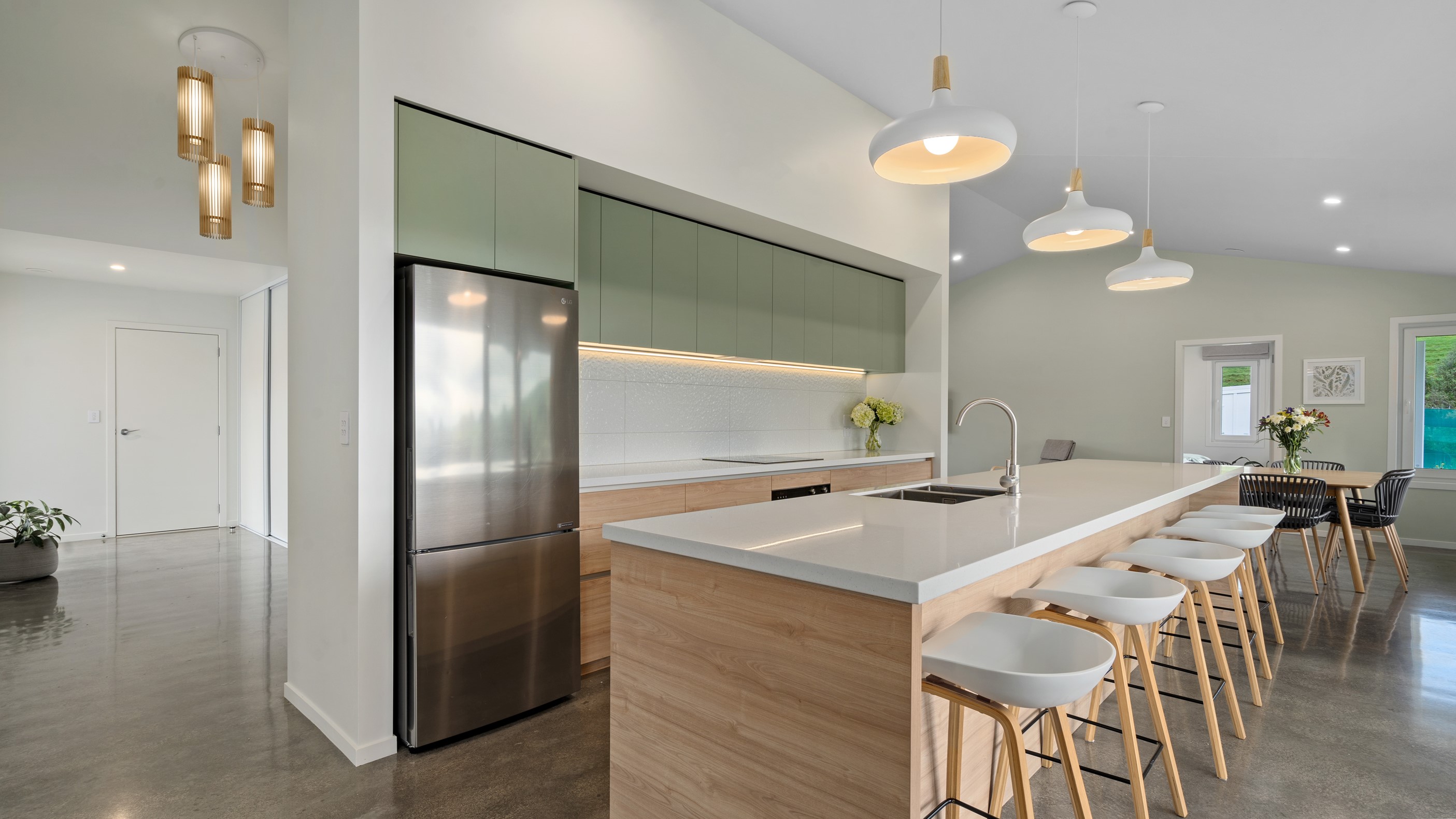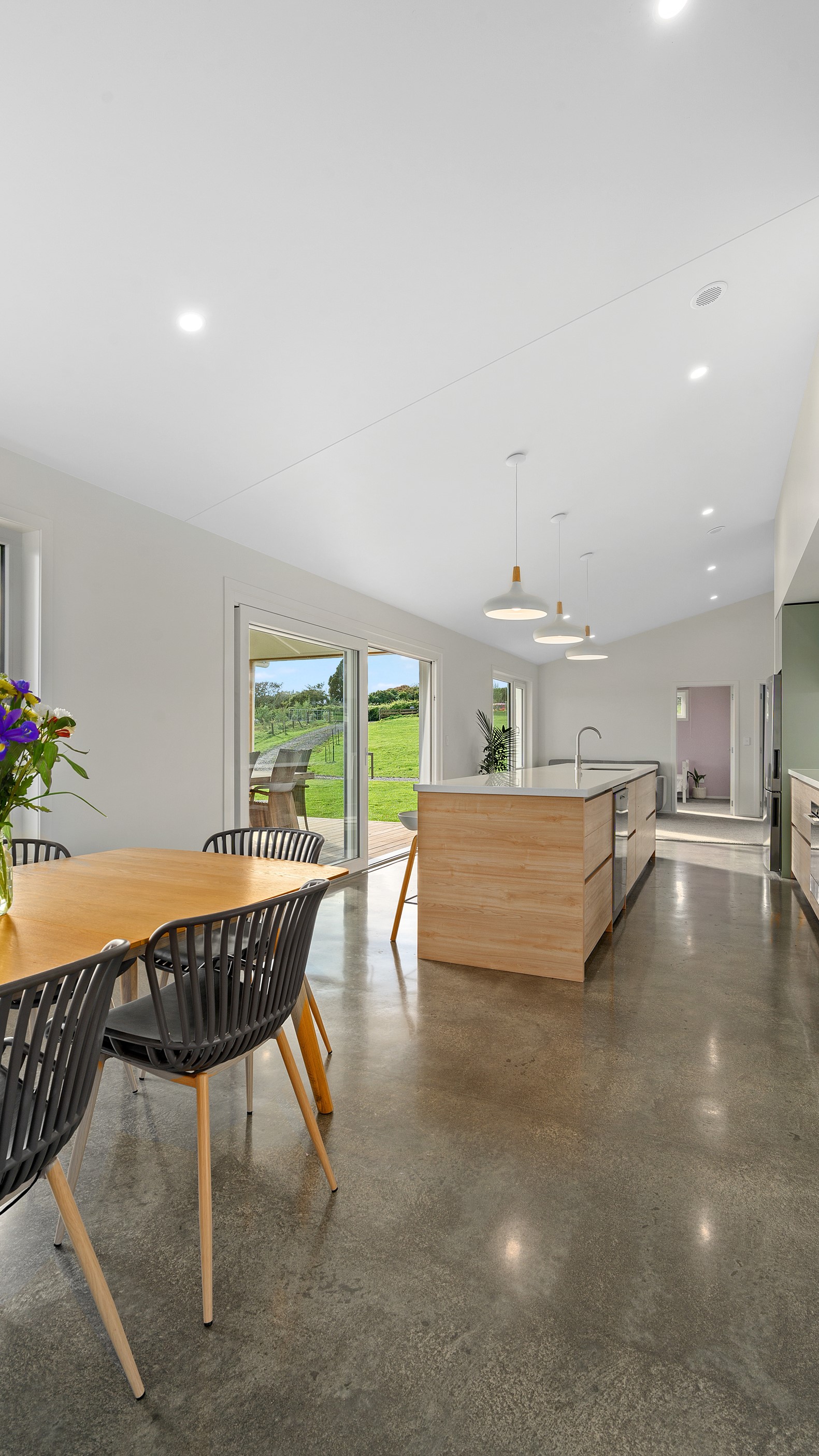 With a backdrop of rolling green hills and tranquil countryside, this four-bedroom, two-bathroom rural home is perfectly positioned for a young family. The design, with a 200sqm footprint, has been cleverly thought out to minimise wasted space and maximise family harmony. High-raking ceilings combine with open-plan living and large windows to create a sense of space and light. The living area opens out to a portico for all-weather entertaining. Meeting the internationally recognised Passive House standard, the home delivers comfort, health and energy efficiency to the occupants. The heat recovery ventilation system works quietly in the background, allowing for a constant supply of fresh air. In addition, uPVC joinery adds to the energy efficiency of the home, while enhancing the cottage-vibe aesthetic. Outside, white board-and-batten cladding with natural detailing and a gabled portico give a nod to Mount Taranaki sitting majestically in the background. With an orchard and edible gardens, the homeowners can enjoy healthy eating and time outdoors.