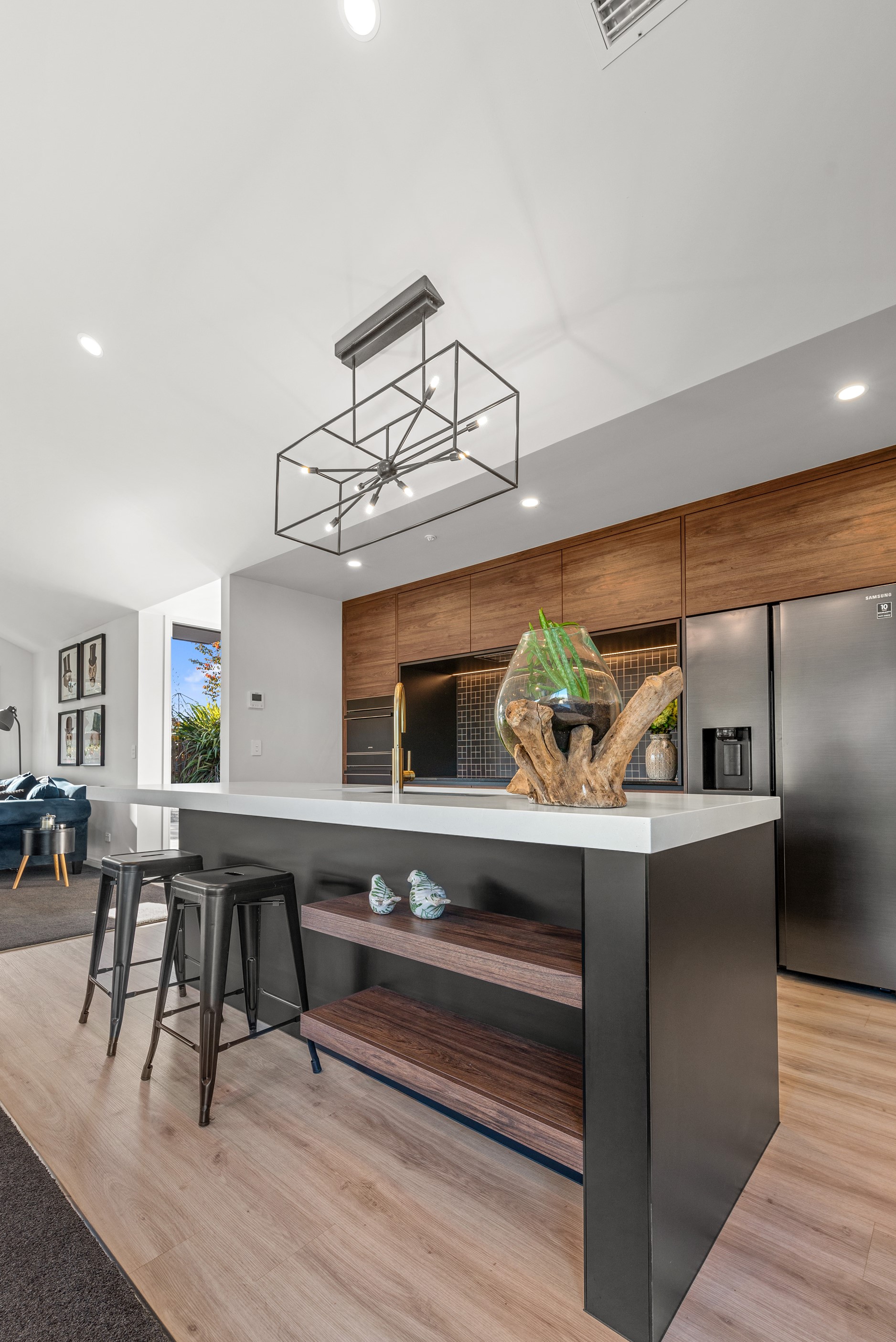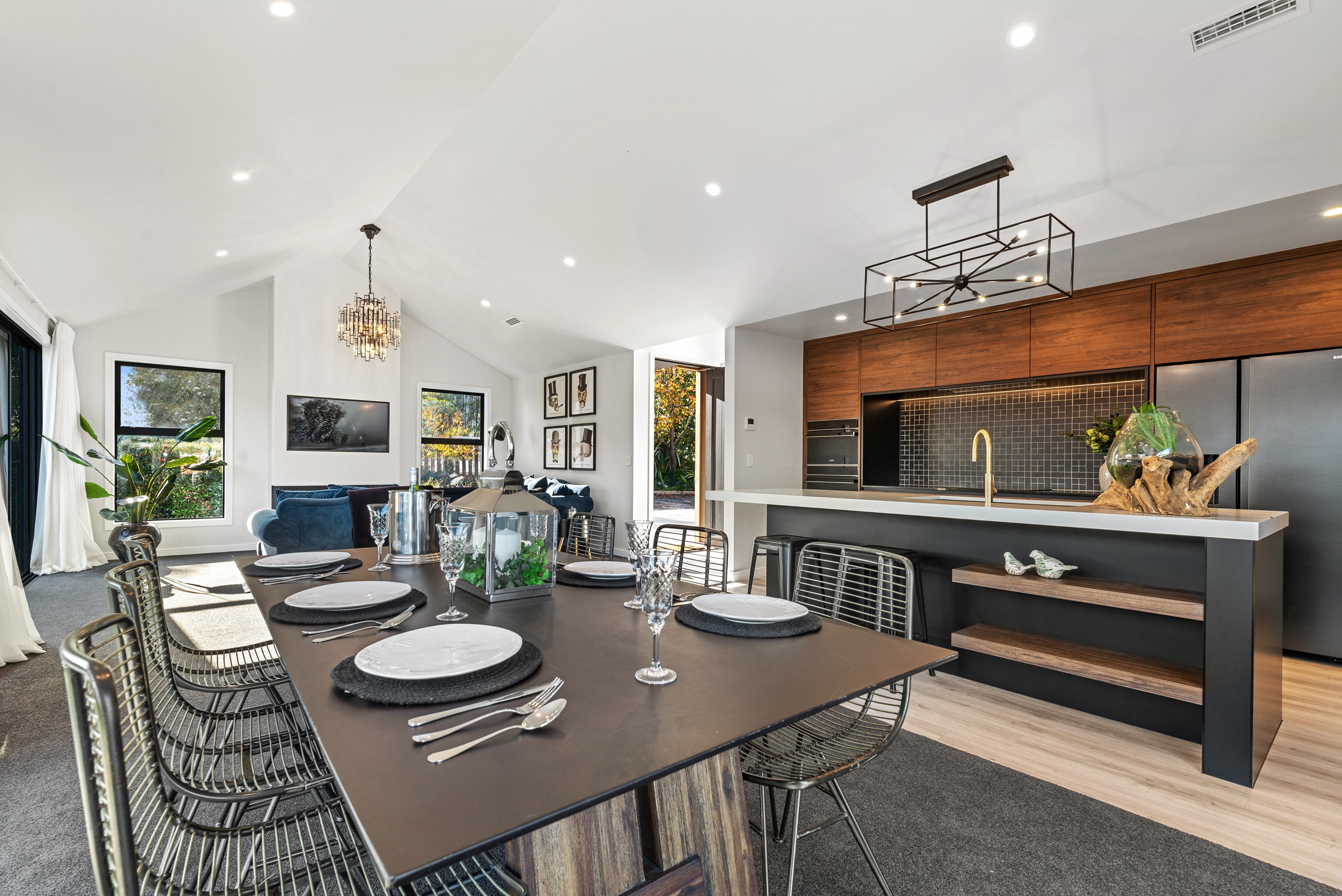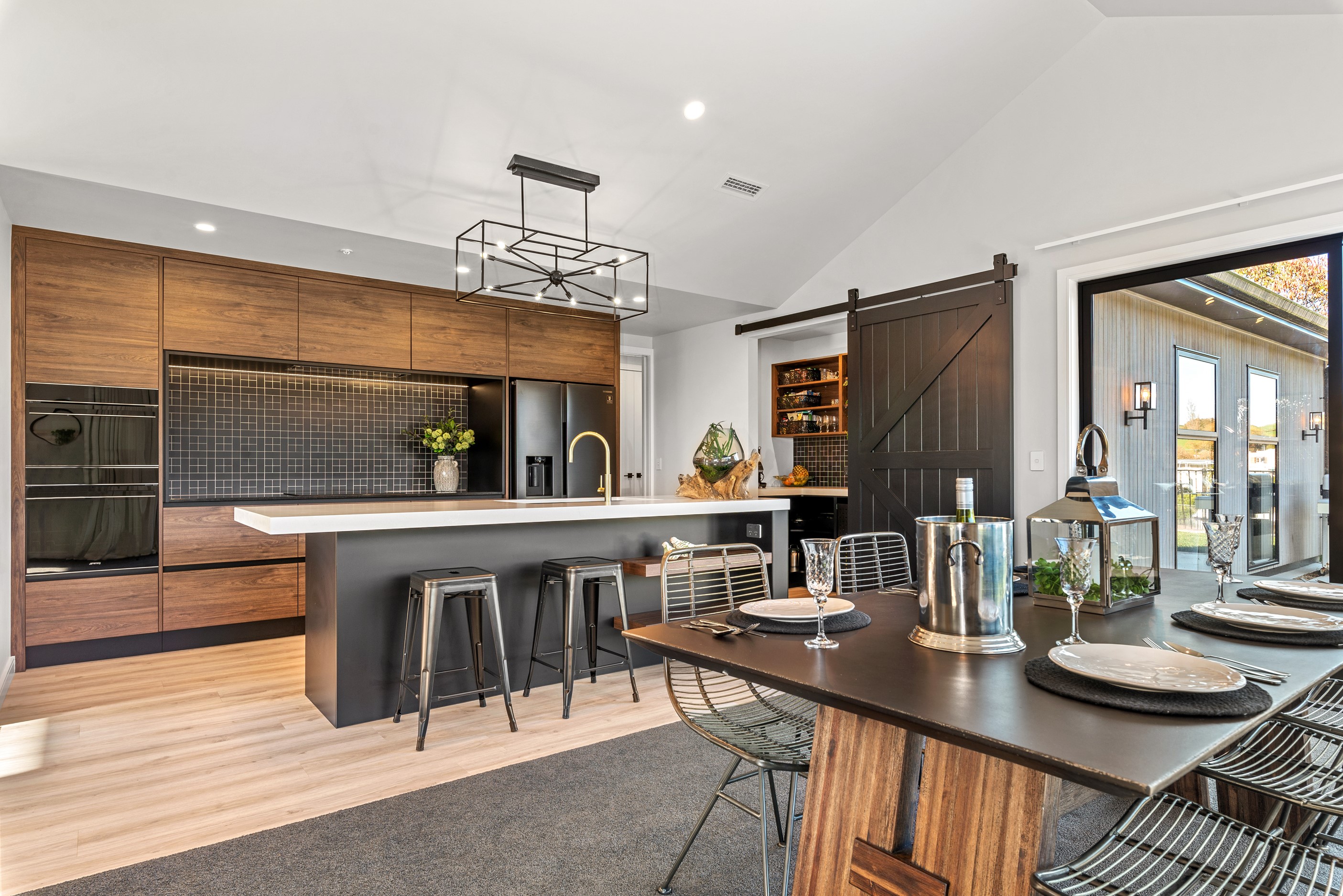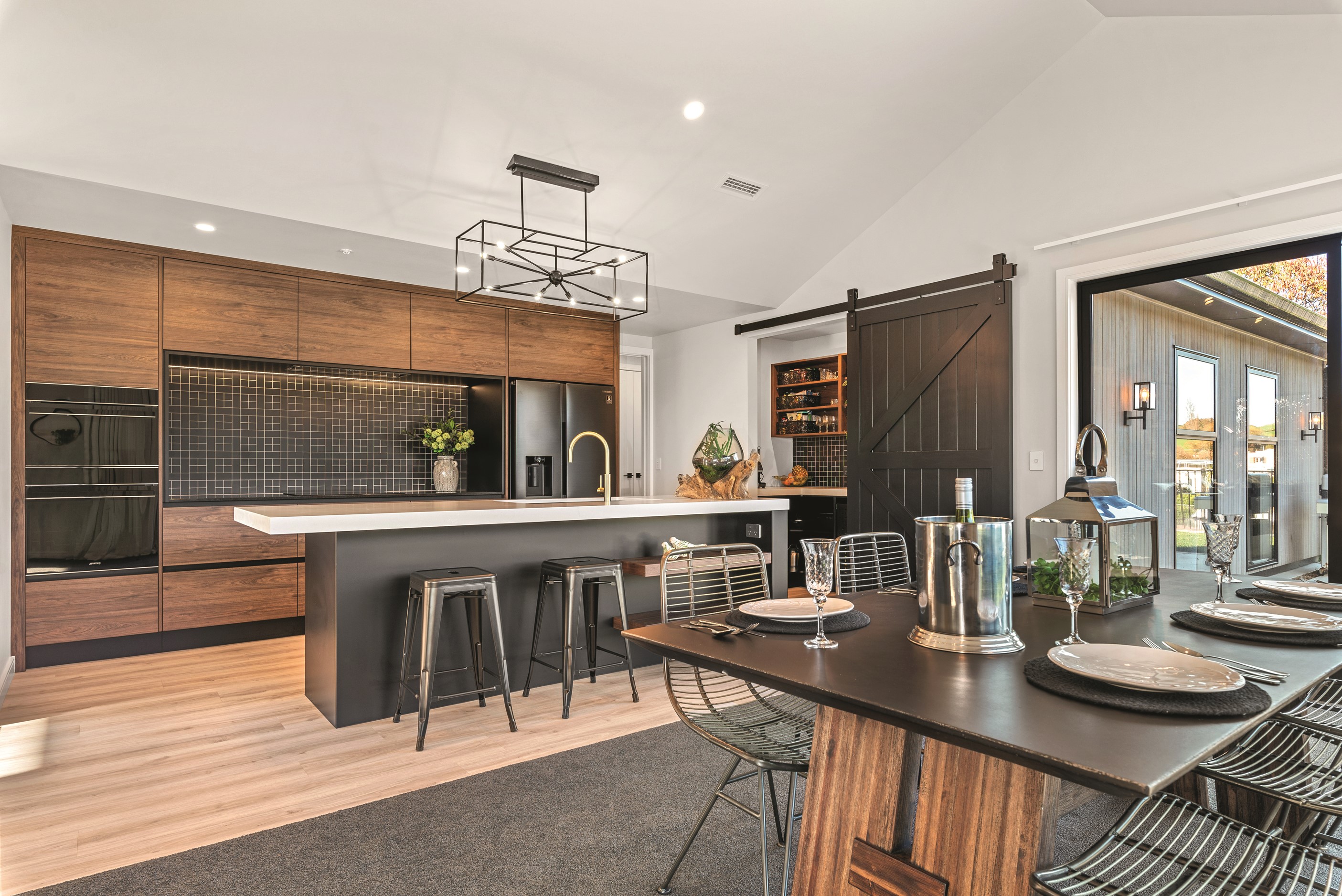 This home is not the largest in its neighbourhood, but it doesn’t want for anything. For a start, it oozes timeless appeal – it’s the kind of property that doesn’t date. Within its 201sqm footprint, there are four bedrooms. The main suite has a walk-in wardrobe and ensuite with a double vanity. This and the family bathroom are both tiled and full of design features. Black fittings and fixtures, including the basins and bath, give the rooms a stylish edge. The kitchen’s moody and woody tones are complemented by a tiled splashback, feature lighting over the island and a spacious scullery with a sliding barn door. Pitched ceilings made with scissor trusses give the kitchen, dining and living zone a real sense of openness and space. From here, doors open onto a wide deck that’s ideal for family barbecues. You’ll find feature walls throughout the home – in the main bedroom, bathrooms, a child’s room and entrance. On the outside, vertical shiplap is teamed with coloursteel roofing, fascia and spouting. The overall effect is of simple, classic style that will last a lifetime. What’s not to love about this house?