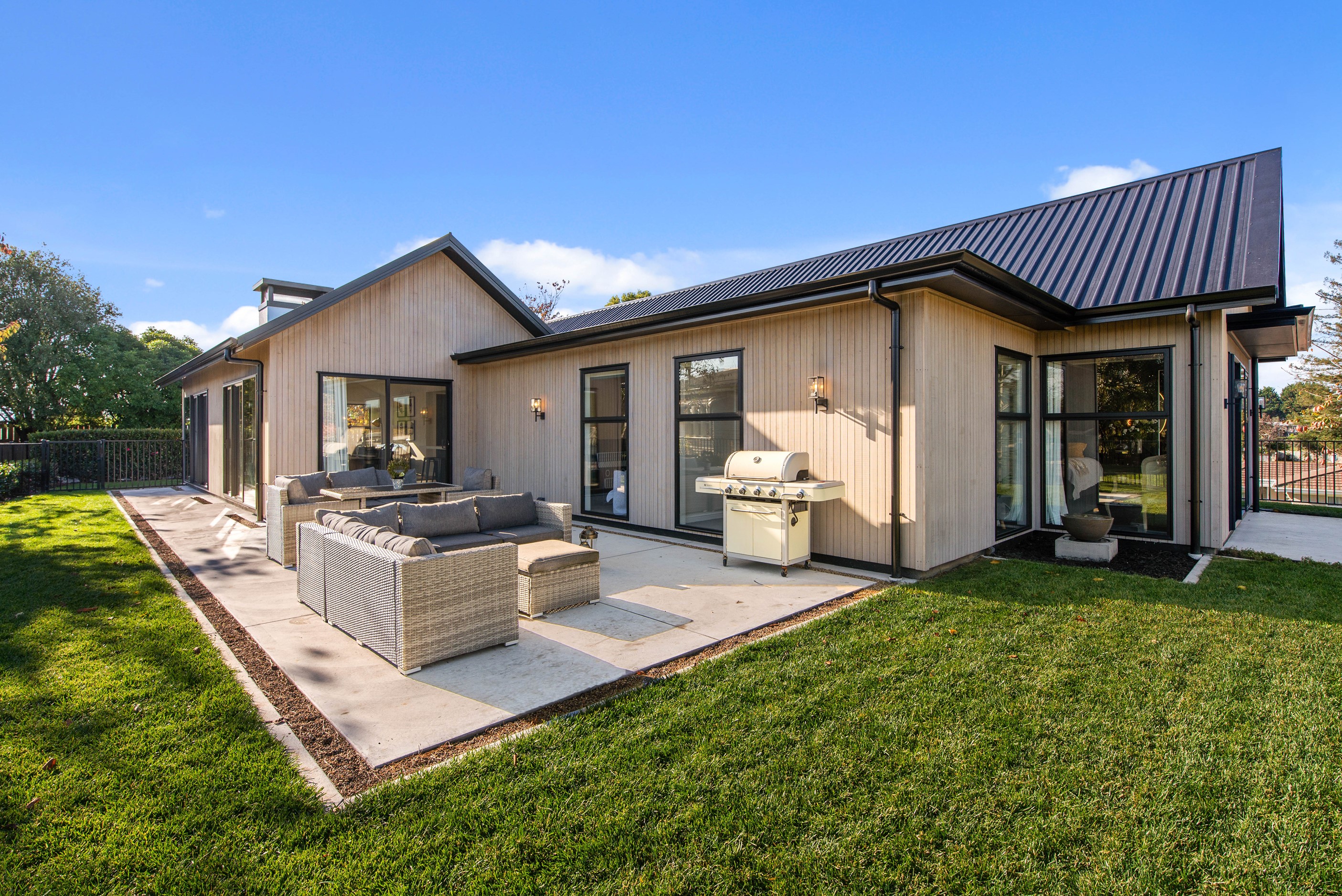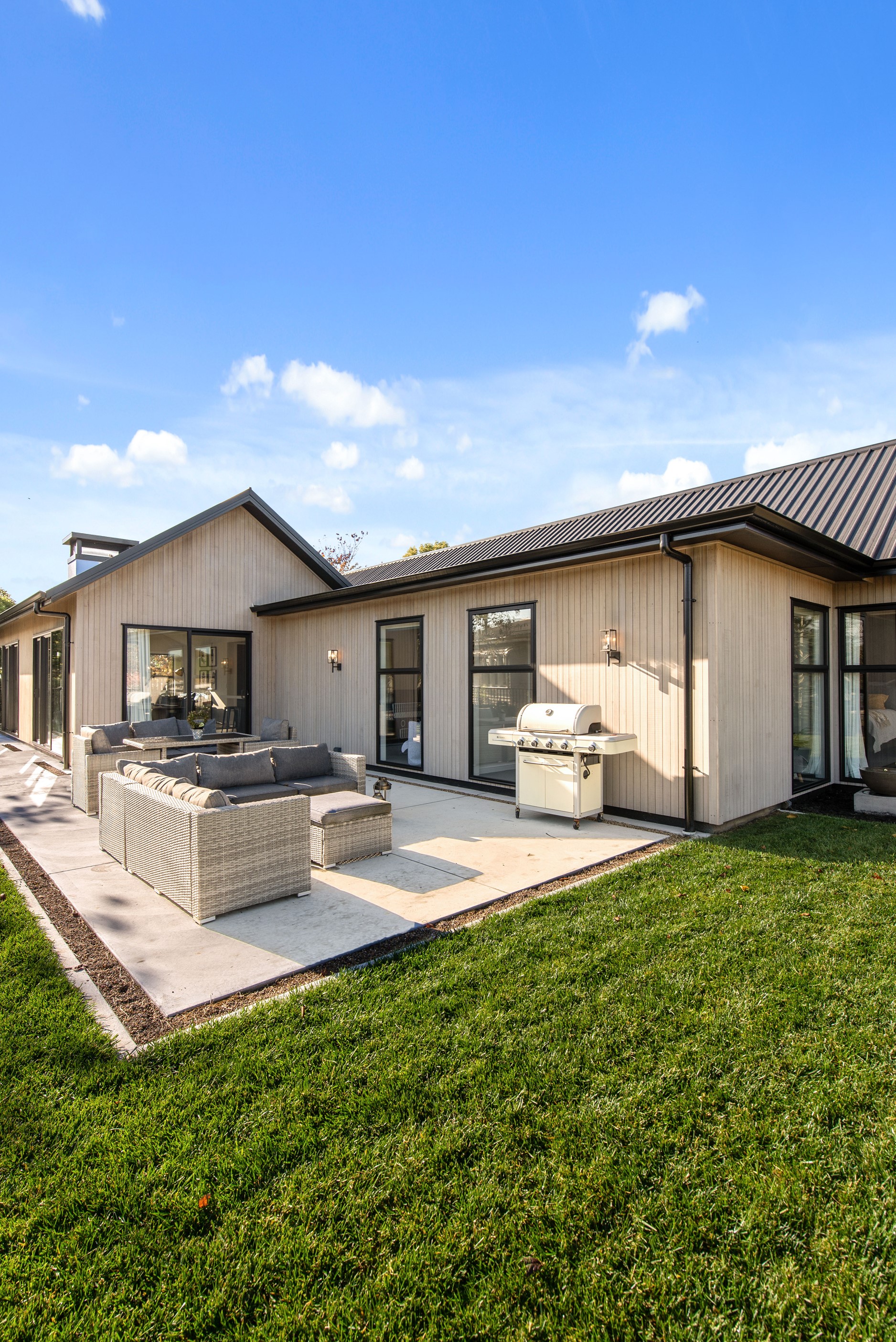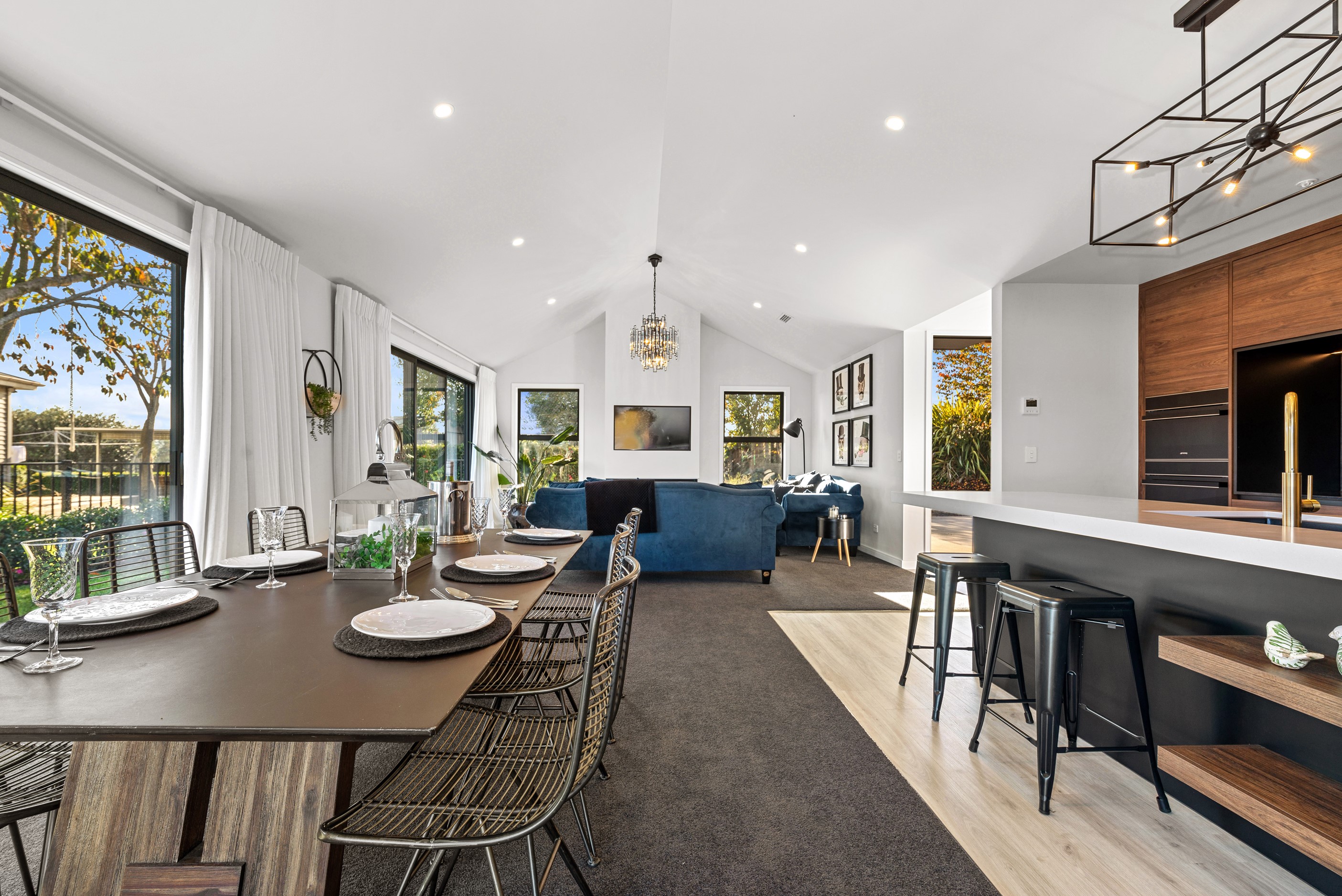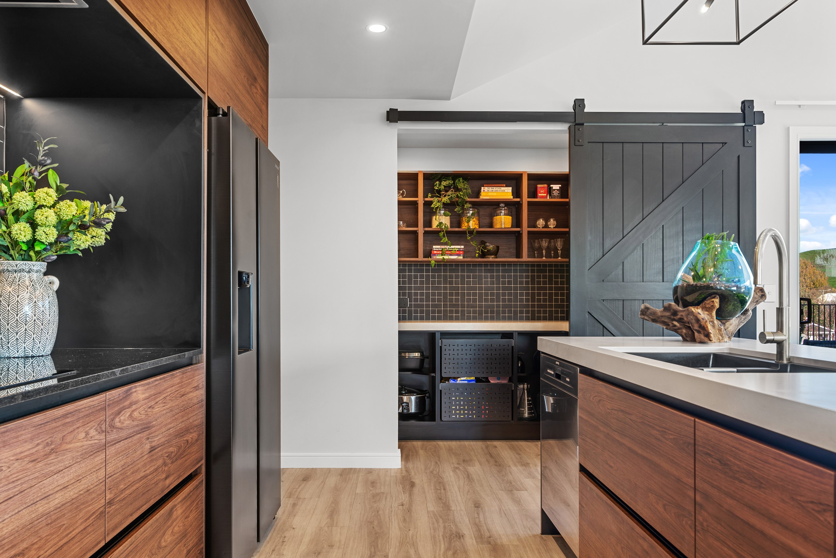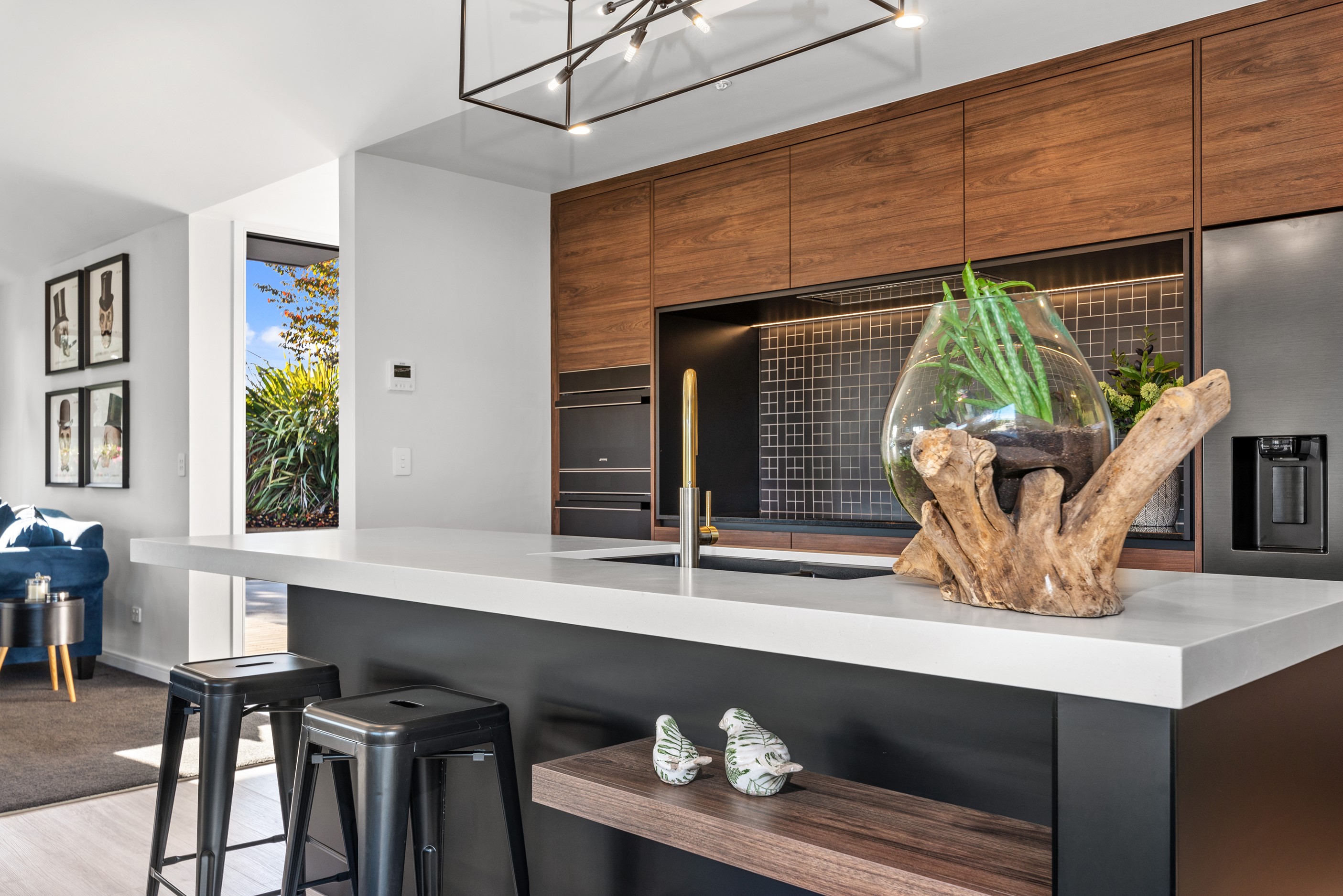 This home is not the largest in its neighbourhood, but it doesn’t want for anything. For a start, it oozes timeless appeal – it’s the kind of property that doesn’t date. Within its 201sqm footprint, there are four bedrooms. The main suite has a walk-in wardrobe and ensuite with a double vanity. This and the family bathroom are both tiled and full of design features. Black fittings and fixtures, including the basins and bath, give the rooms a stylish edge. The kitchen’s moody and woody tones are complemented by a tiled splashback, feature lighting over the island and a spacious scullery with a sliding barn door. Pitched ceilings made with scissor trusses give the kitchen, dining and living zone a real sense of openness and space. From here, doors open onto a wide deck that’s ideal for family barbecues. You’ll find feature walls throughout the home – in the main bedroom, bathrooms, a child’s room and entrance. On the outside, vertical shiplap is teamed with coloursteel roofing, fascia and spouting. The overall effect is of simple, classic style that will last a lifetime. What’s not to love about this house?
