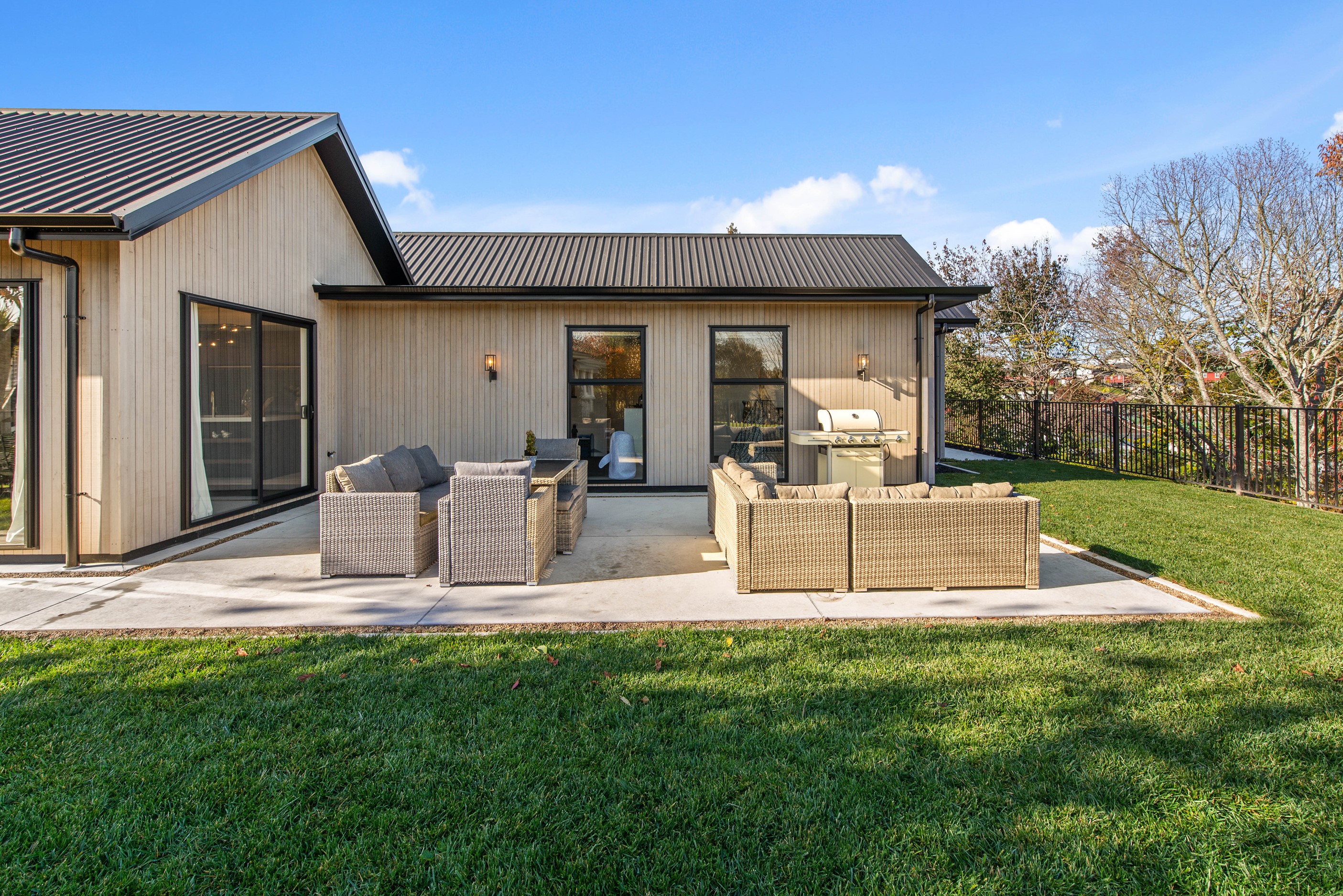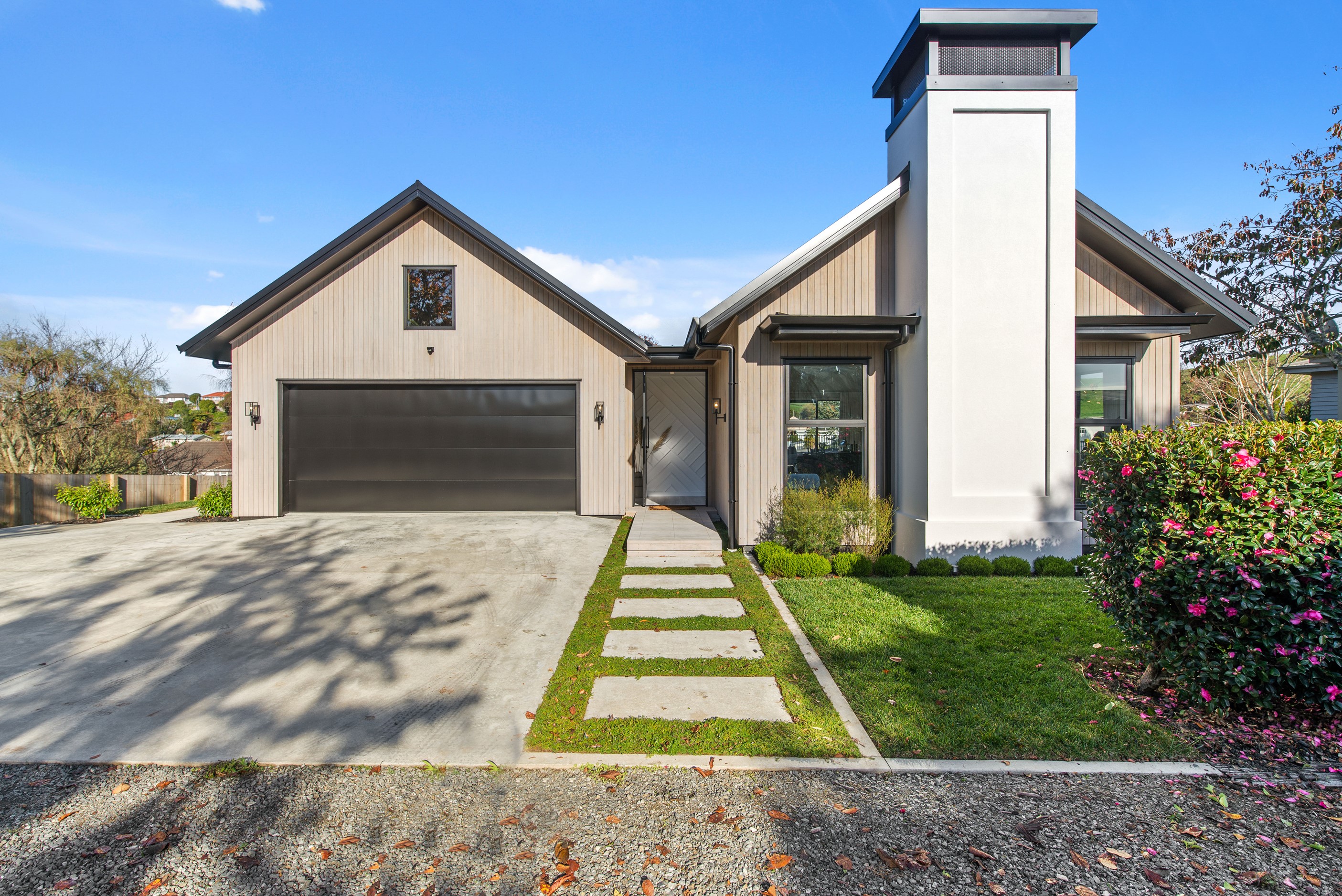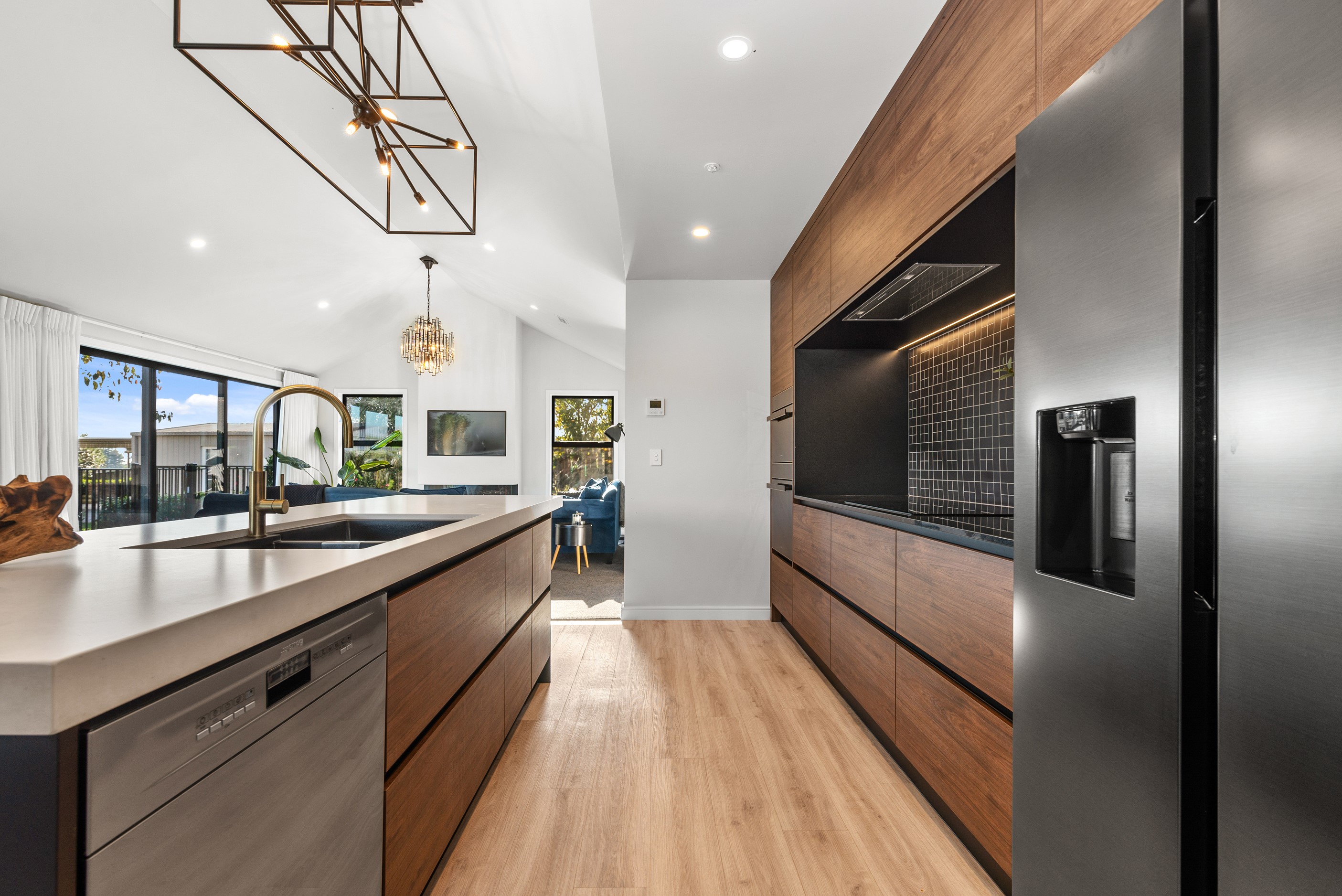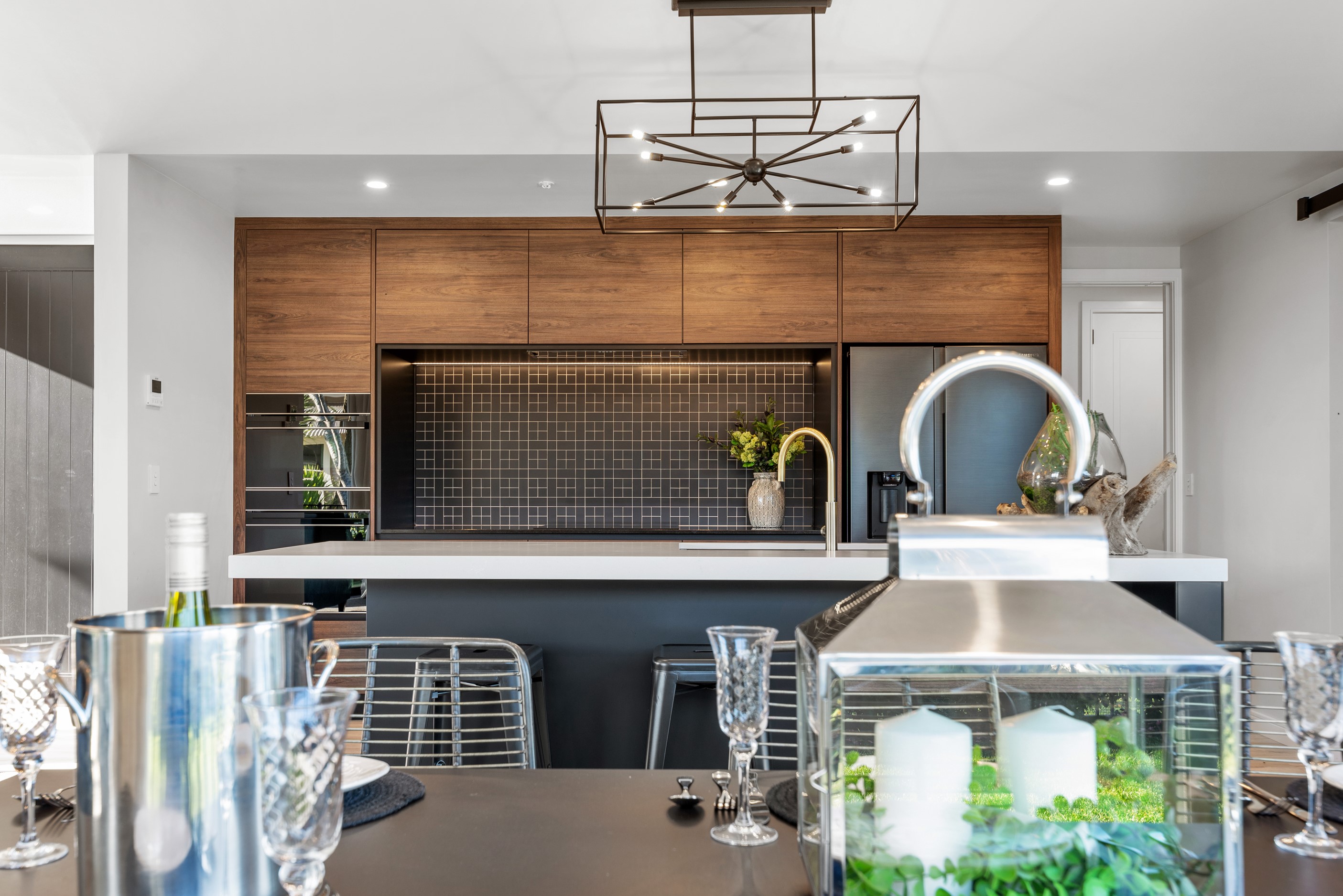 This home is not the largest in its neighbourhood, but it doesn’t want for anything. For a start, it oozes timeless appeal – it’s the kind of property that doesn’t date. Within its 201sqm footprint, there are four bedrooms. The main suite has a walk-in wardrobe and ensuite with a double vanity. This and the family bathroom are both tiled and full of design features. Black fittings and fixtures, including the basins and bath, give the rooms a stylish edge. The kitchen’s moody and woody tones are complemented by a tiled splashback, feature lighting over the island and a spacious scullery with a sliding barn door. Pitched ceilings made with scissor trusses give the kitchen, dining and living zone a real sense of openness and space. From here, doors open onto a wide deck that’s ideal for family barbecues. You’ll find feature walls throughout the home – in the main bedroom, bathrooms, a child’s room and entrance. On the outside, vertical shiplap is teamed with coloursteel roofing, fascia and spouting. The overall effect is of simple, classic style that will last a lifetime. What’s not to love about this house?
