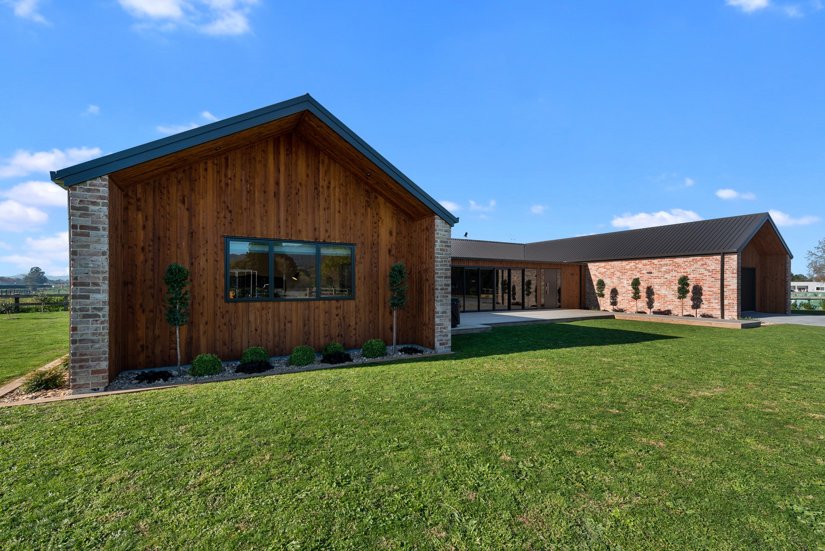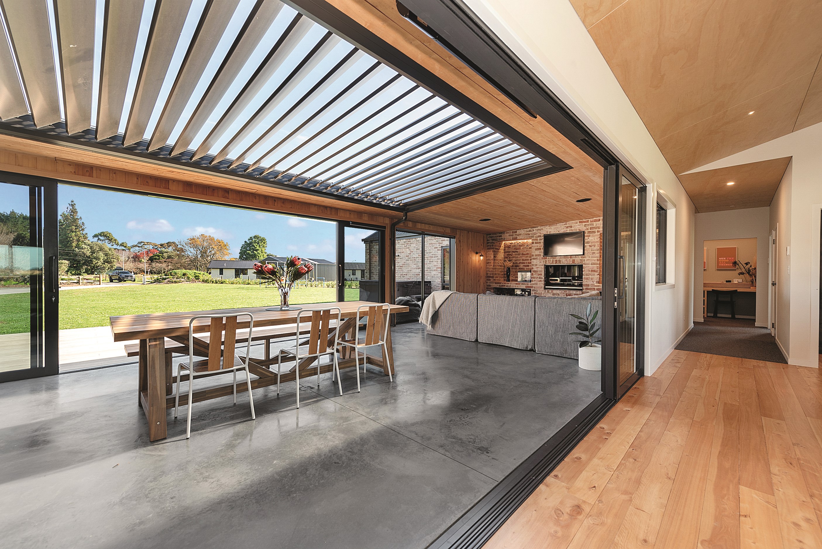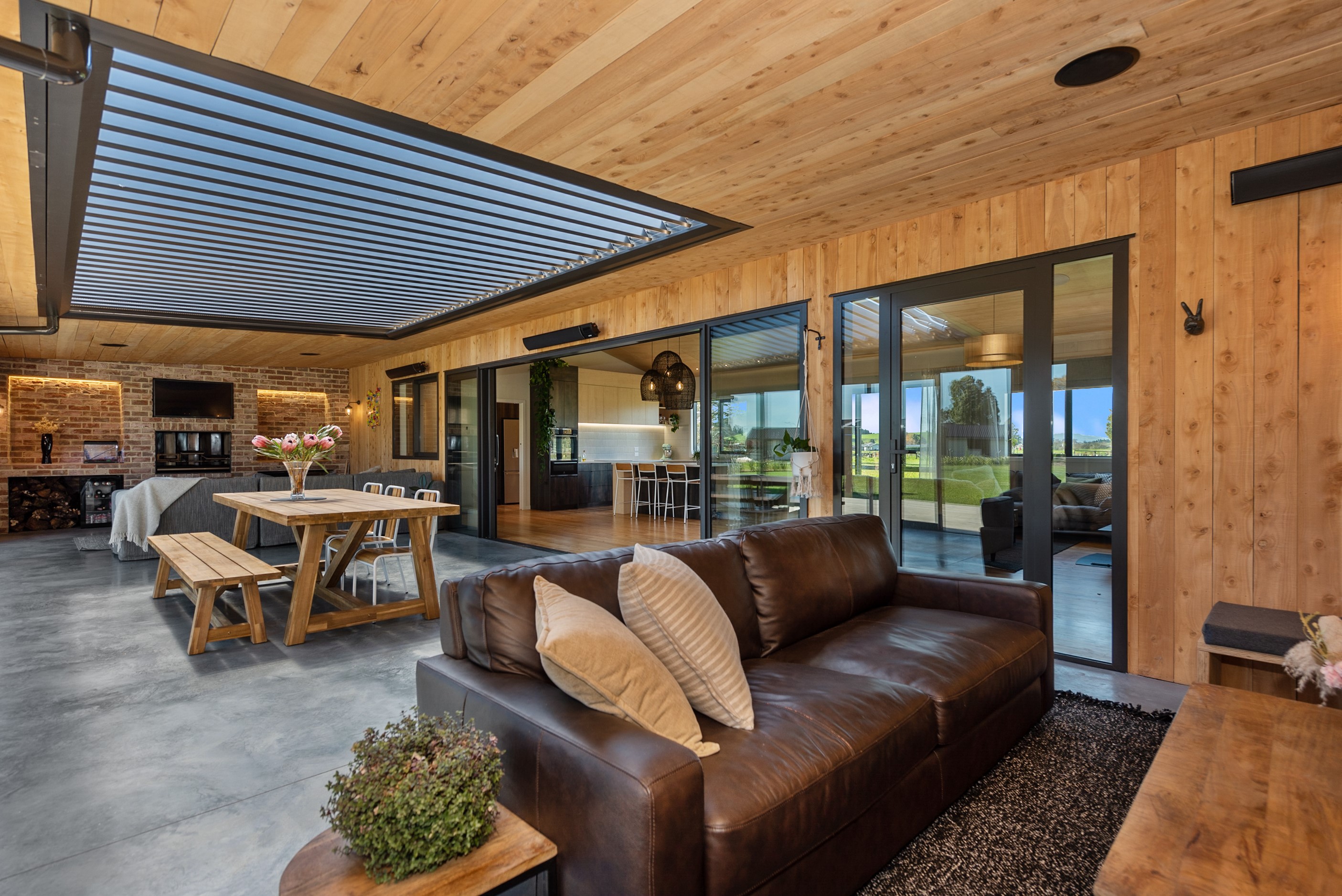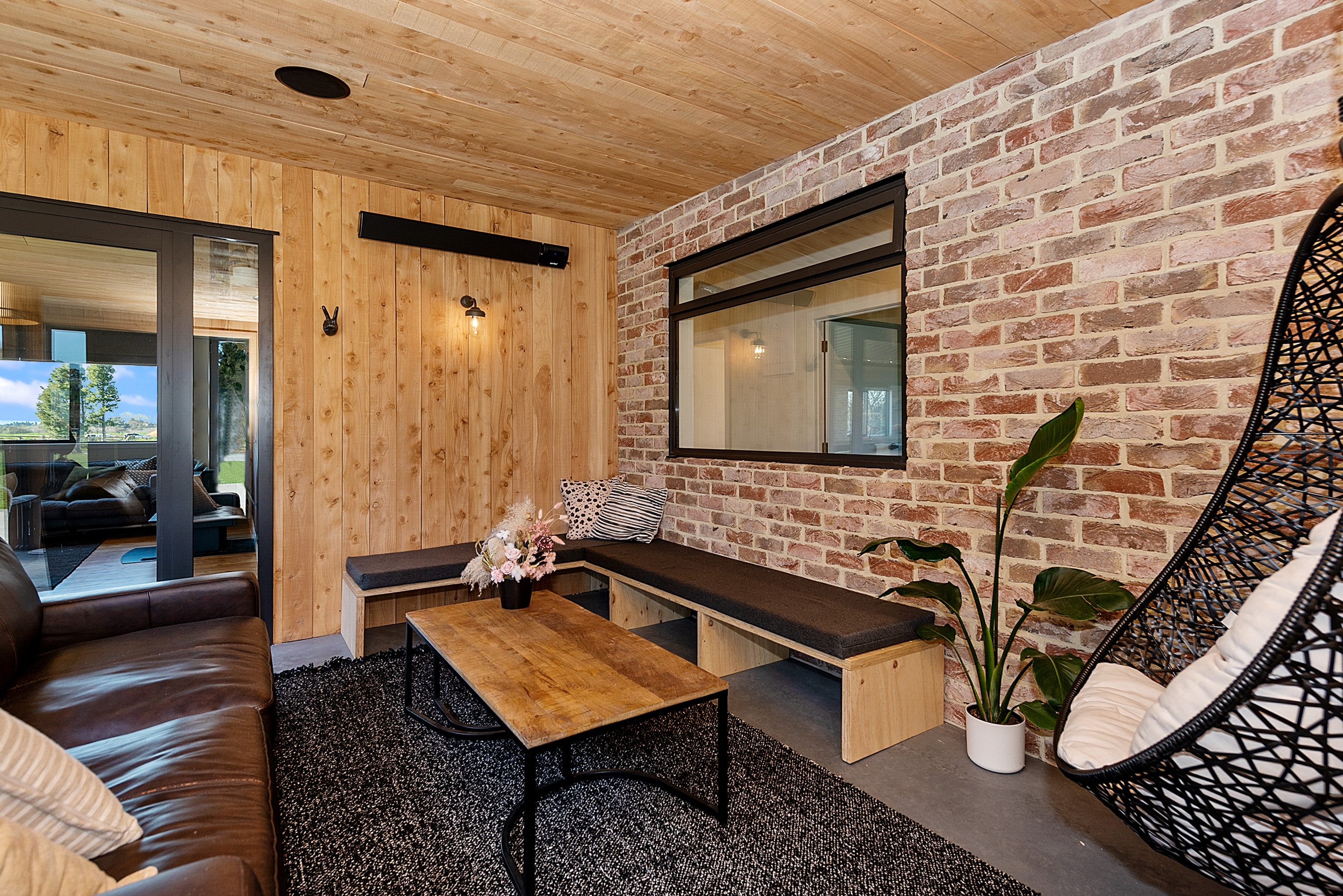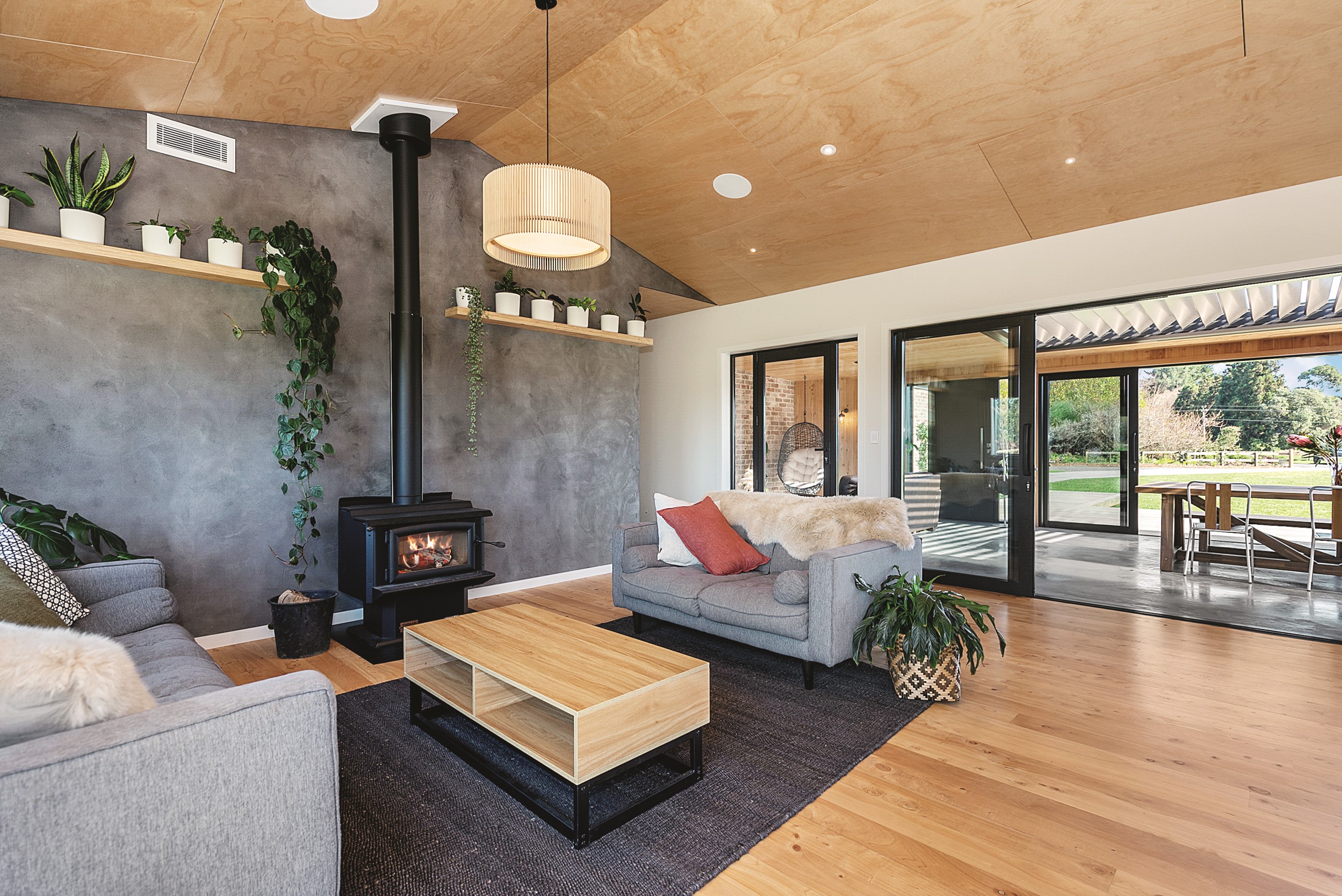 The design for this distinctive brick U-shaped house started with the outdoor lounge. Once this space was given centre stage, the big open-plan kitchen/dining/living zone was designed to connect with it. As a result, you can step out of the house proper, into the outdoor lounge with louvred roof and inbuilt barbecue, and onto an extensive front lawn. It has indoor-outdoor flow in spades and the kids love the easy access to the outdoors. Inside the 350sqm, four-bedroom house you’ll find macrocarpa walls and ceilings in the outdoor lounge and ply ceilings with a 4mm negative detail in the kitchen living area, second lounge and hallways. Wood – there’s macrocarpa on the floor too – and brick around the interior give a cosy feel. A living wall in one of two bathrooms ensures nature also has a presence here. Outside, aged red brick is offset with bandsawn macrocarpa, allowing the house to sit naturally in its rural landscape. This house has all you’d expect from a builder’s home – sumptuous bathrooms, a double garage and a main bedroom with walk-in wardrobe and ensuite. There’s also a warm, relaxing feel, which was the family’s goal.