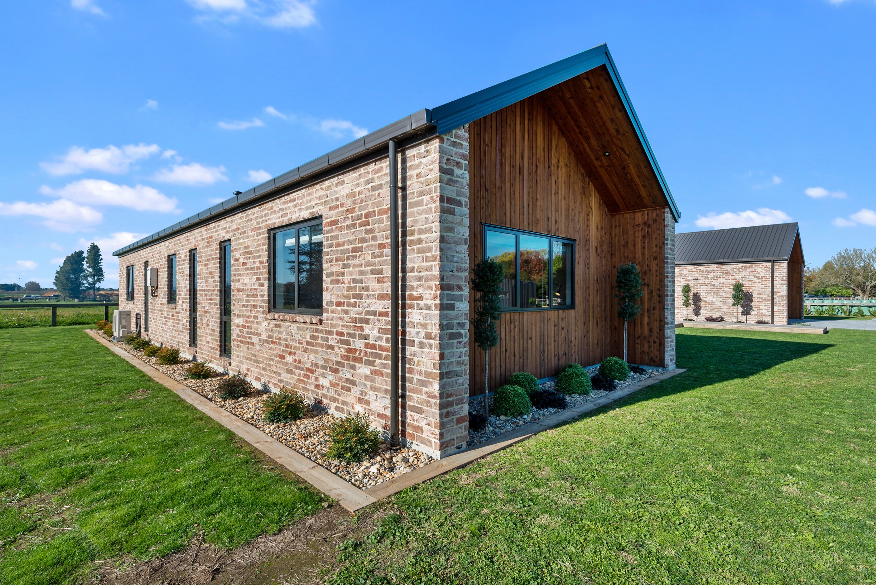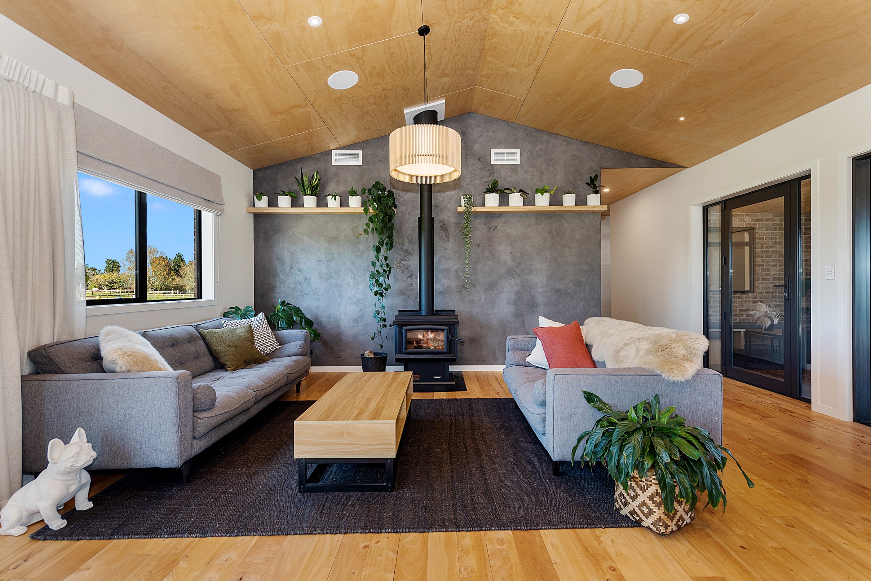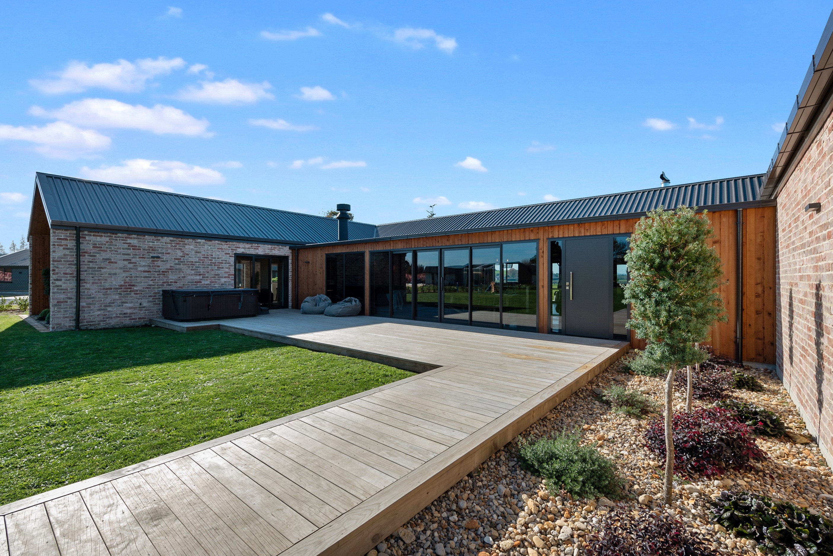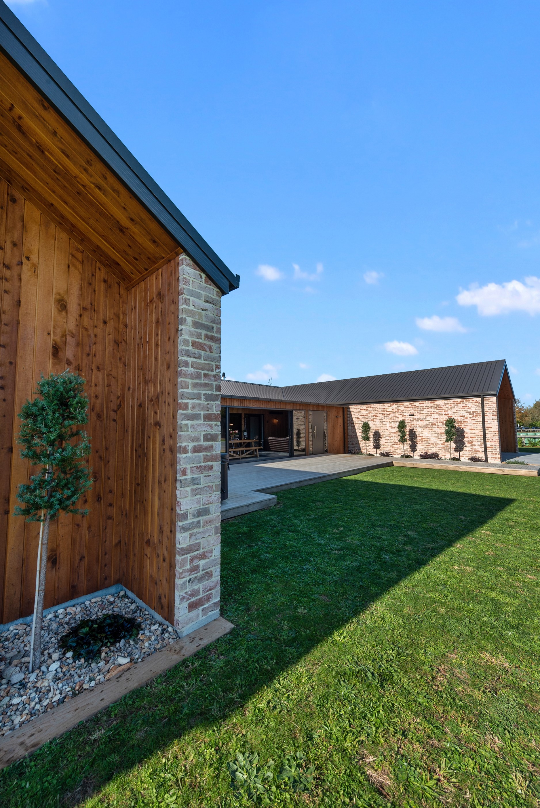 The design for this distinctive brick U-shaped house started with the outdoor lounge. Once this space was given centre stage, the big open-plan kitchen/dining/living zone was designed to connect with it. As a result, you can step out of the house proper, into the outdoor lounge with louvred roof and inbuilt barbecue, and onto an extensive front lawn. It has indoor-outdoor flow in spades and the kids love the easy access to the outdoors. Inside the 350sqm, four-bedroom house you’ll find macrocarpa walls and ceilings in the outdoor lounge and ply ceilings with a 4mm negative detail in the kitchen living area, second lounge and hallways. Wood – there’s macrocarpa on the floor too – and brick around the interior give a cosy feel. A living wall in one of two bathrooms ensures nature also has a presence here. Outside, aged red brick is offset with bandsawn macrocarpa, allowing the house to sit naturally in its rural landscape. This house has all you’d expect from a builder’s home – sumptuous bathrooms, a double garage and a main bedroom with walk-in wardrobe and ensuite. There’s also a warm, relaxing feel, which was the family’s goal.