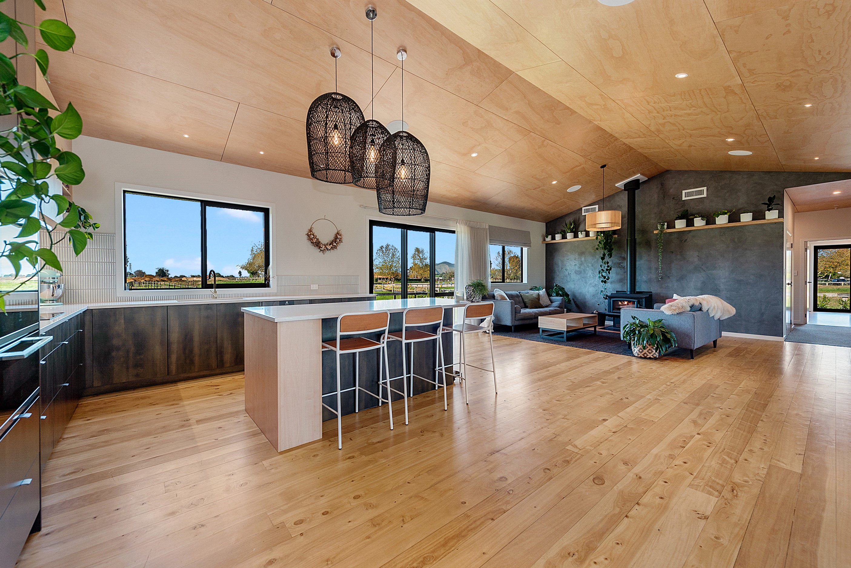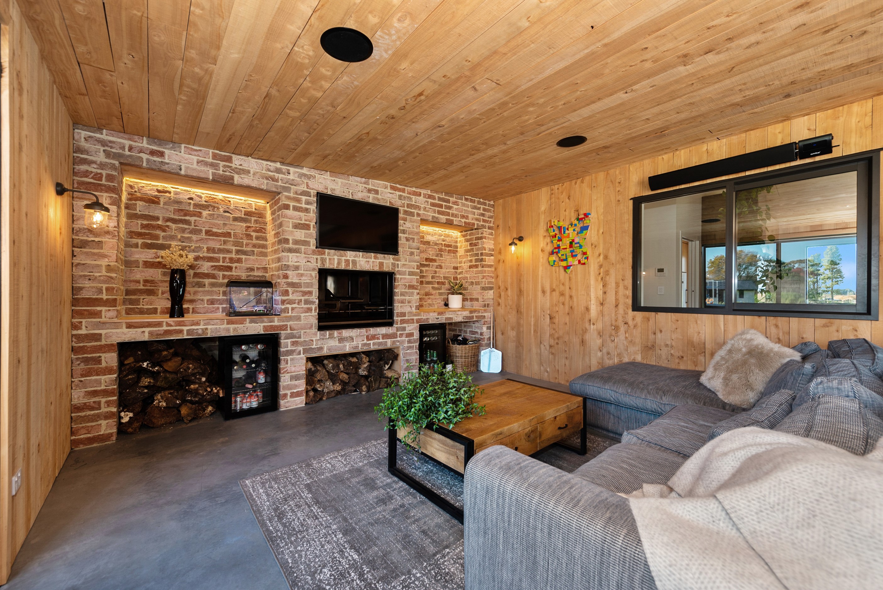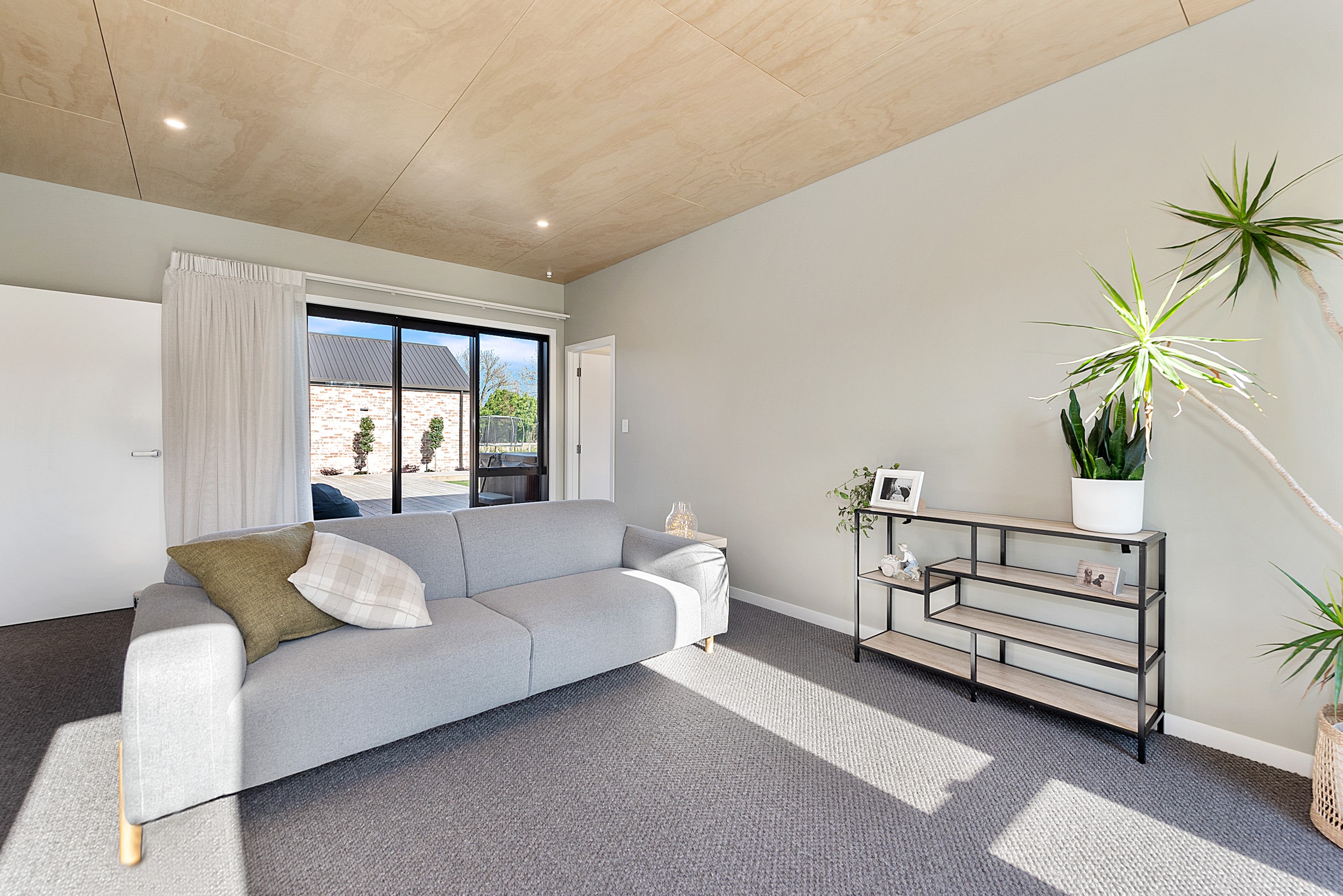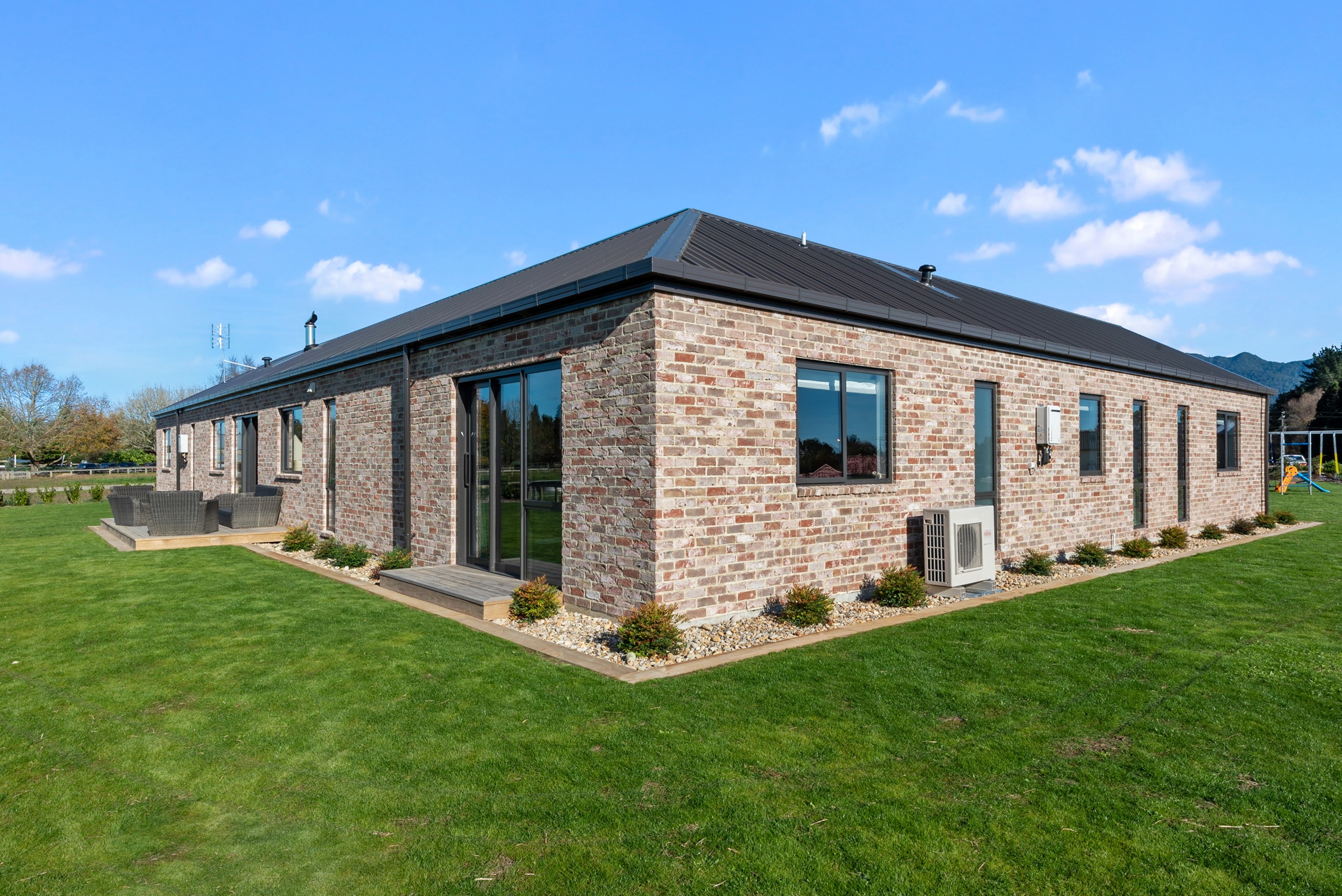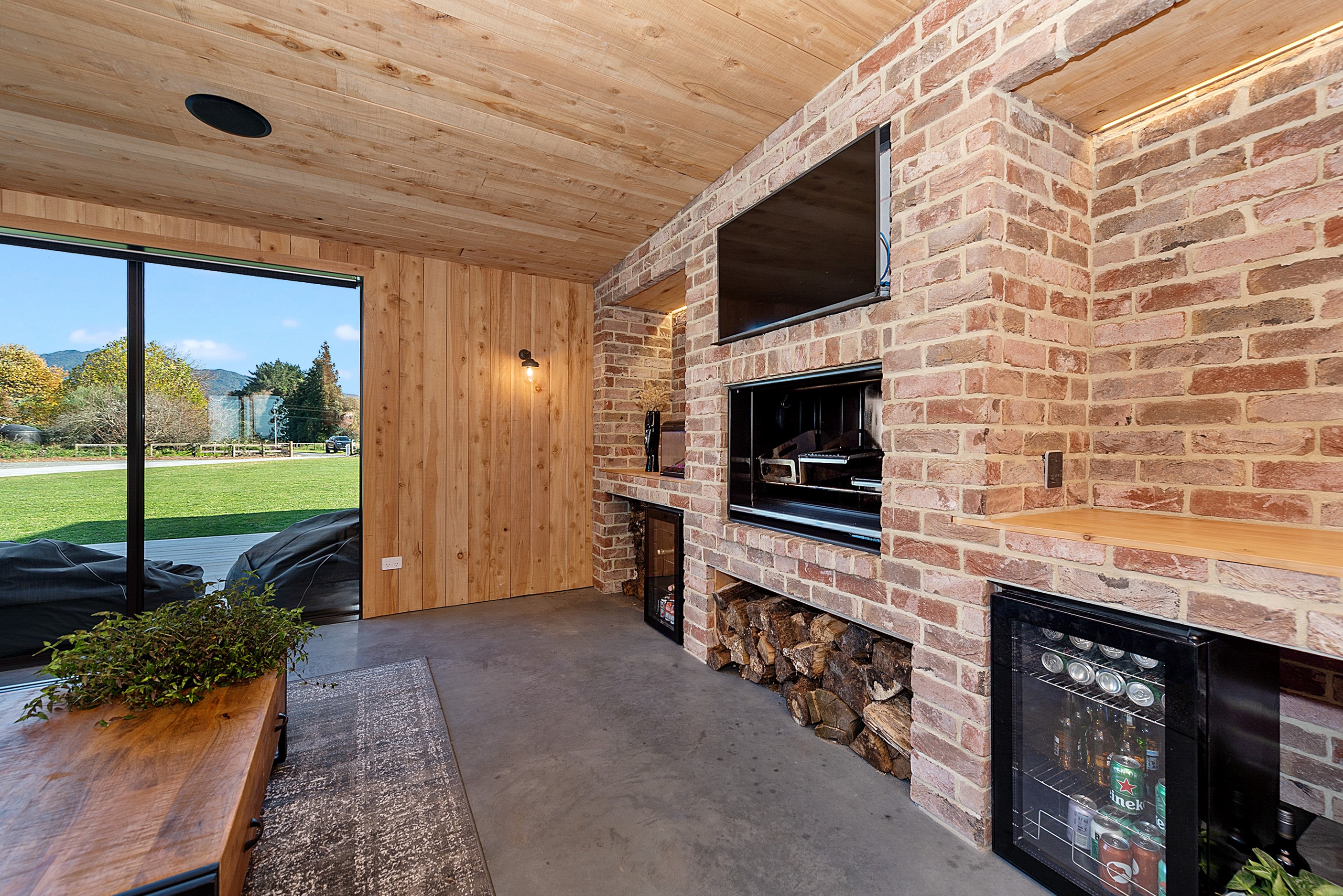 The design for this distinctive brick U-shaped house started with the outdoor lounge. Once this space was given centre stage, the big open-plan kitchen/dining/living zone was designed to connect with it. As a result, you can step out of the house proper, into the outdoor lounge with louvred roof and inbuilt barbecue, and onto an extensive front lawn. It has indoor-outdoor flow in spades and the kids love the easy access to the outdoors. Inside the 350sqm, four-bedroom house you’ll find macrocarpa walls and ceilings in the outdoor lounge and ply ceilings with a 4mm negative detail in the kitchen living area, second lounge and hallways. Wood – there’s macrocarpa on the floor too – and brick around the interior give a cosy feel. A living wall in one of two bathrooms ensures nature also has a presence here. Outside, aged red brick is offset with bandsawn macrocarpa, allowing the house to sit naturally in its rural landscape. This house has all you’d expect from a builder’s home – sumptuous bathrooms, a double garage and a main bedroom with walk-in wardrobe and ensuite. There’s also a warm, relaxing feel, which was the family’s goal.