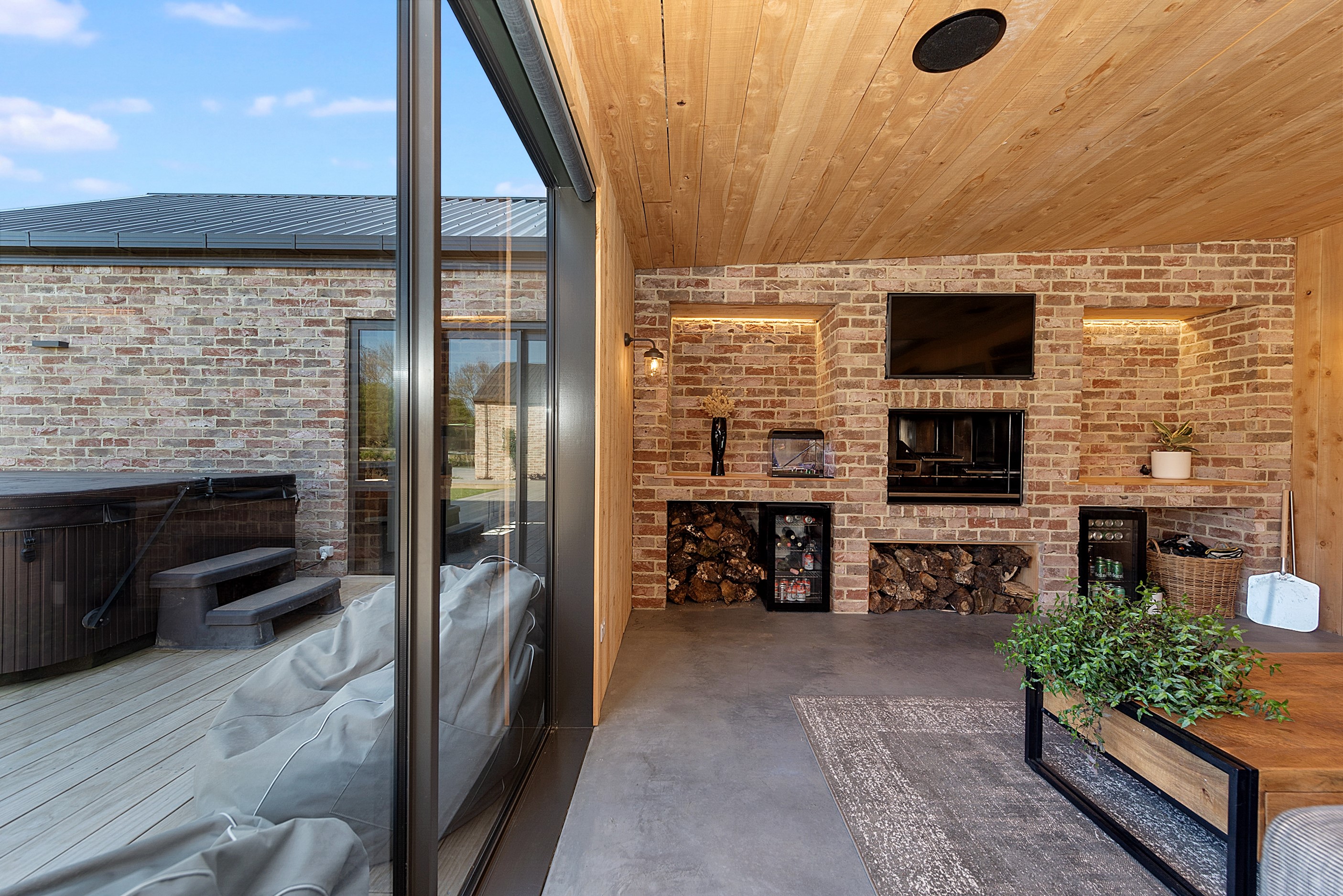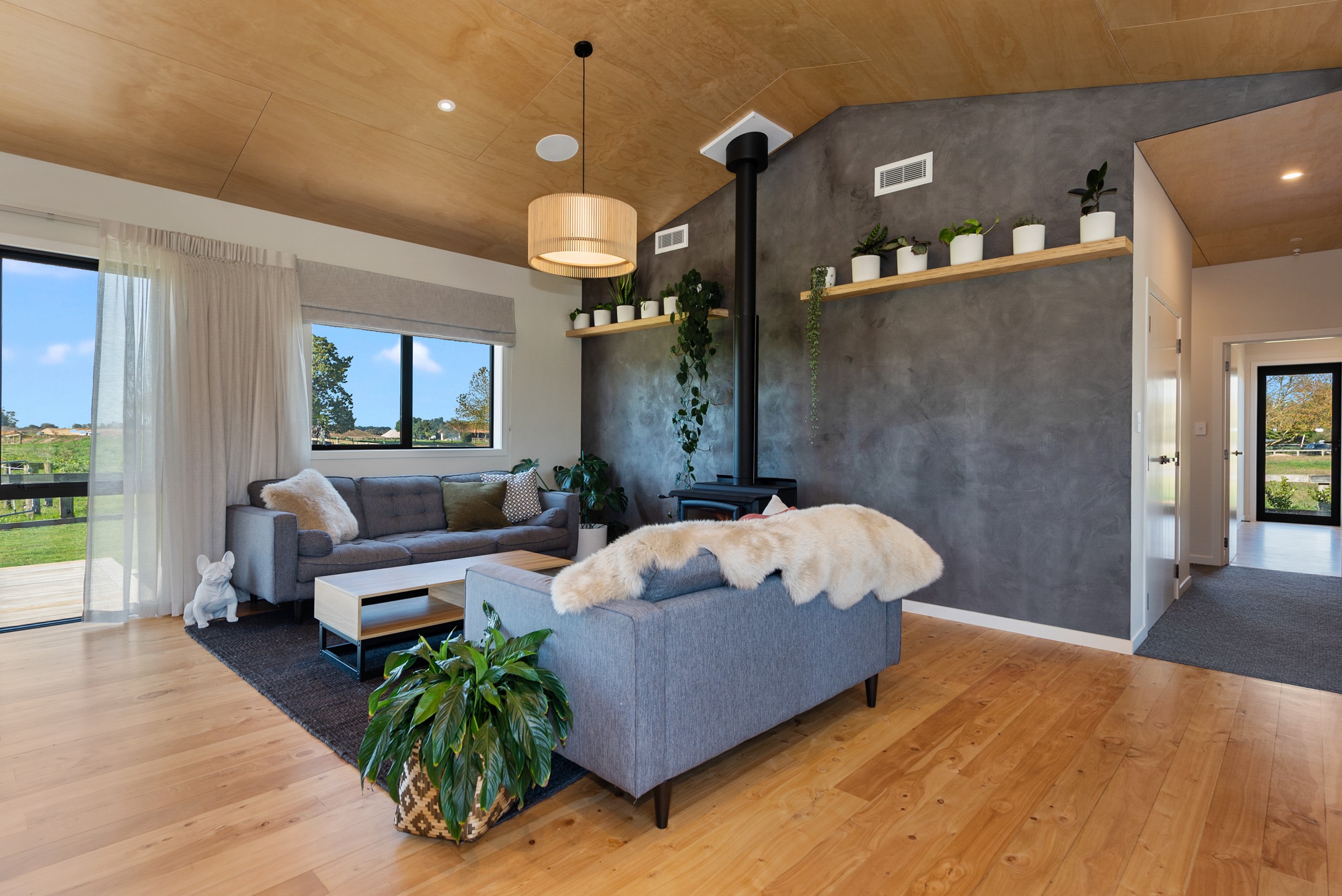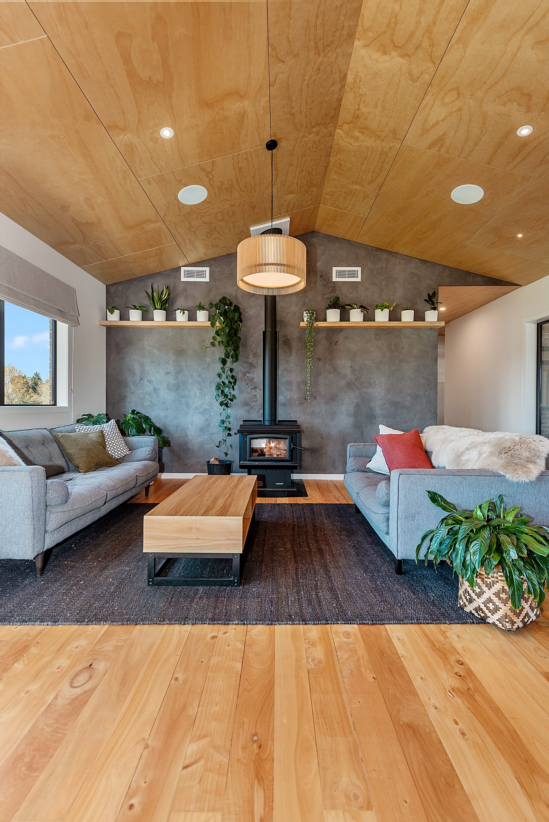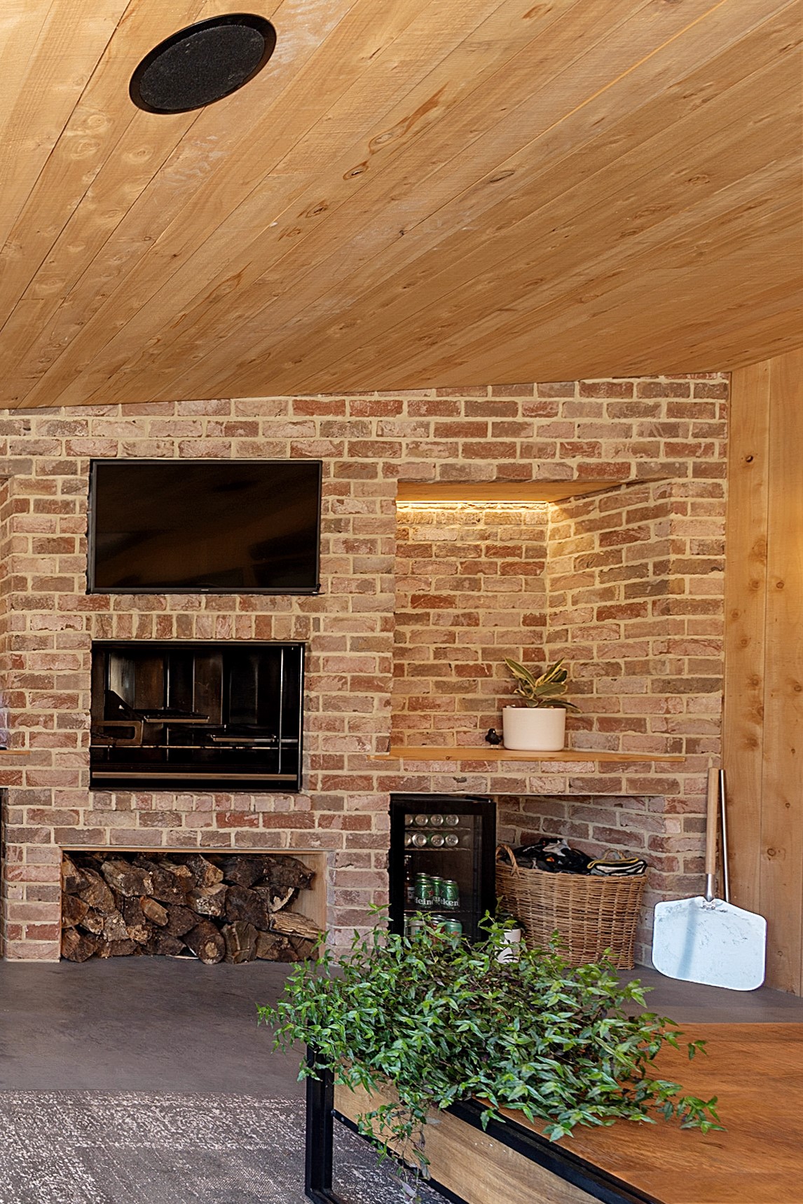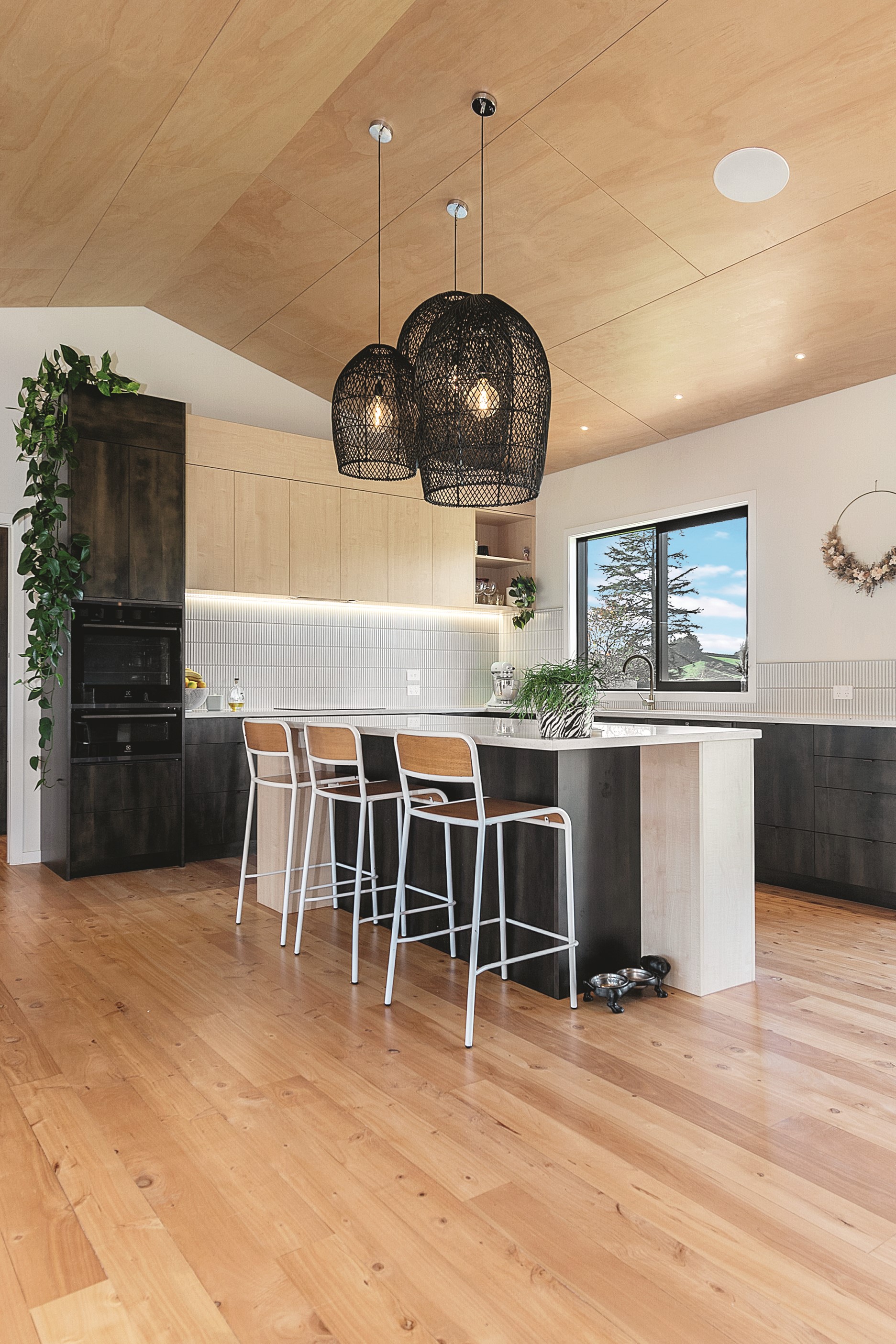 The design for this distinctive brick U-shaped house started with the outdoor lounge. Once this space was given centre stage, the big open-plan kitchen/dining/living zone was designed to connect with it. As a result, you can step out of the house proper, into the outdoor lounge with louvred roof and inbuilt barbecue, and onto an extensive front lawn. It has indoor-outdoor flow in spades and the kids love the easy access to the outdoors. Inside the 350sqm, four-bedroom house you’ll find macrocarpa walls and ceilings in the outdoor lounge and ply ceilings with a 4mm negative detail in the kitchen living area, second lounge and hallways. Wood – there’s macrocarpa on the floor too – and brick around the interior give a cosy feel. A living wall in one of two bathrooms ensures nature also has a presence here. Outside, aged red brick is offset with bandsawn macrocarpa, allowing the house to sit naturally in its rural landscape. This house has all you’d expect from a builder’s home – sumptuous bathrooms, a double garage and a main bedroom with walk-in wardrobe and ensuite. There’s also a warm, relaxing feel, which was the family’s goal.