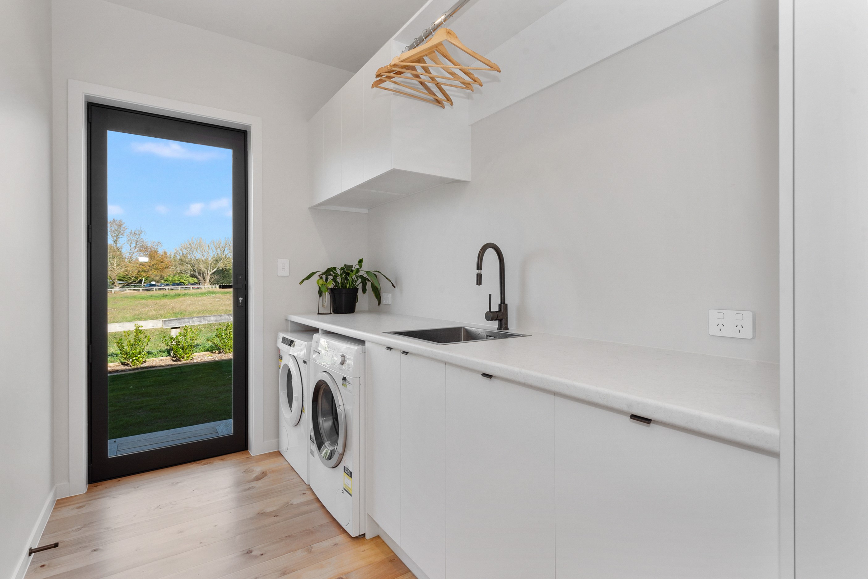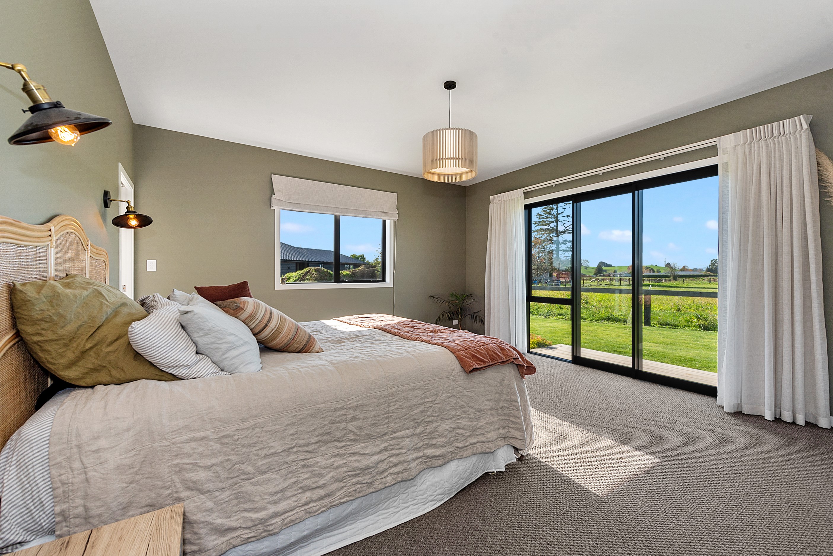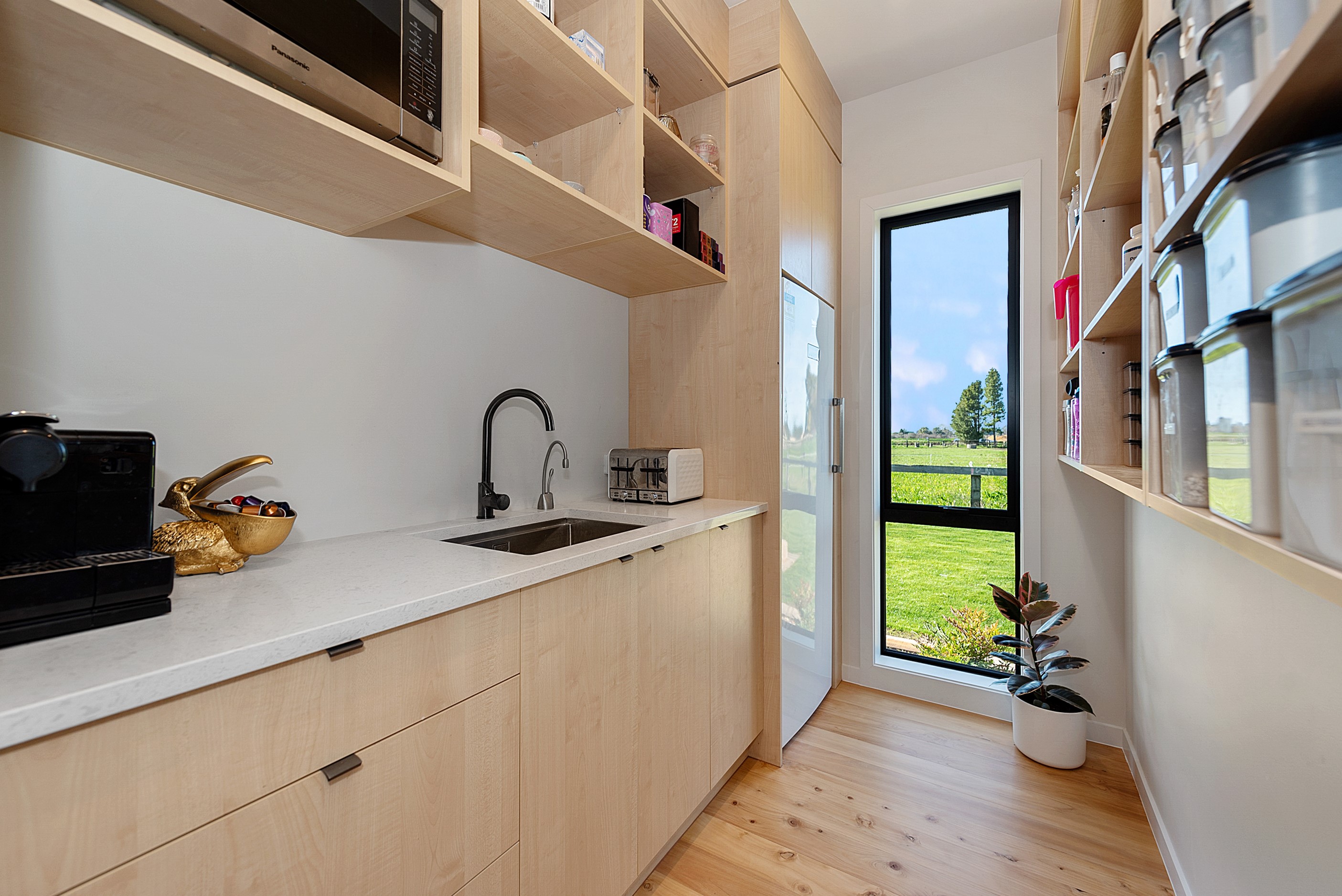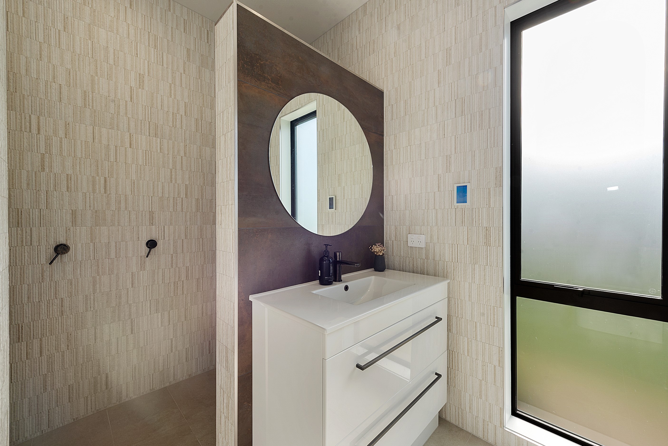 The design for this distinctive brick U-shaped house started with the outdoor lounge. Once this space was given centre stage, the big open-plan kitchen/dining/living zone was designed to connect with it. As a result, you can step out of the house proper, into the outdoor lounge with louvred roof and inbuilt barbecue, and onto an extensive front lawn. It has indoor-outdoor flow in spades and the kids love the easy access to the outdoors. Inside the 350sqm, four-bedroom house you’ll find macrocarpa walls and ceilings in the outdoor lounge and ply ceilings with a 4mm negative detail in the kitchen living area, second lounge and hallways. Wood – there’s macrocarpa on the floor too – and brick around the interior give a cosy feel. A living wall in one of two bathrooms ensures nature also has a presence here. Outside, aged red brick is offset with bandsawn macrocarpa, allowing the house to sit naturally in its rural landscape. This house has all you’d expect from a builder’s home – sumptuous bathrooms, a double garage and a main bedroom with walk-in wardrobe and ensuite. There’s also a warm, relaxing feel, which was the family’s goal.