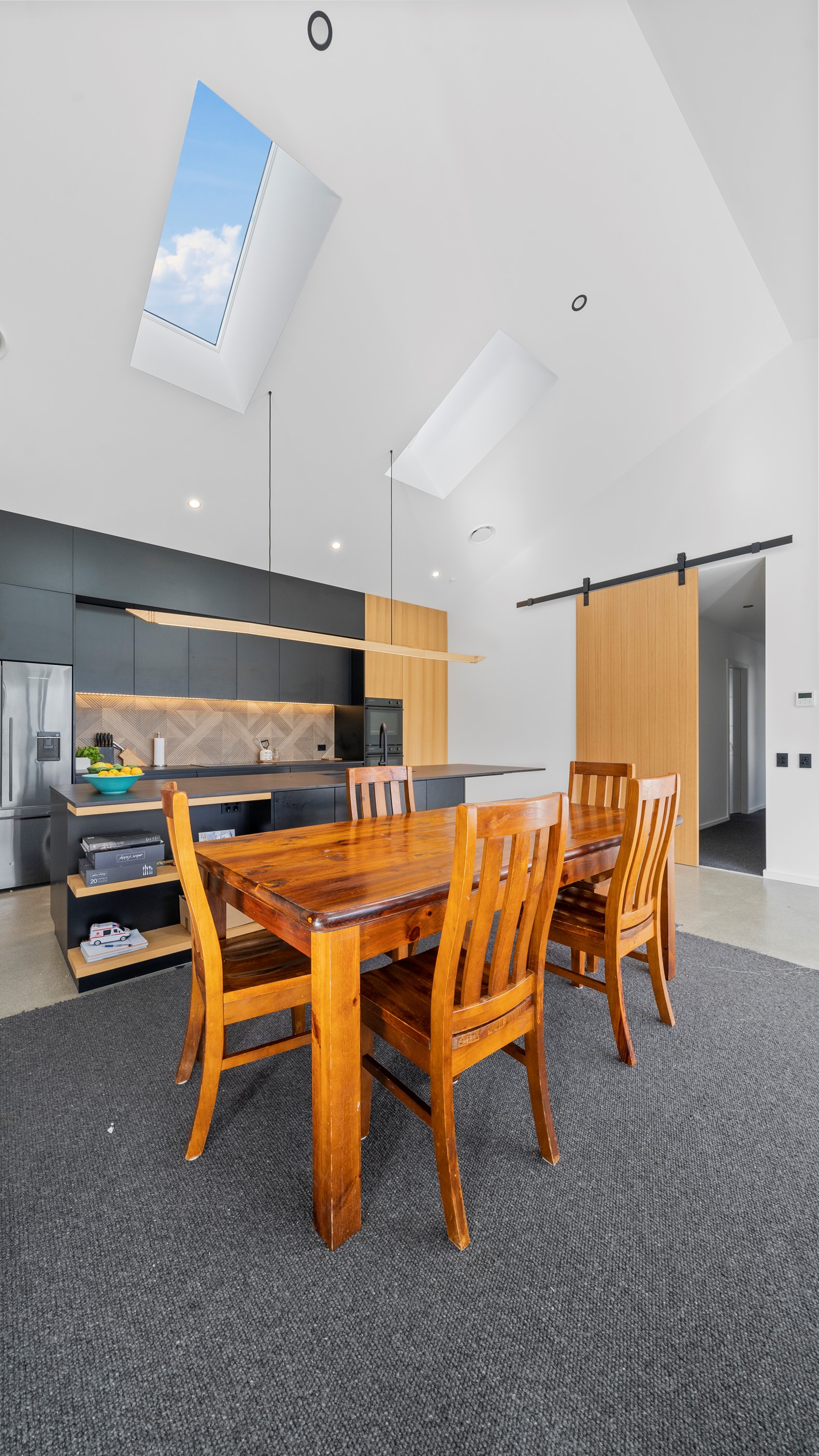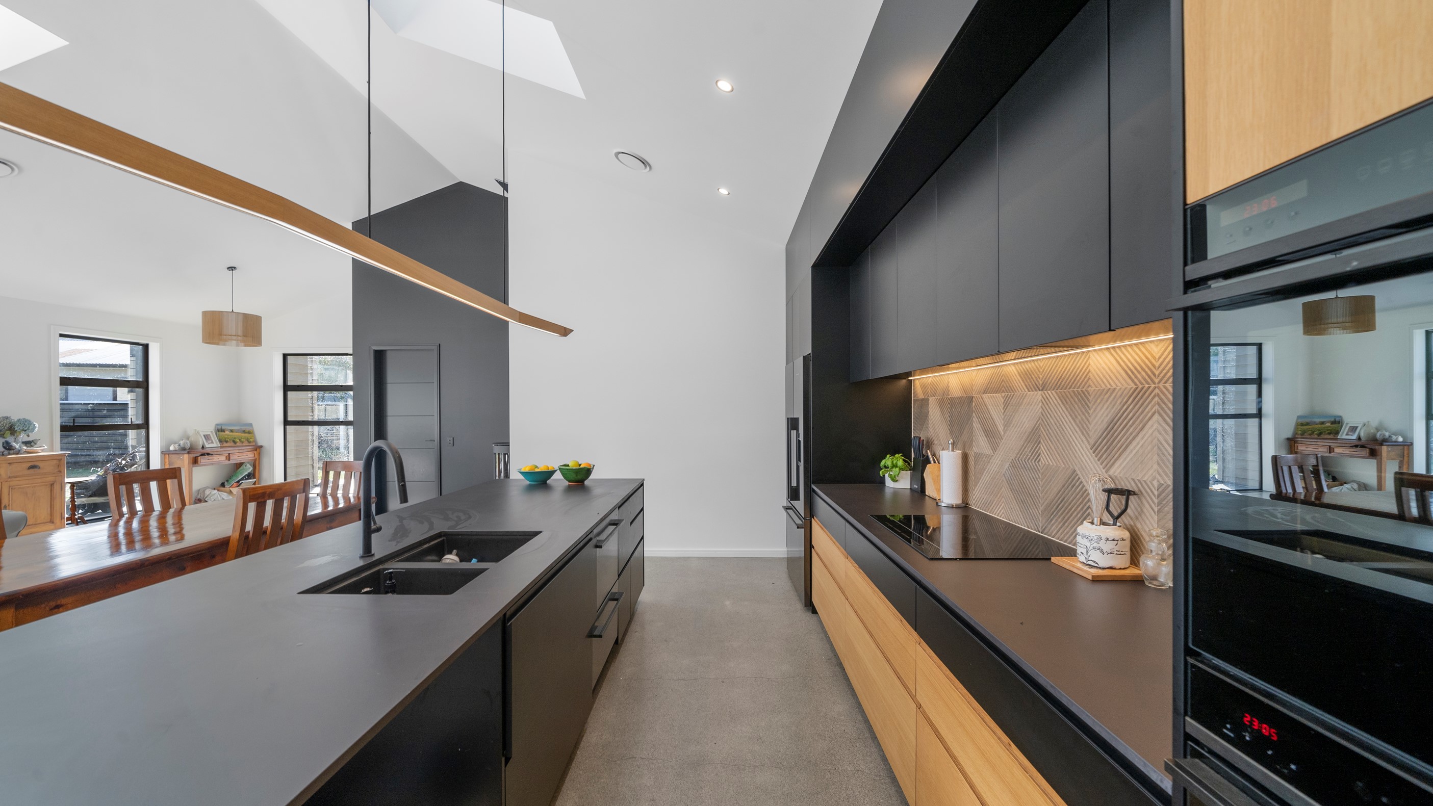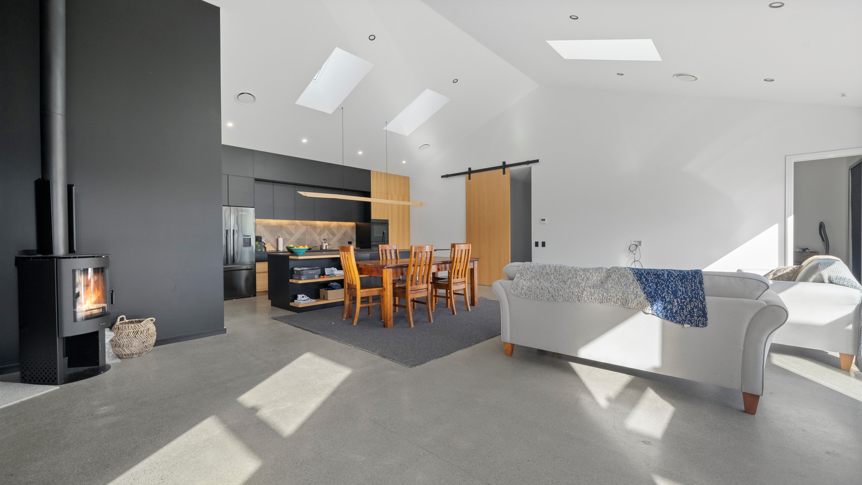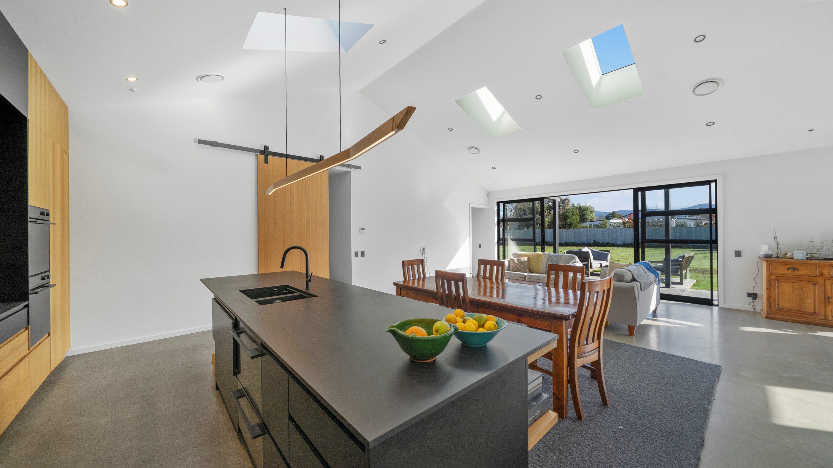 Clad in bandsawn oiled weatherboard with sleek black accents, this stunning home blends character with a sophisticated modern aesthetic. On entering through the large black alloy door, guests are welcomed into a vaulted light-filled living area. Floor-to-ceiling windows and well-placed skylights warm the polished concrete floor. In winter, a wood burner keeps the space extra cosy, and on sunny days, the large sliders open to the outdoor living and barbecue area. The sleek and stylish kitchen is located at the heart of the home. It makes a striking centrepiece – a blend of black cabinetry and oak panelling, complemented by contemporary lighting. The central island features an overhang stone benchtop, especially designed for this space. A beautiful barn-style door leads from the kitchen through to three large bedrooms and two fully tiled, immaculately appointed bathrooms. For extra warmth and comfort, the bathrooms have underfloor heating. To complete this 230sqm home, the downstairs area has a fourth bedroom, an office and a media room.