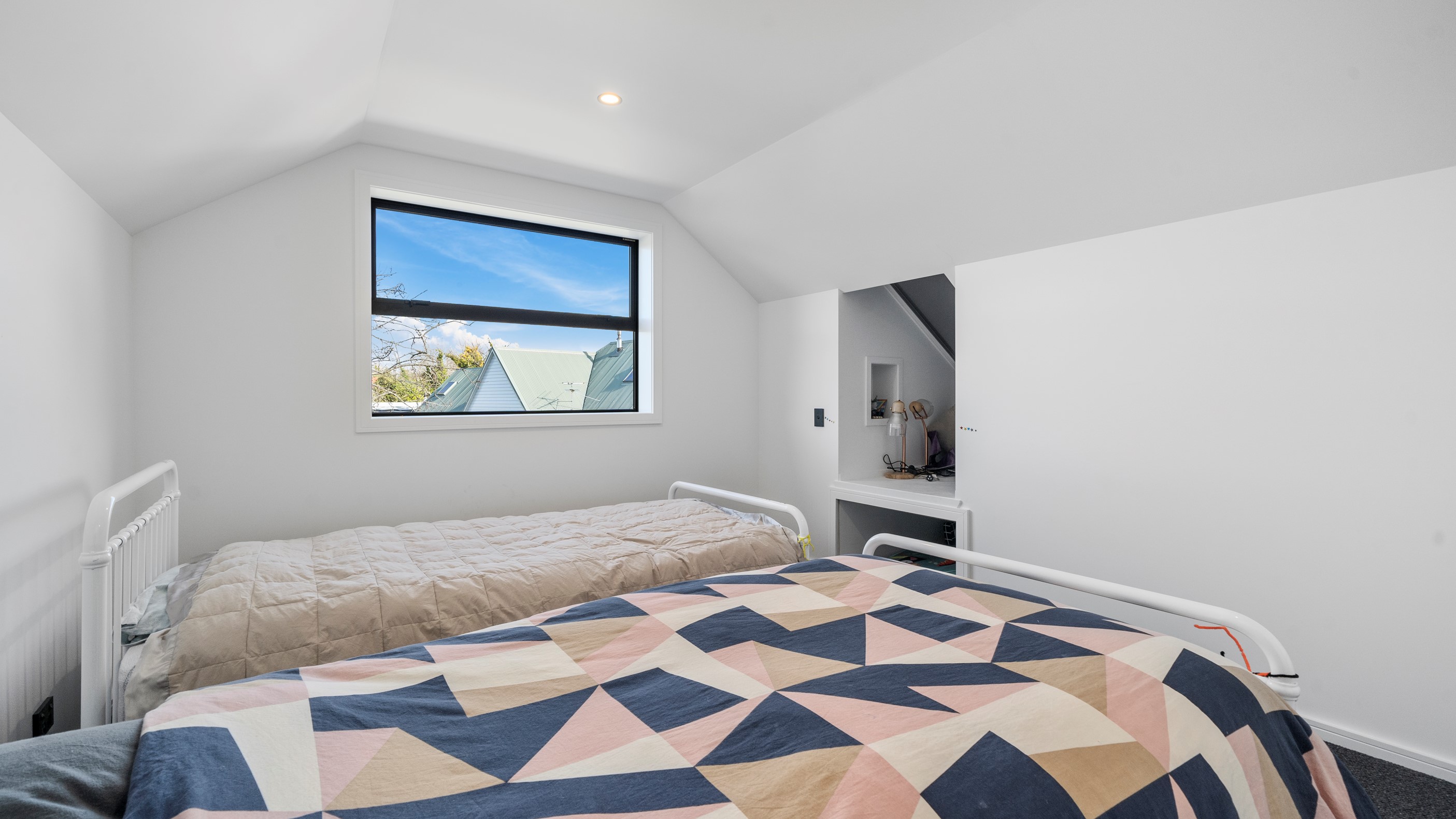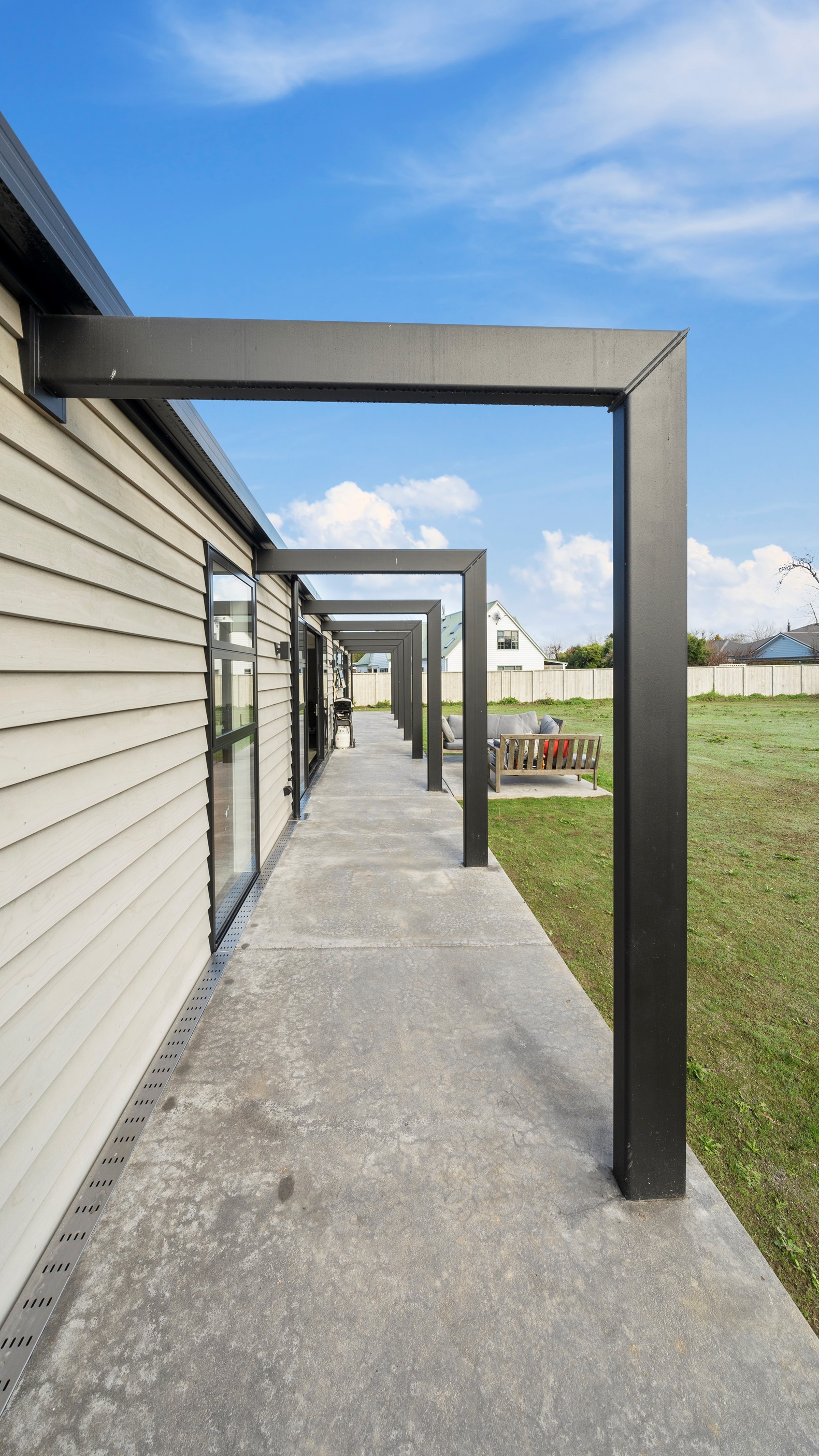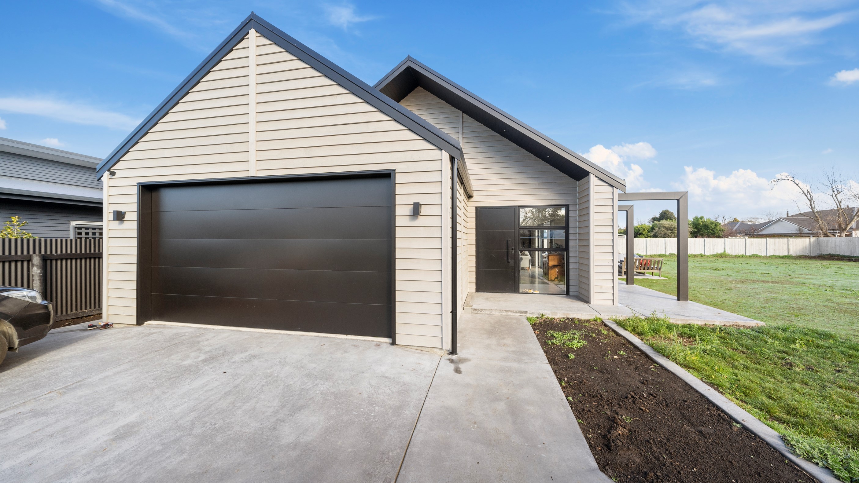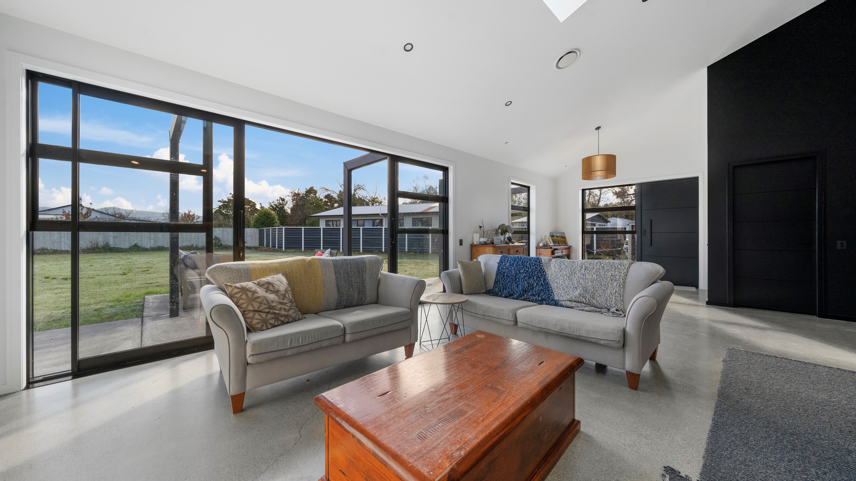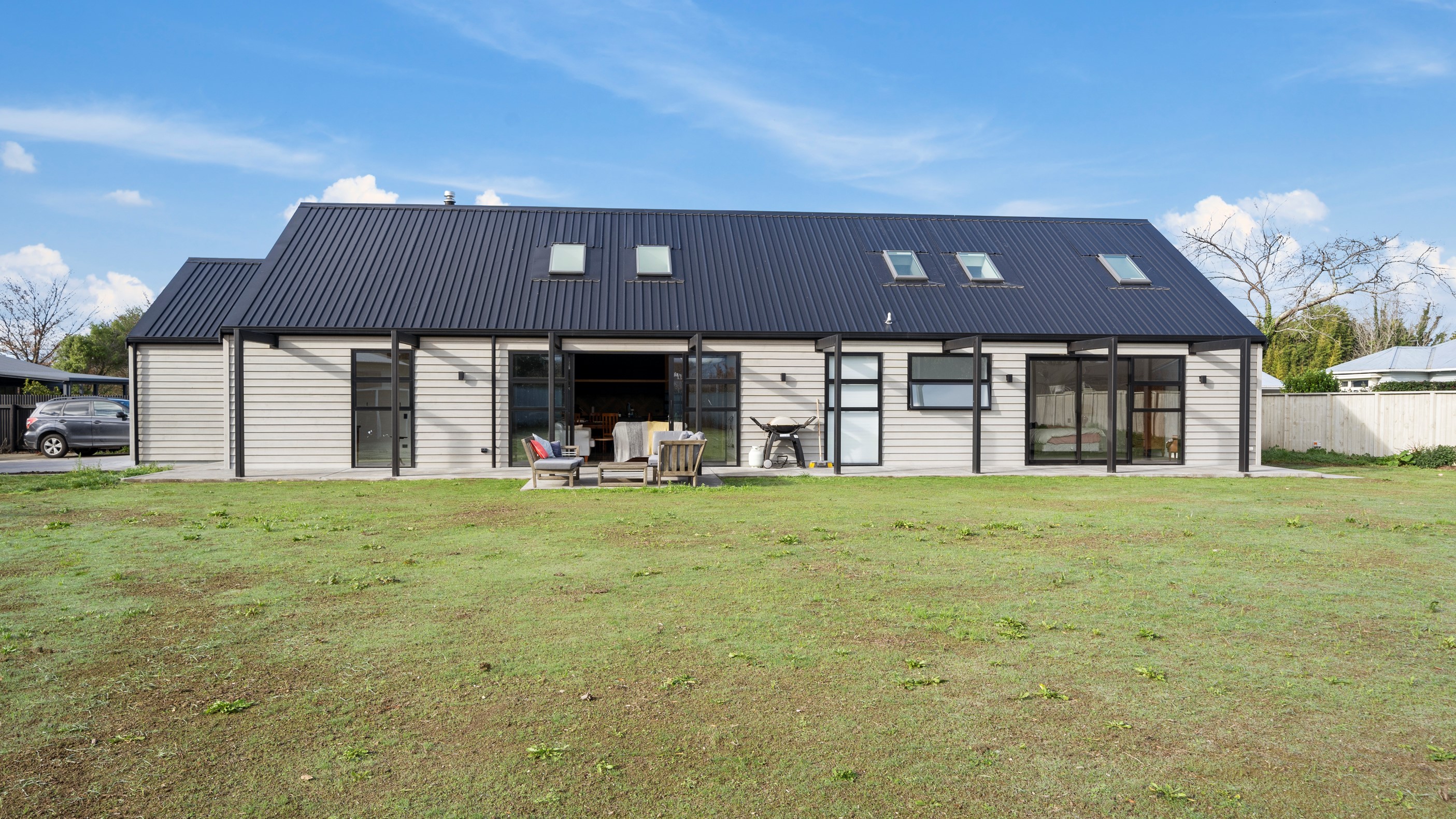 Clad in bandsawn oiled weatherboard with sleek black accents, this stunning home blends character with a sophisticated modern aesthetic. On entering through the large black alloy door, guests are welcomed into a vaulted light-filled living area. Floor-to-ceiling windows and well-placed skylights warm the polished concrete floor. In winter, a wood burner keeps the space extra cosy, and on sunny days, the large sliders open to the outdoor living and barbecue area. The sleek and stylish kitchen is located at the heart of the home. It makes a striking centrepiece – a blend of black cabinetry and oak panelling, complemented by contemporary lighting. The central island features an overhang stone benchtop, especially designed for this space. A beautiful barn-style door leads from the kitchen through to three large bedrooms and two fully tiled, immaculately appointed bathrooms. For extra warmth and comfort, the bathrooms have underfloor heating. To complete this 230sqm home, the downstairs area has a fourth bedroom, an office and a media room.