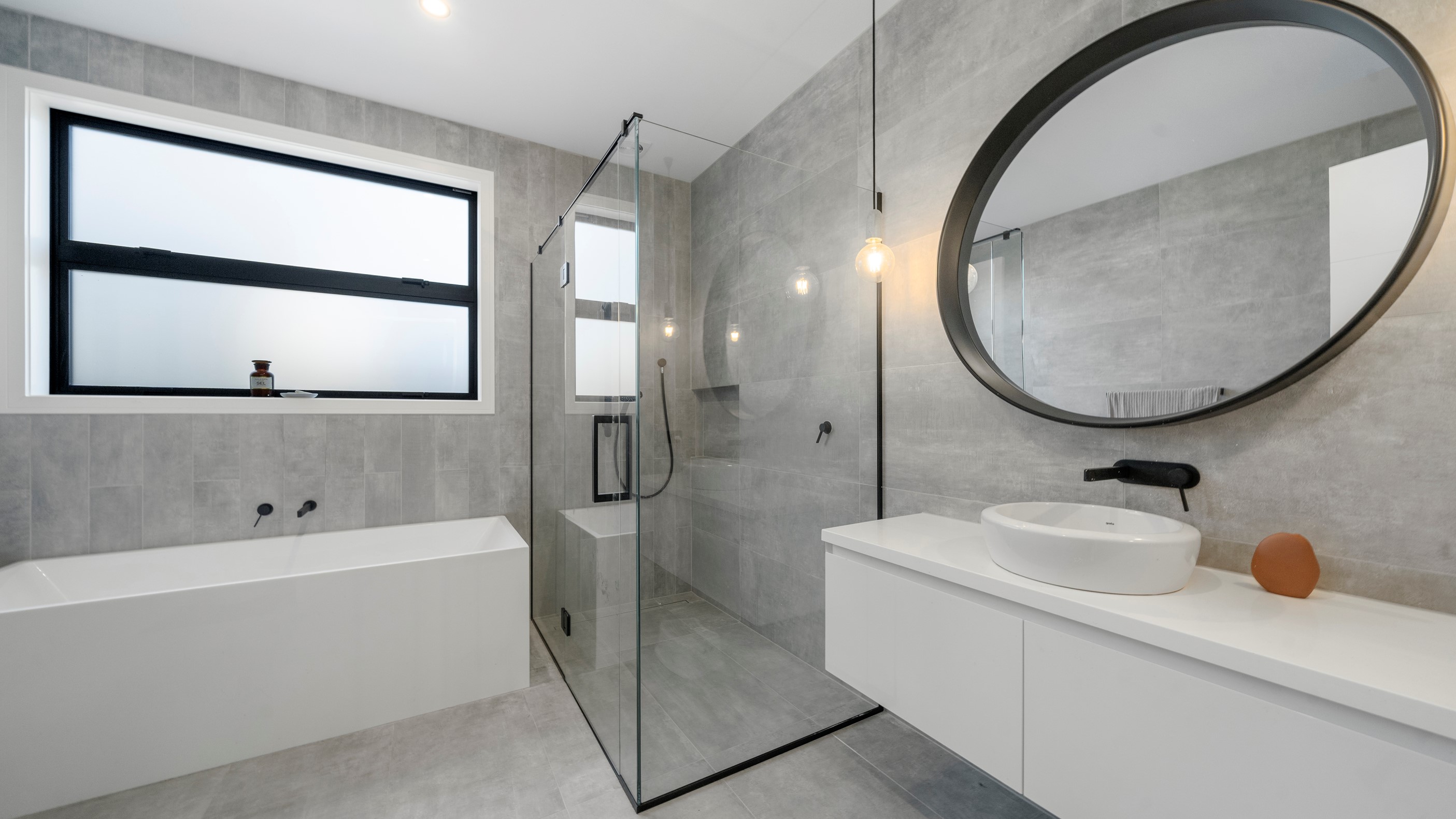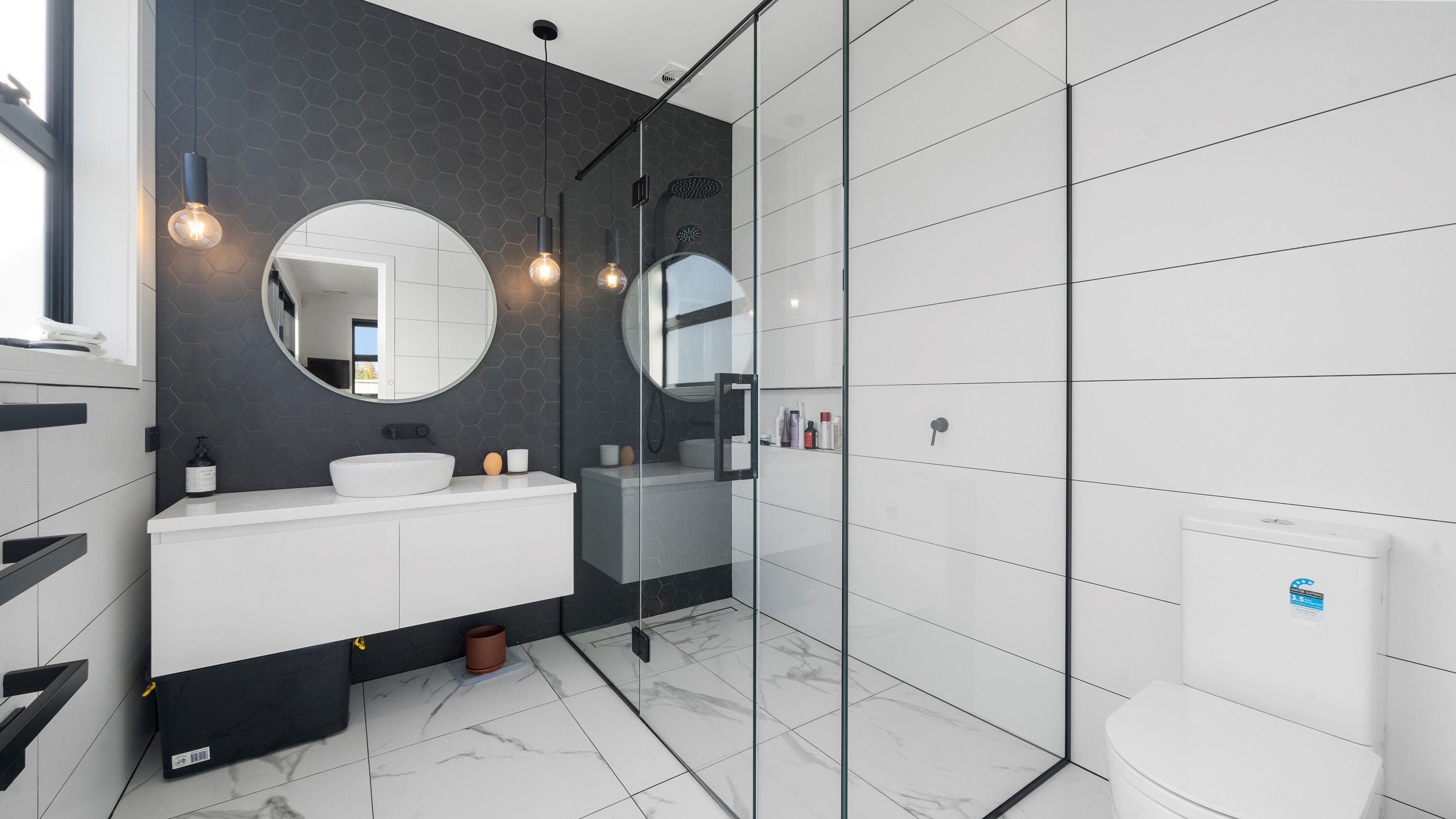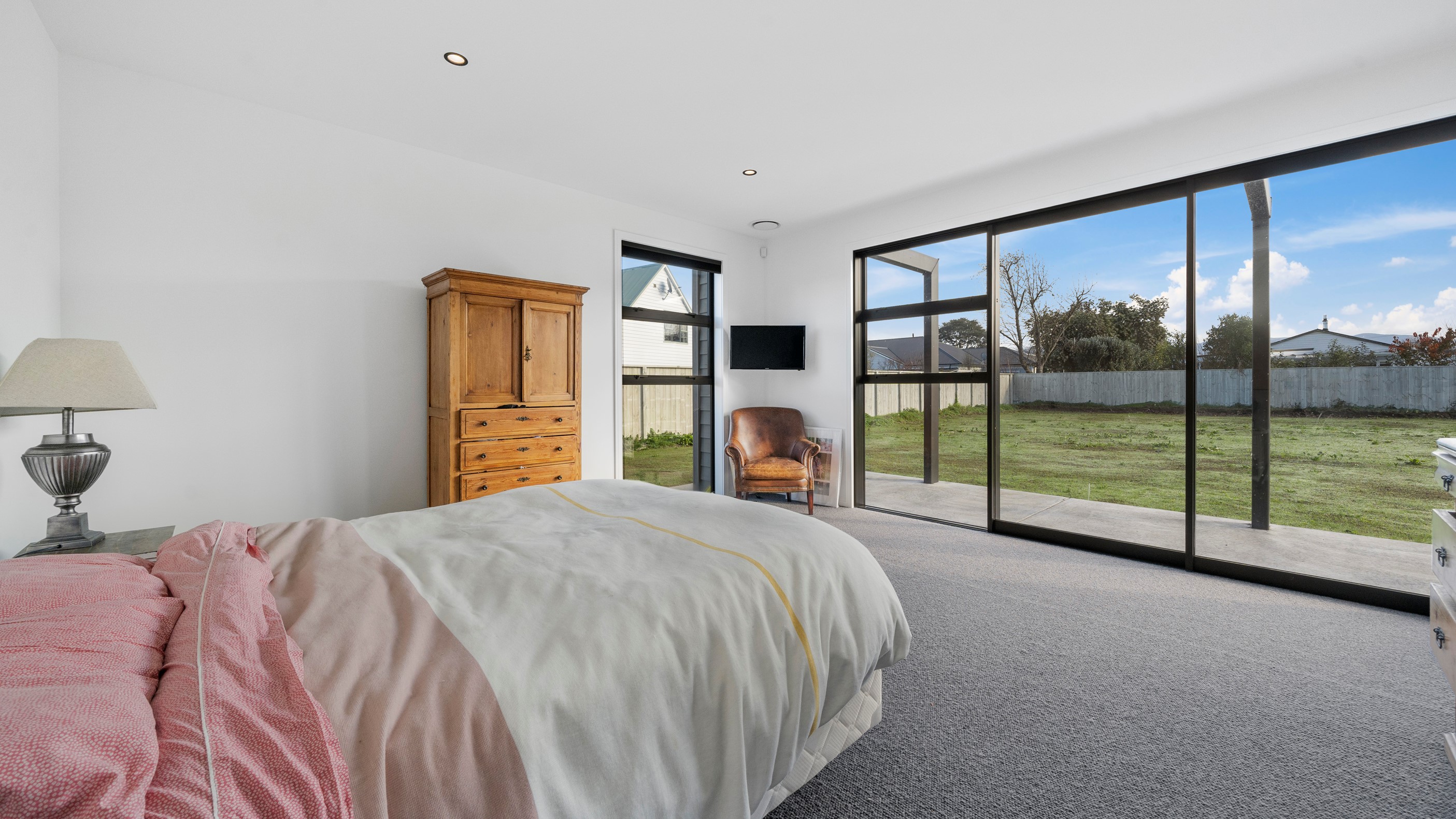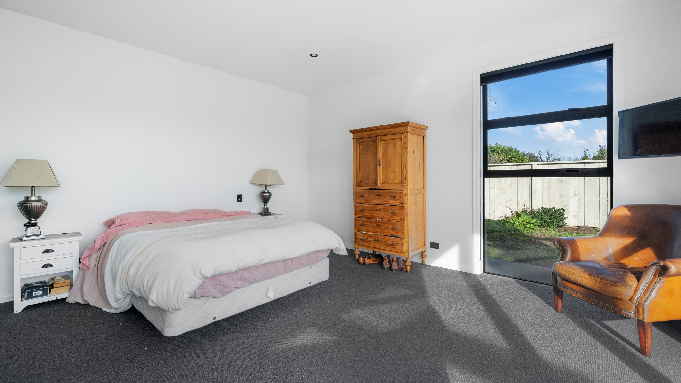 Clad in bandsawn oiled weatherboard with sleek black accents, this stunning home blends character with a sophisticated modern aesthetic. On entering through the large black alloy door, guests are welcomed into a vaulted light-filled living area. Floor-to-ceiling windows and well-placed skylights warm the polished concrete floor. In winter, a wood burner keeps the space extra cosy, and on sunny days, the large sliders open to the outdoor living and barbecue area. The sleek and stylish kitchen is located at the heart of the home. It makes a striking centrepiece – a blend of black cabinetry and oak panelling, complemented by contemporary lighting. The central island features an overhang stone benchtop, especially designed for this space. A beautiful barn-style door leads from the kitchen through to three large bedrooms and two fully tiled, immaculately appointed bathrooms. For extra warmth and comfort, the bathrooms have underfloor heating. To complete this 230sqm home, the downstairs area has a fourth bedroom, an office and a media room.