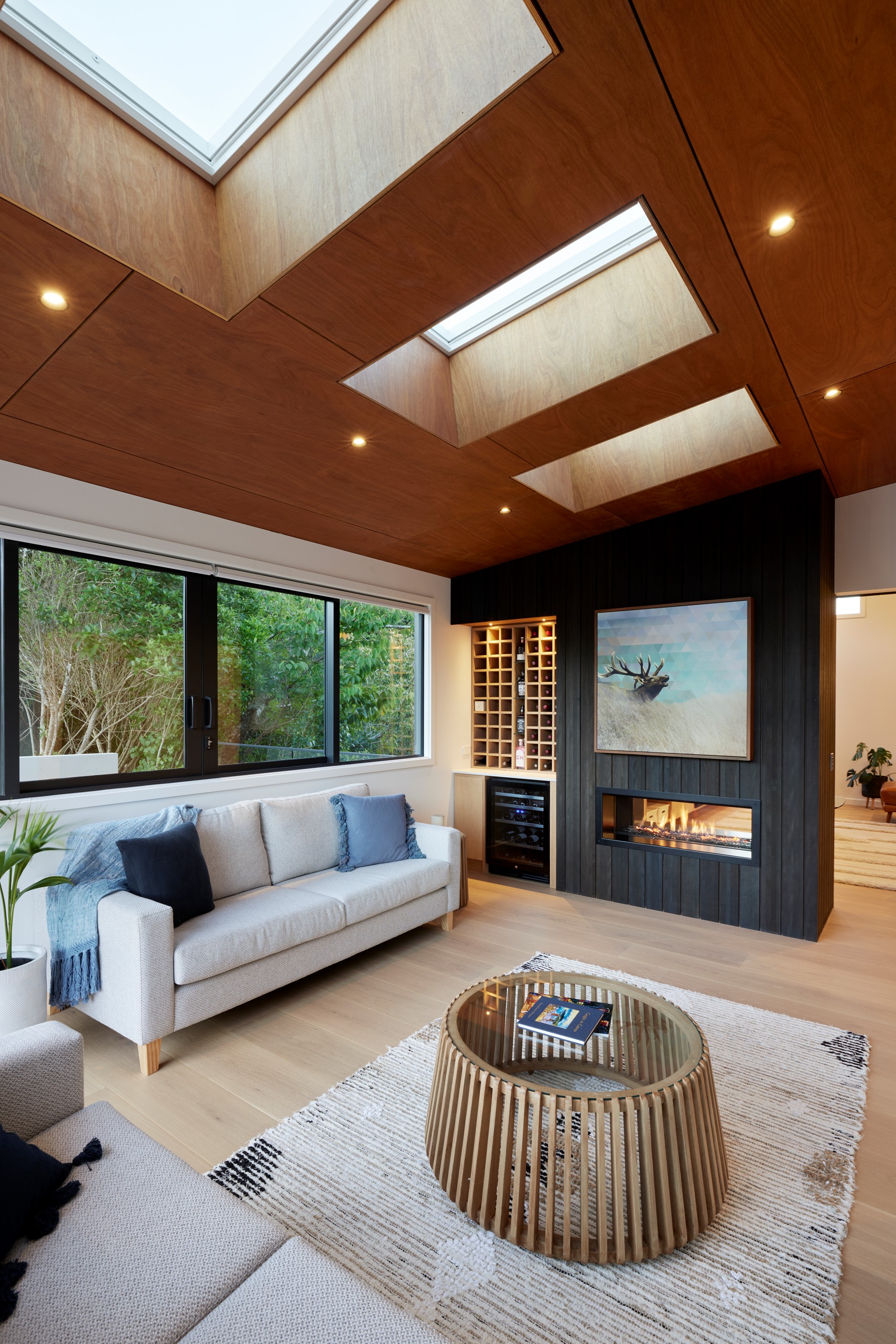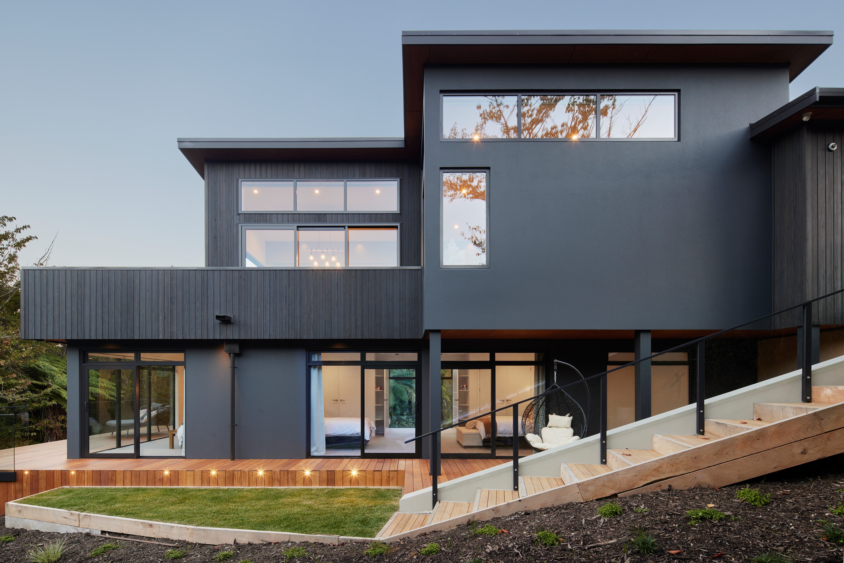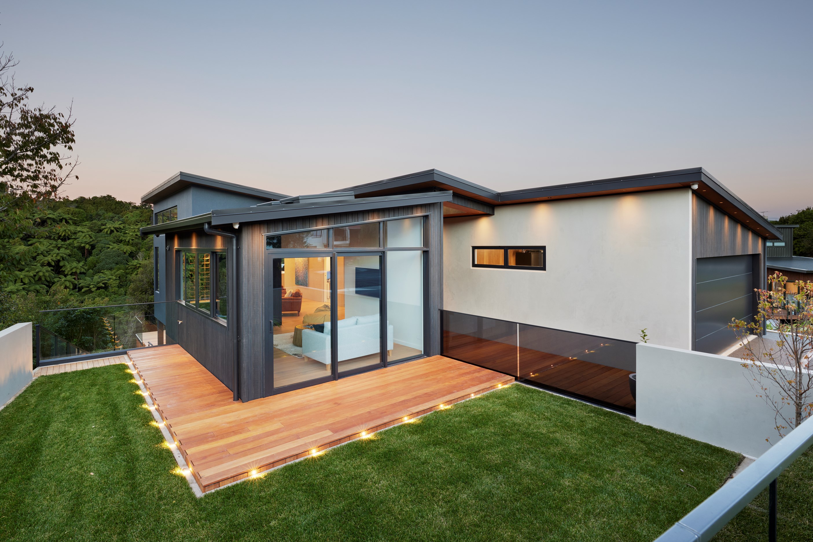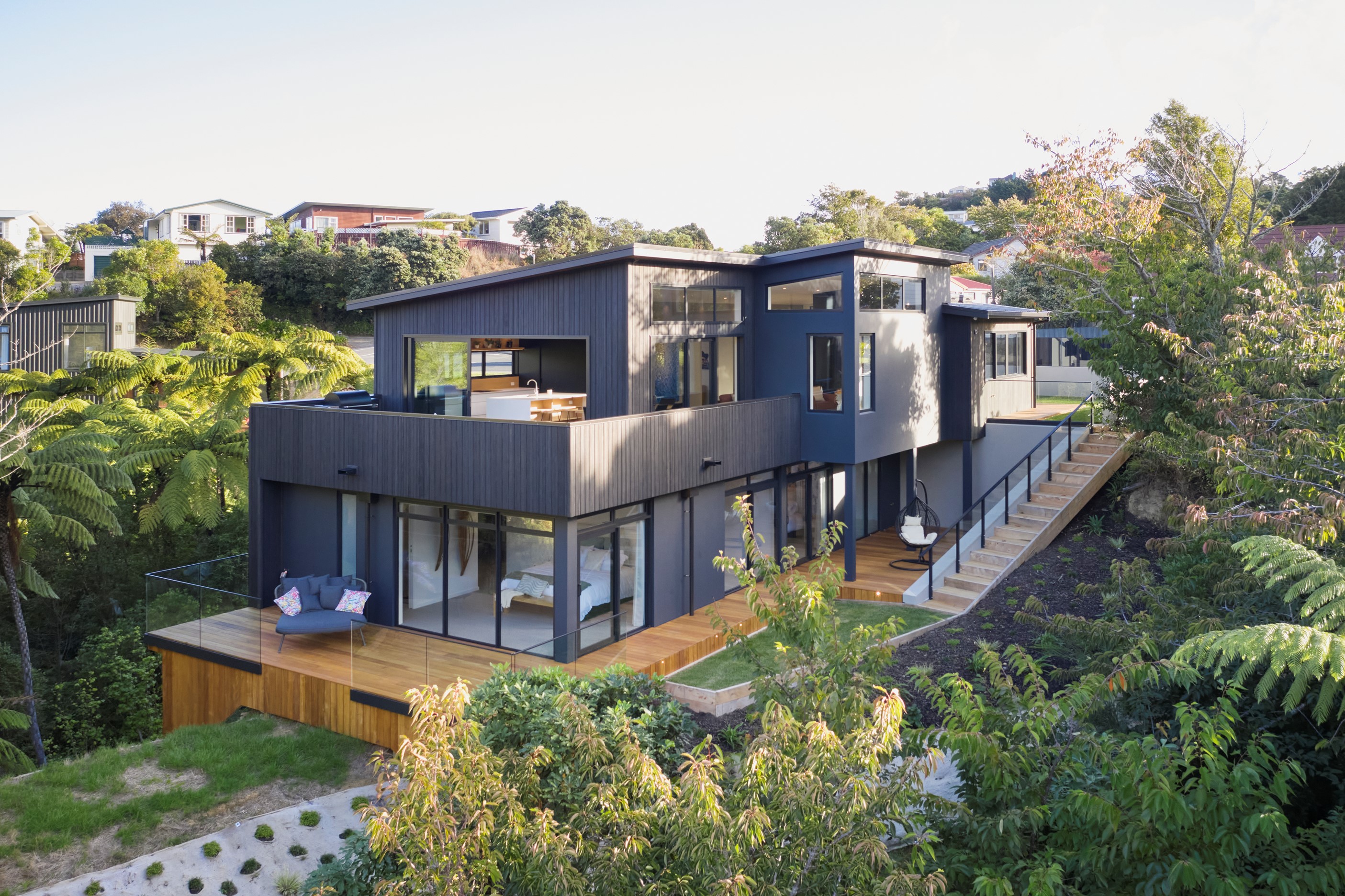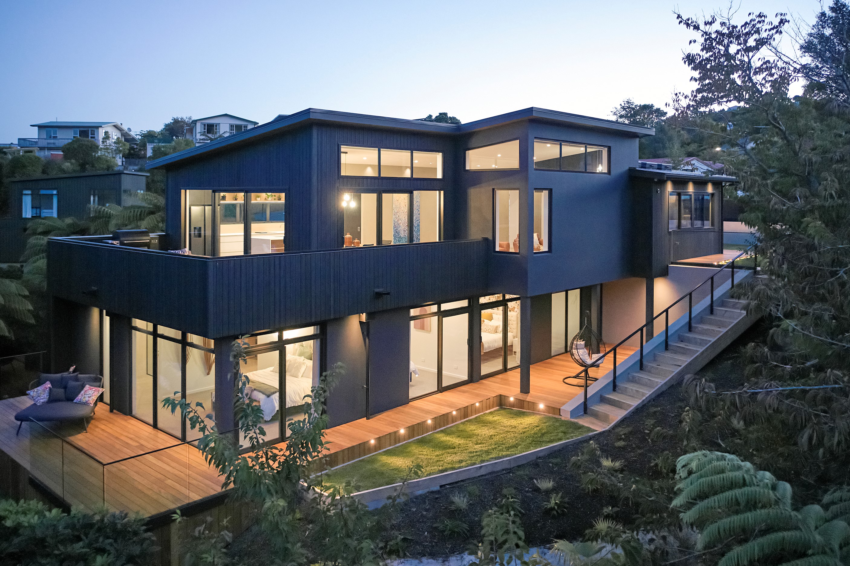 As show homes go, this is a beauty – two-storeys perched on a ridge with three sides connecting with a reserve covered in native bush. Not only an exemplar of good building practice, it also demonstrates what can be achieved on a tricky site and how to beautifully settle a home into a bush-clad section. Built to maximise all-day sun and beautiful surrounds, the four-bedroom, two-bathroom home has spacious living, plenty of glass and outdoor areas that nestle into the environs. Extensive use of dark timber on the outside helps embed the 268sqm house on the site. Inside, the timber decor dovetails with the views. Skylights crafted into timber ceilings funnel light into living spaces and glazed doors open the house to stairs and the lush, green expanses beyond. The elegant kitchen is part and parcel of the open-plan living area and has a walk-in pantry. Although this home, which also has a double garage, laundry, study and powder room, is built over two levels progressing down the site, it has been future-proofed for potential owners. Inside you’ll also find a lift.