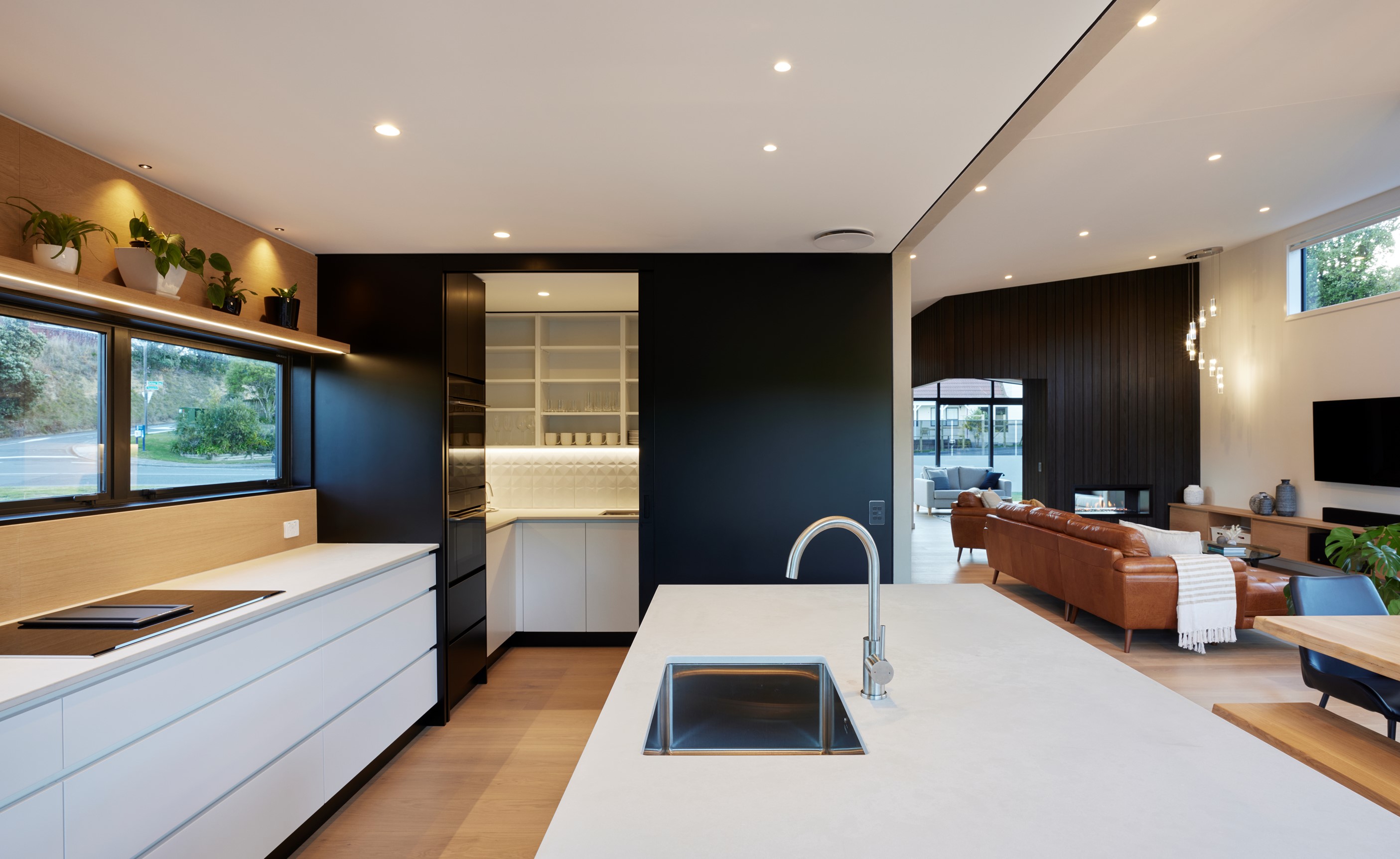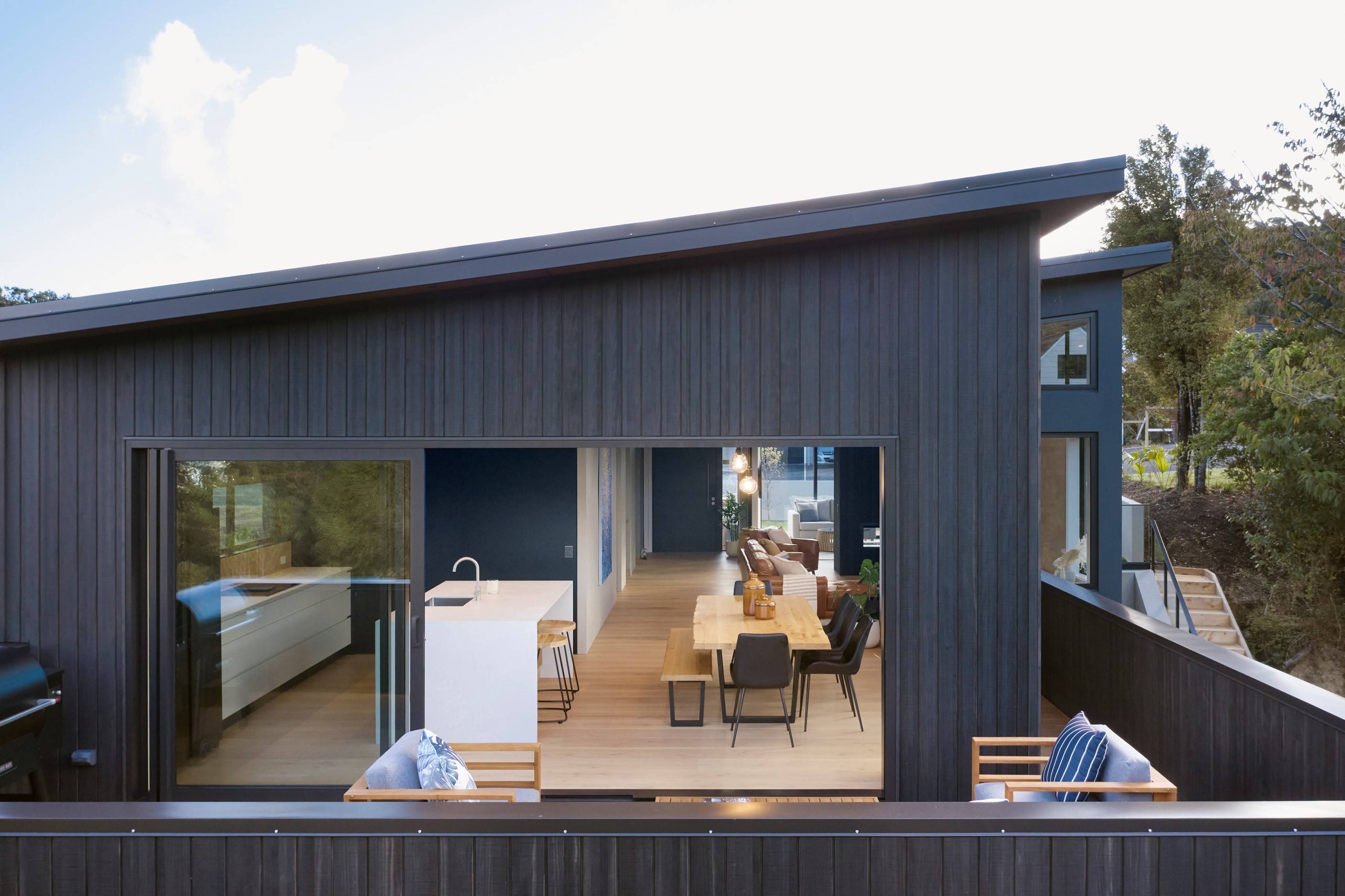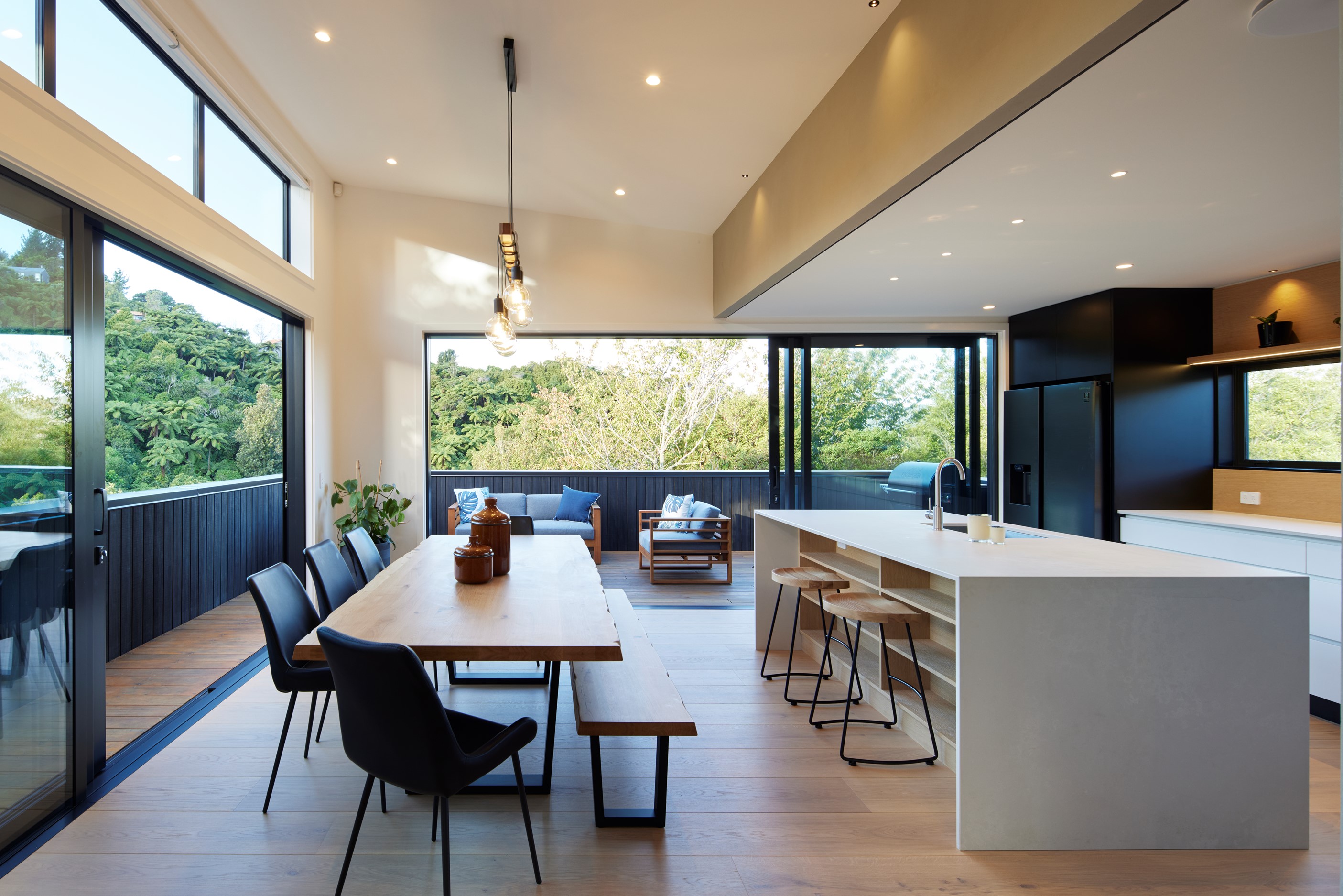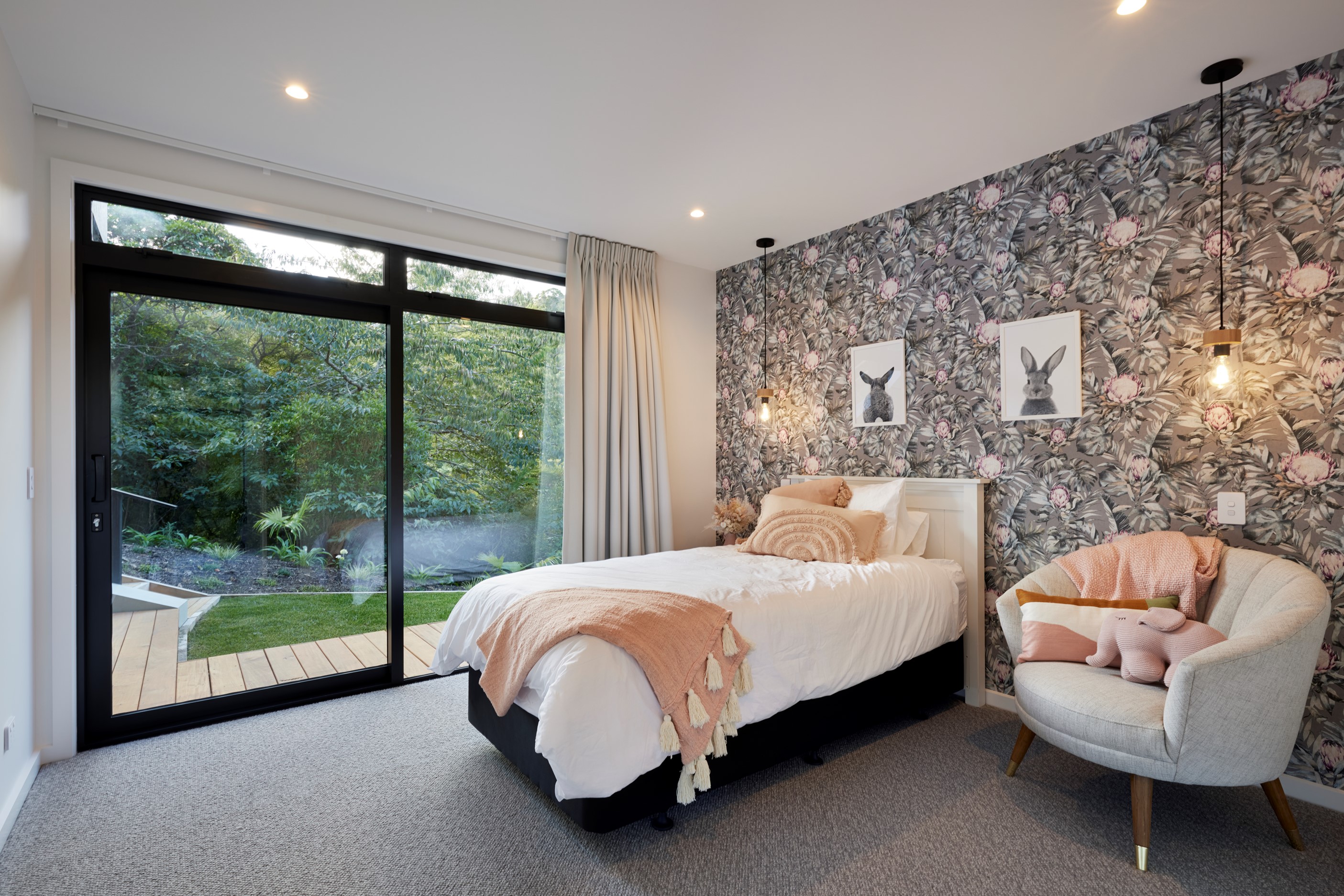 As show homes go, this is a beauty – two-storeys perched on a ridge with three sides connecting with a reserve covered in native bush. Not only an exemplar of good building practice, it also demonstrates what can be achieved on a tricky site and how to beautifully settle a home into a bush-clad section. Built to maximise all-day sun and beautiful surrounds, the four-bedroom, two-bathroom home has spacious living, plenty of glass and outdoor areas that nestle into the environs. Extensive use of dark timber on the outside helps embed the 268sqm house on the site. Inside, the timber decor dovetails with the views. Skylights crafted into timber ceilings funnel light into living spaces and glazed doors open the house to stairs and the lush, green expanses beyond. The elegant kitchen is part and parcel of the open-plan living area and has a walk-in pantry. Although this home, which also has a double garage, laundry, study and powder room, is built over two levels progressing down the site, it has been future-proofed for potential owners. Inside you’ll also find a lift.