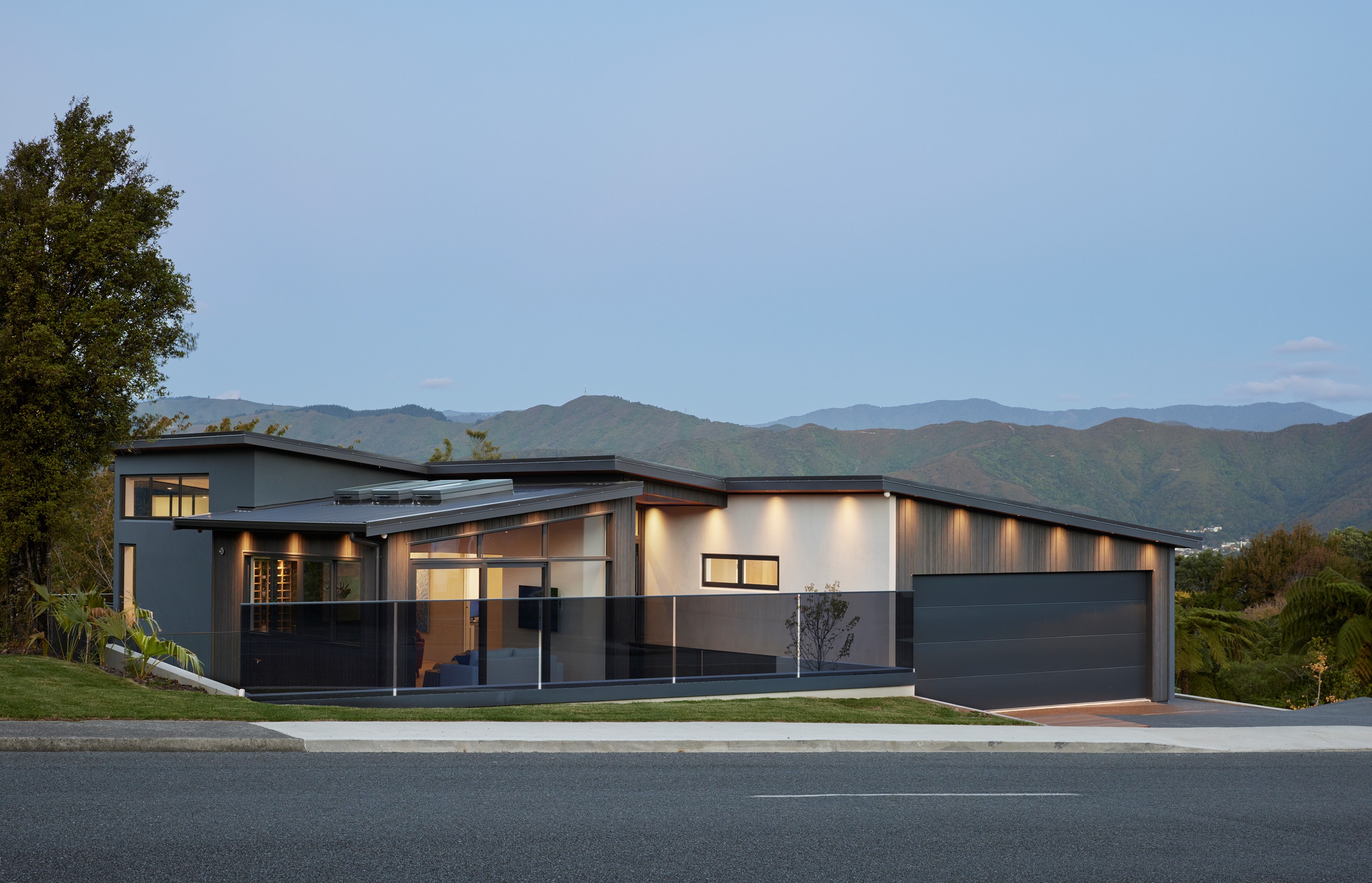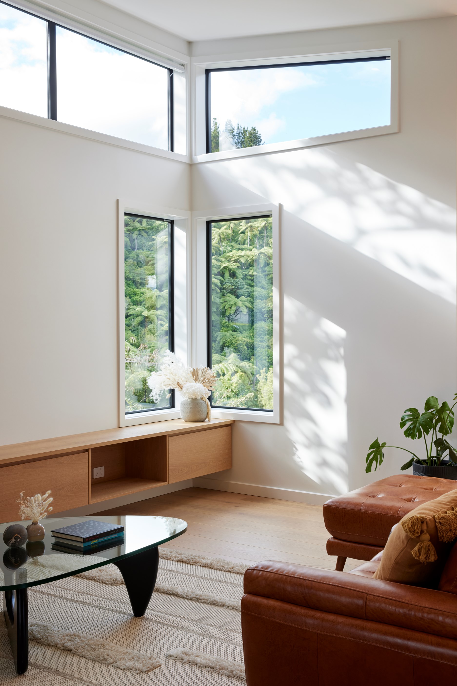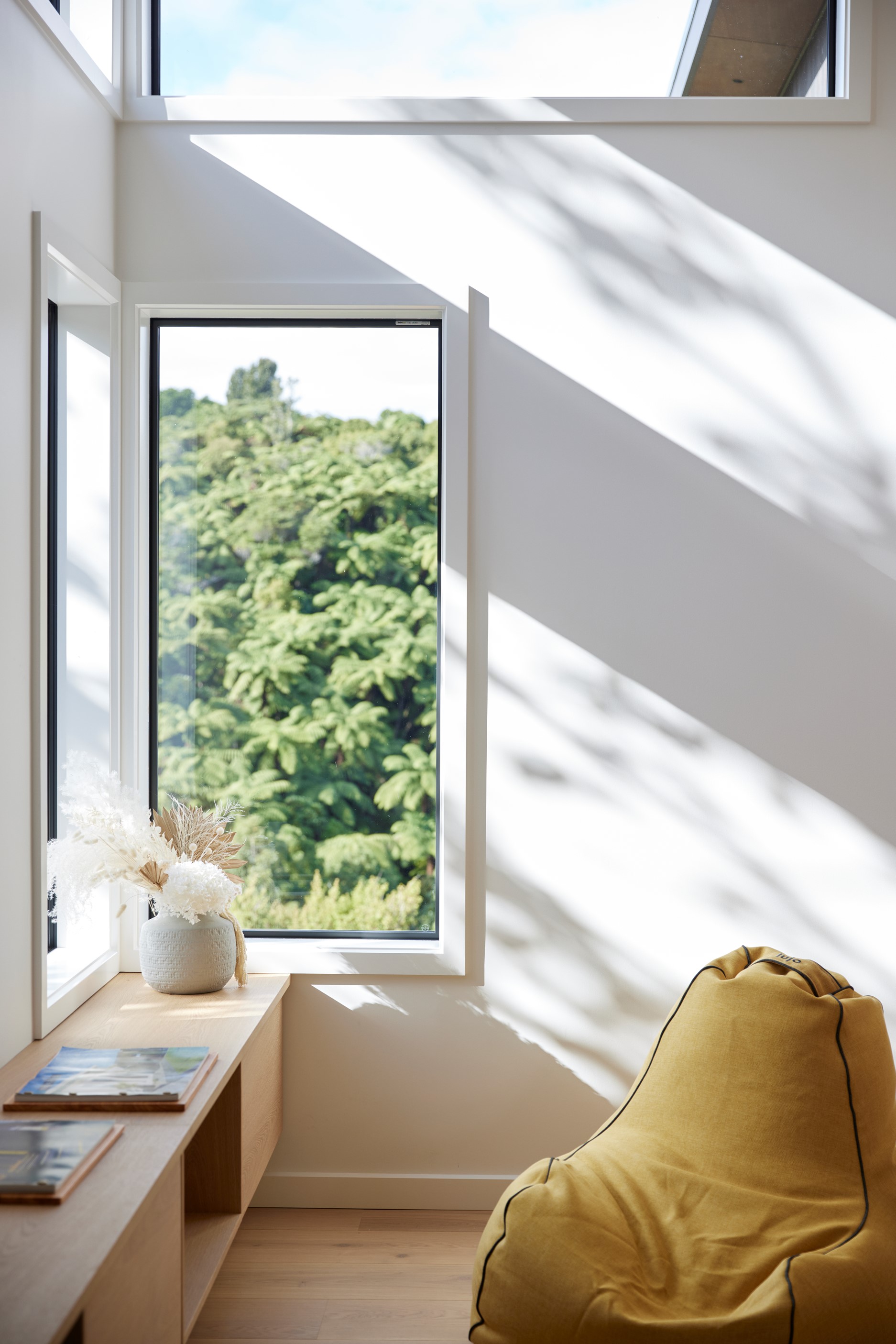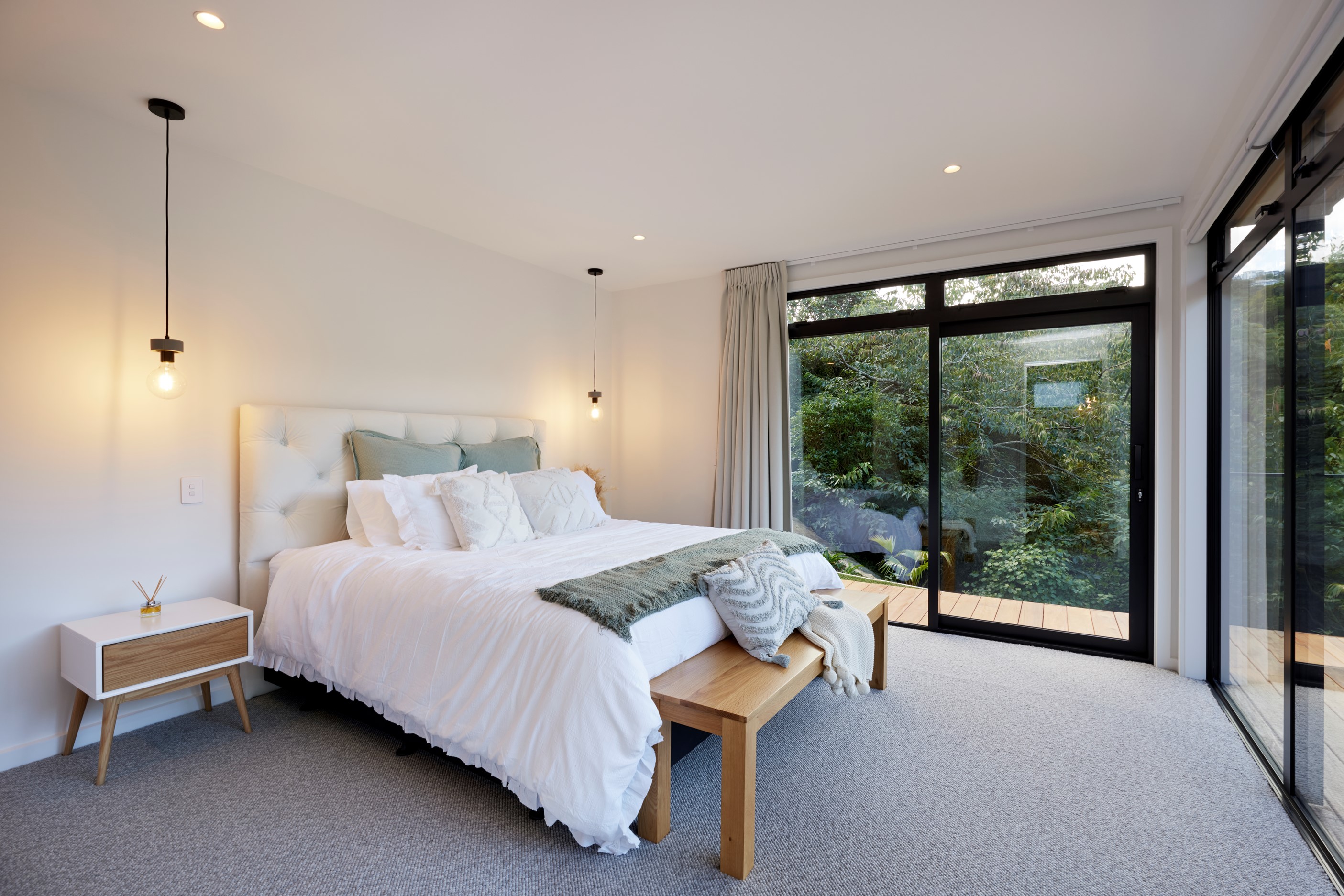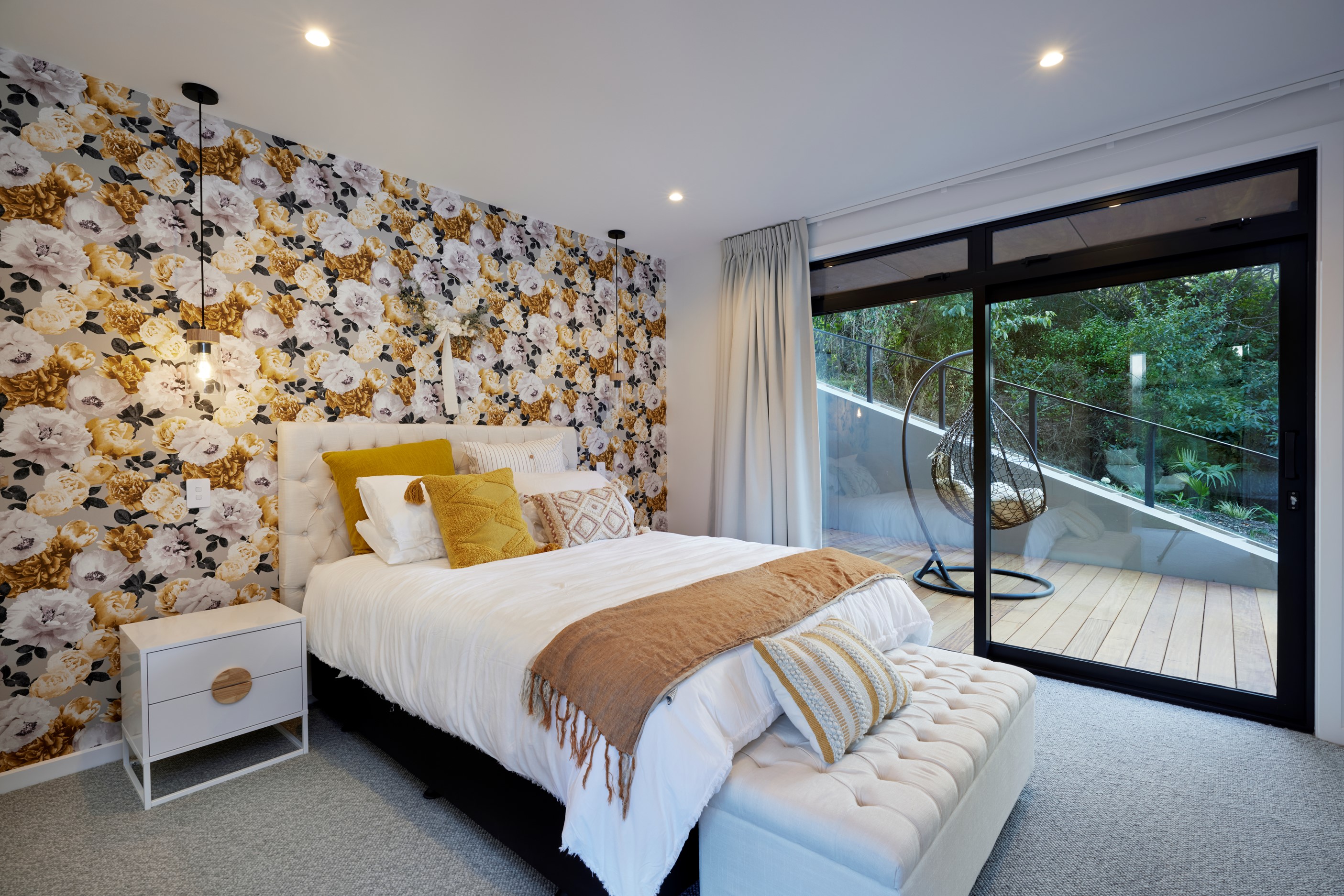 As show homes go, this is a beauty – two-storeys perched on a ridge with three sides connecting with a reserve covered in native bush. Not only an exemplar of good building practice, it also demonstrates what can be achieved on a tricky site and how to beautifully settle a home into a bush-clad section. Built to maximise all-day sun and beautiful surrounds, the four-bedroom, two-bathroom home has spacious living, plenty of glass and outdoor areas that nestle into the environs. Extensive use of dark timber on the outside helps embed the 268sqm house on the site. Inside, the timber decor dovetails with the views. Skylights crafted into timber ceilings funnel light into living spaces and glazed doors open the house to stairs and the lush, green expanses beyond. The elegant kitchen is part and parcel of the open-plan living area and has a walk-in pantry. Although this home, which also has a double garage, laundry, study and powder room, is built over two levels progressing down the site, it has been future-proofed for potential owners. Inside you’ll also find a lift.