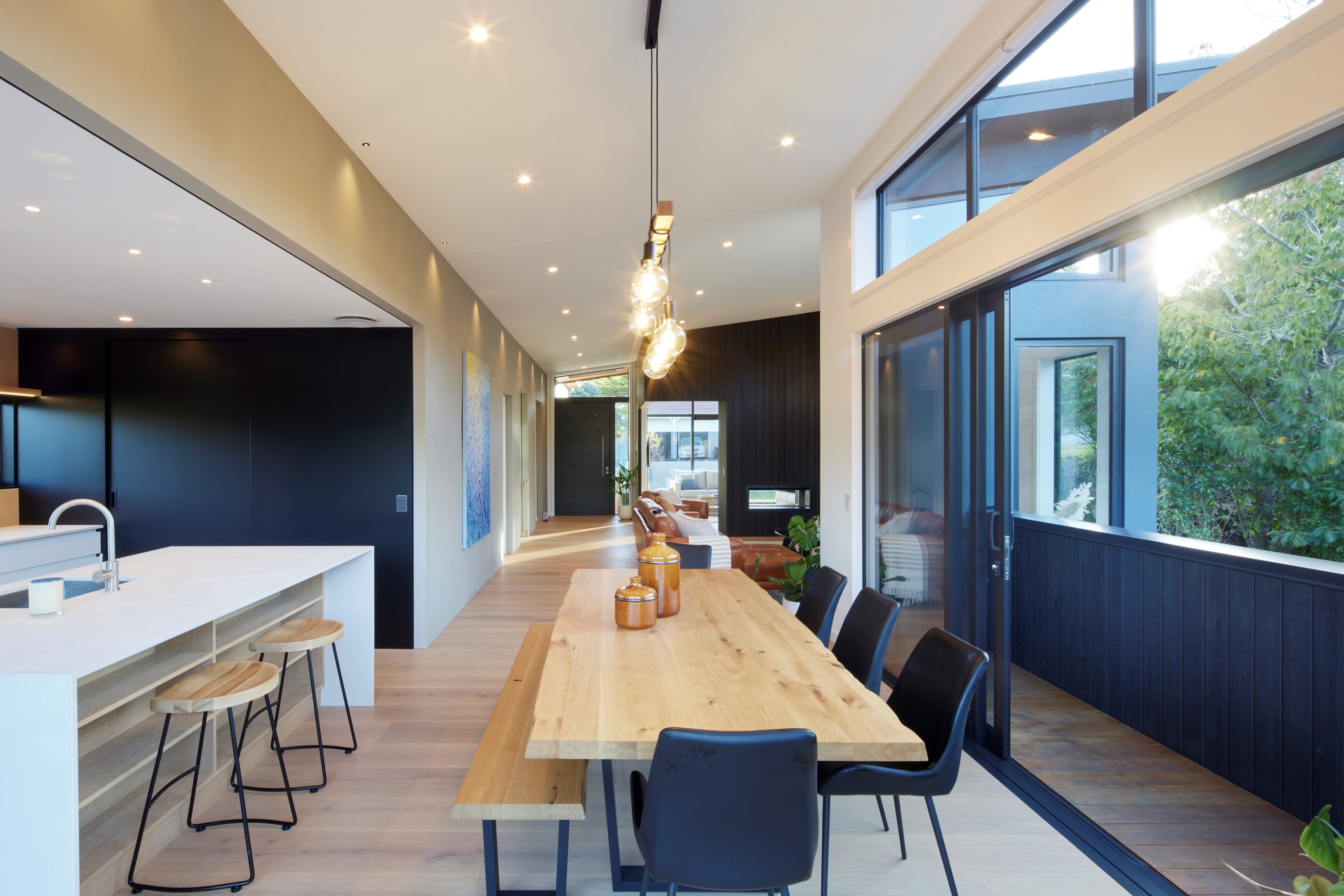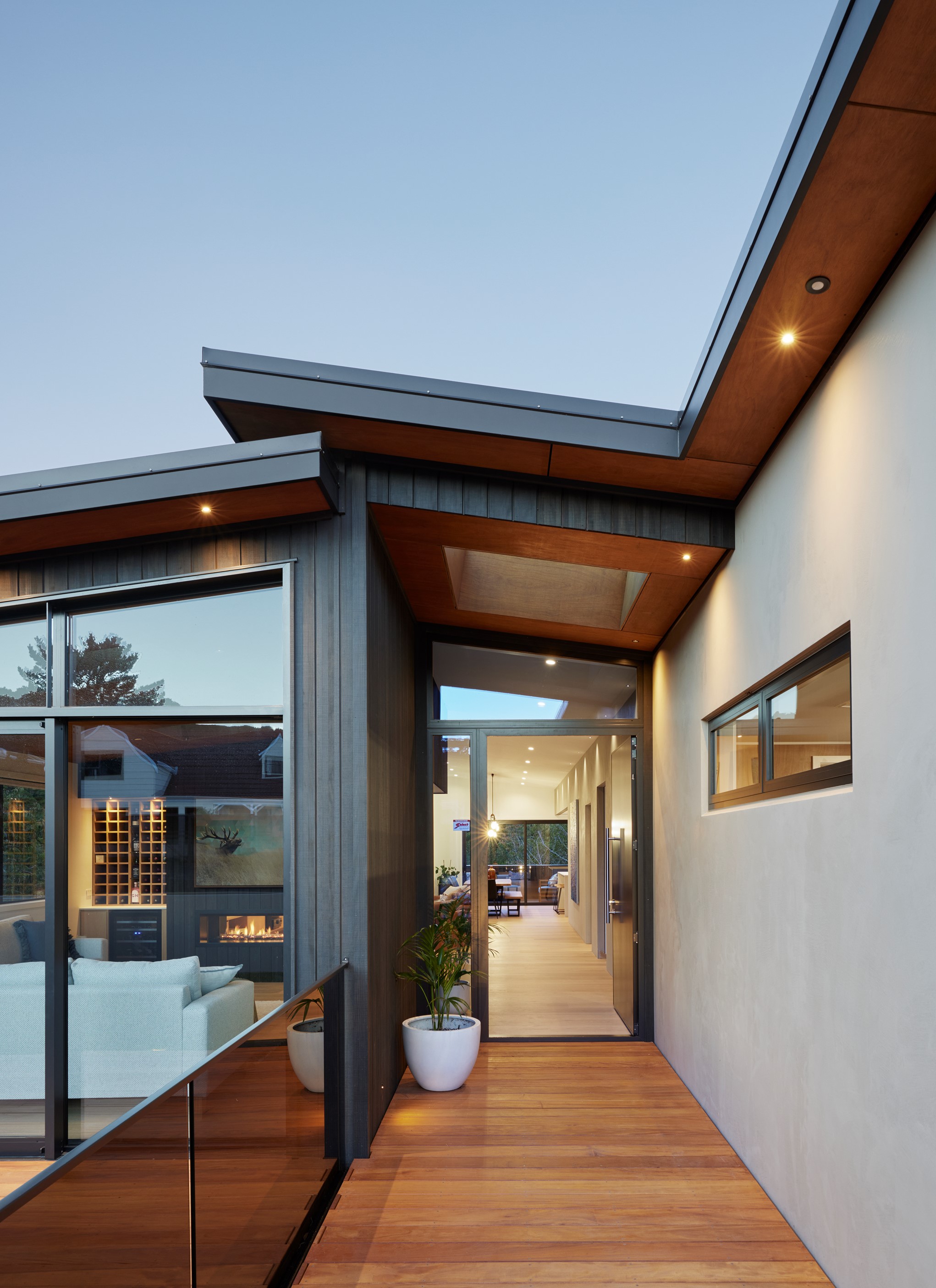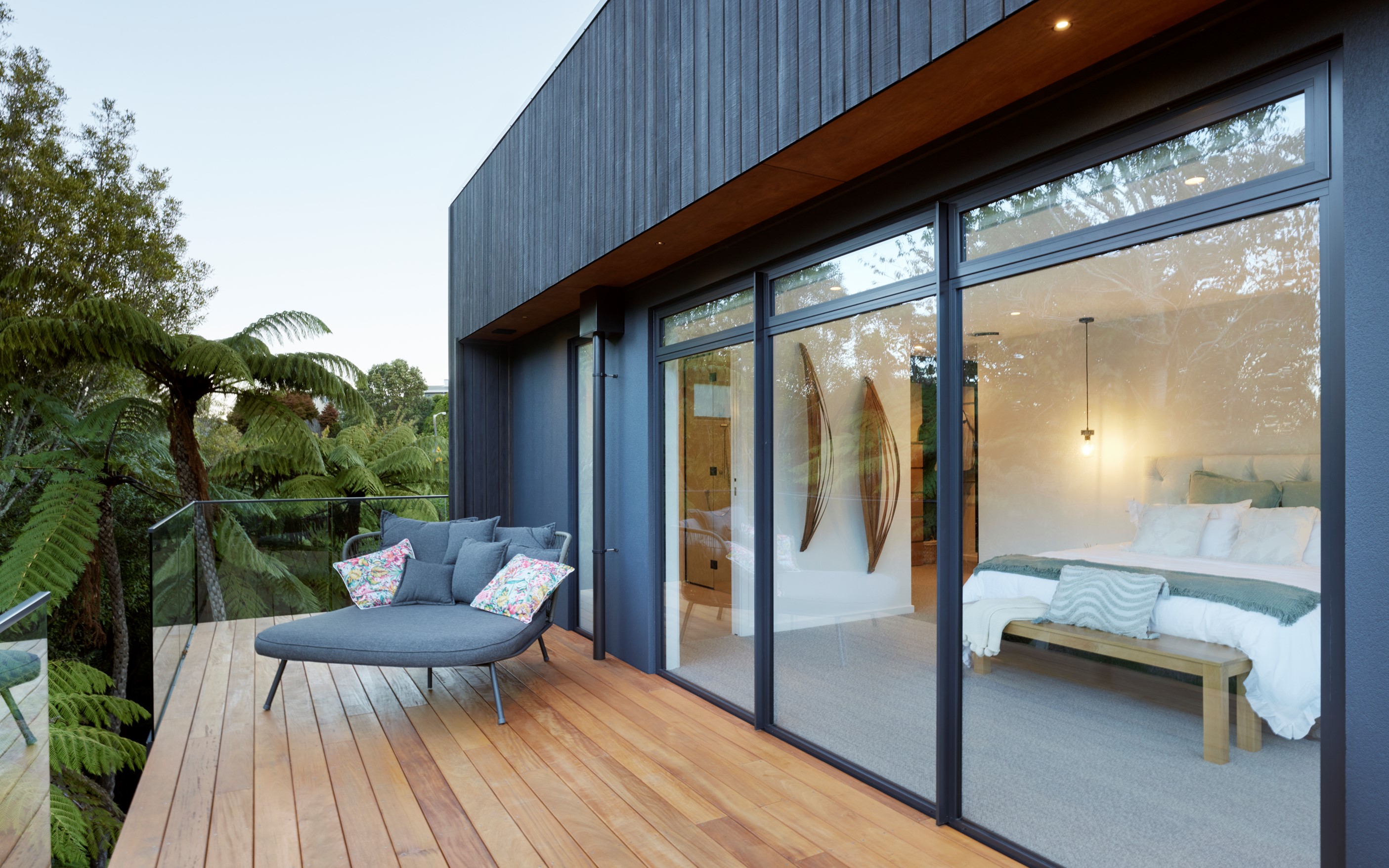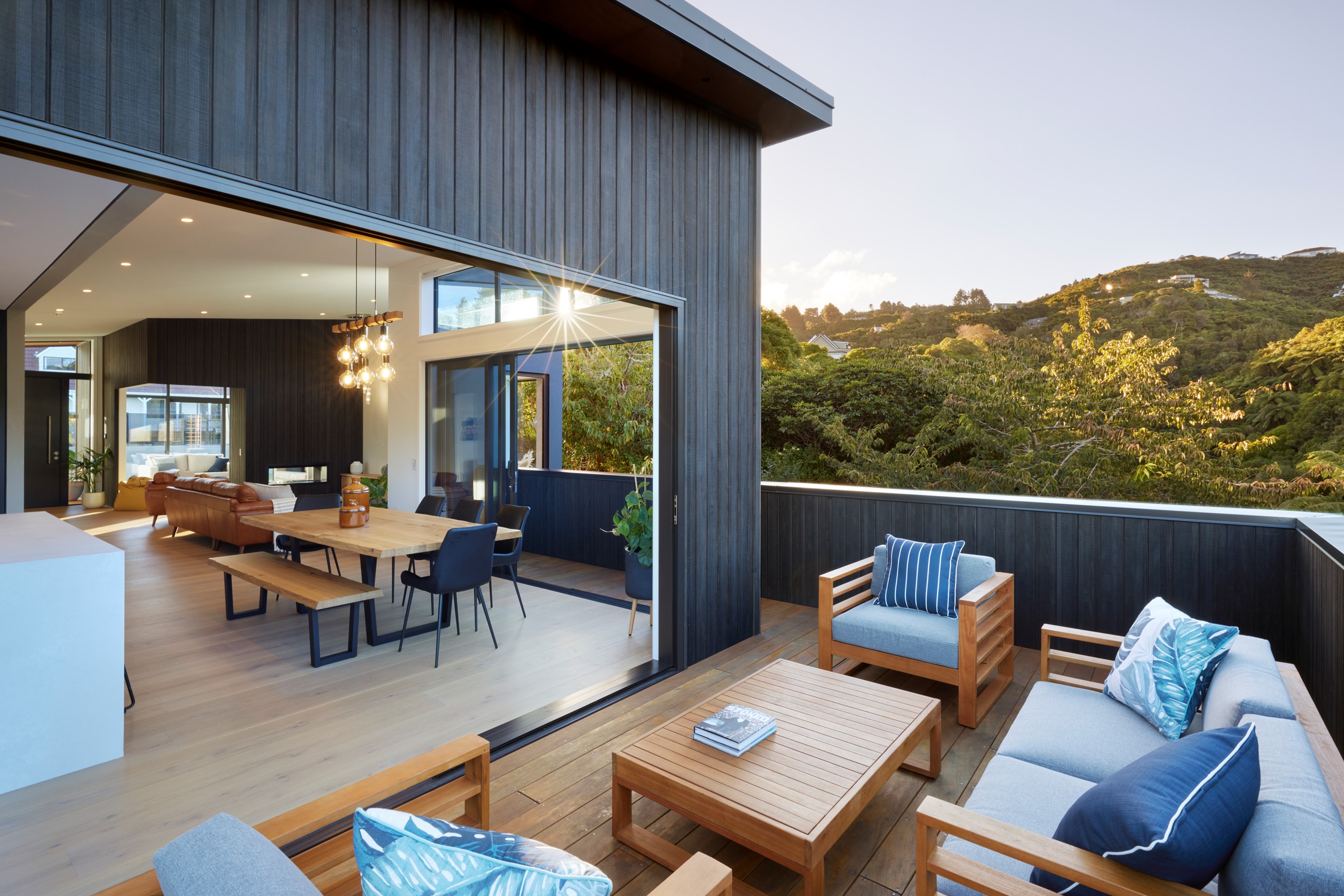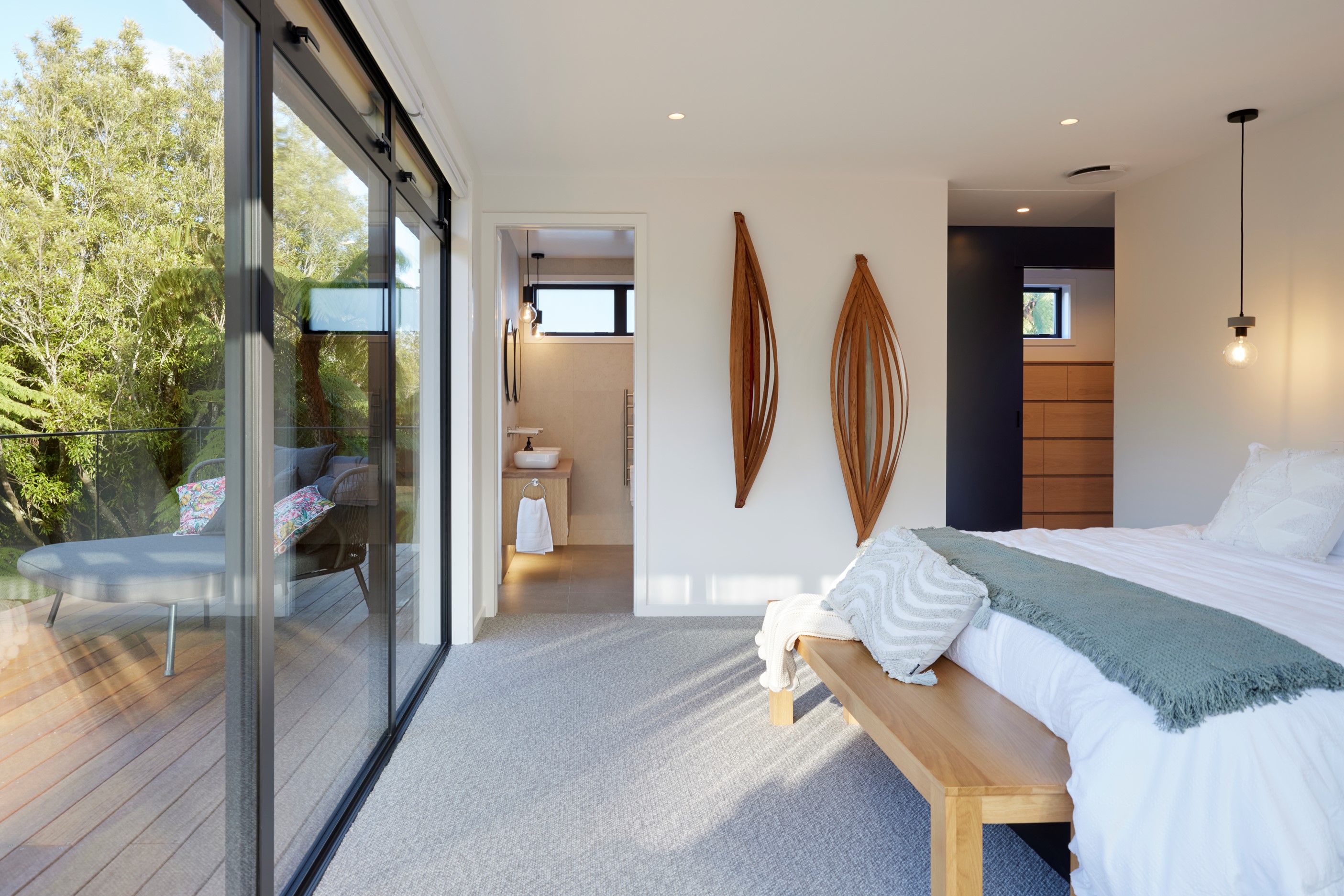 As show homes go, this is a beauty – two-storeys perched on a ridge with three sides connecting with a reserve covered in native bush. Not only an exemplar of good building practice, it also demonstrates what can be achieved on a tricky site and how to beautifully settle a home into a bush-clad section. Built to maximise all-day sun and beautiful surrounds, the four-bedroom, two-bathroom home has spacious living, plenty of glass and outdoor areas that nestle into the environs. Extensive use of dark timber on the outside helps embed the 268sqm house on the site. Inside, the timber decor dovetails with the views. Skylights crafted into timber ceilings funnel light into living spaces and glazed doors open the house to stairs and the lush, green expanses beyond. The elegant kitchen is part and parcel of the open-plan living area and has a walk-in pantry. Although this home, which also has a double garage, laundry, study and powder room, is built over two levels progressing down the site, it has been future-proofed for potential owners. Inside you’ll also find a lift.