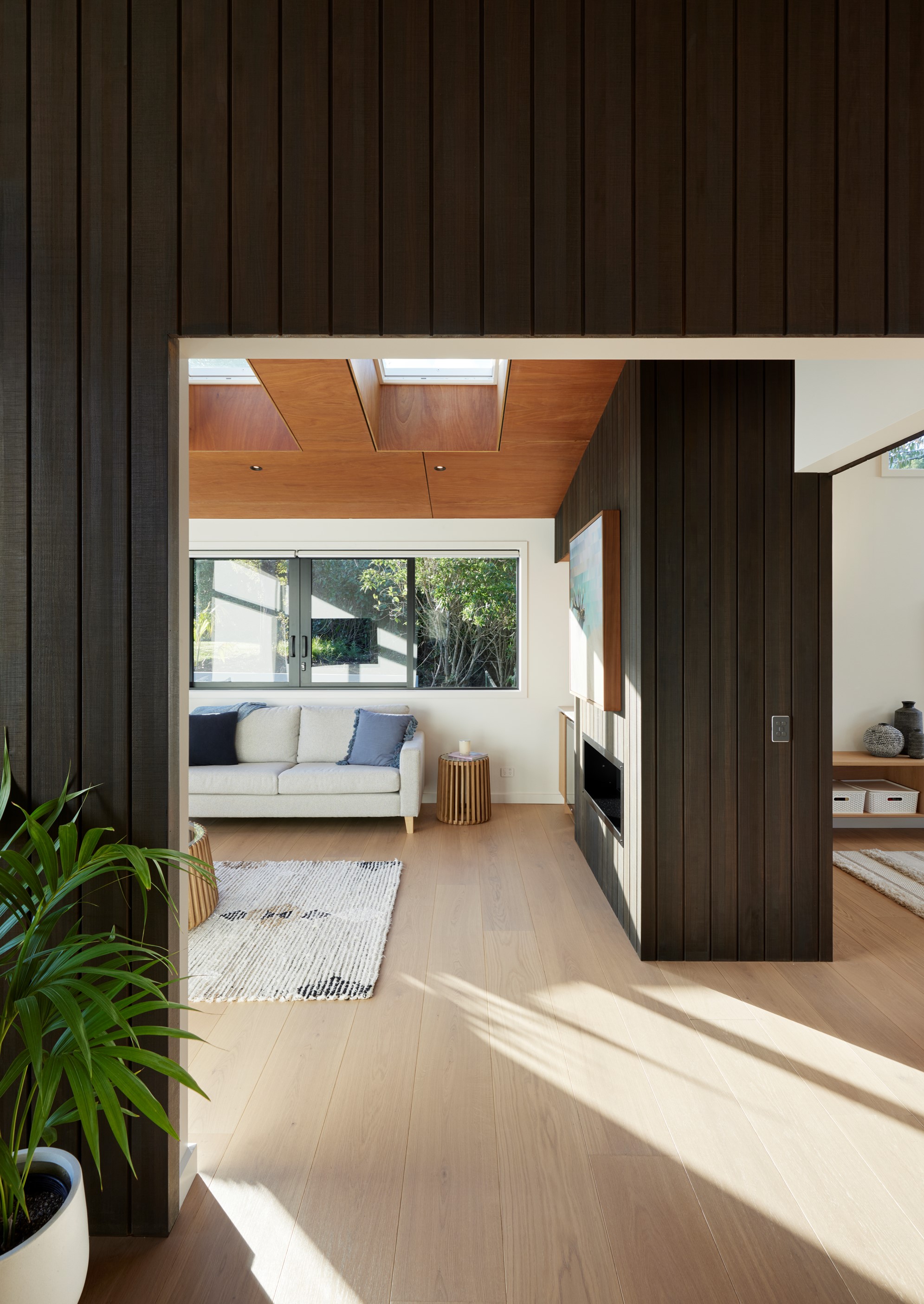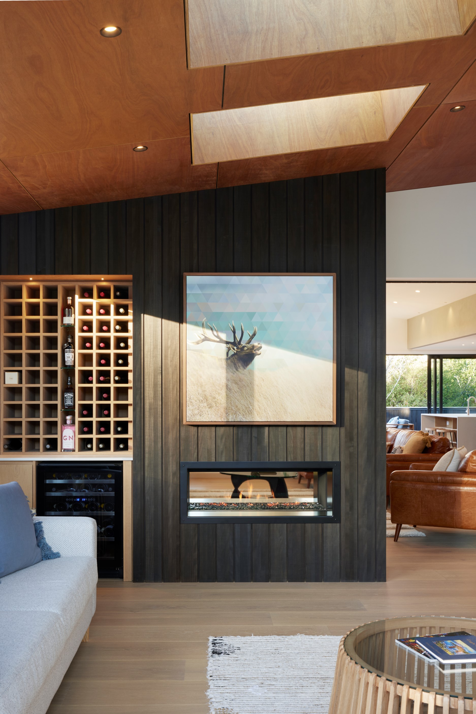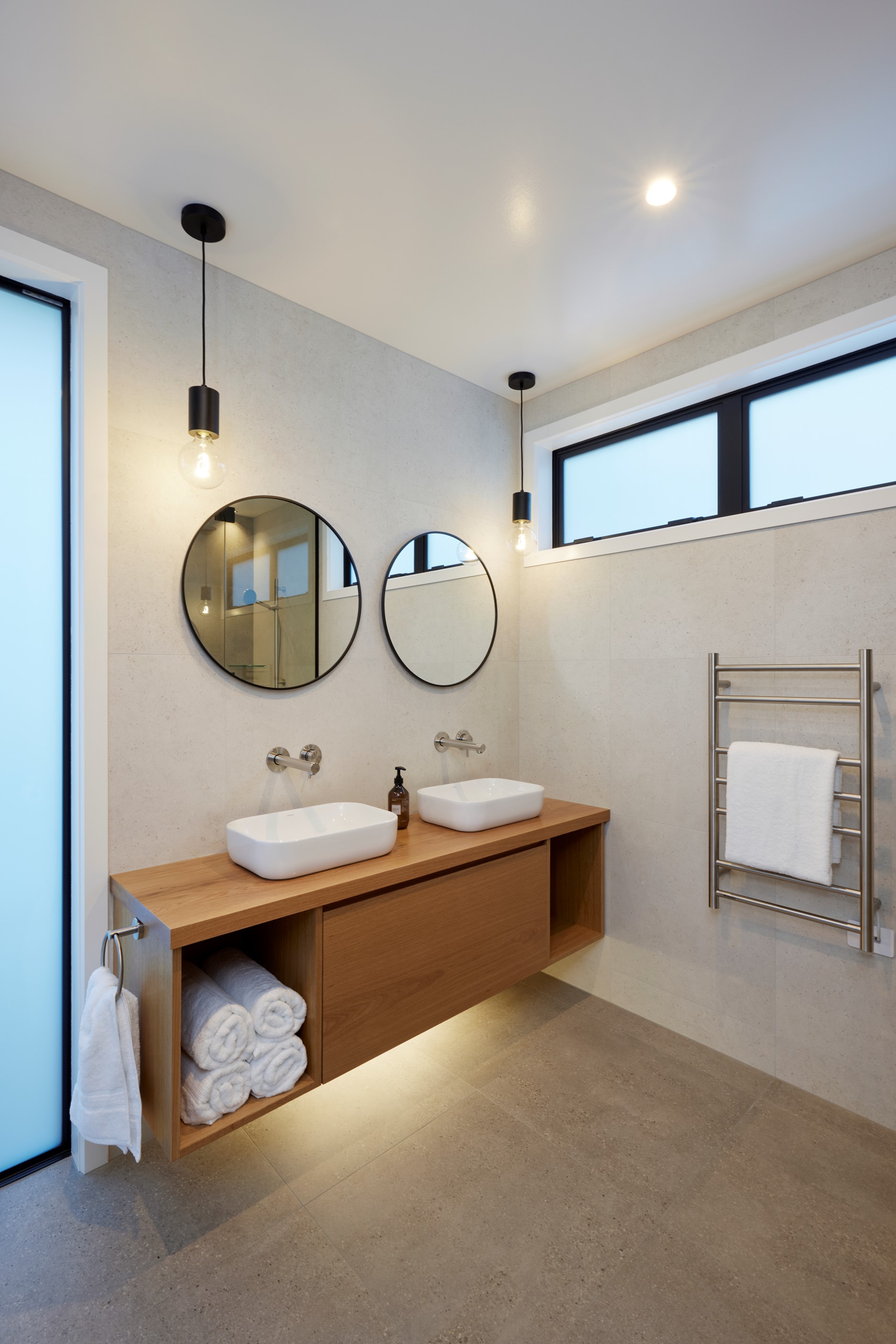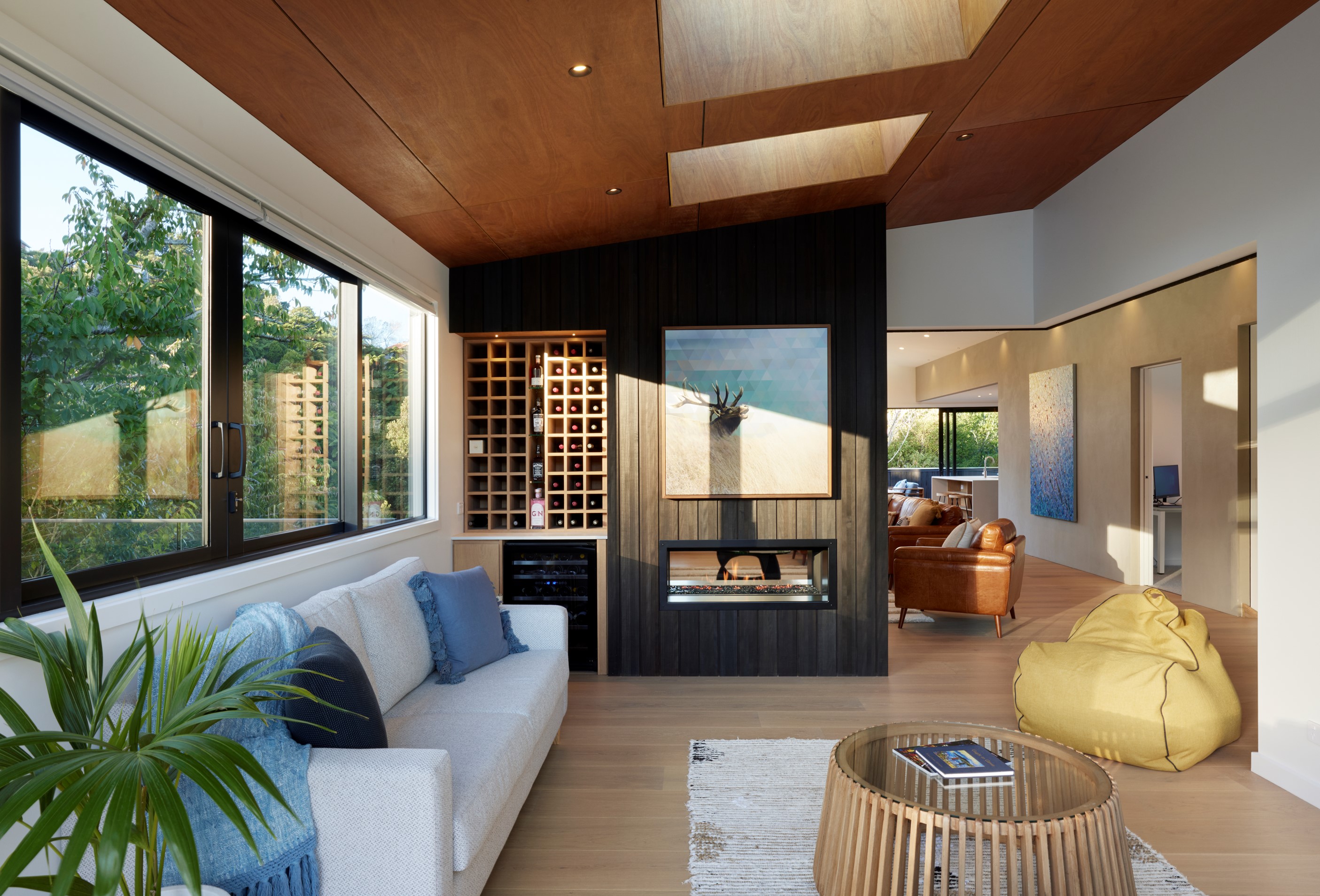 As show homes go, this is a beauty – two-storeys perched on a ridge with three sides connecting with a reserve covered in native bush. Not only an exemplar of good building practice, it also demonstrates what can be achieved on a tricky site and how to beautifully settle a home into a bush-clad section. Built to maximise all-day sun and beautiful surrounds, the four-bedroom, two-bathroom home has spacious living, plenty of glass and outdoor areas that nestle into the environs. Extensive use of dark timber on the outside helps embed the 268sqm house on the site. Inside, the timber decor dovetails with the views. Skylights crafted into timber ceilings funnel light into living spaces and glazed doors open the house to stairs and the lush, green expanses beyond. The elegant kitchen is part and parcel of the open-plan living area and has a walk-in pantry. Although this home, which also has a double garage, laundry, study and powder room, is built over two levels progressing down the site, it has been future-proofed for potential owners. Inside you’ll also find a lift.