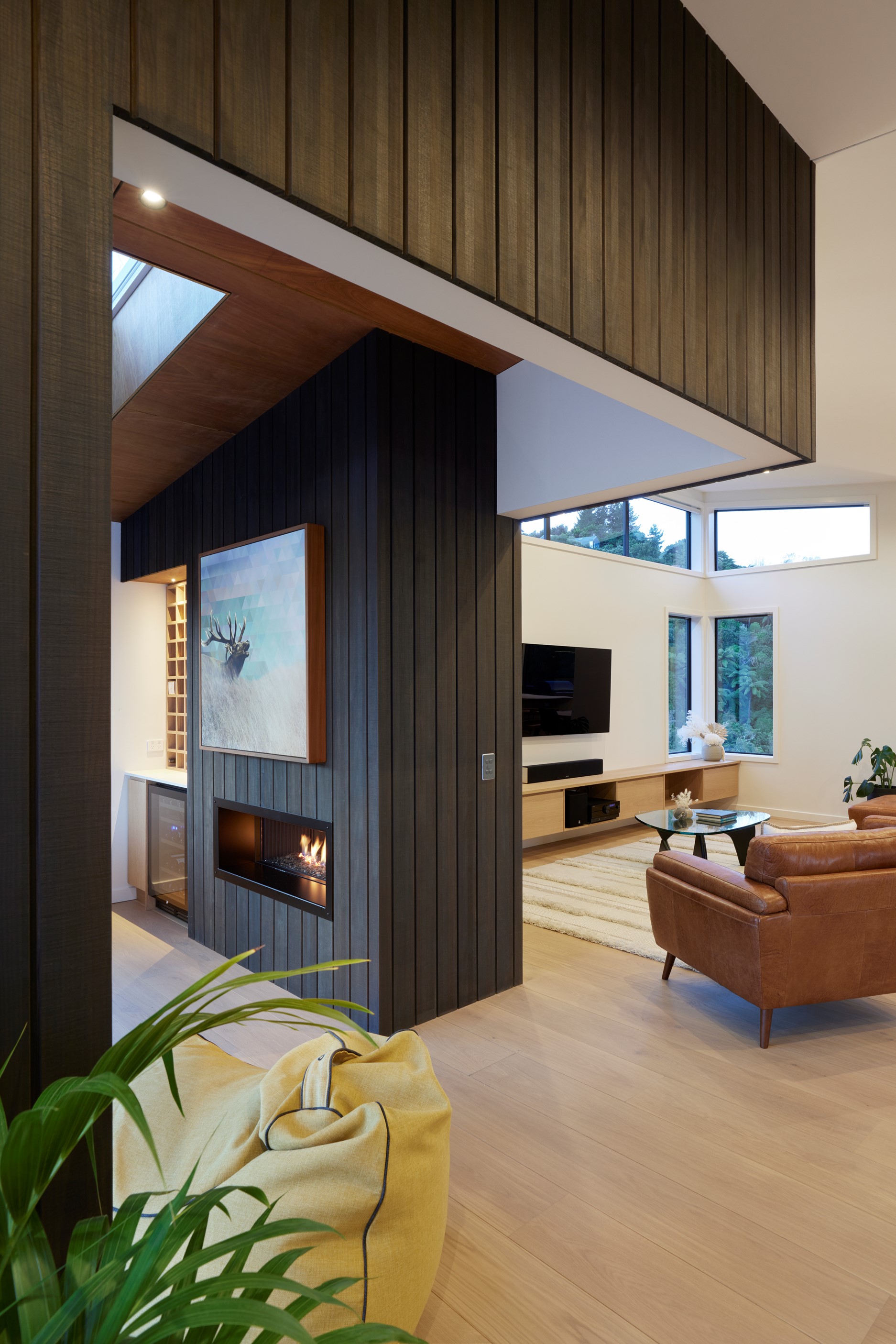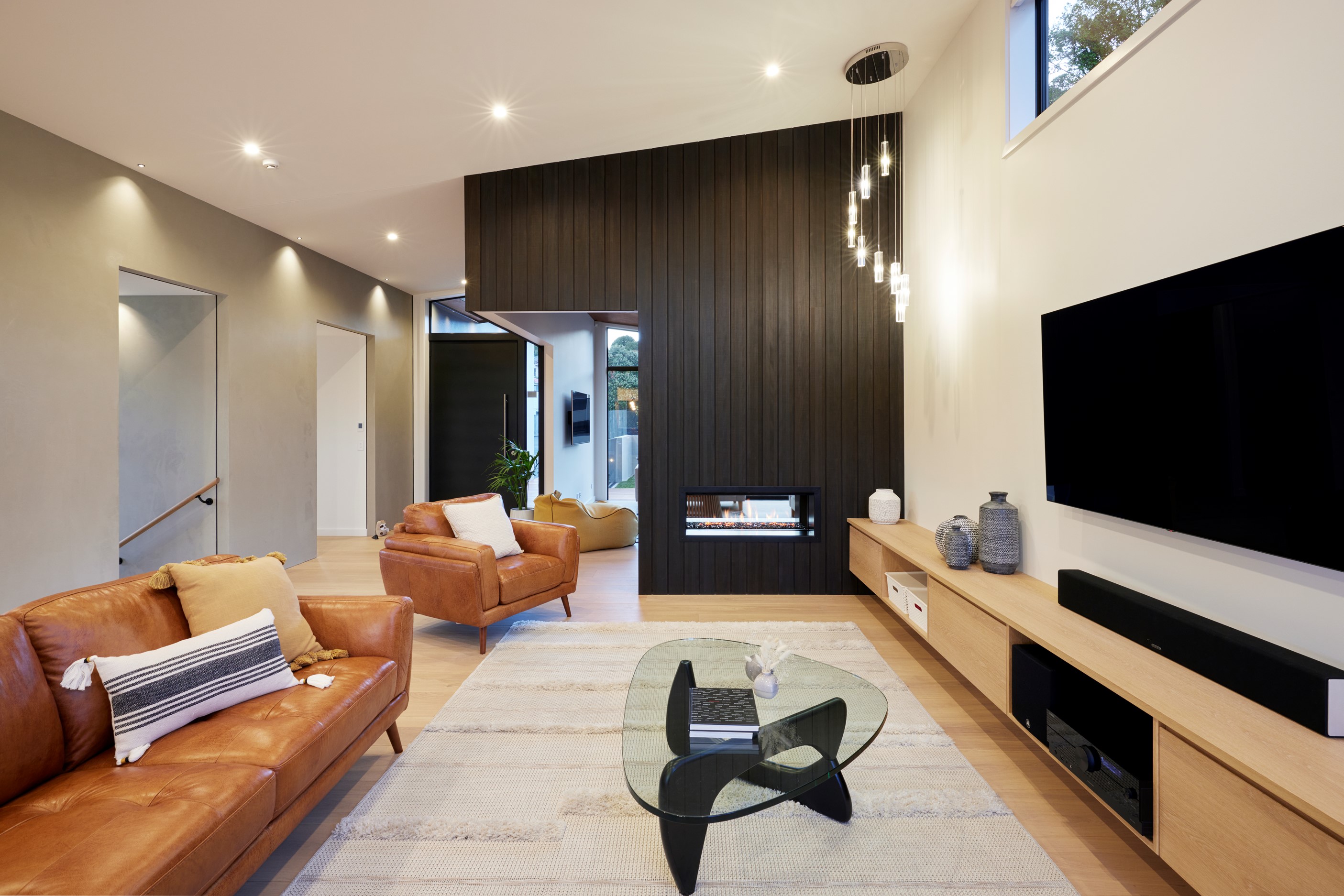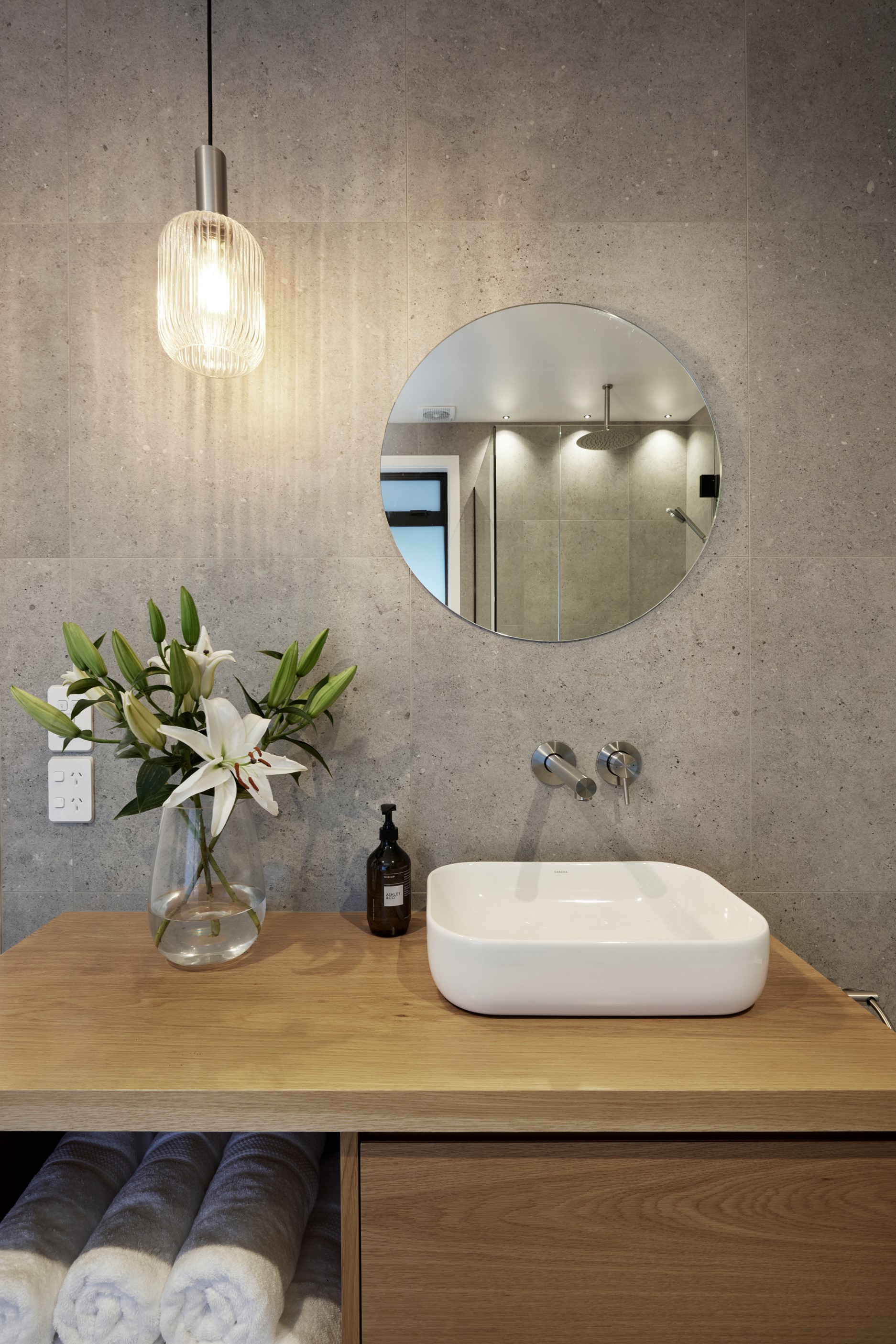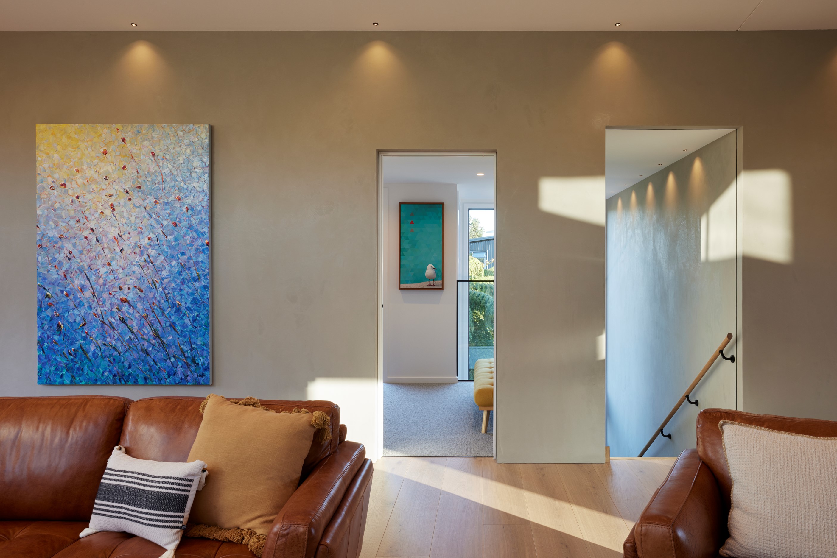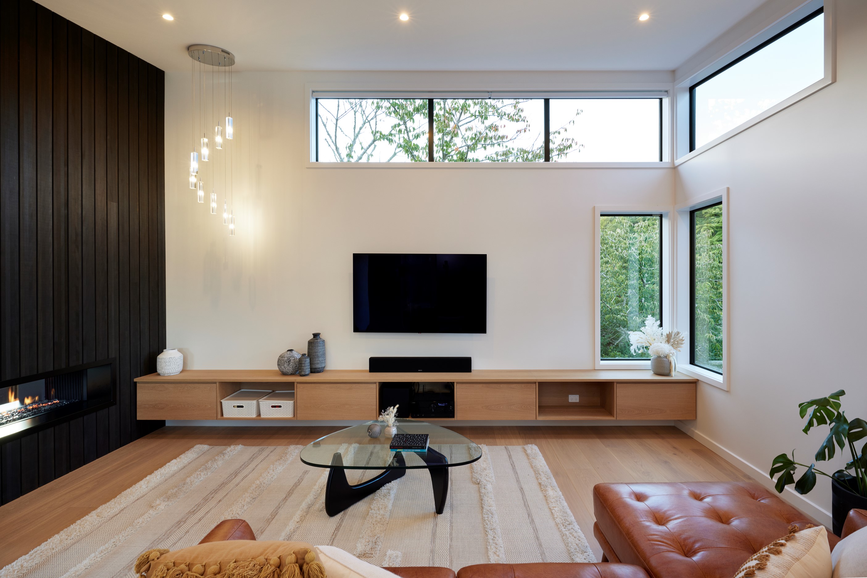 As show homes go, this is a beauty – two-storeys perched on a ridge with three sides connecting with a reserve covered in native bush. Not only an exemplar of good building practice, it also demonstrates what can be achieved on a tricky site and how to beautifully settle a home into a bush-clad section. Built to maximise all-day sun and beautiful surrounds, the four-bedroom, two-bathroom home has spacious living, plenty of glass and outdoor areas that nestle into the environs. Extensive use of dark timber on the outside helps embed the 268sqm house on the site. Inside, the timber decor dovetails with the views. Skylights crafted into timber ceilings funnel light into living spaces and glazed doors open the house to stairs and the lush, green expanses beyond. The elegant kitchen is part and parcel of the open-plan living area and has a walk-in pantry. Although this home, which also has a double garage, laundry, study and powder room, is built over two levels progressing down the site, it has been future-proofed for potential owners. Inside you’ll also find a lift.
