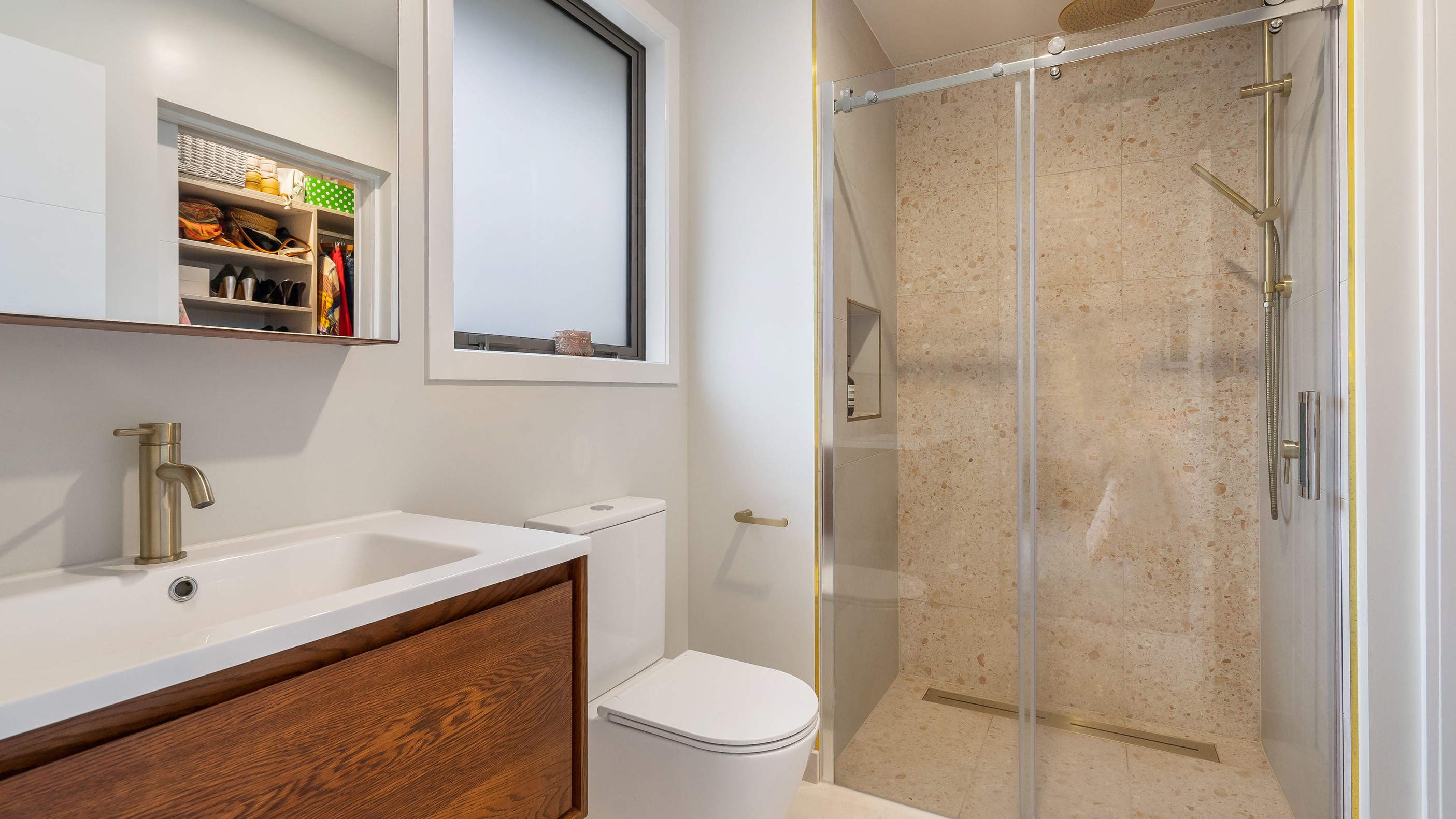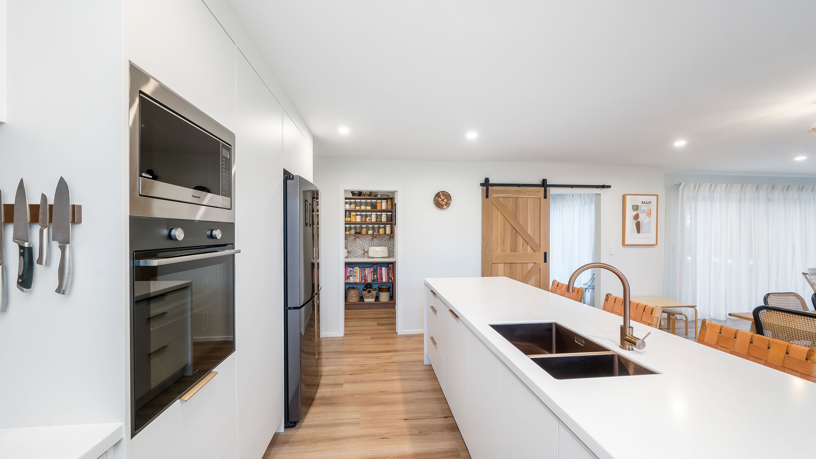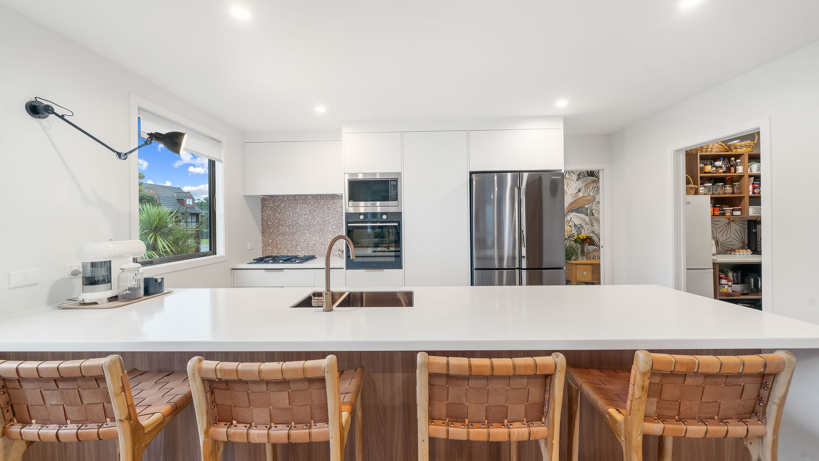 A 70s bach in a beautiful beachside location had seen better days, so the owners decided to have it completely transformed and extended for their growing family. This renovation entailed larger bathrooms, a spacious laundry, separate toilet and two living areas that open to a deck and outdoor living. The project also involved improving energy efficiency, sustainability and, given its coastal position, durability. Aluminium guttering and windows, and a corrugated iron roof do the hard work. And with energy efficiency high on the list, there’s a ducted heat-pump system, double-glazed windows and water-tank collection for the vege garden. The addition of an attractive kitchen and butler’s pantry ensure this family can indulge their passion for garden-to-table dining. Move from the statement entrance into the 167sqm home and you’ll notice a coastal-cool colour scheme, a feature wall and an open-plan living space that spills effortlessly to outdoor decking. Rebuilt with sustainability and future-proofing in mind, the family who lives here will enjoy it for years to come.
