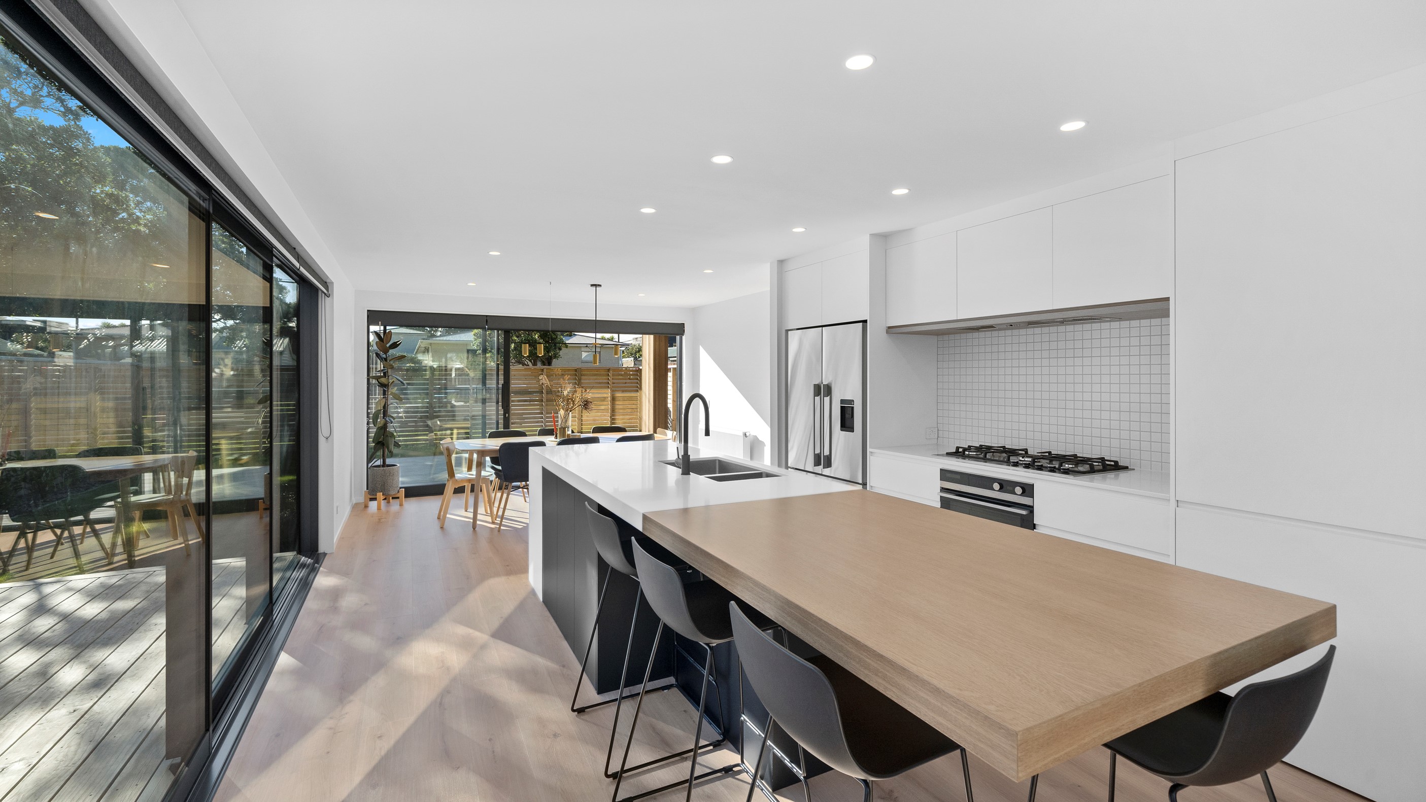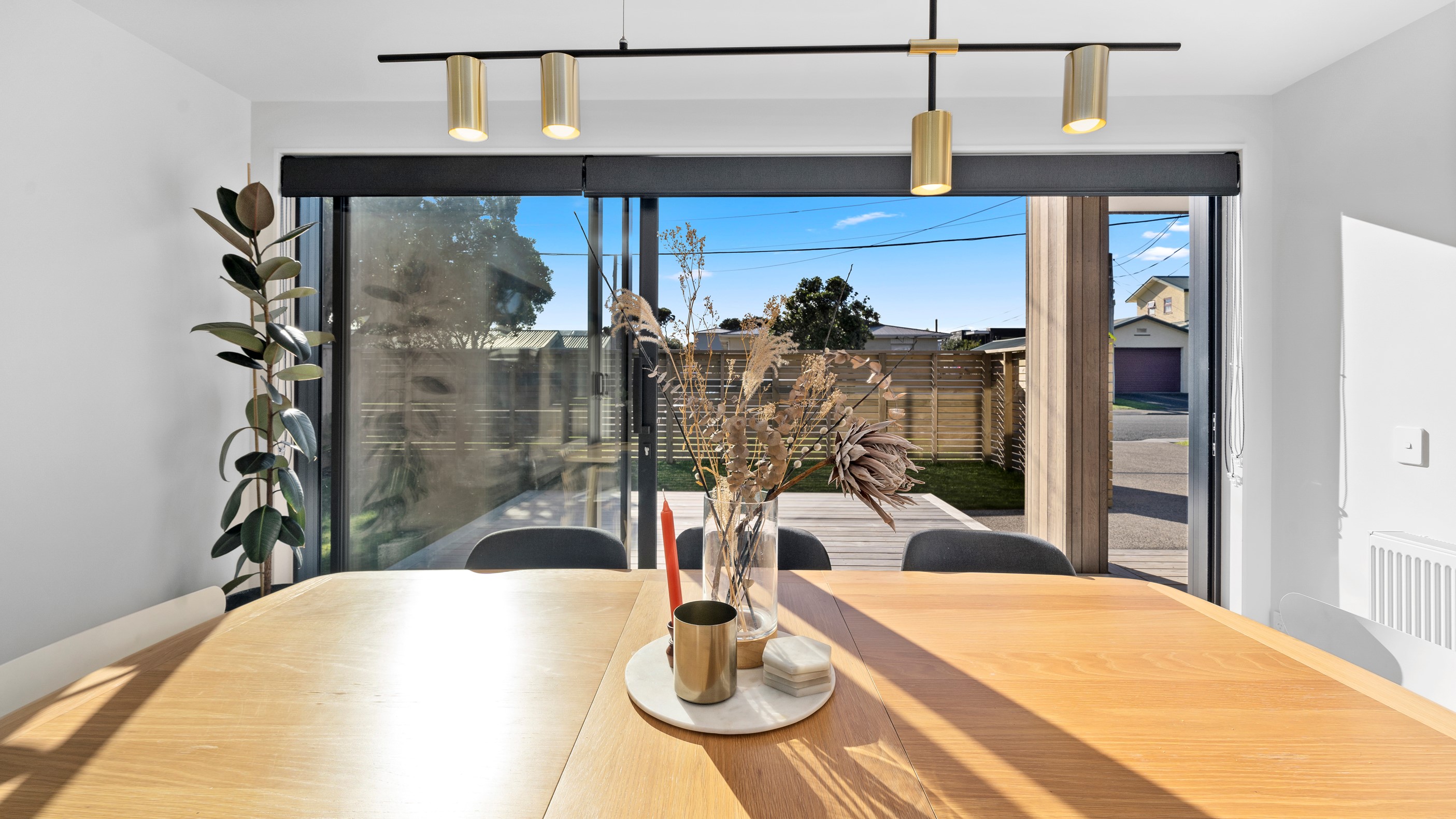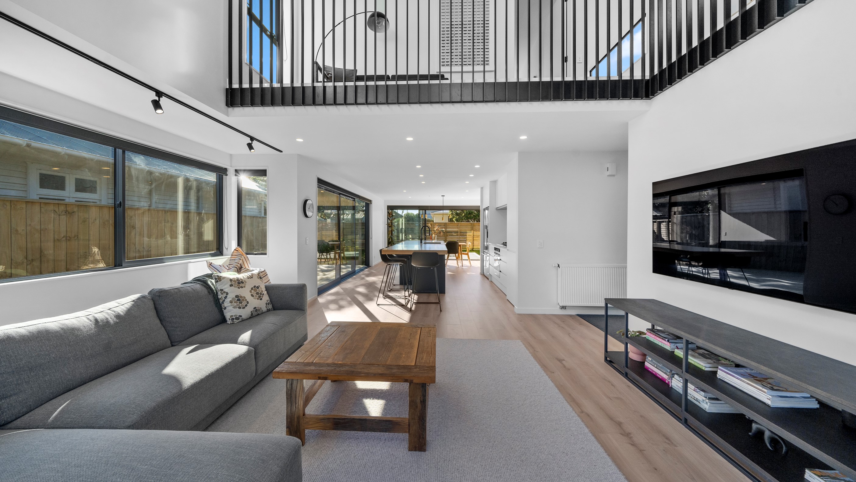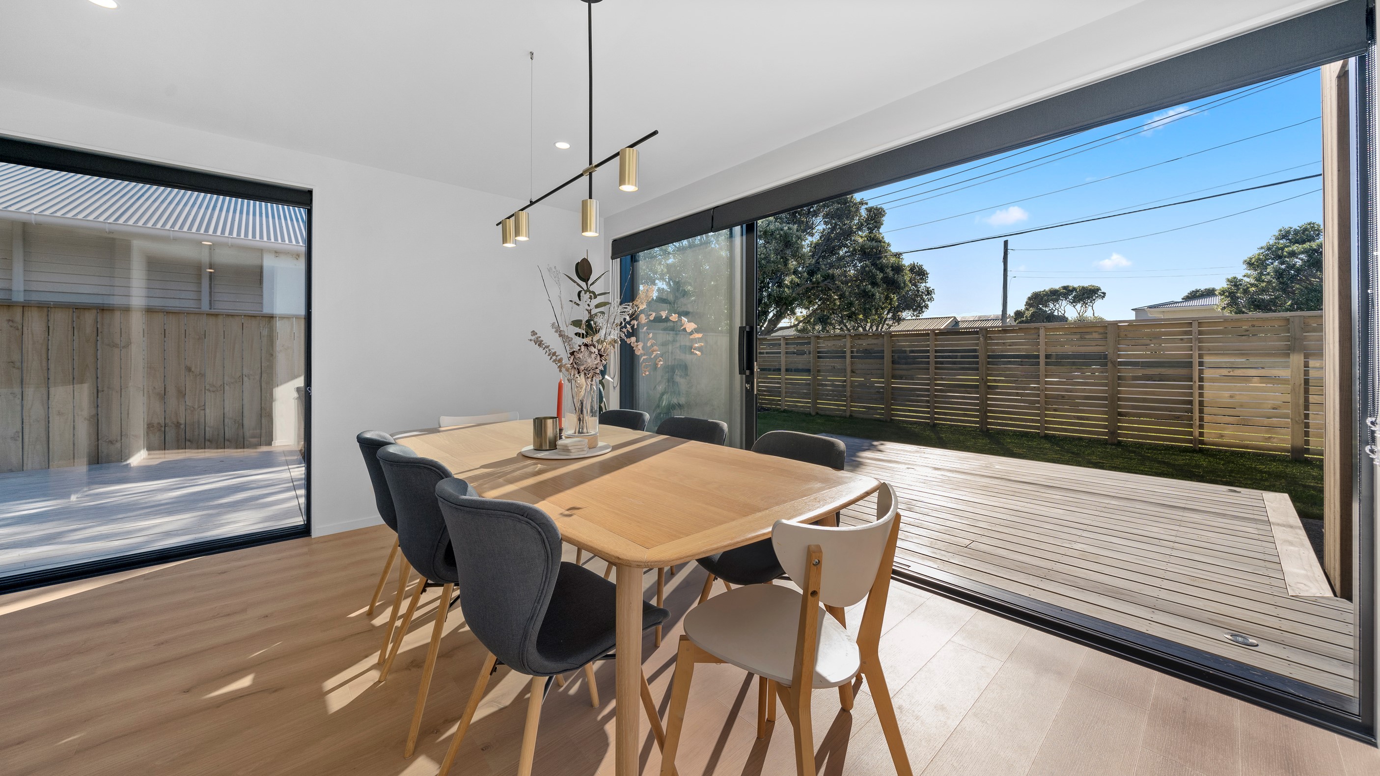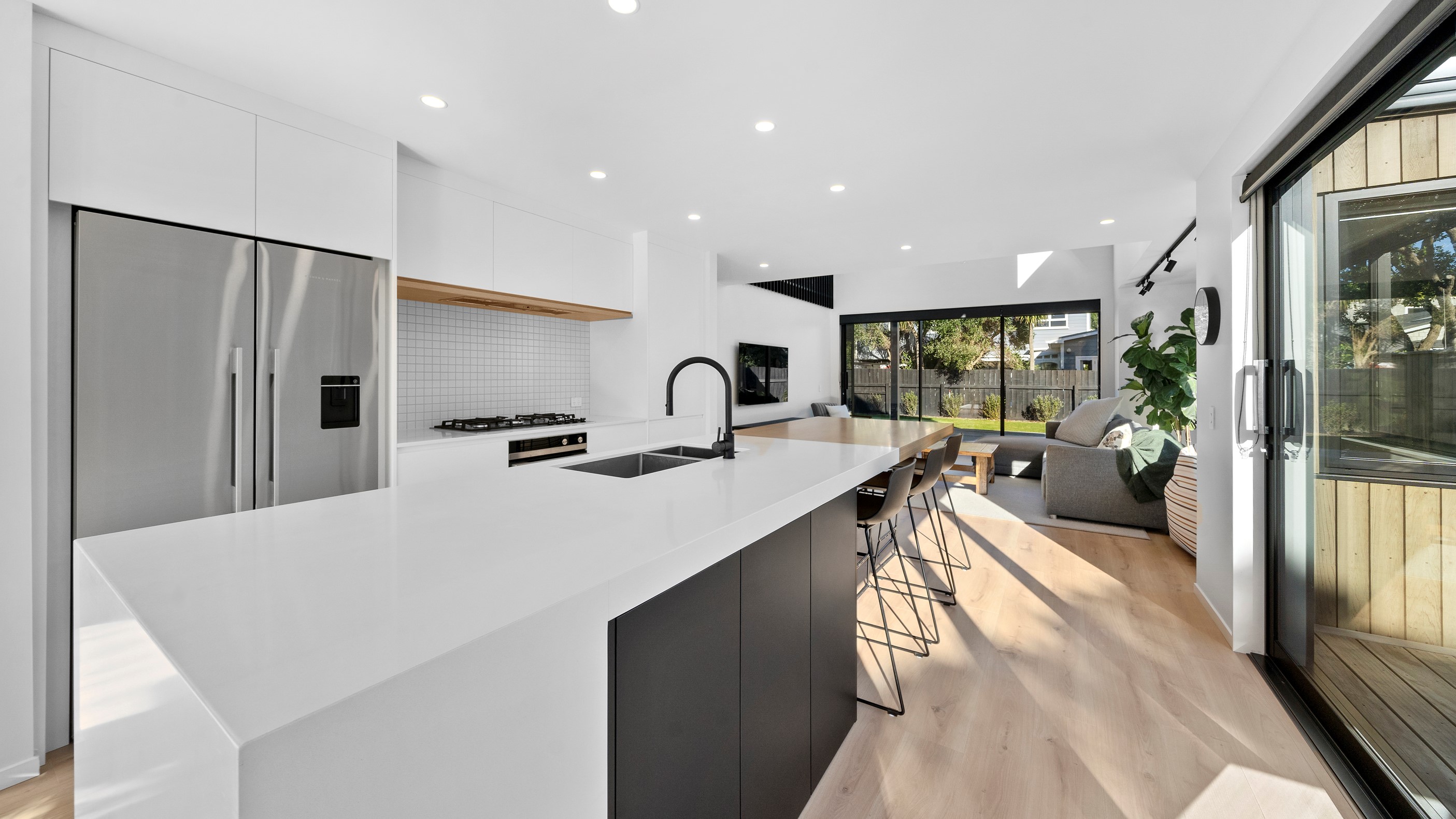 The pavilion form was the inspiration for this three-bedroom family home that delivers the architectural style the clients wanted, plus plenty more. Split over two levels, the 209sqm house has sight lines throughout to create a sense of space, and a double-height living area connects the ground floor with upstairs. It’s a dramatic design move that anchors the rear of the property to its outdoor living spaces. Downstairs, you’ll find the open-plan living, kitchen and dining zone in gleaming white with black accents, such as feature lighting hanging from the lofty ceiling. The kids’ zone is in a separate wing downstairs and also accommodates overnight guests. This area contains a separate laundry and large storage areas tucked behind sliding doors. A striking black balustrade leads you upstairs to the mezzanine where you’ll find a library, study nooks and the main bedroom with walk-in wardrobe and ensuite. This was designed to be a stylish, efficient and warm forever family home that makes the most of its beachside location. It’s fair to say, mission accomplished.
