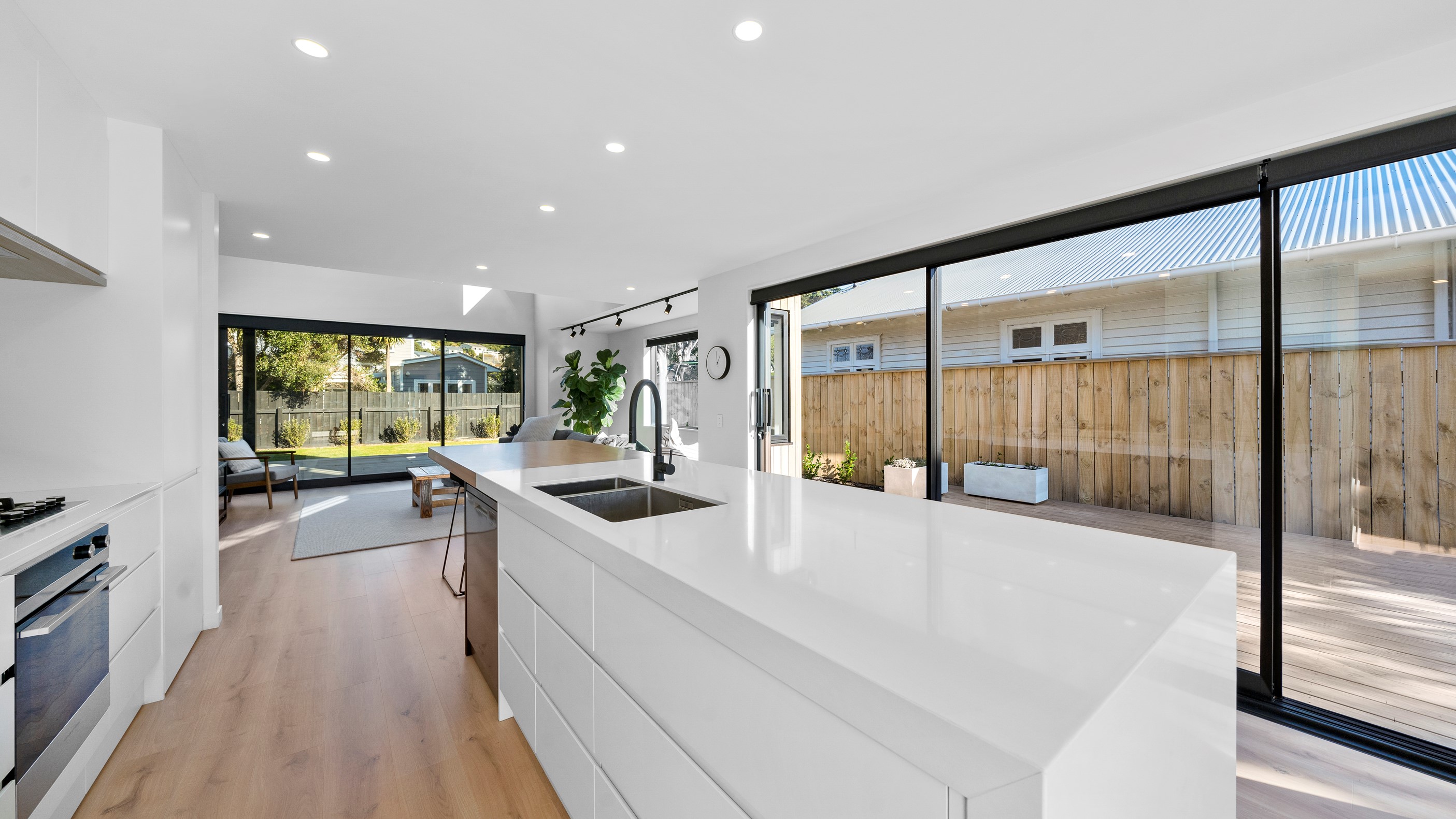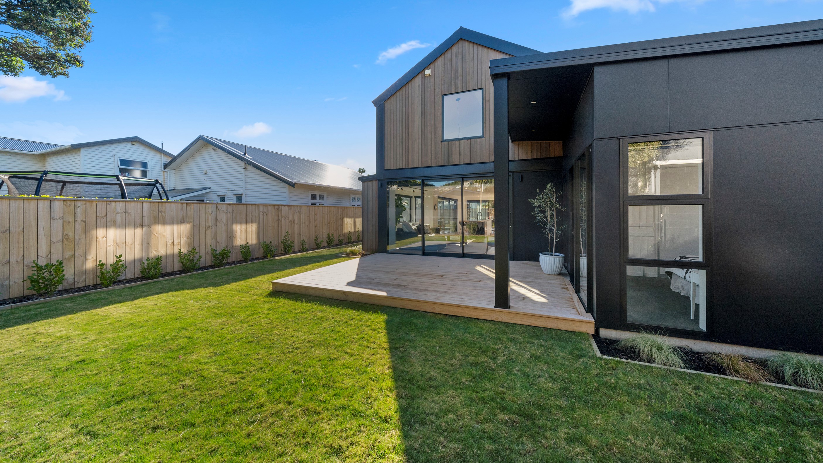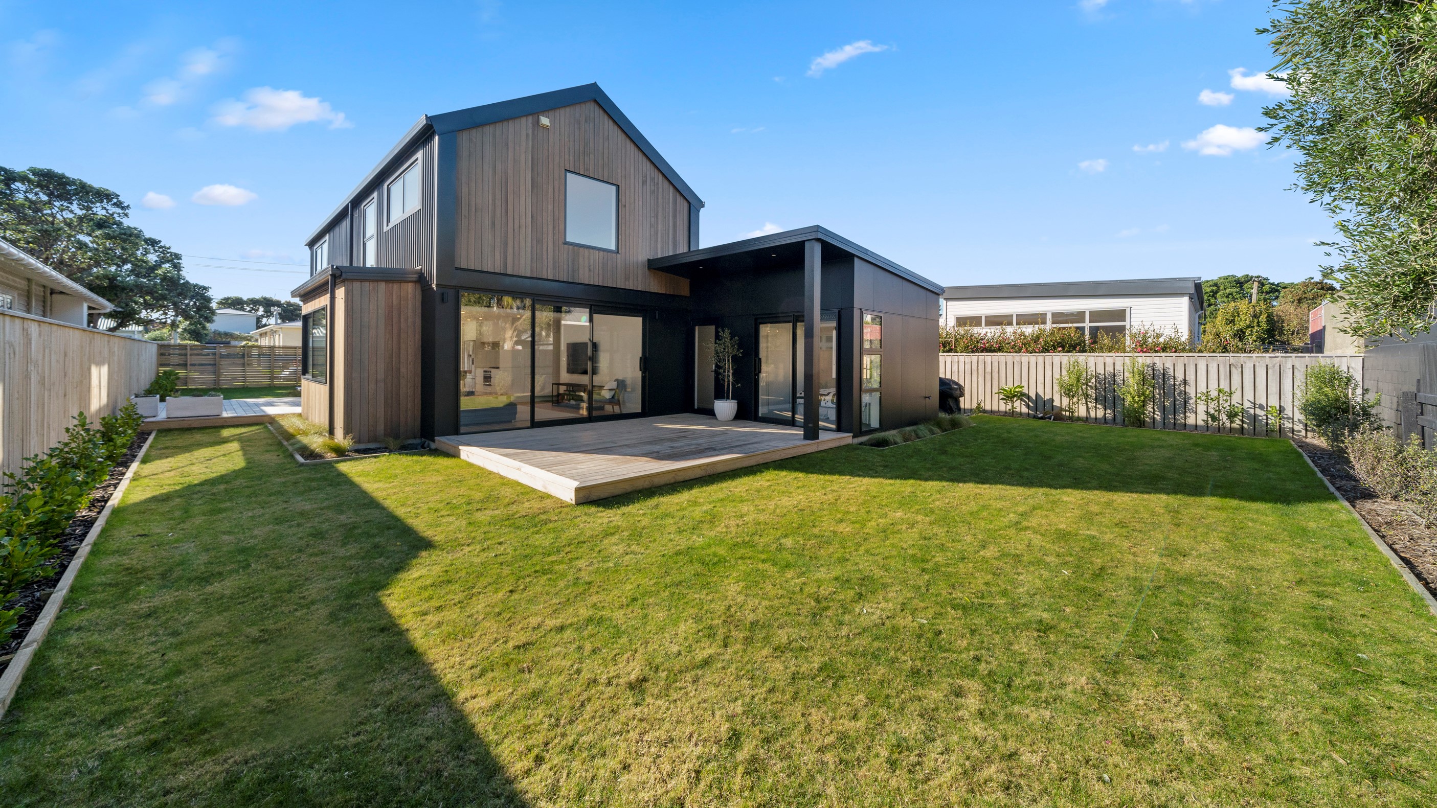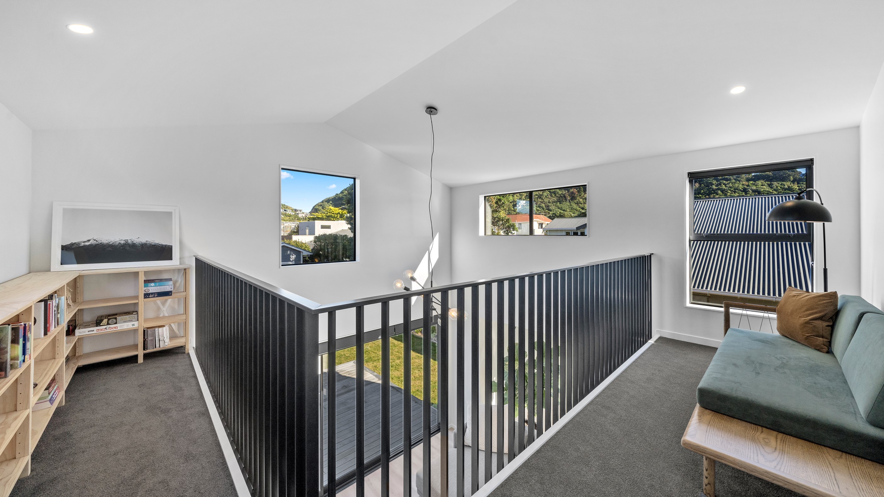 The pavilion form was the inspiration for this three-bedroom family home that delivers the architectural style the clients wanted, plus plenty more. Split over two levels, the 209sqm house has sight lines throughout to create a sense of space, and a double-height living area connects the ground floor with upstairs. It’s a dramatic design move that anchors the rear of the property to its outdoor living spaces. Downstairs, you’ll find the open-plan living, kitchen and dining zone in gleaming white with black accents, such as feature lighting hanging from the lofty ceiling. The kids’ zone is in a separate wing downstairs and also accommodates overnight guests. This area contains a separate laundry and large storage areas tucked behind sliding doors. A striking black balustrade leads you upstairs to the mezzanine where you’ll find a library, study nooks and the main bedroom with walk-in wardrobe and ensuite. This was designed to be a stylish, efficient and warm forever family home that makes the most of its beachside location. It’s fair to say, mission accomplished.