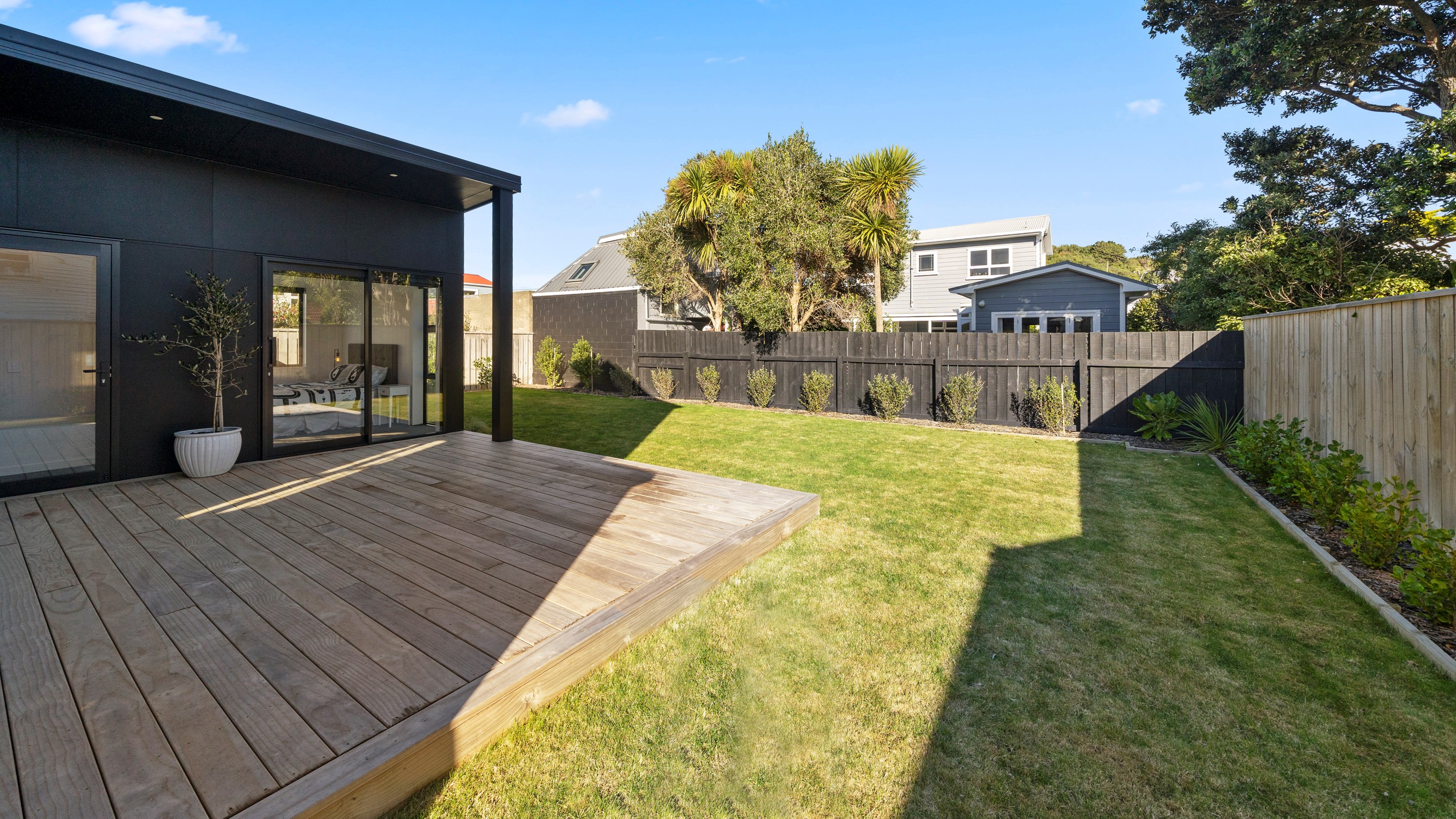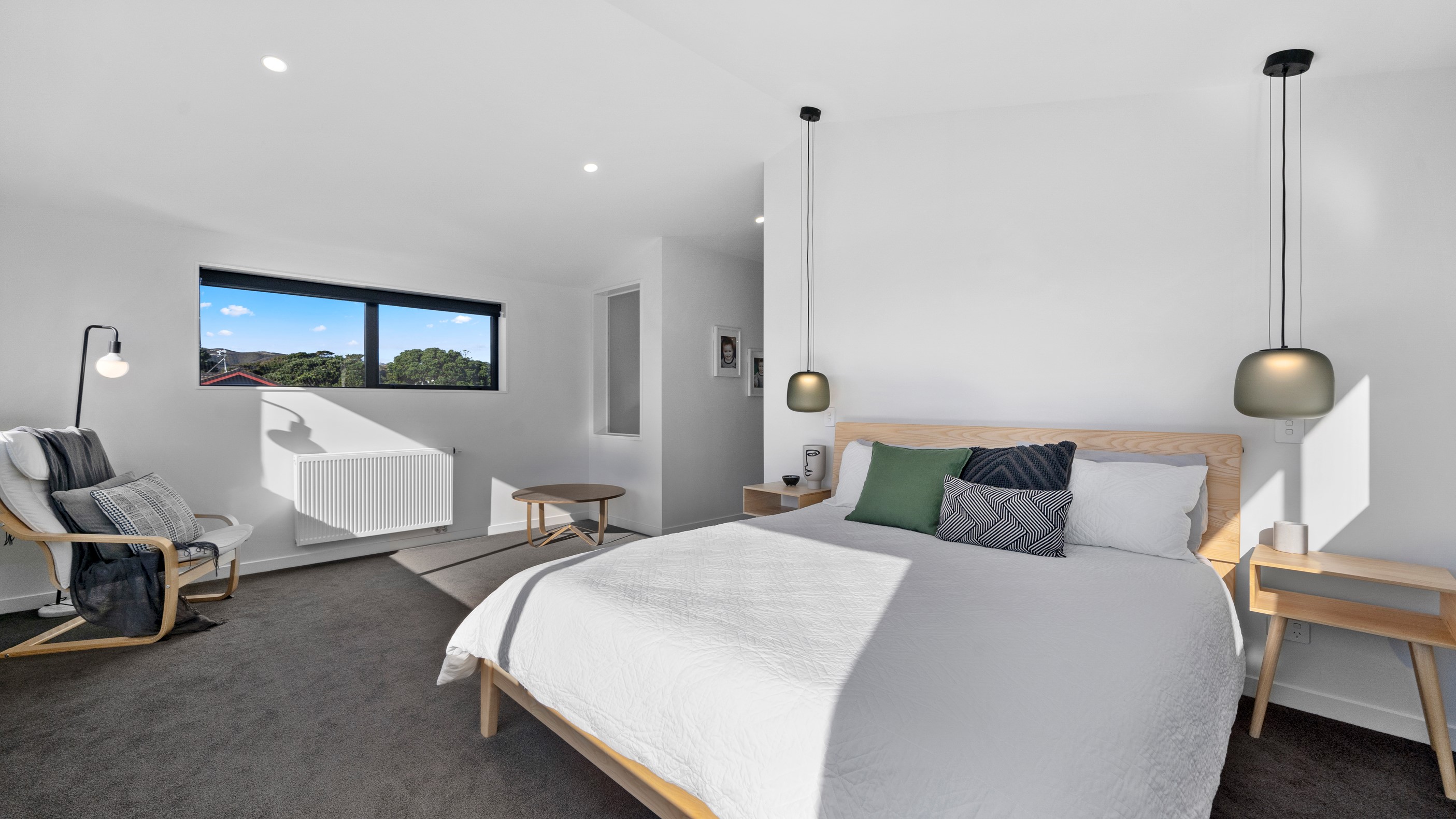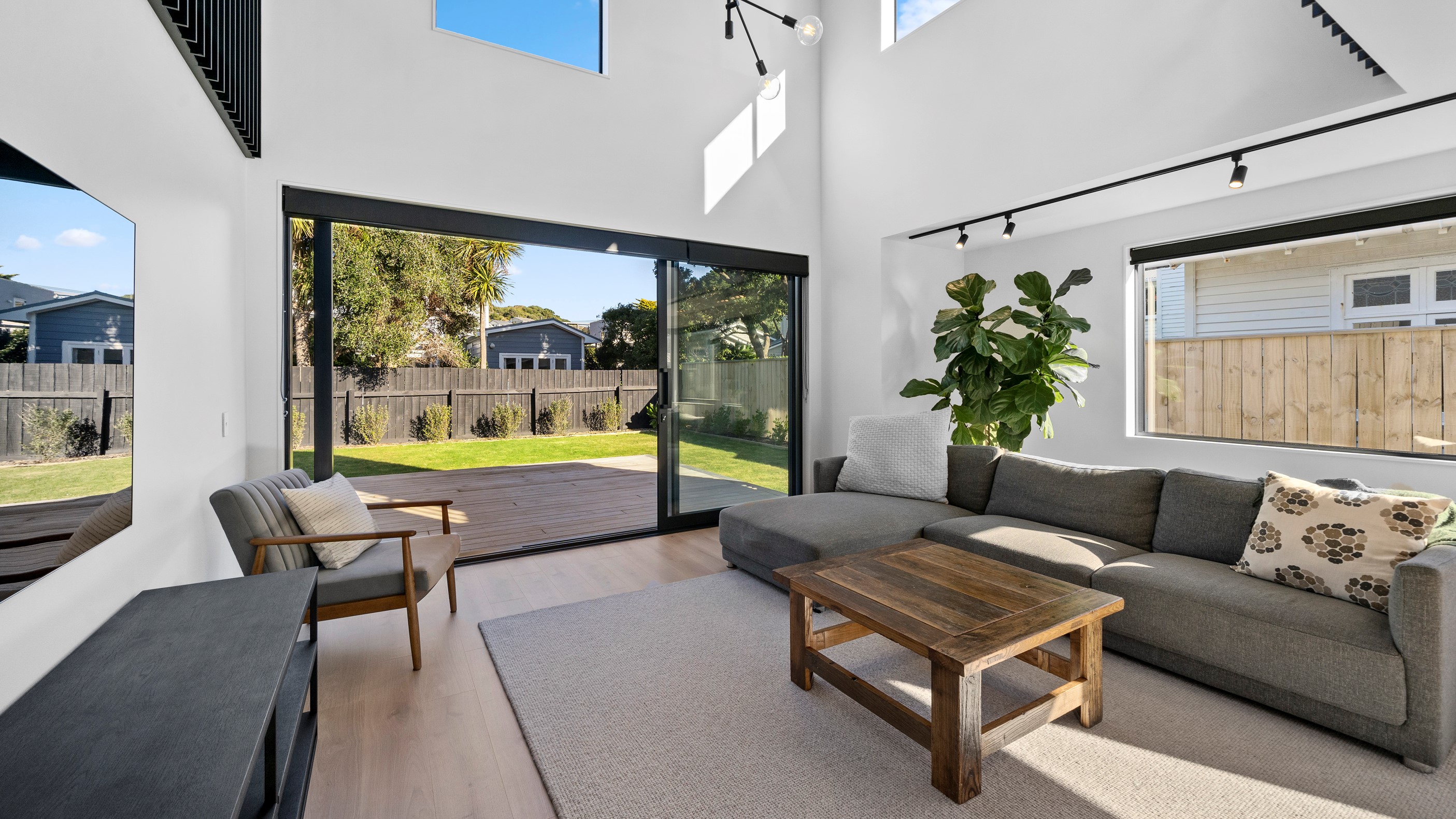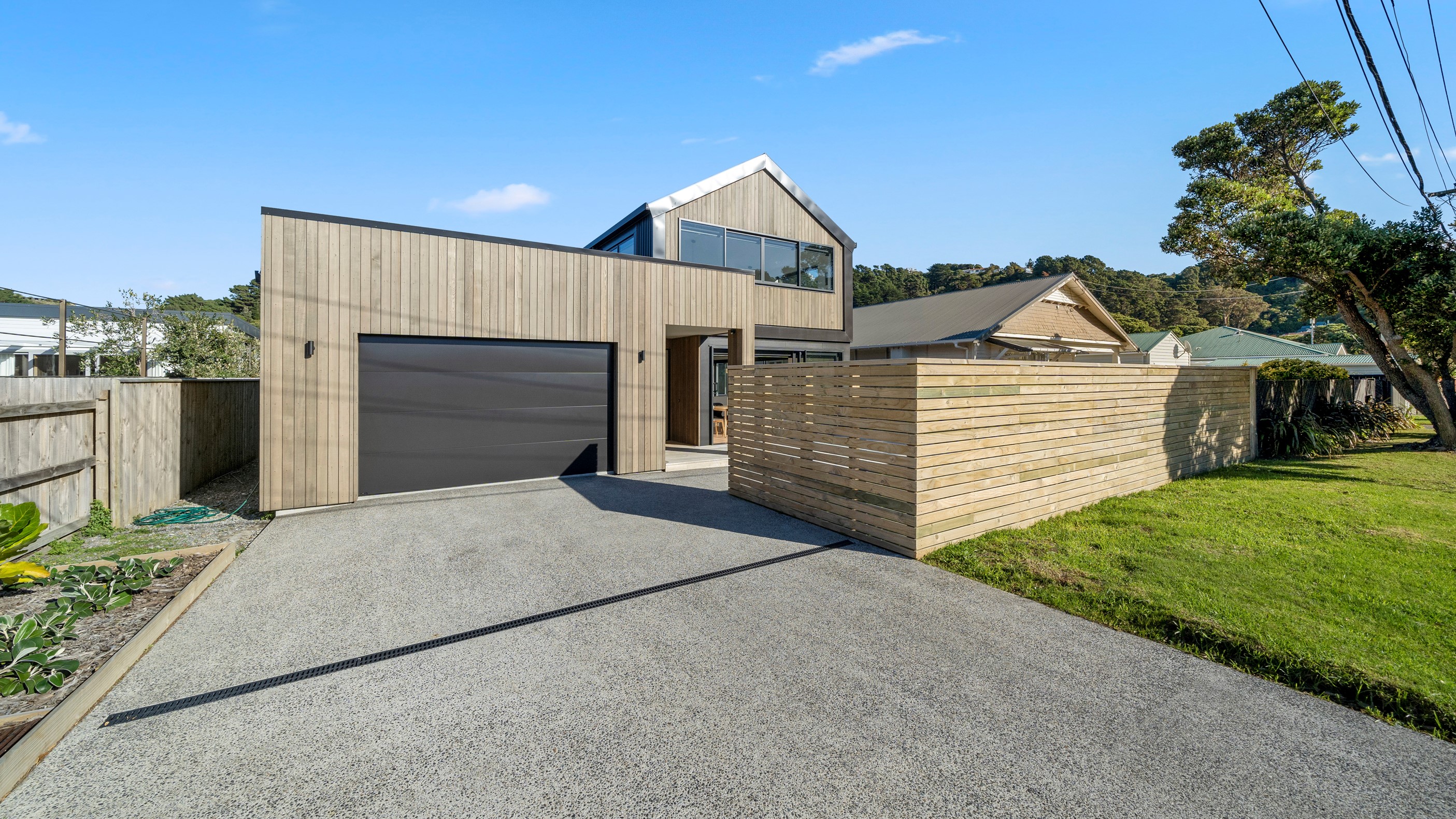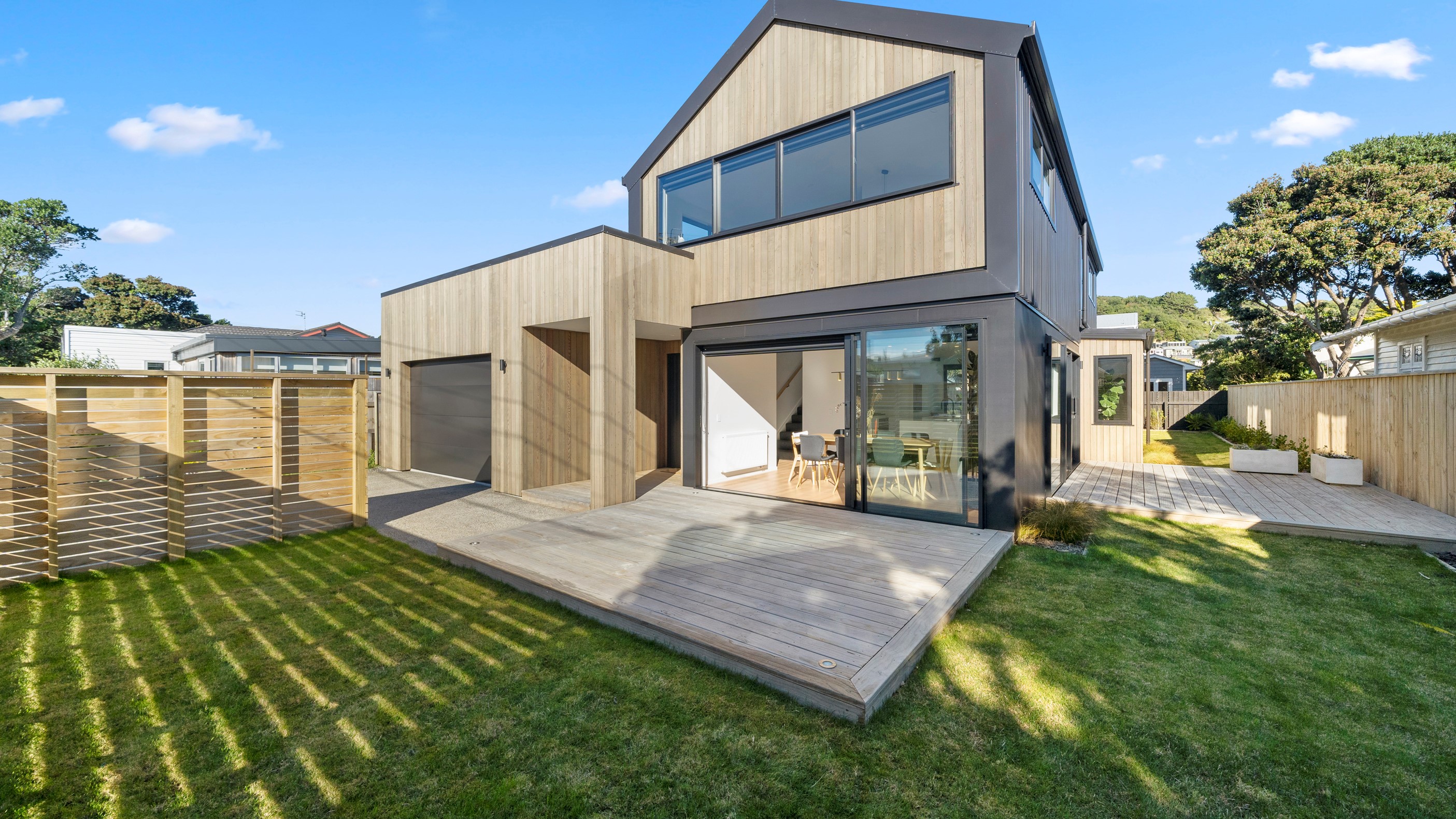 The pavilion form was the inspiration for this three-bedroom family home that delivers the architectural style the clients wanted, plus plenty more. Split over two levels, the 209sqm house has sight lines throughout to create a sense of space, and a double-height living area connects the ground floor with upstairs. It’s a dramatic design move that anchors the rear of the property to its outdoor living spaces. Downstairs, you’ll find the open-plan living, kitchen and dining zone in gleaming white with black accents, such as feature lighting hanging from the lofty ceiling. The kids’ zone is in a separate wing downstairs and also accommodates overnight guests. This area contains a separate laundry and large storage areas tucked behind sliding doors. A striking black balustrade leads you upstairs to the mezzanine where you’ll find a library, study nooks and the main bedroom with walk-in wardrobe and ensuite. This was designed to be a stylish, efficient and warm forever family home that makes the most of its beachside location. It’s fair to say, mission accomplished.