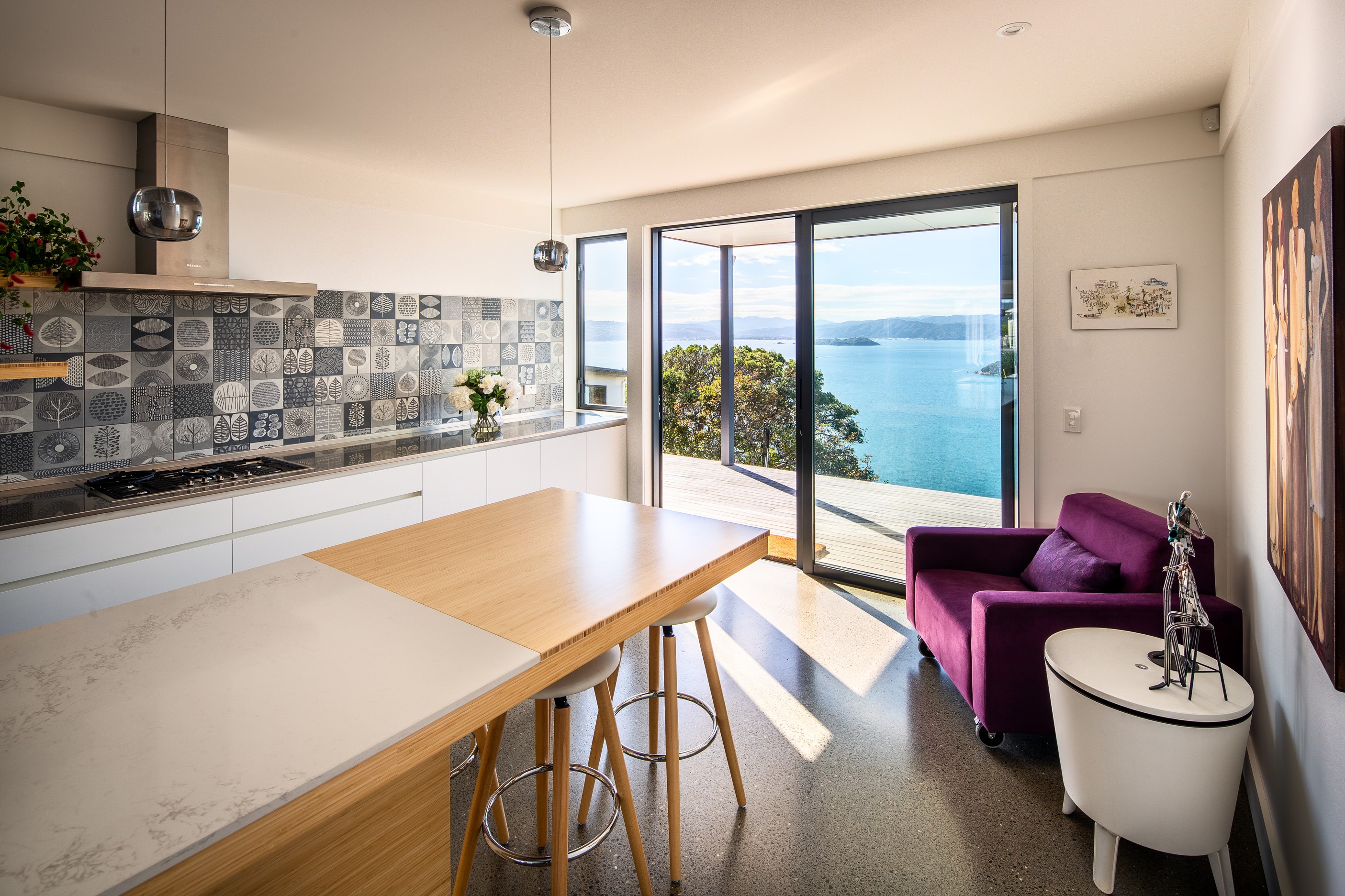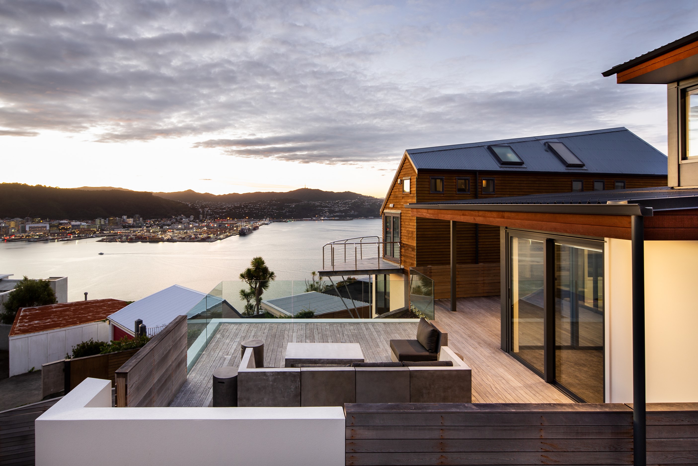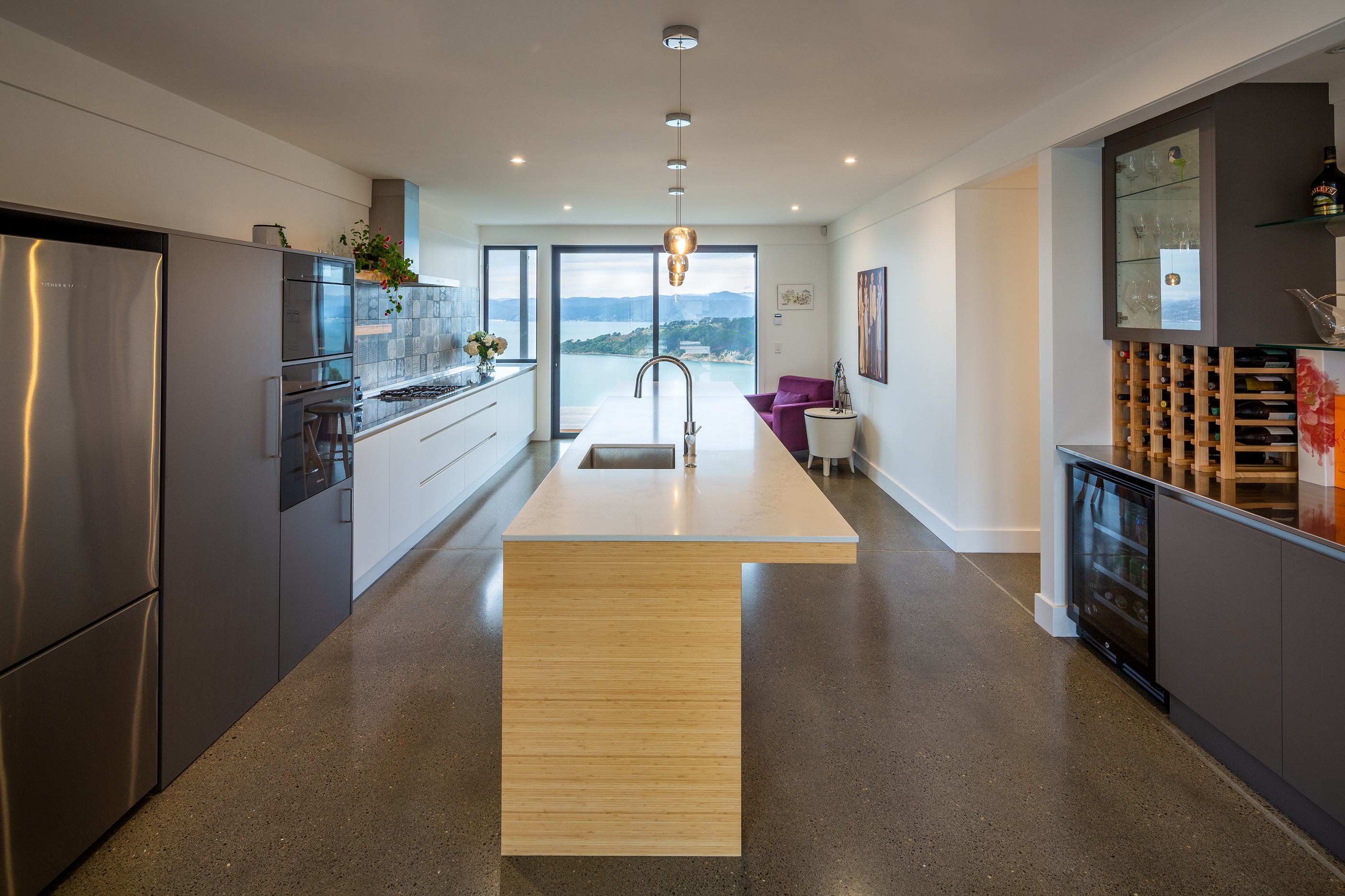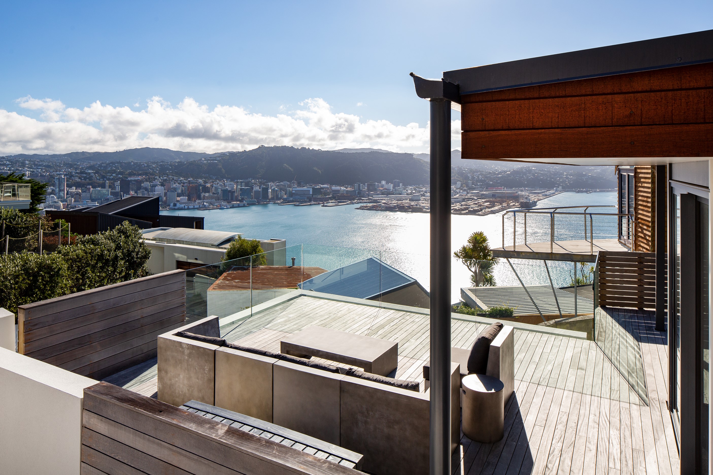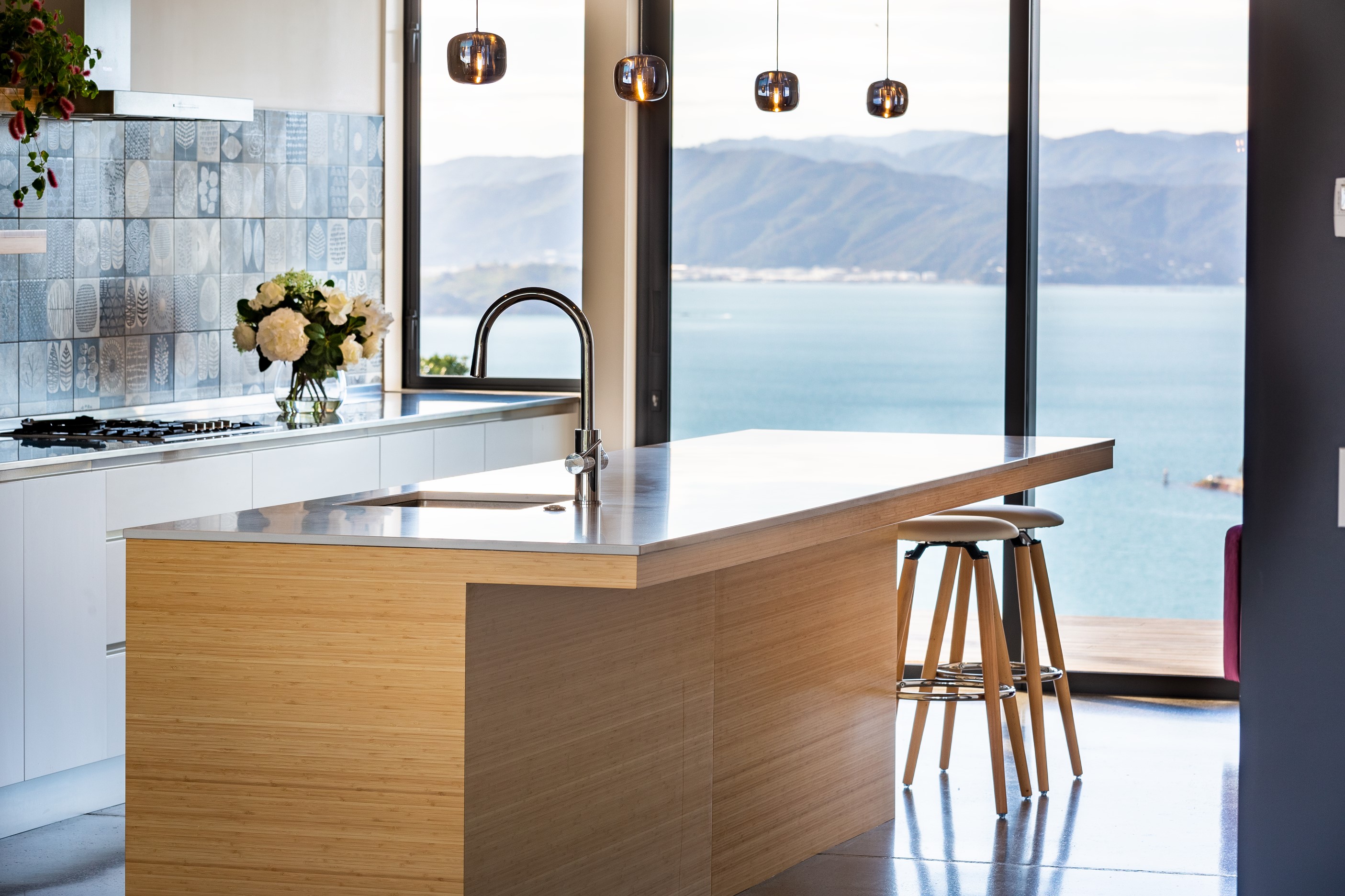 A blue-chip location called for a special home and the builders stepped up to the mark. Replacing an old house, this jewel at the top of the hill basks in all-day sun and takes in sweeping panoramas of Wellington, the harbour and nearby mountain ranges. All rooms have views, but the vista from the luxury of the main-bedroom ensuite is second to none. The lounge opens to a large west-facing deck. Deck is an understatement for what has been achieved here. It’s no simple extension to the 192sqm house – it is truly an engineering feat, given it sits atop a double garage that has been excavated into the hillside. An open-plan kitchen, living and dining area means everyone can enjoy the space and grandstand position. The views are pretty good inside too. Bamboo details are used for the kitchen shelves and vertical-slat balustrade. This house may be exposed on its perch, but it’s seriously warm. Underfloor heating; double-glazed, thermally broken windows; and passive heat from the sun and a concrete slab make it light and cosy. It’s a win-win for the owners – dramatic scenery and a warm home.