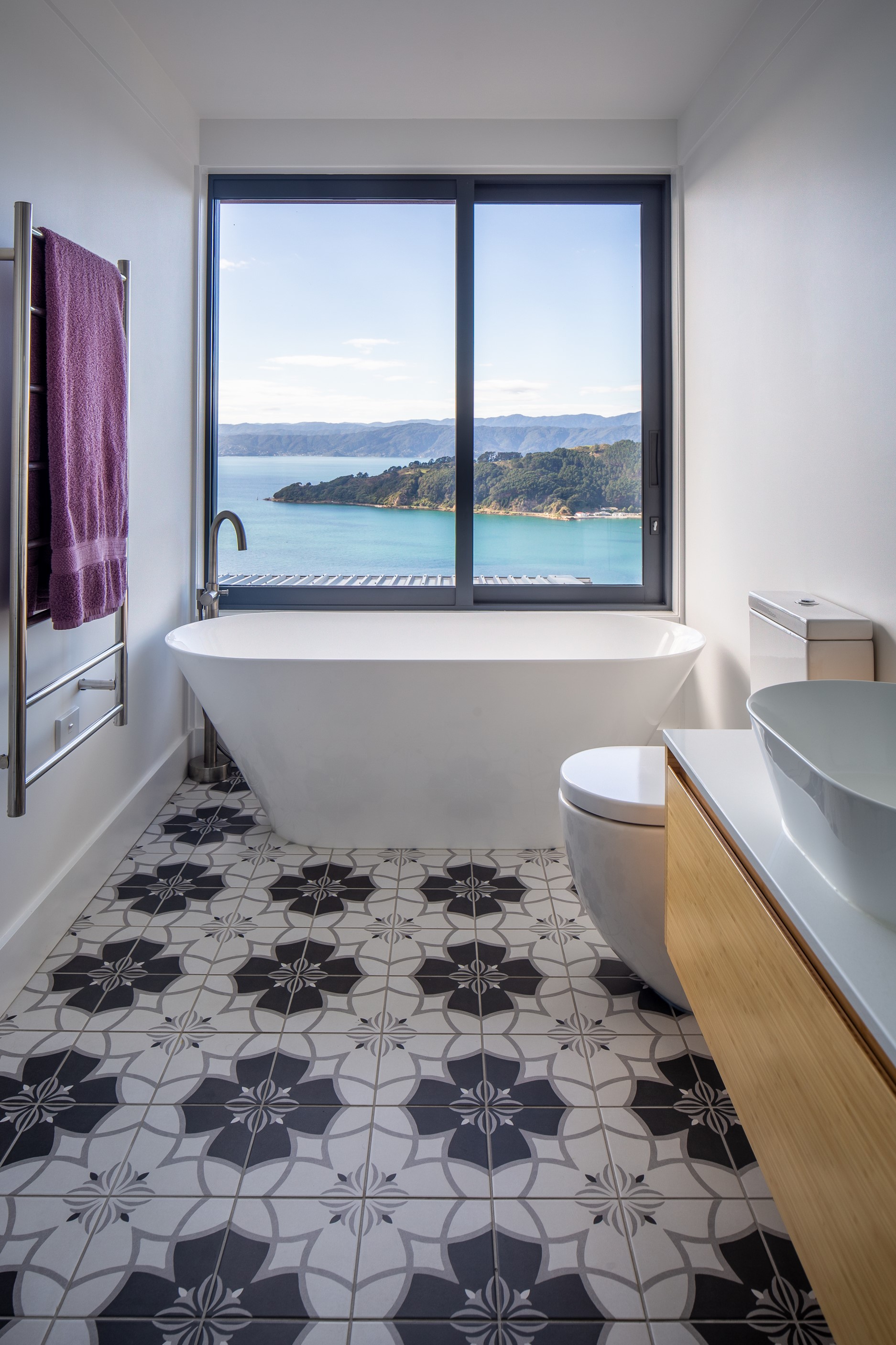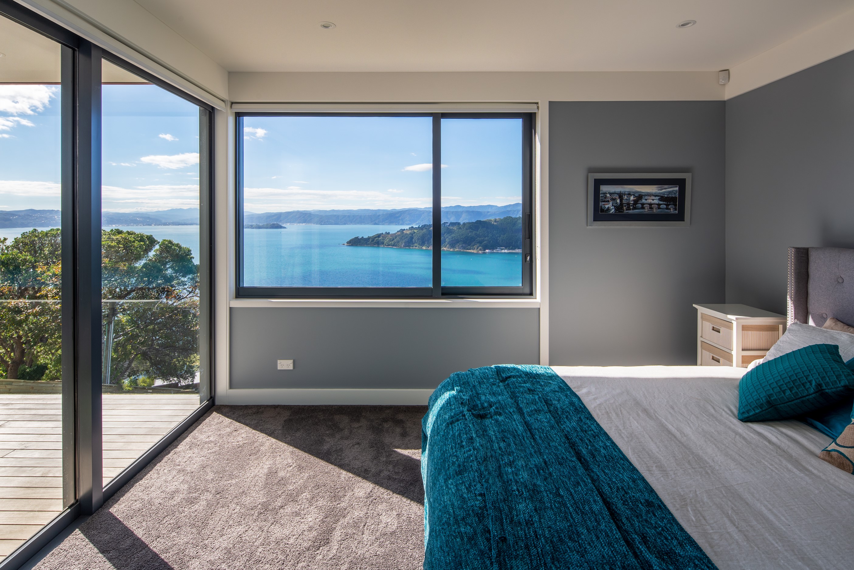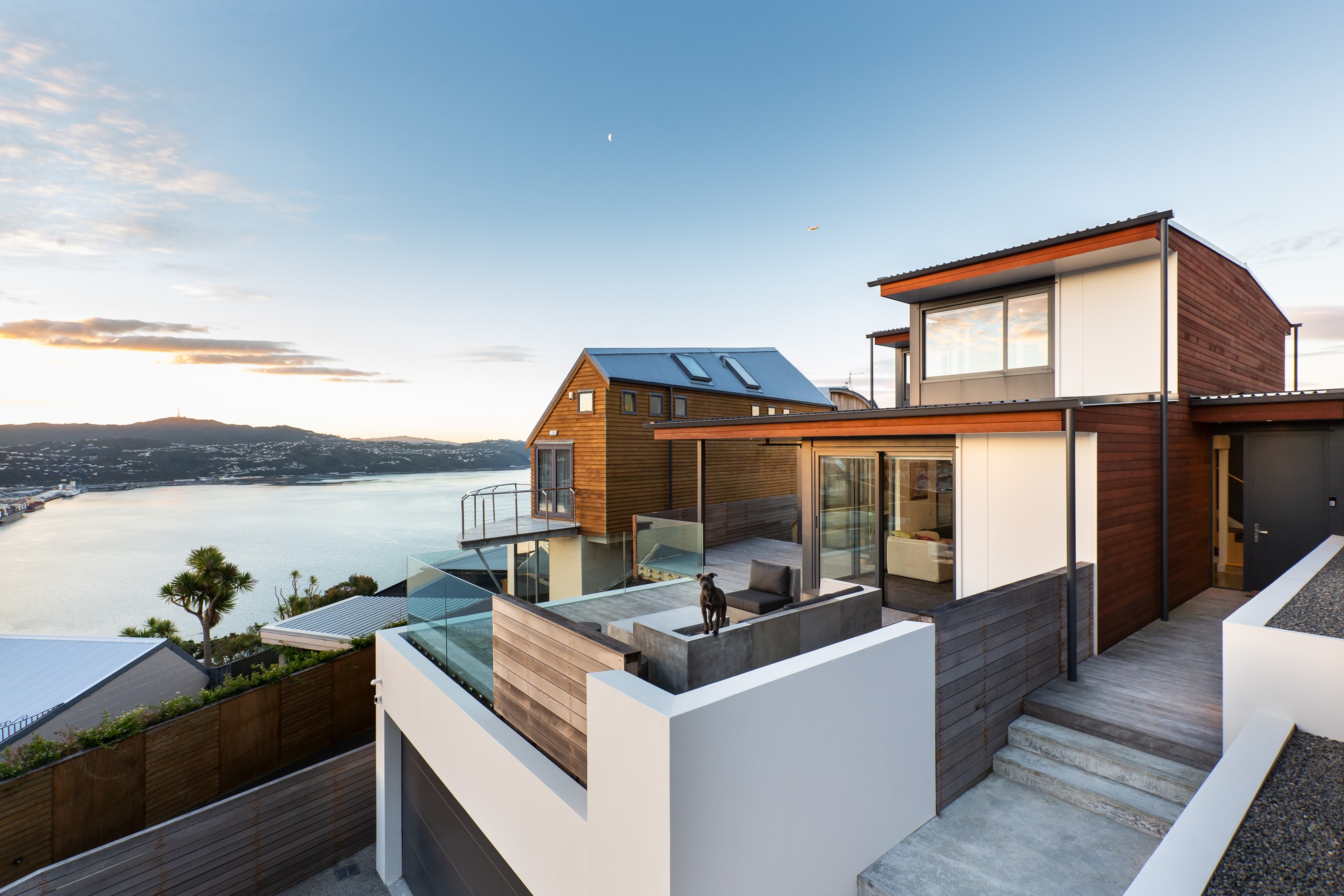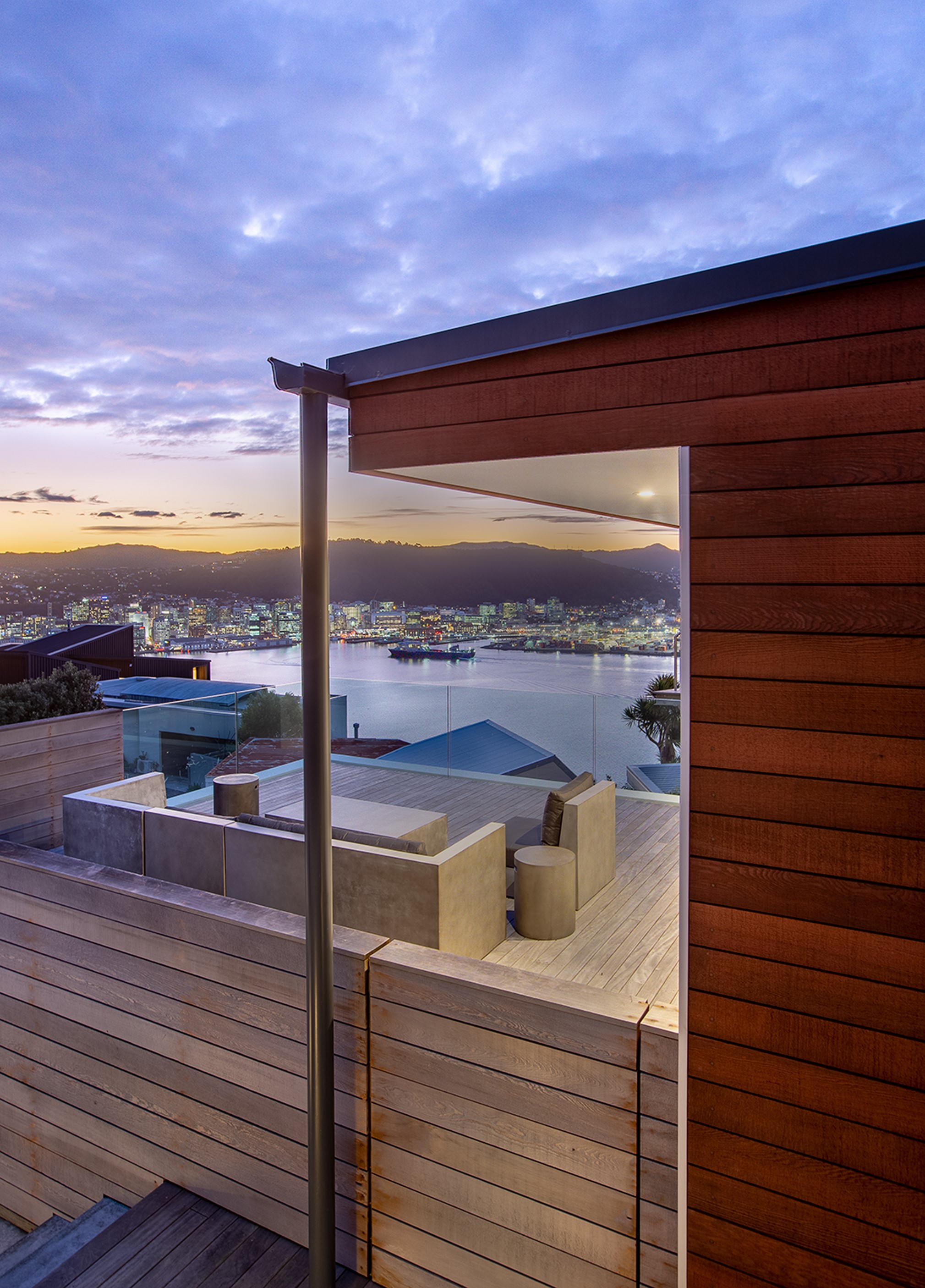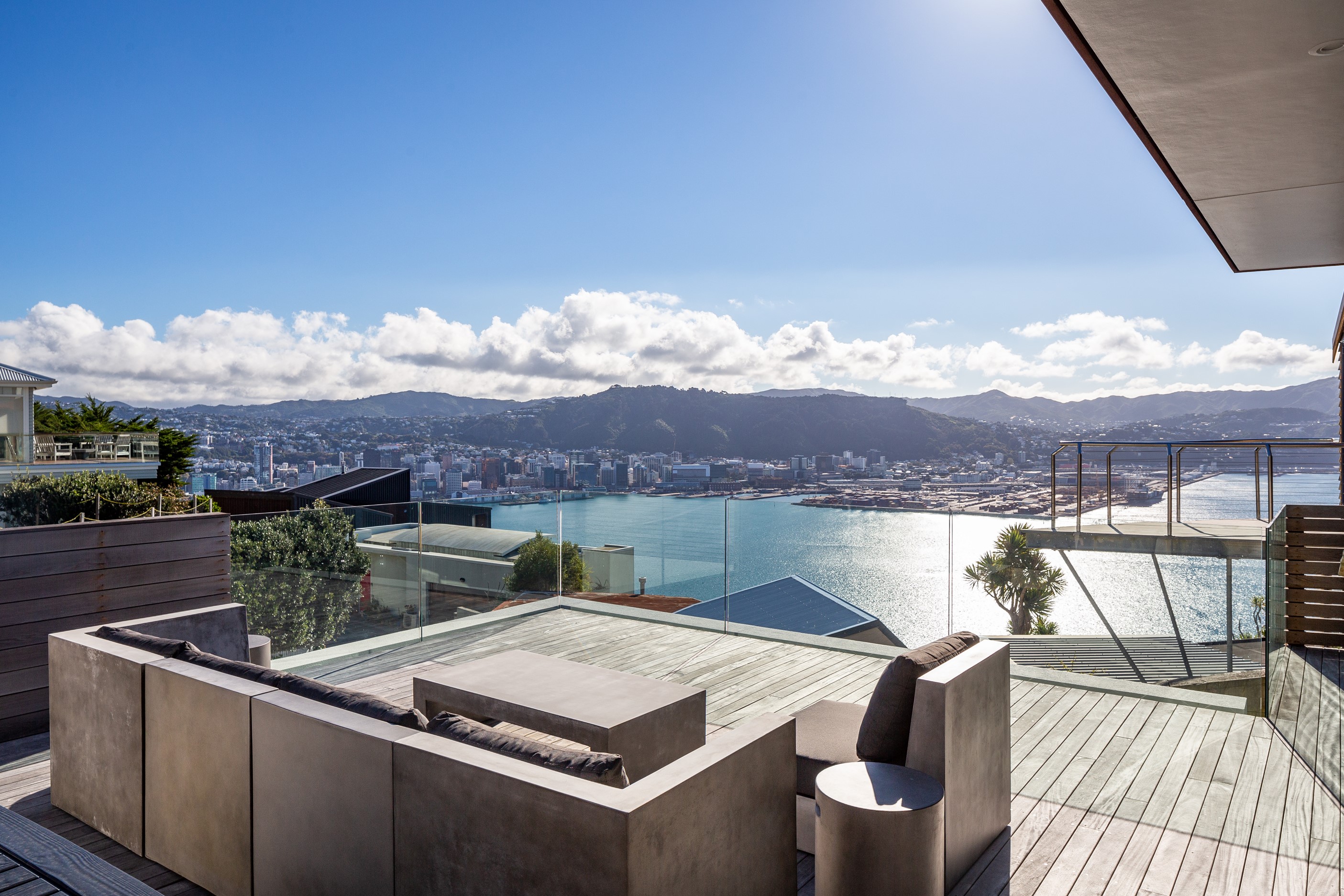 A blue-chip location called for a special home and the builders stepped up to the mark. Replacing an old house, this jewel at the top of the hill basks in all-day sun and takes in sweeping panoramas of Wellington, the harbour and nearby mountain ranges. All rooms have views, but the vista from the luxury of the main-bedroom ensuite is second to none. The lounge opens to a large west-facing deck. Deck is an understatement for what has been achieved here. It’s no simple extension to the 192sqm house – it is truly an engineering feat, given it sits atop a double garage that has been excavated into the hillside. An open-plan kitchen, living and dining area means everyone can enjoy the space and grandstand position. The views are pretty good inside too. Bamboo details are used for the kitchen shelves and vertical-slat balustrade. This house may be exposed on its perch, but it’s seriously warm. Underfloor heating; double-glazed, thermally broken windows; and passive heat from the sun and a concrete slab make it light and cosy. It’s a win-win for the owners – dramatic scenery and a warm home.