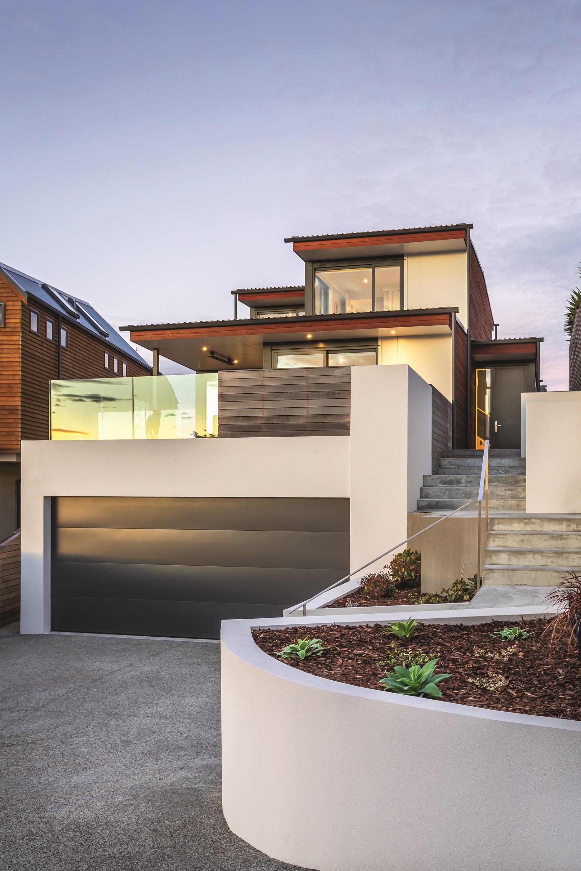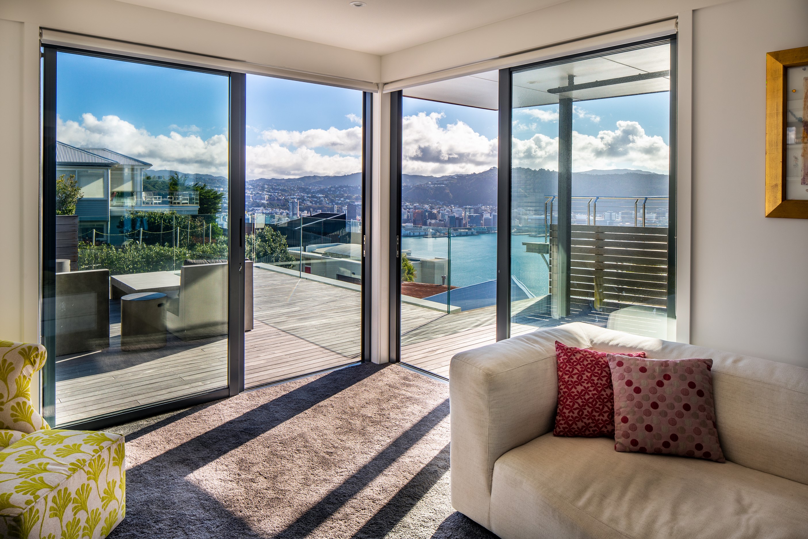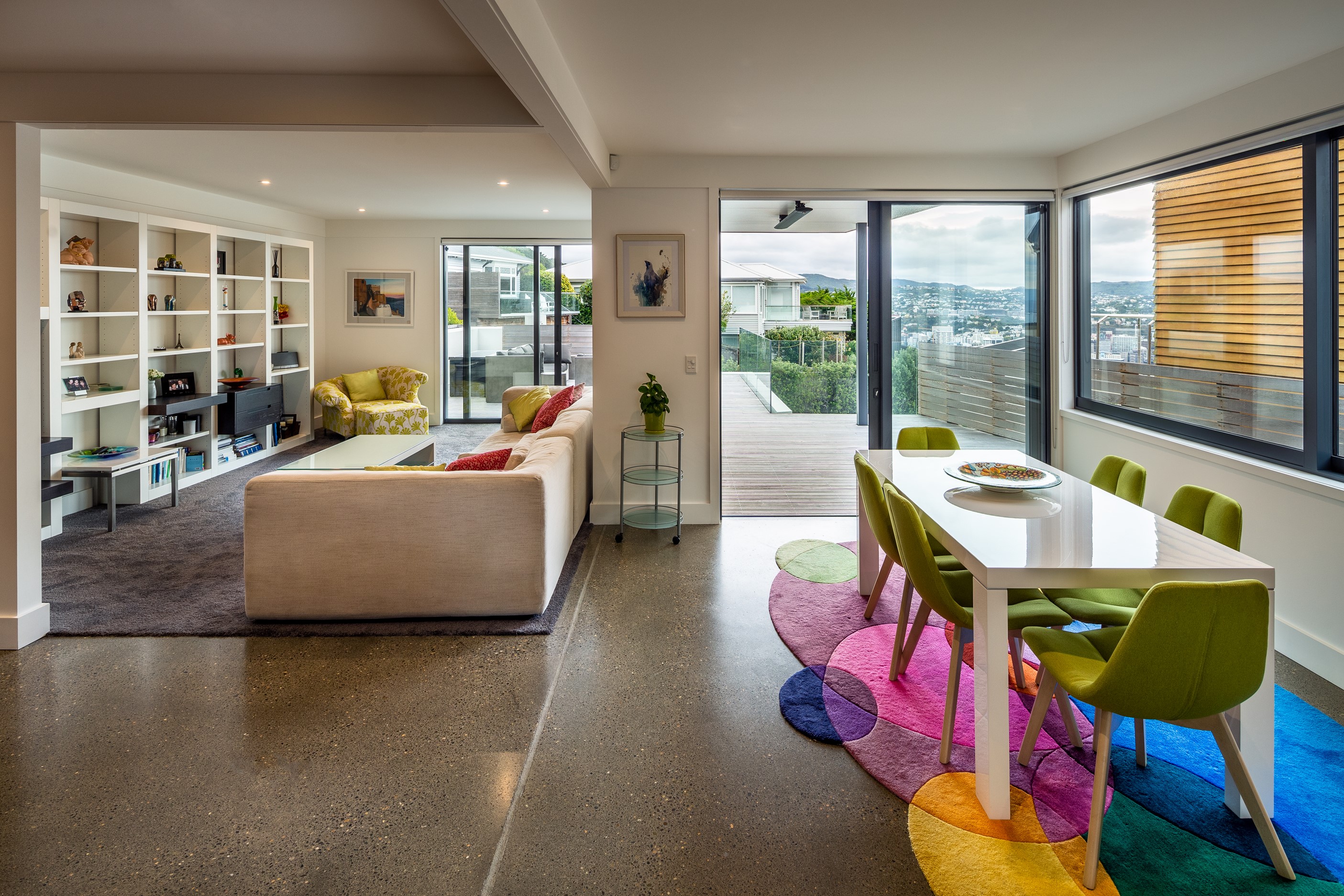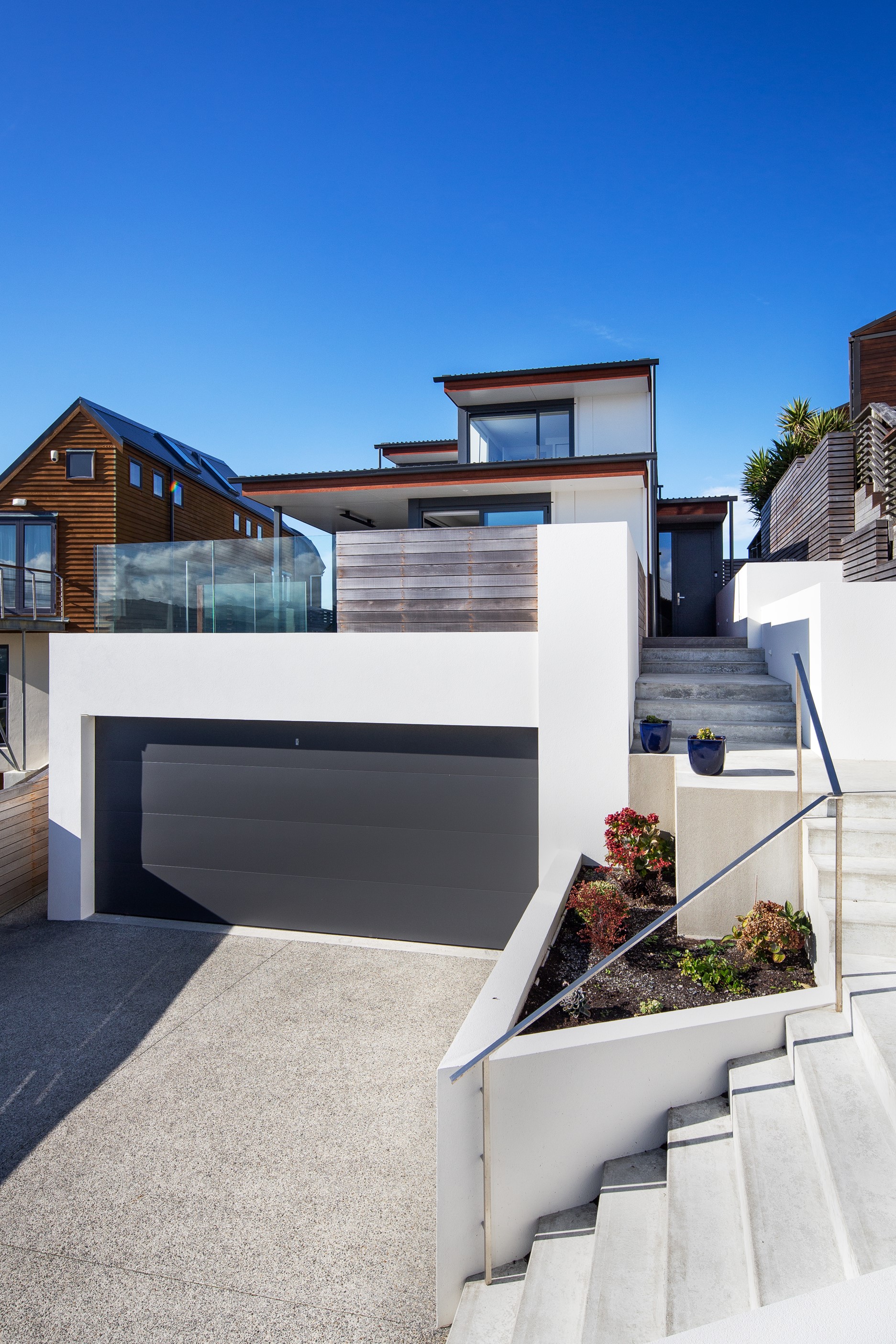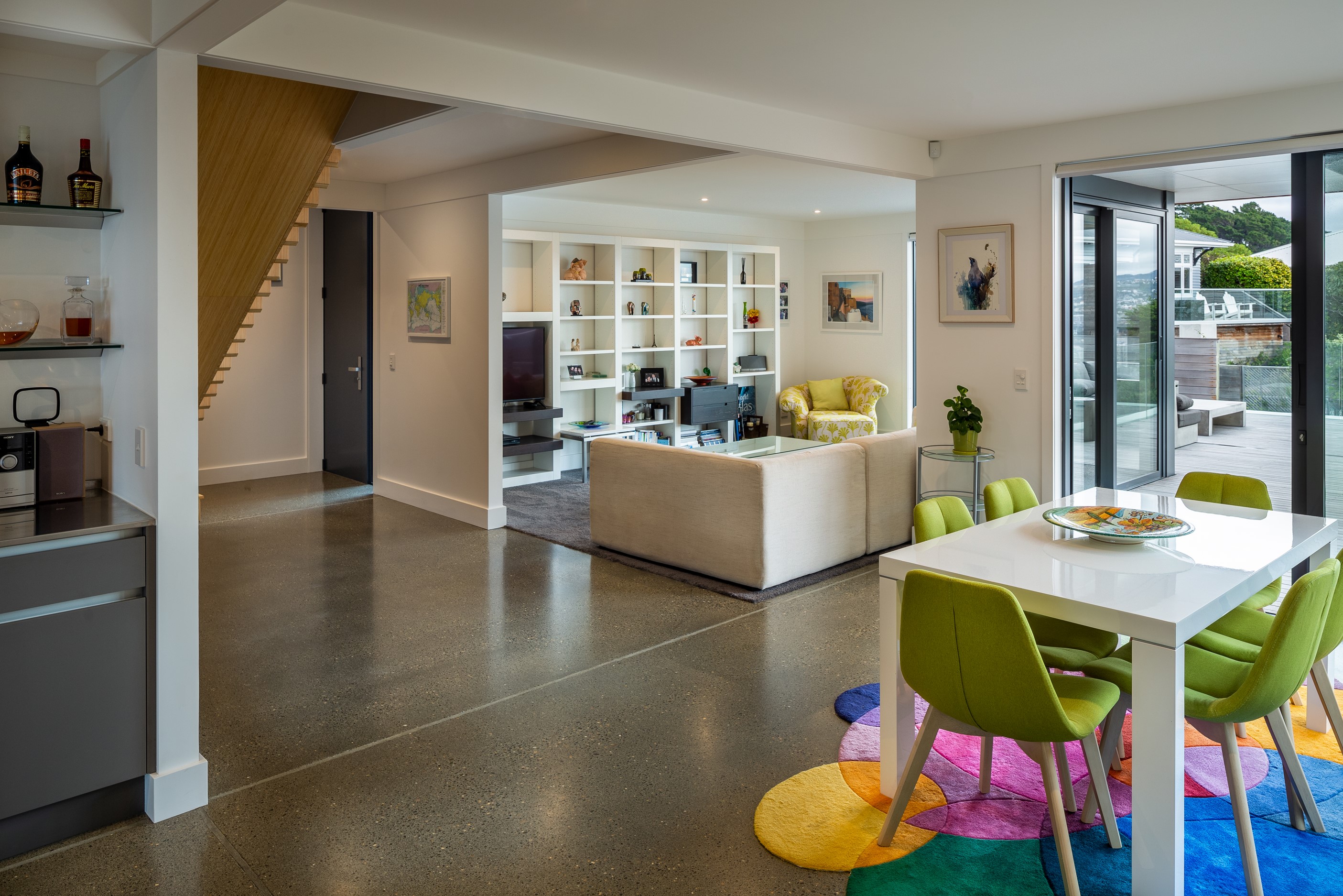 A blue-chip location called for a special home and the builders stepped up to the mark. Replacing an old house, this jewel at the top of the hill basks in all-day sun and takes in sweeping panoramas of Wellington, the harbour and nearby mountain ranges. All rooms have views, but the vista from the luxury of the main-bedroom ensuite is second to none. The lounge opens to a large west-facing deck. Deck is an understatement for what has been achieved here. It’s no simple extension to the 192sqm house – it is truly an engineering feat, given it sits atop a double garage that has been excavated into the hillside. An open-plan kitchen, living and dining area means everyone can enjoy the space and grandstand position. The views are pretty good inside too. Bamboo details are used for the kitchen shelves and vertical-slat balustrade. This house may be exposed on its perch, but it’s seriously warm. Underfloor heating; double-glazed, thermally broken windows; and passive heat from the sun and a concrete slab make it light and cosy. It’s a win-win for the owners – dramatic scenery and a warm home.