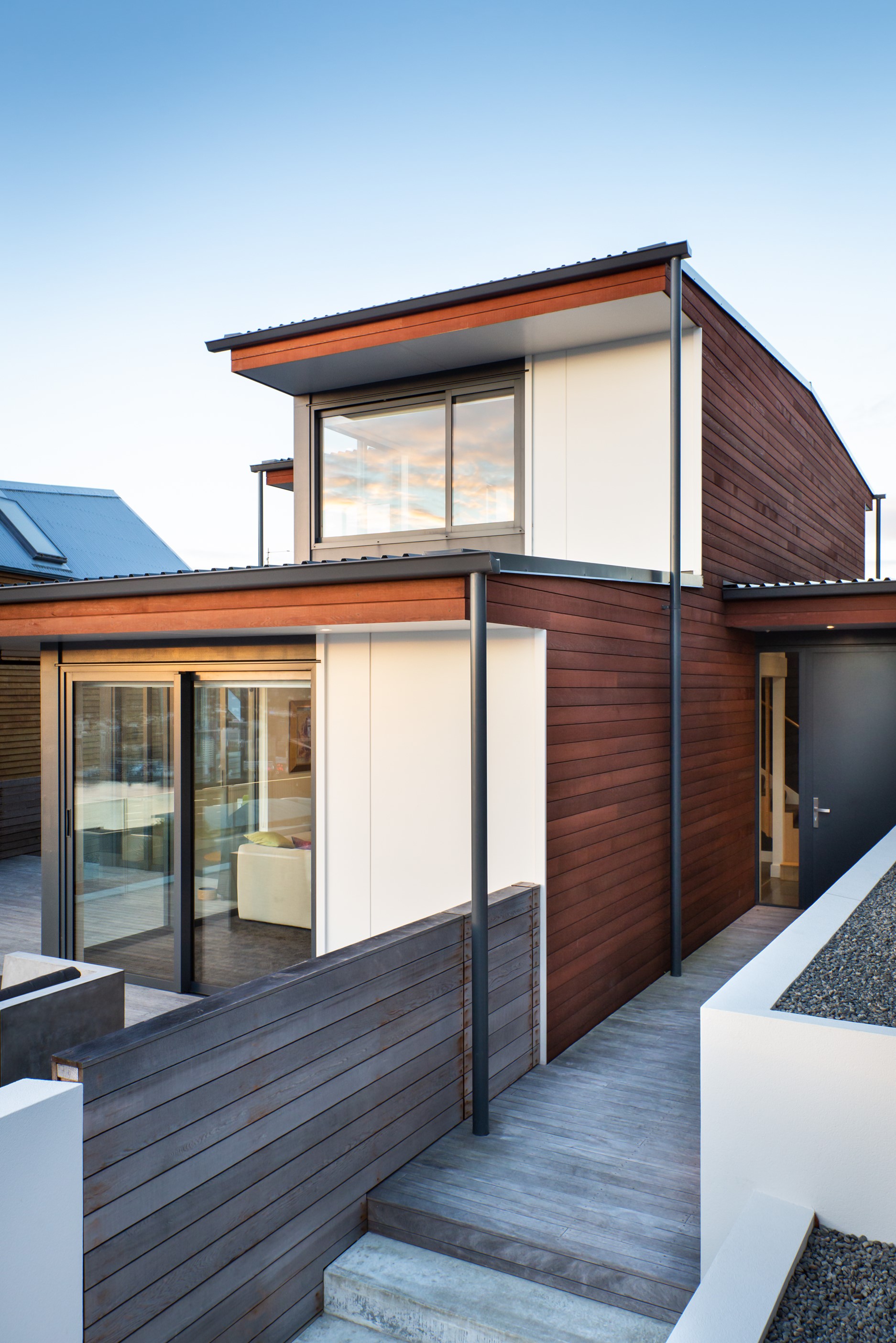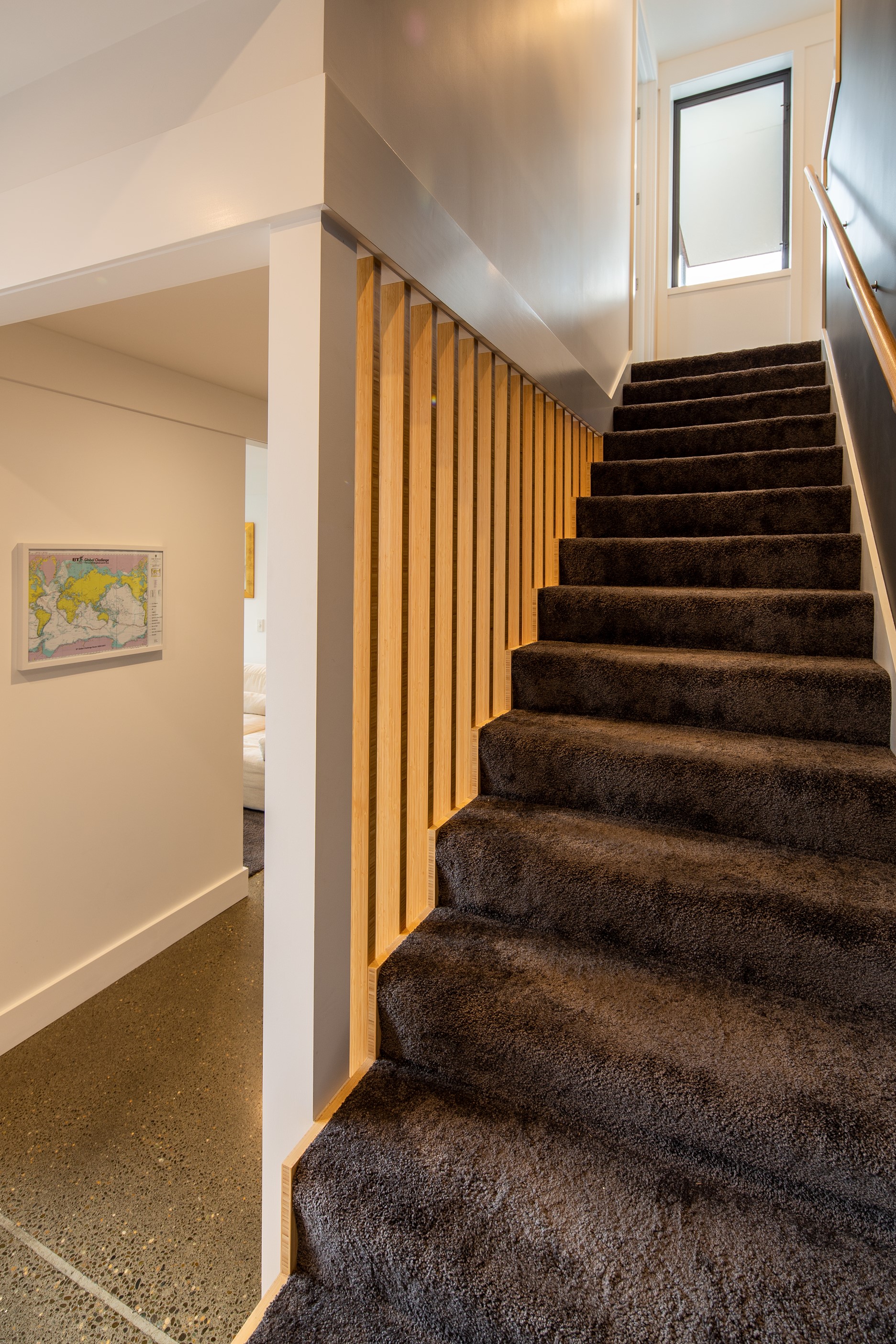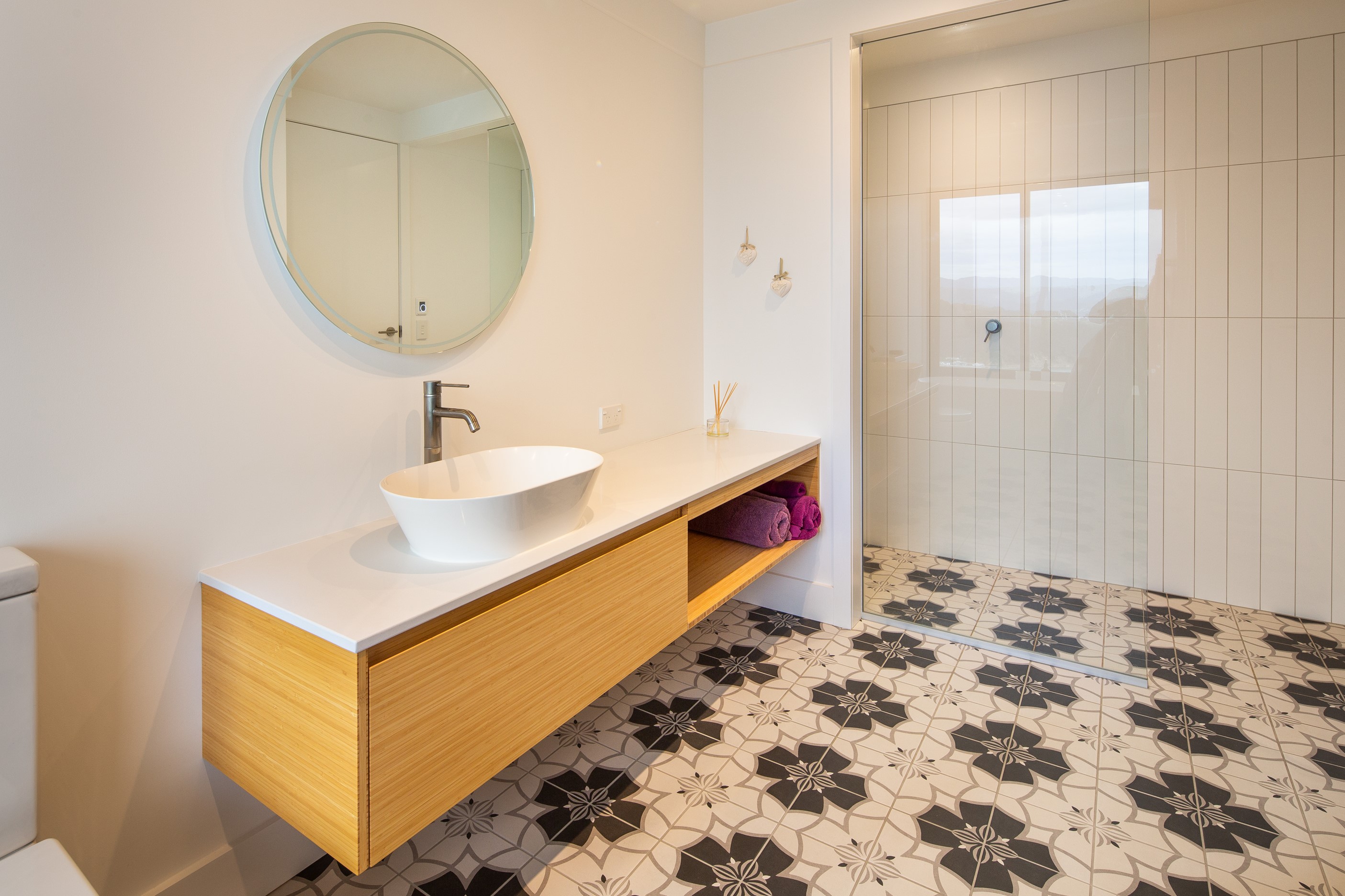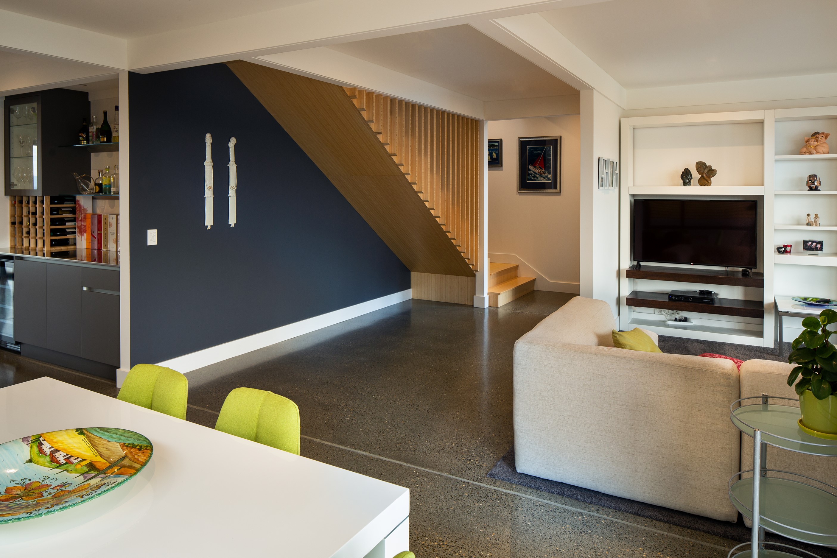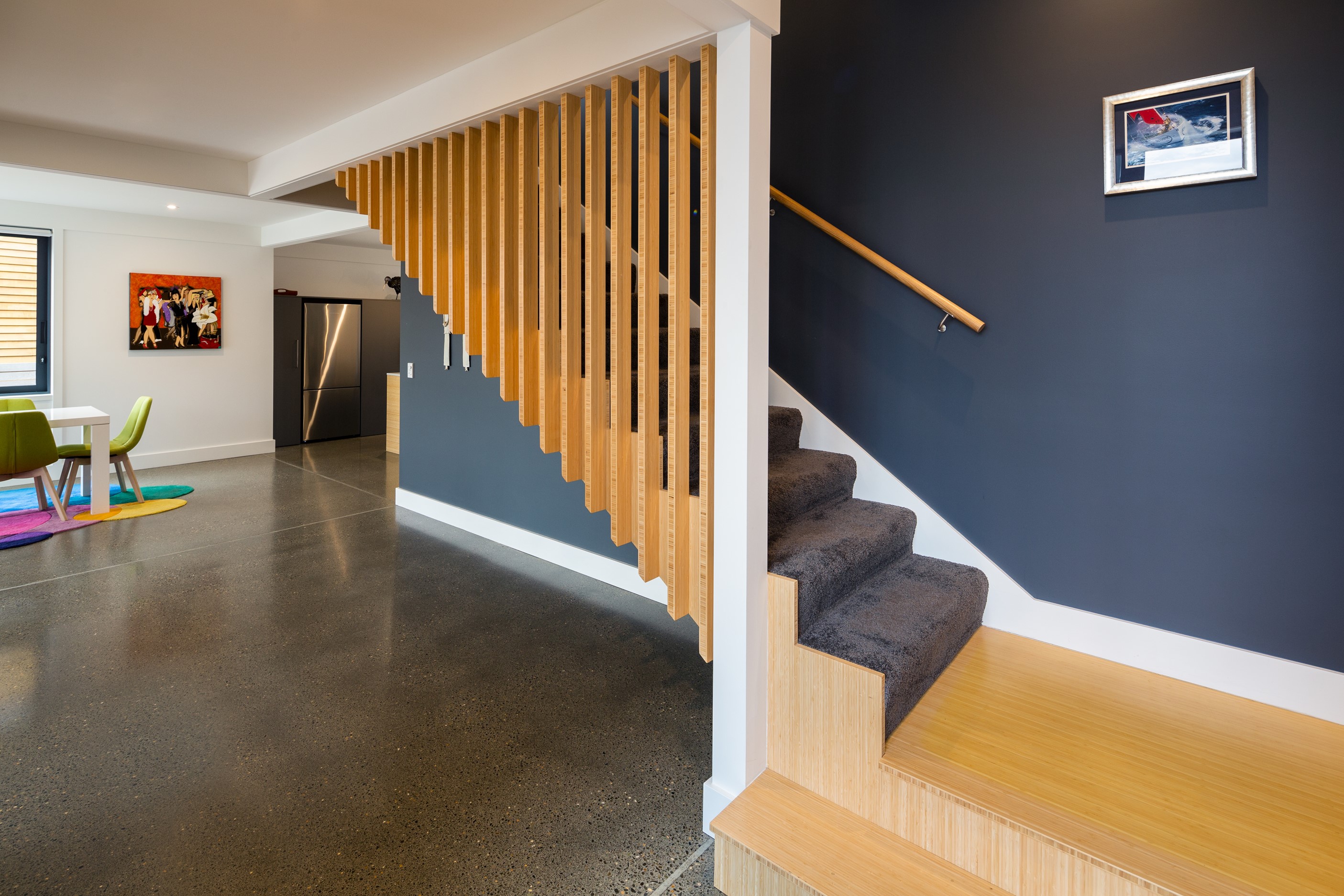 A blue-chip location called for a special home and the builders stepped up to the mark. Replacing an old house, this jewel at the top of the hill basks in all-day sun and takes in sweeping panoramas of Wellington, the harbour and nearby mountain ranges. All rooms have views, but the vista from the luxury of the main-bedroom ensuite is second to none. The lounge opens to a large west-facing deck. Deck is an understatement for what has been achieved here. It’s no simple extension to the 192sqm house – it is truly an engineering feat, given it sits atop a double garage that has been excavated into the hillside. An open-plan kitchen, living and dining area means everyone can enjoy the space and grandstand position. The views are pretty good inside too. Bamboo details are used for the kitchen shelves and vertical-slat balustrade. This house may be exposed on its perch, but it’s seriously warm. Underfloor heating; double-glazed, thermally broken windows; and passive heat from the sun and a concrete slab make it light and cosy. It’s a win-win for the owners – dramatic scenery and a warm home.