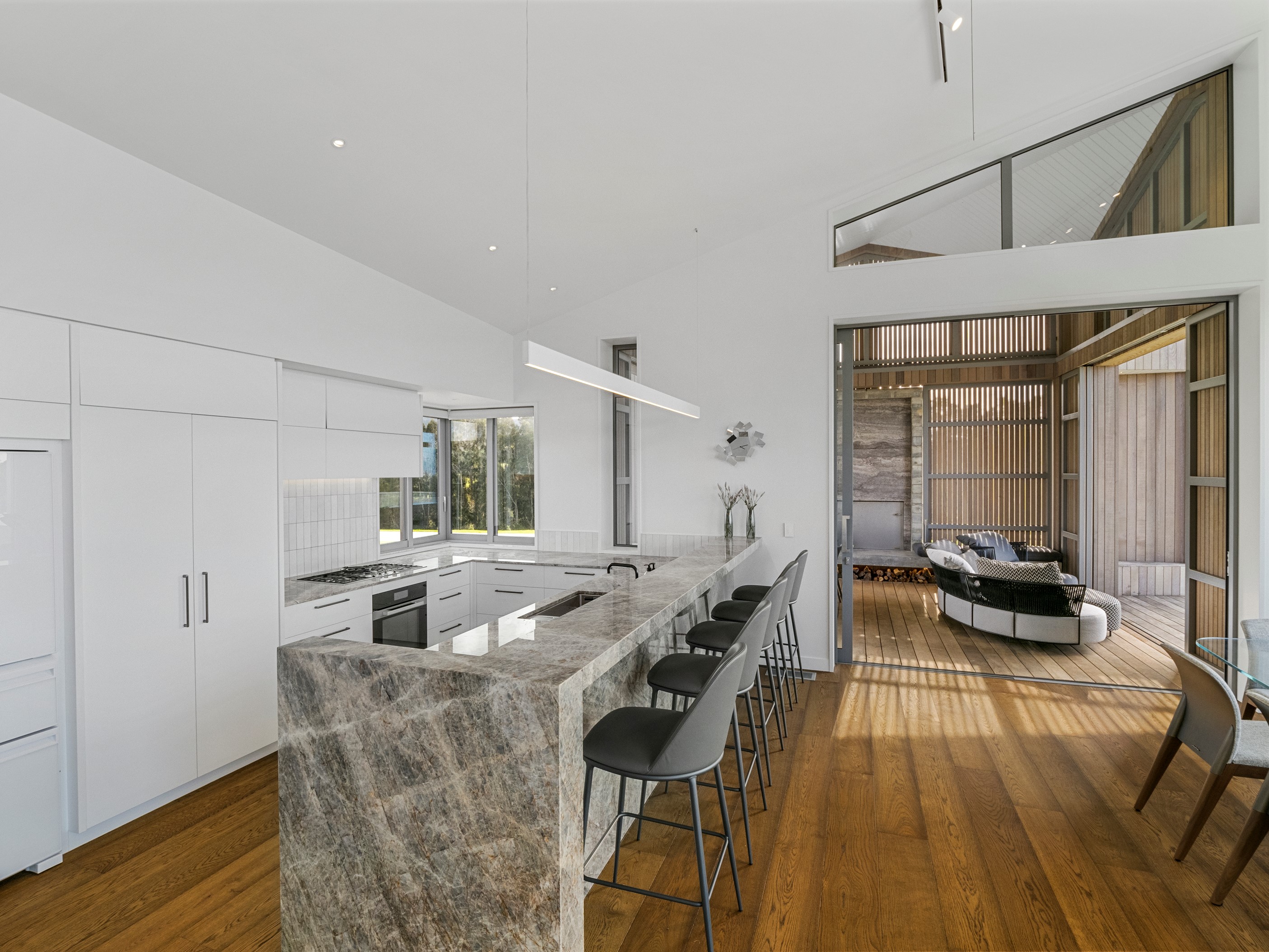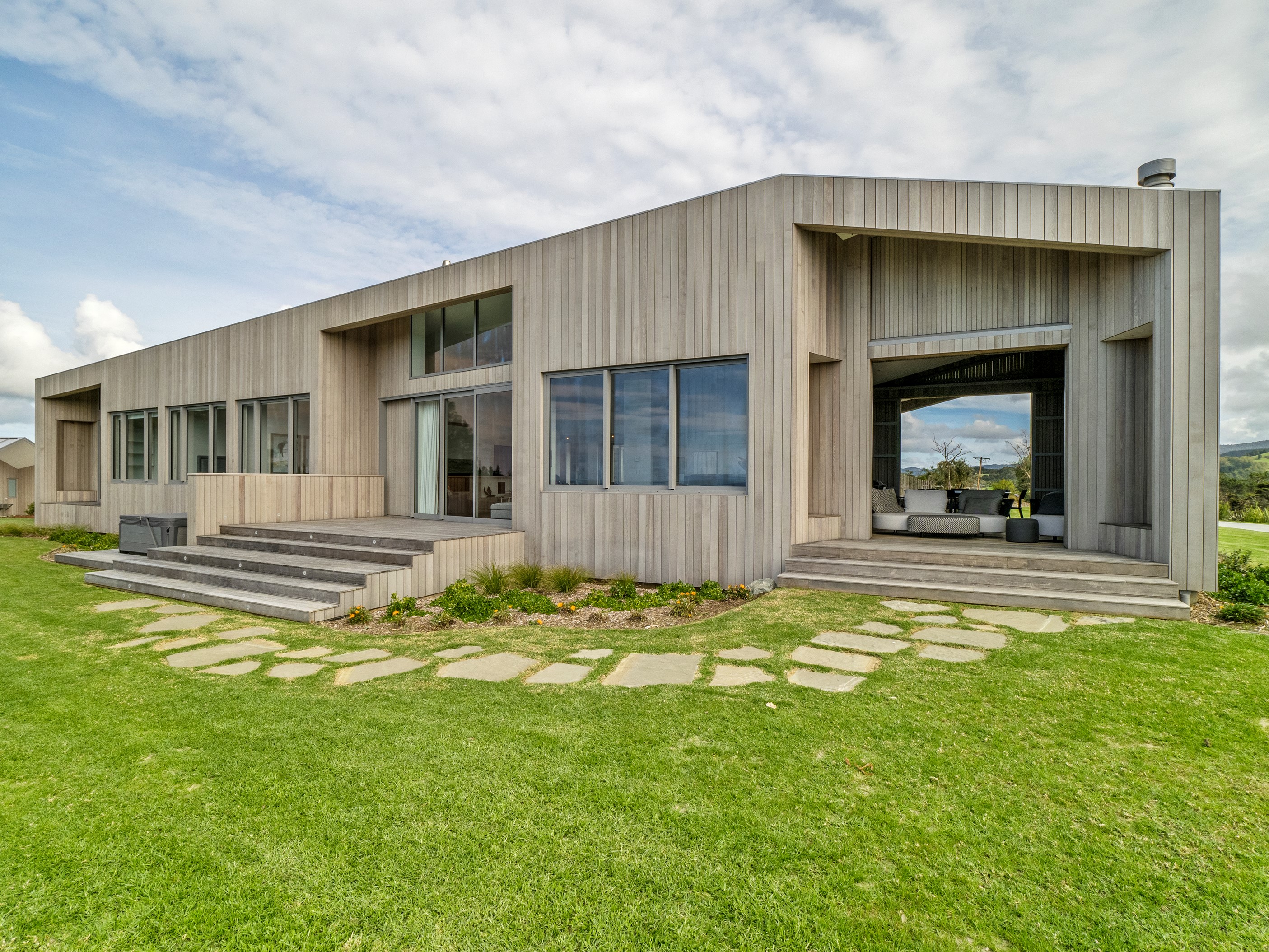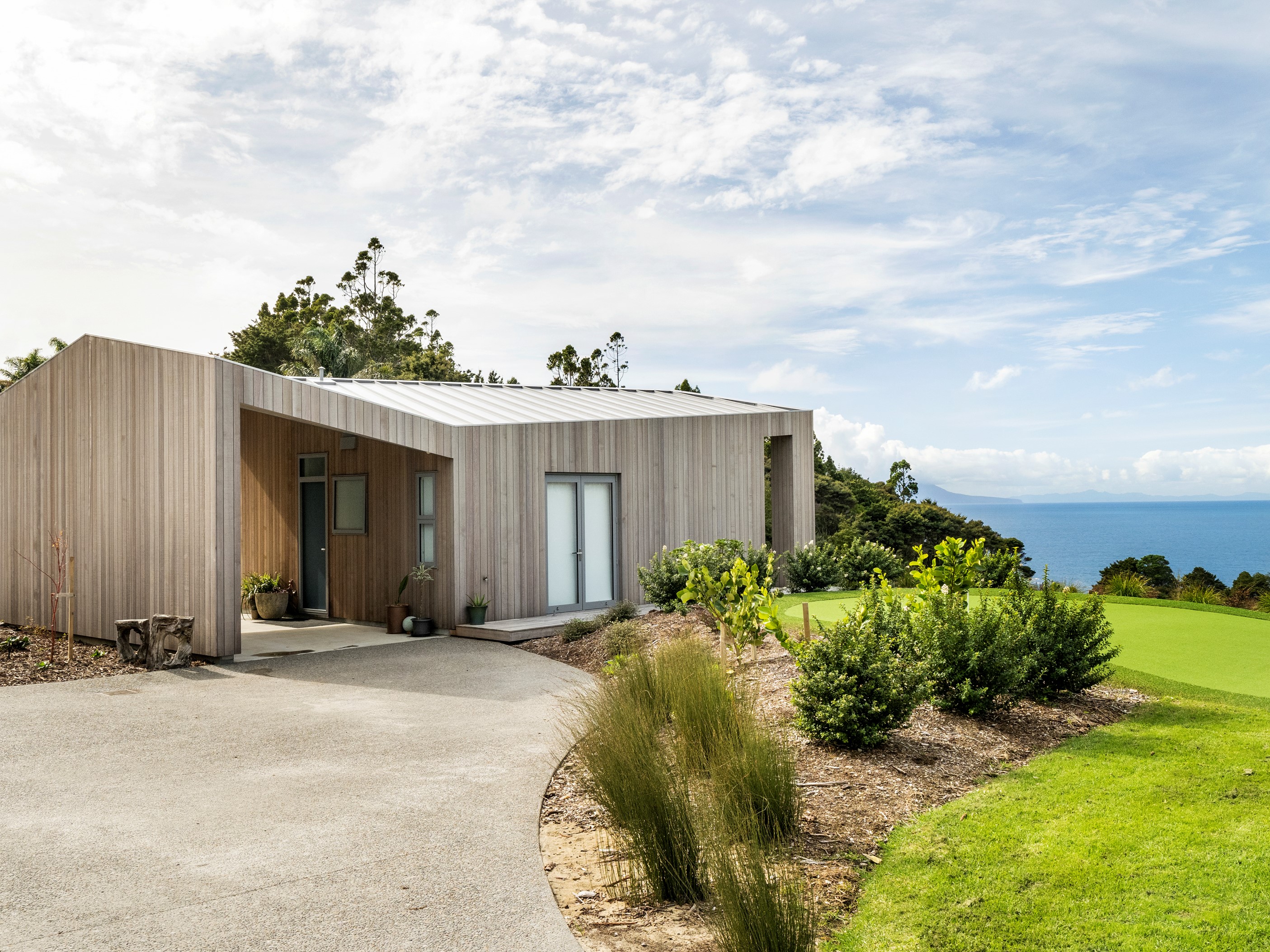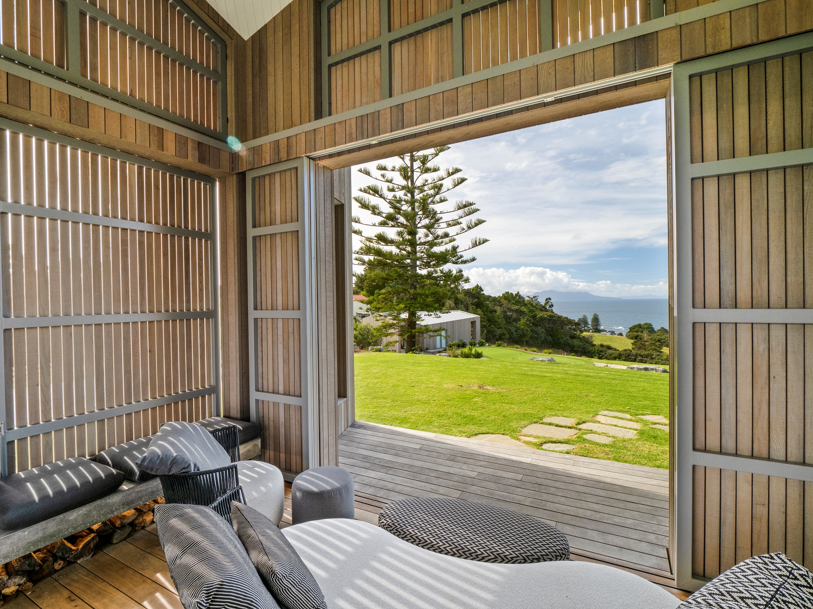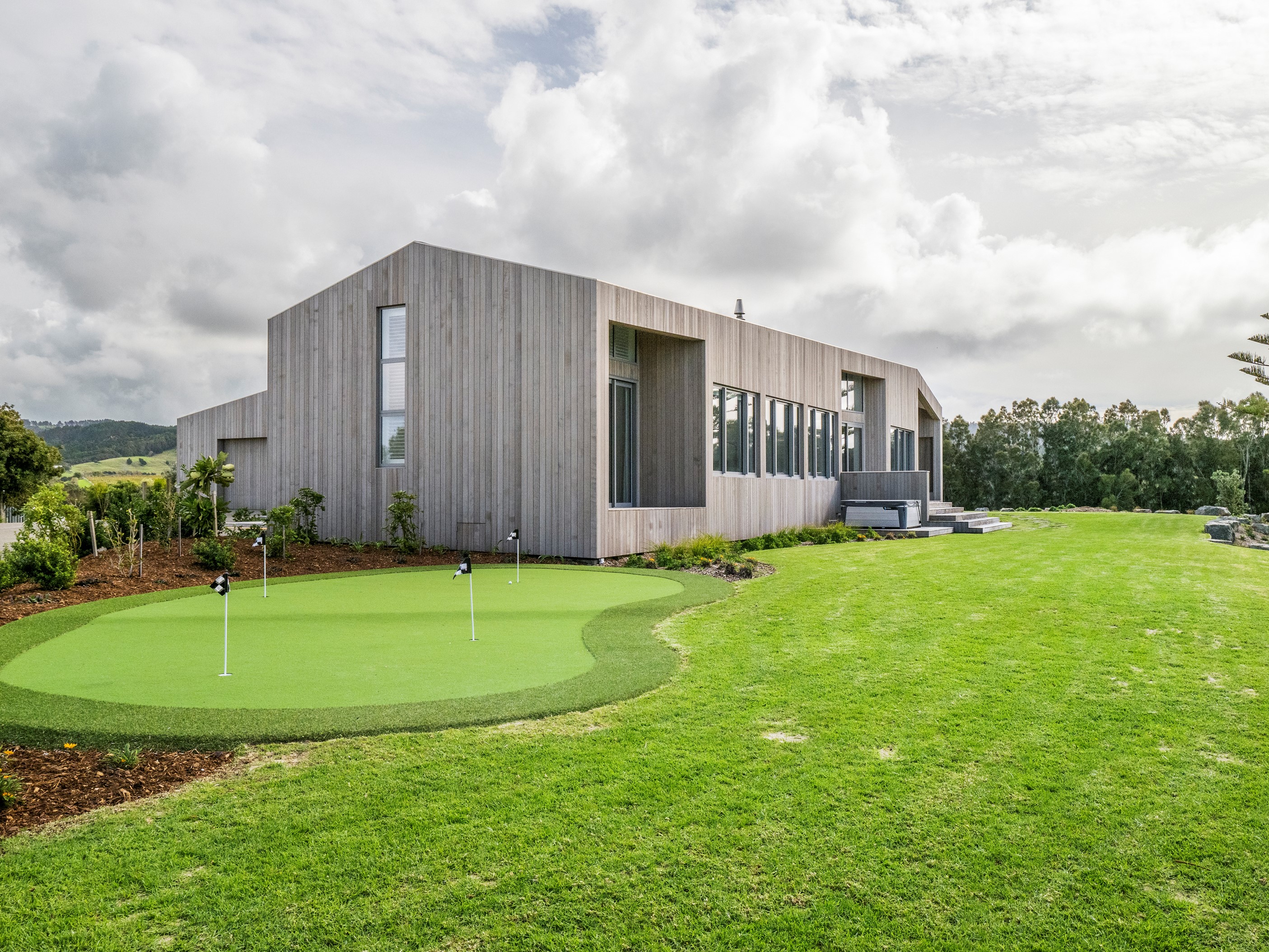 Grandstand views towards Matheson Bay and Matakana Hill make this coastal site extremely special, but also exposed. So, how do you enjoy the benefits without any compromise? You create “pockets of shelter with view shafts”, as the architect of this luxury 332sqm home, Belinda George says on her website. In her response to site, George designed outdoor rooms to the north, east and west of the four-bedroom home, allowing the owners to connect with the outdoors, no matter the time of year, no matter the weather. Vertical cedar wraps the distinct and intriguing forms of the house and also a 64sqm cottage. Pared-back linear faces are punctuated with recesses and windows that open up towards the views. Meanwhile, the spaces facing the inland part of the section are scaled back and more intimate. A Japanese-style garden in the north-west can be enjoyed from the deck and there’s a putting green on the lawn. A little further afield a village of solar panels provides energy. As you’d imagine in a build of this calibre, the fit-out is high-end, yet it remains understated and welcoming. The abiding themes here are of cleverness, coastal elegance and next-level craftsmanship.