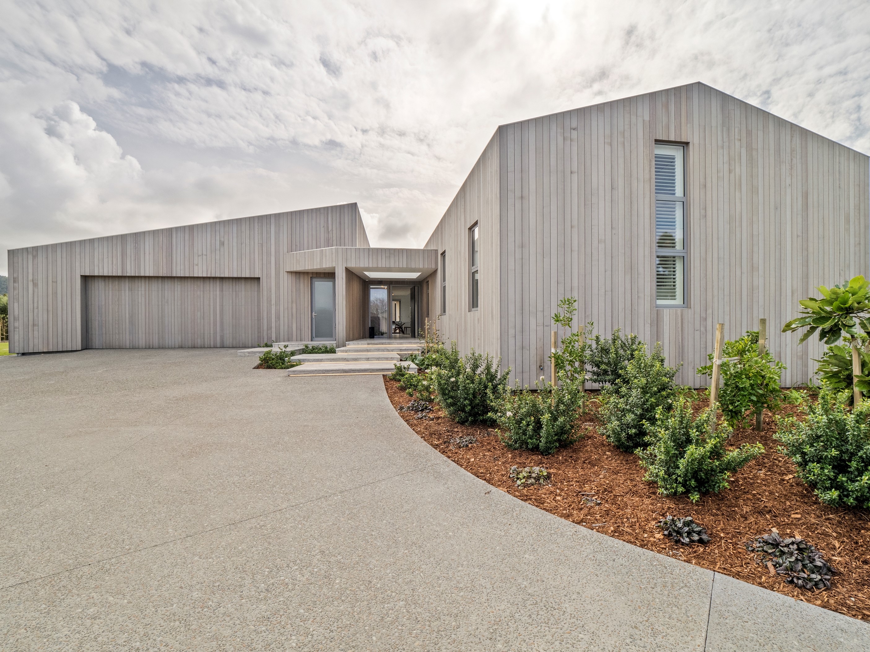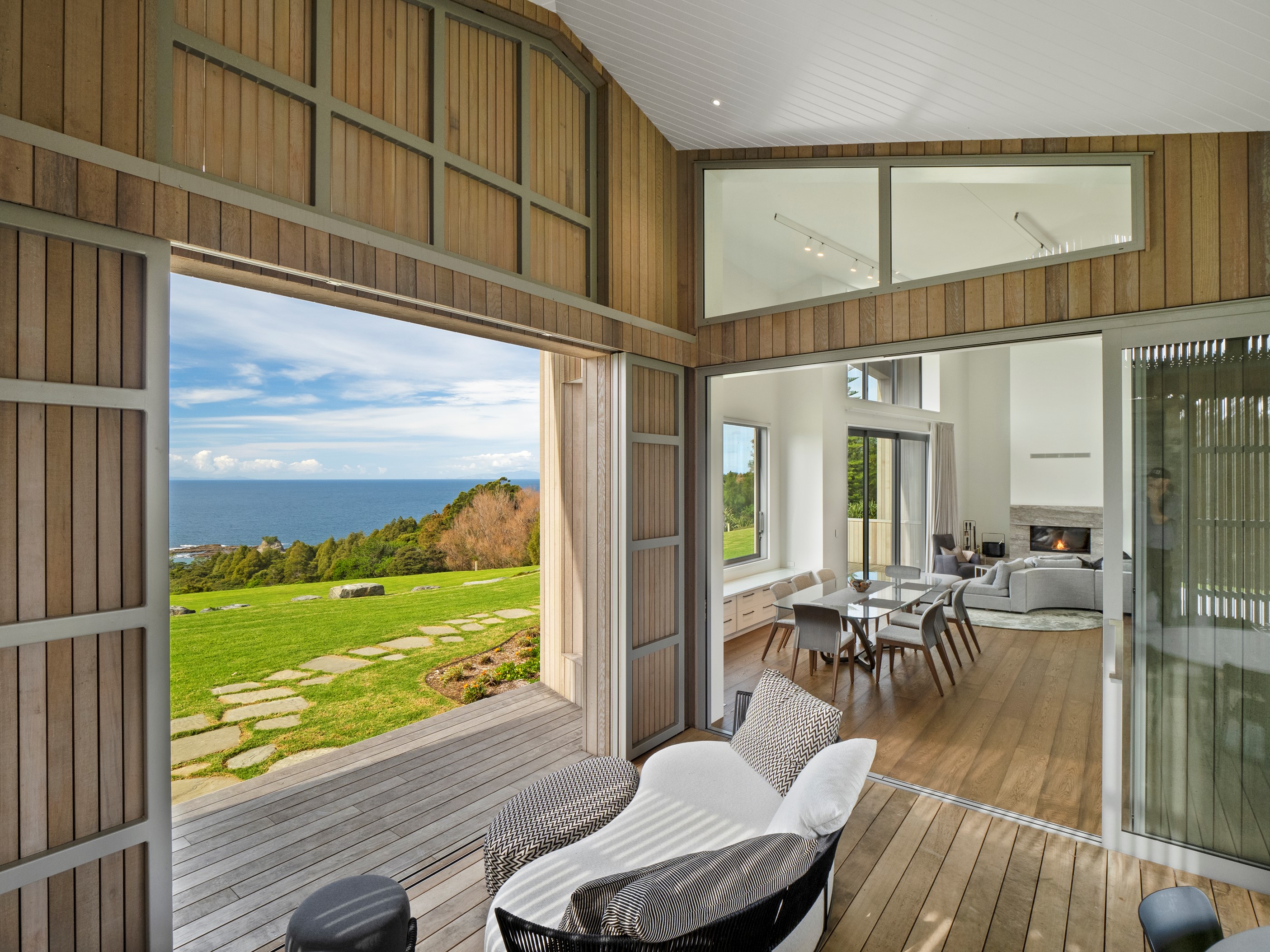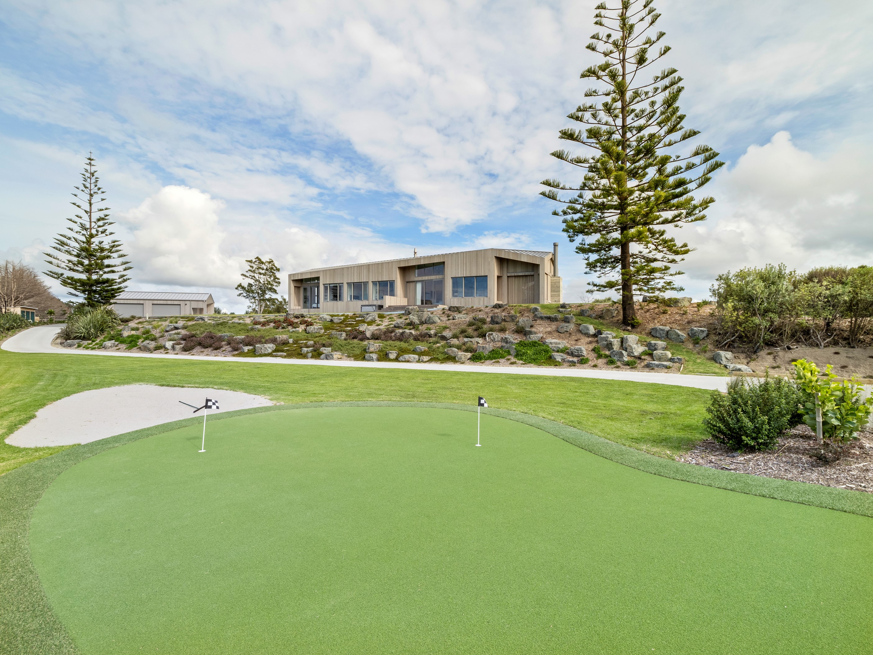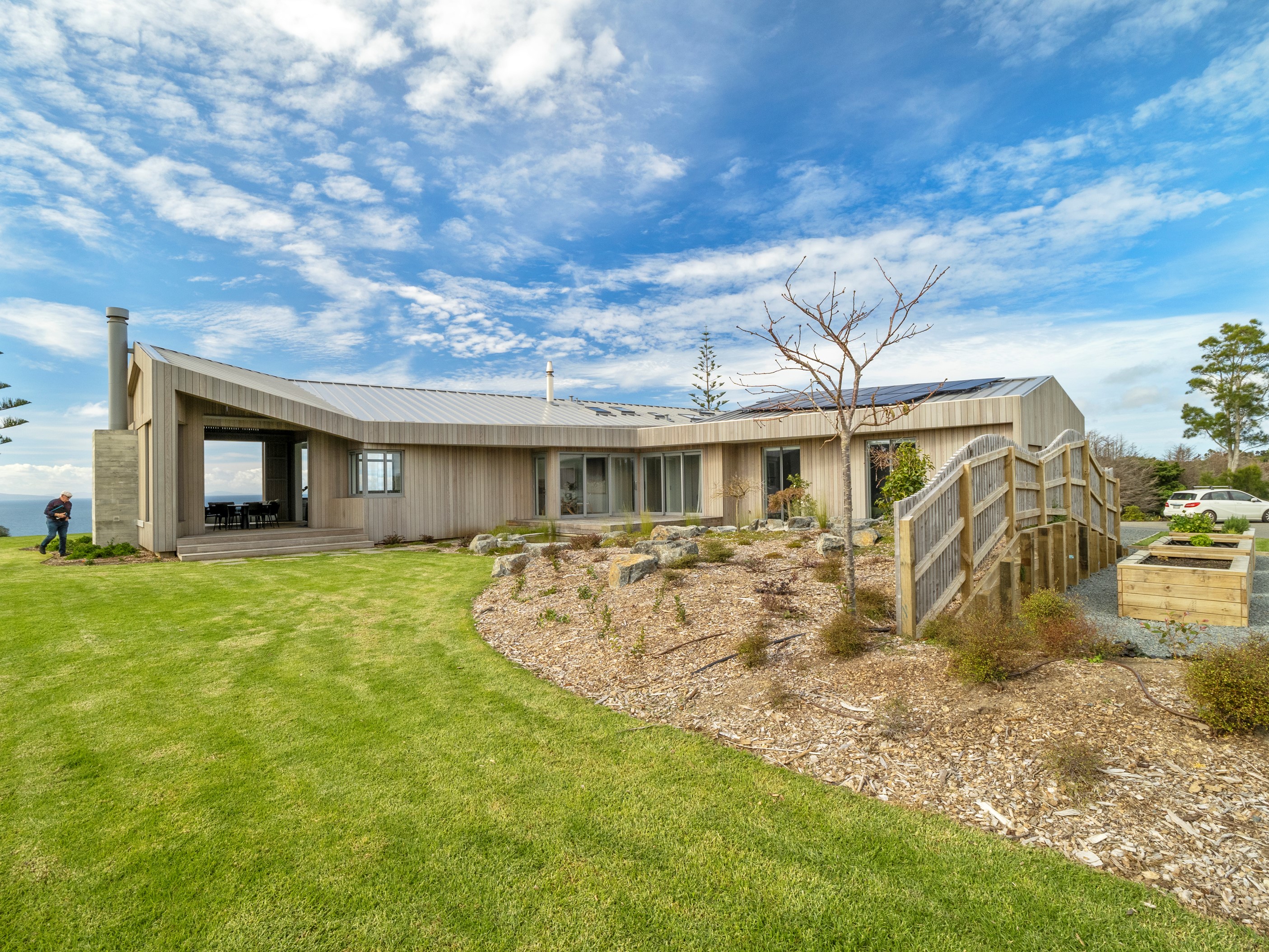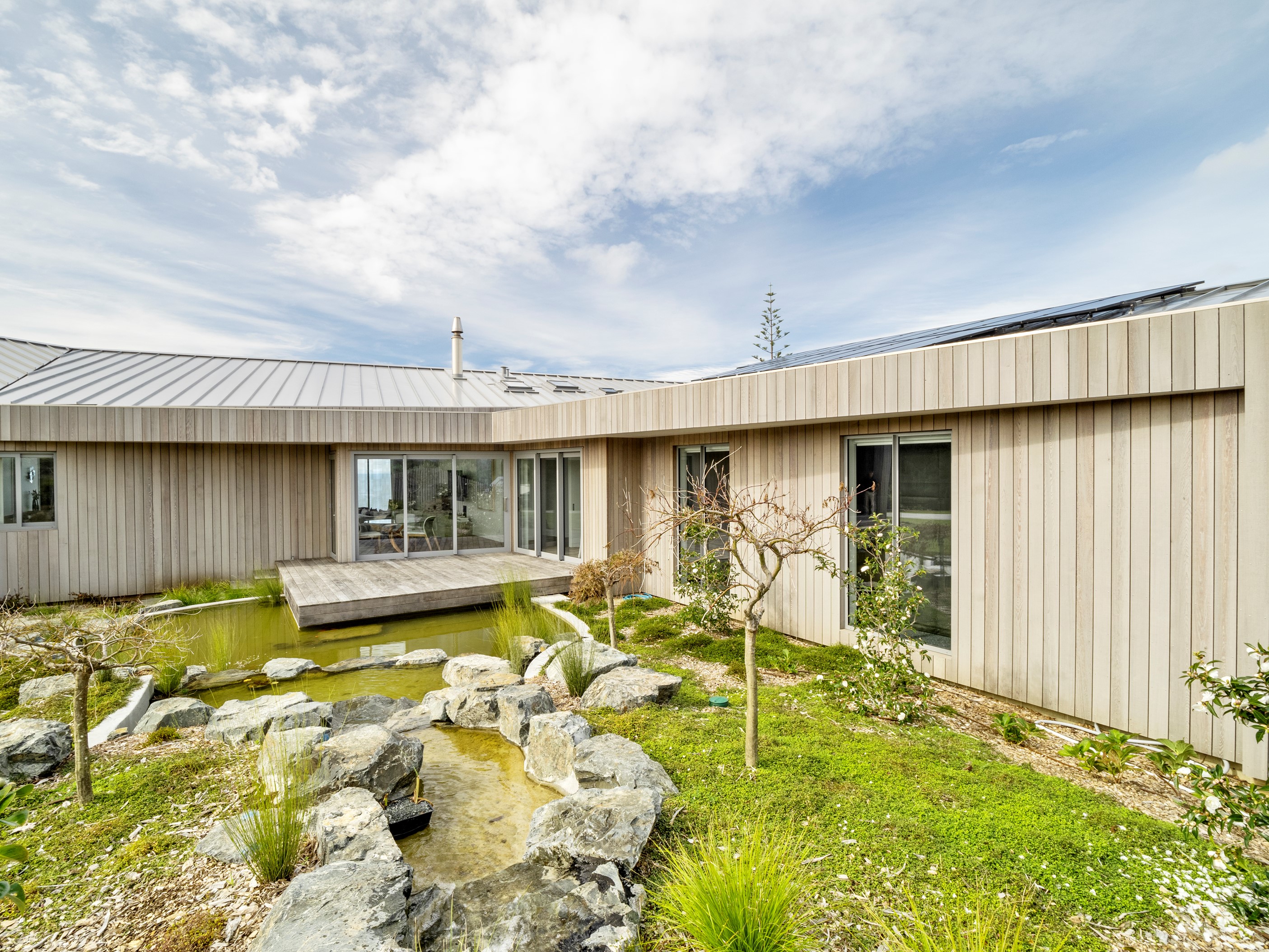 Grandstand views towards Matheson Bay and Matakana Hill make this coastal site extremely special, but also exposed. So, how do you enjoy the benefits without any compromise? You create “pockets of shelter with view shafts”, as the architect of this luxury 332sqm home, Belinda George says on her website. In her response to site, George designed outdoor rooms to the north, east and west of the four-bedroom home, allowing the owners to connect with the outdoors, no matter the time of year, no matter the weather. Vertical cedar wraps the distinct and intriguing forms of the house and also a 64sqm cottage. Pared-back linear faces are punctuated with recesses and windows that open up towards the views. Meanwhile, the spaces facing the inland part of the section are scaled back and more intimate. A Japanese-style garden in the north-west can be enjoyed from the deck and there’s a putting green on the lawn. A little further afield a village of solar panels provides energy. As you’d imagine in a build of this calibre, the fit-out is high-end, yet it remains understated and welcoming. The abiding themes here are of cleverness, coastal elegance and next-level craftsmanship.