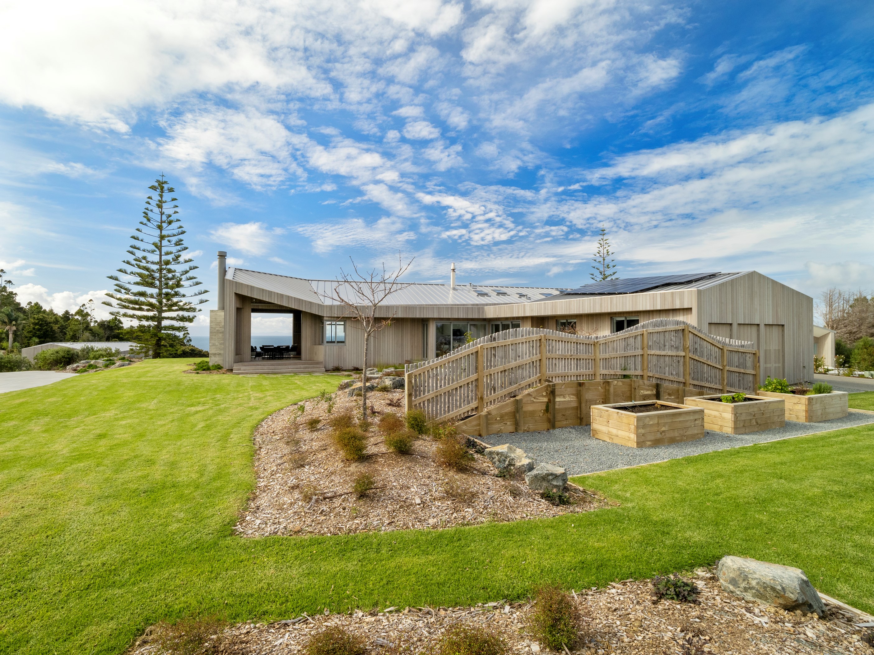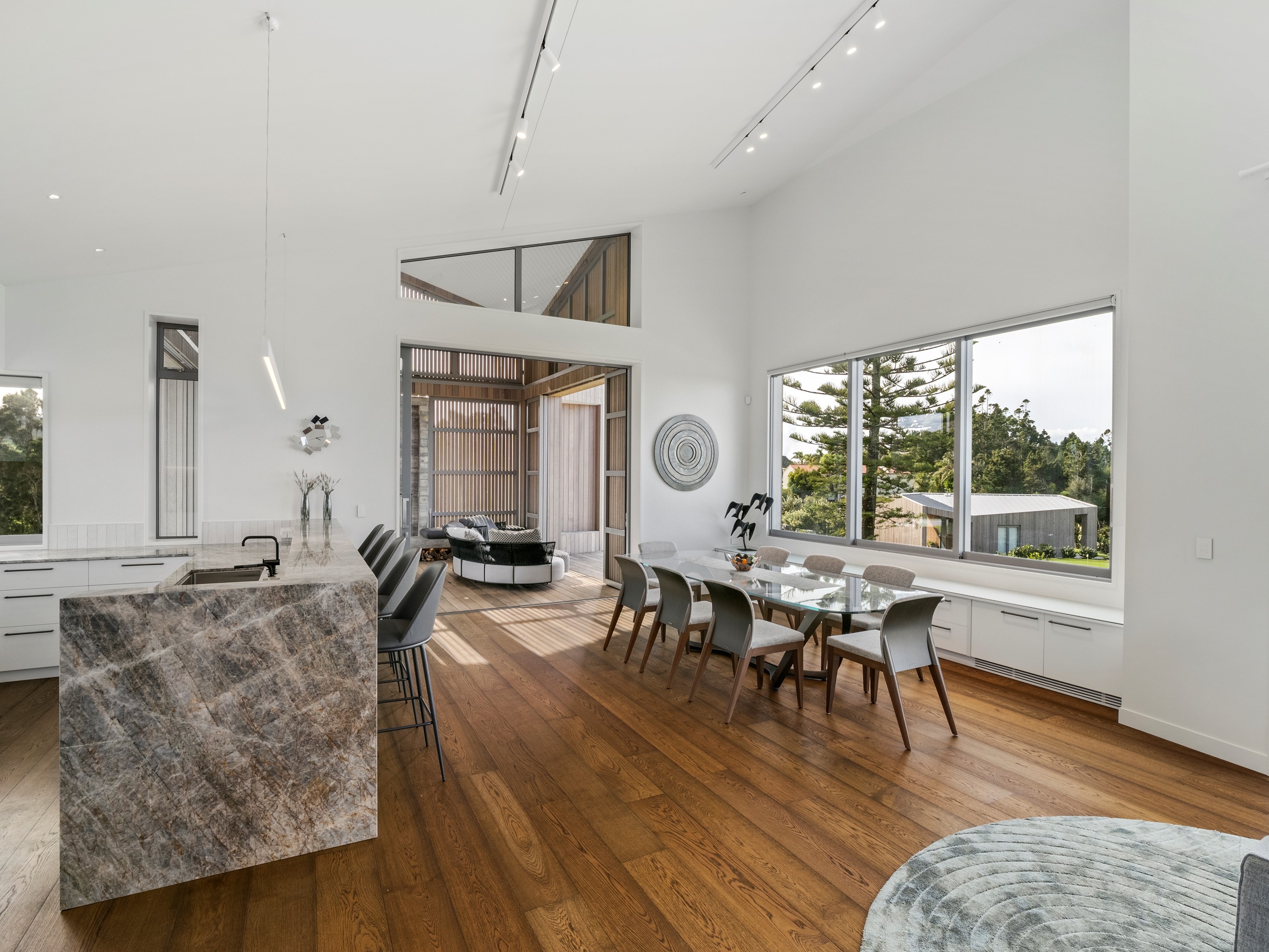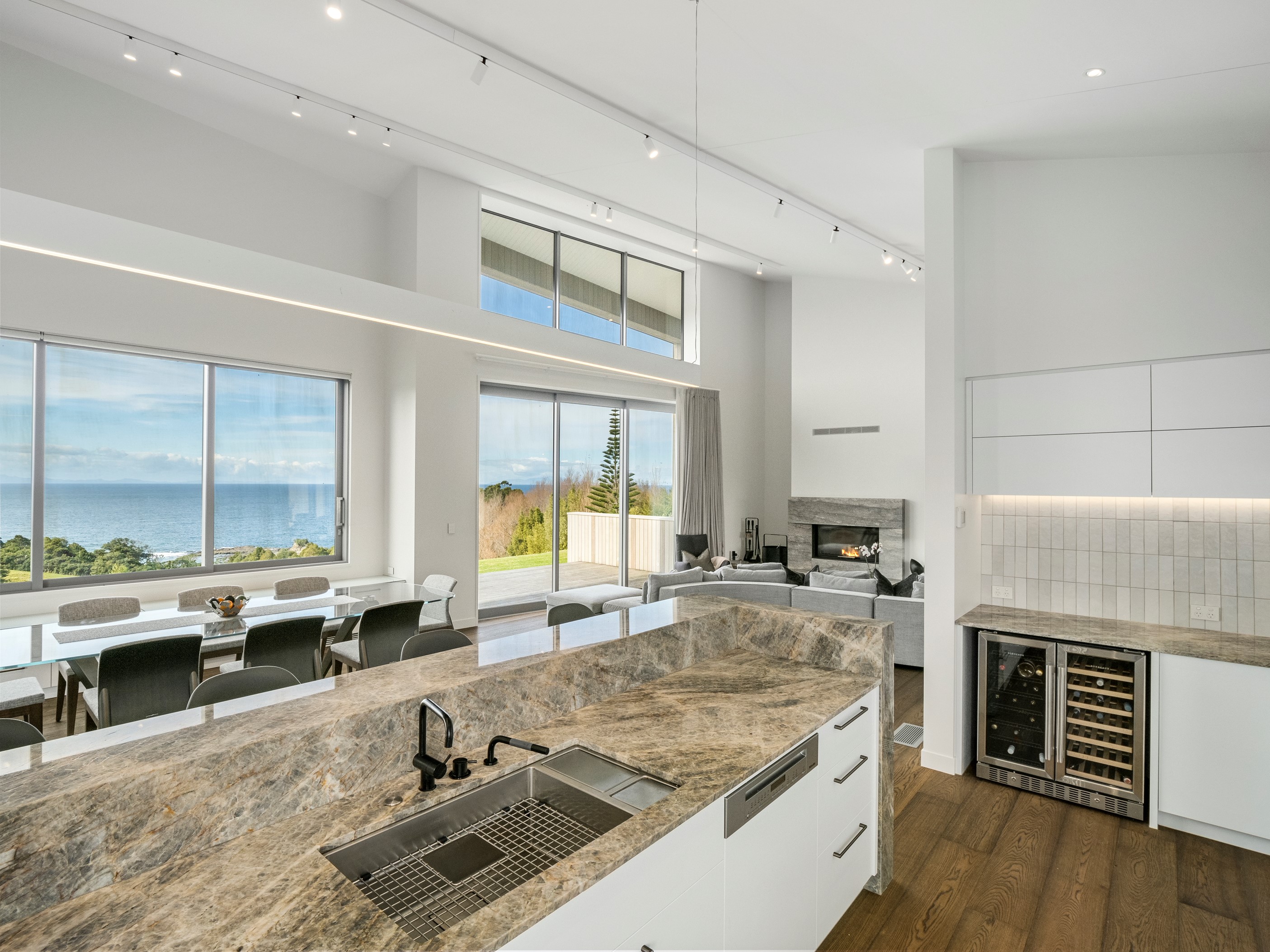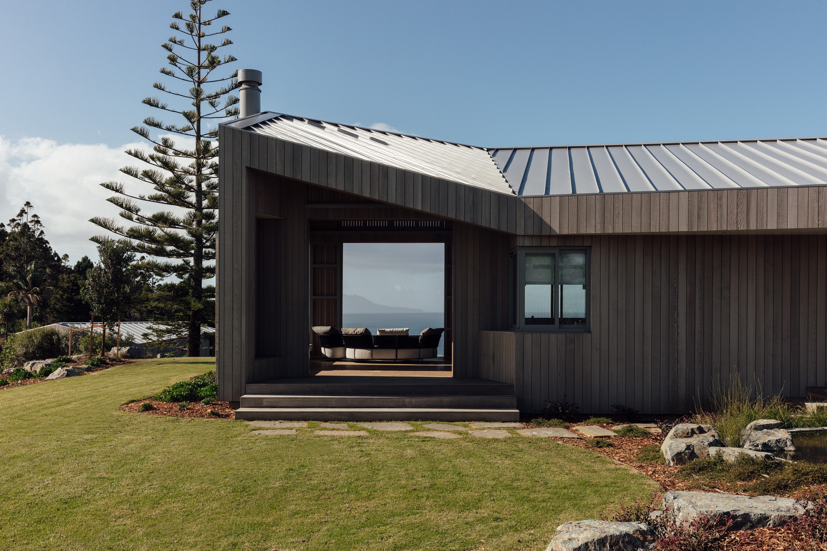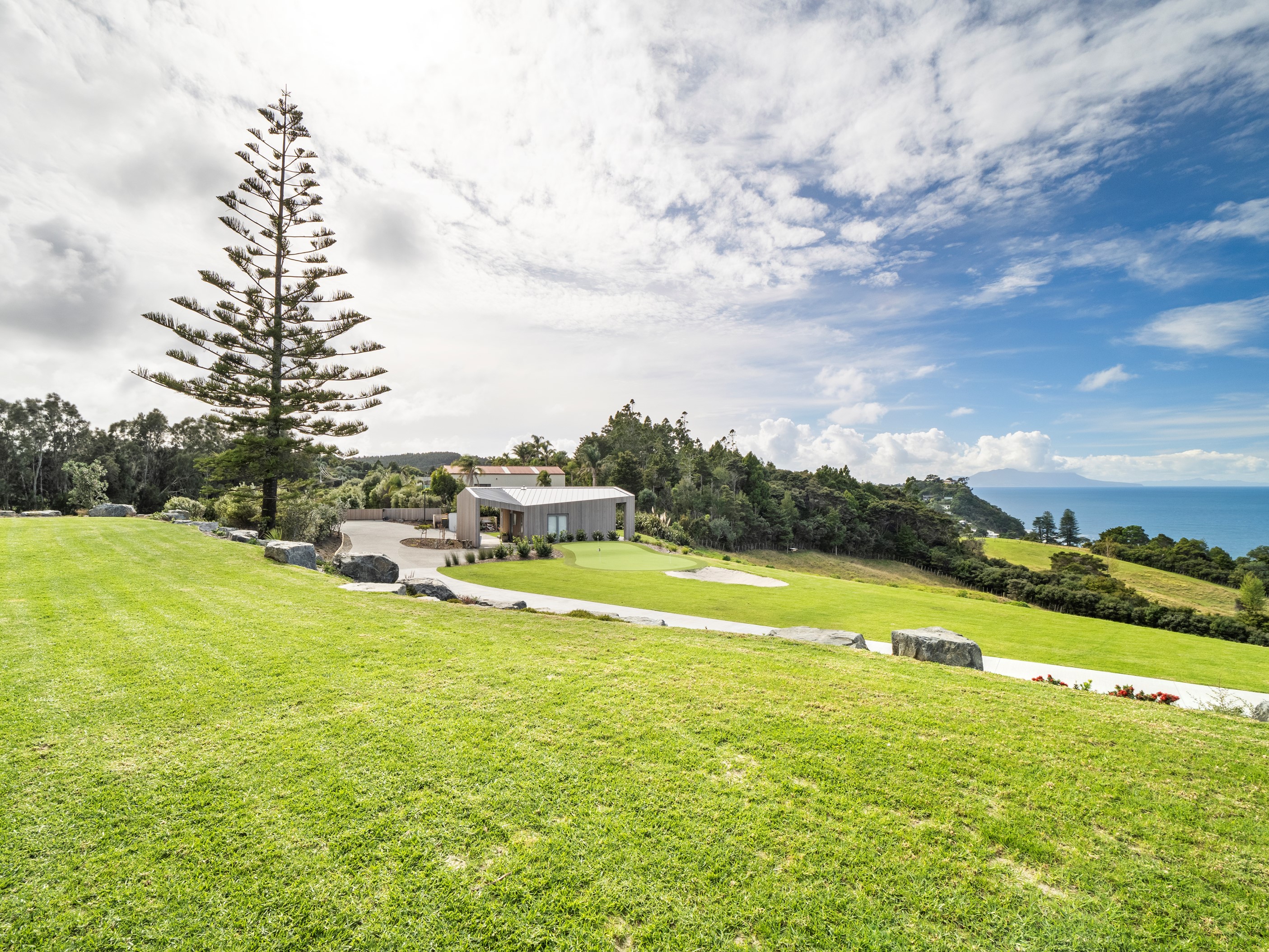 Grandstand views towards Matheson Bay and Matakana Hill make this coastal site extremely special, but also exposed. So, how do you enjoy the benefits without any compromise? You create “pockets of shelter with view shafts”, as the architect of this luxury 332sqm home, Belinda George says on her website. In her response to site, George designed outdoor rooms to the north, east and west of the four-bedroom home, allowing the owners to connect with the outdoors, no matter the time of year, no matter the weather. Vertical cedar wraps the distinct and intriguing forms of the house and also a 64sqm cottage. Pared-back linear faces are punctuated with recesses and windows that open up towards the views. Meanwhile, the spaces facing the inland part of the section are scaled back and more intimate. A Japanese-style garden in the north-west can be enjoyed from the deck and there’s a putting green on the lawn. A little further afield a village of solar panels provides energy. As you’d imagine in a build of this calibre, the fit-out is high-end, yet it remains understated and welcoming. The abiding themes here are of cleverness, coastal elegance and next-level craftsmanship.