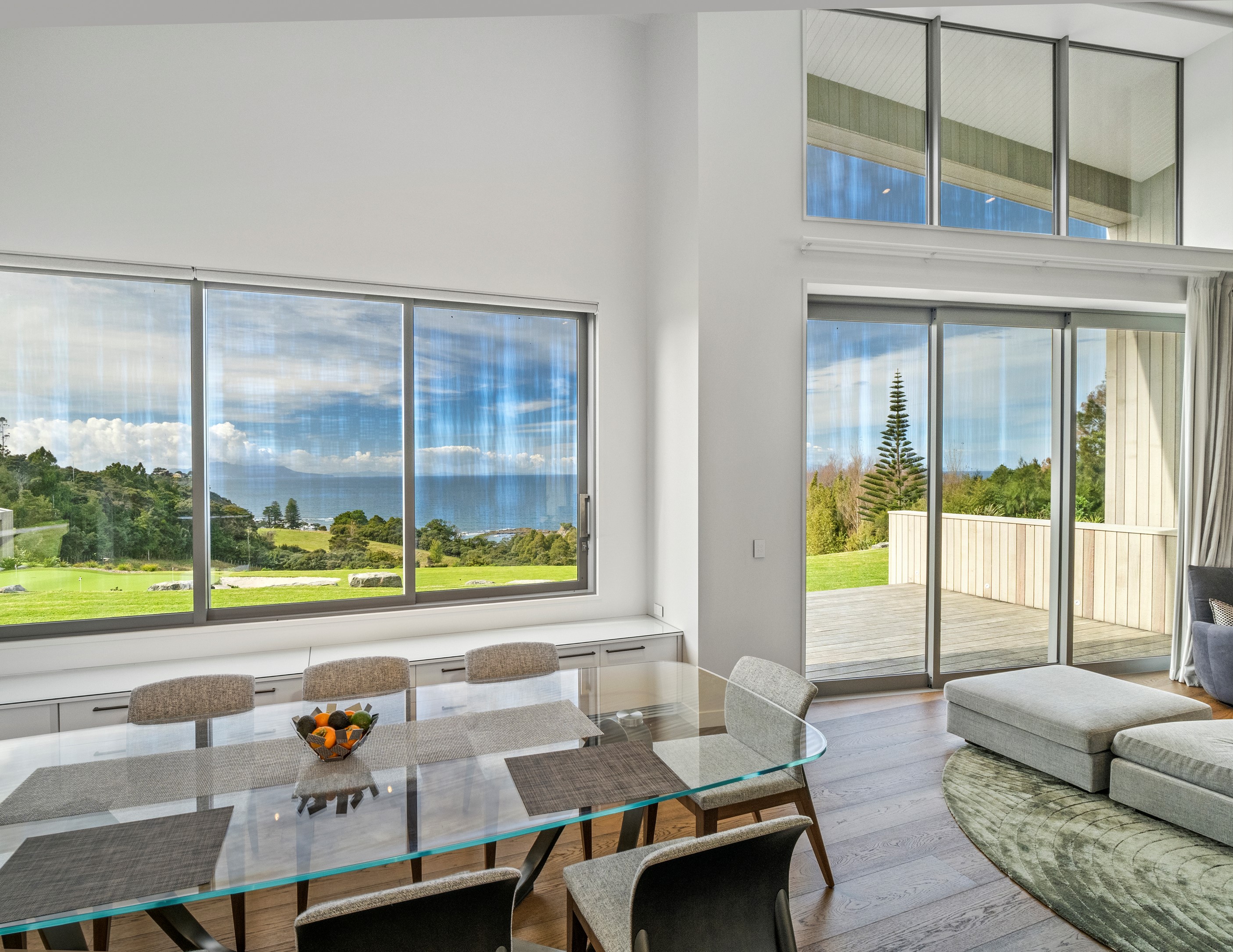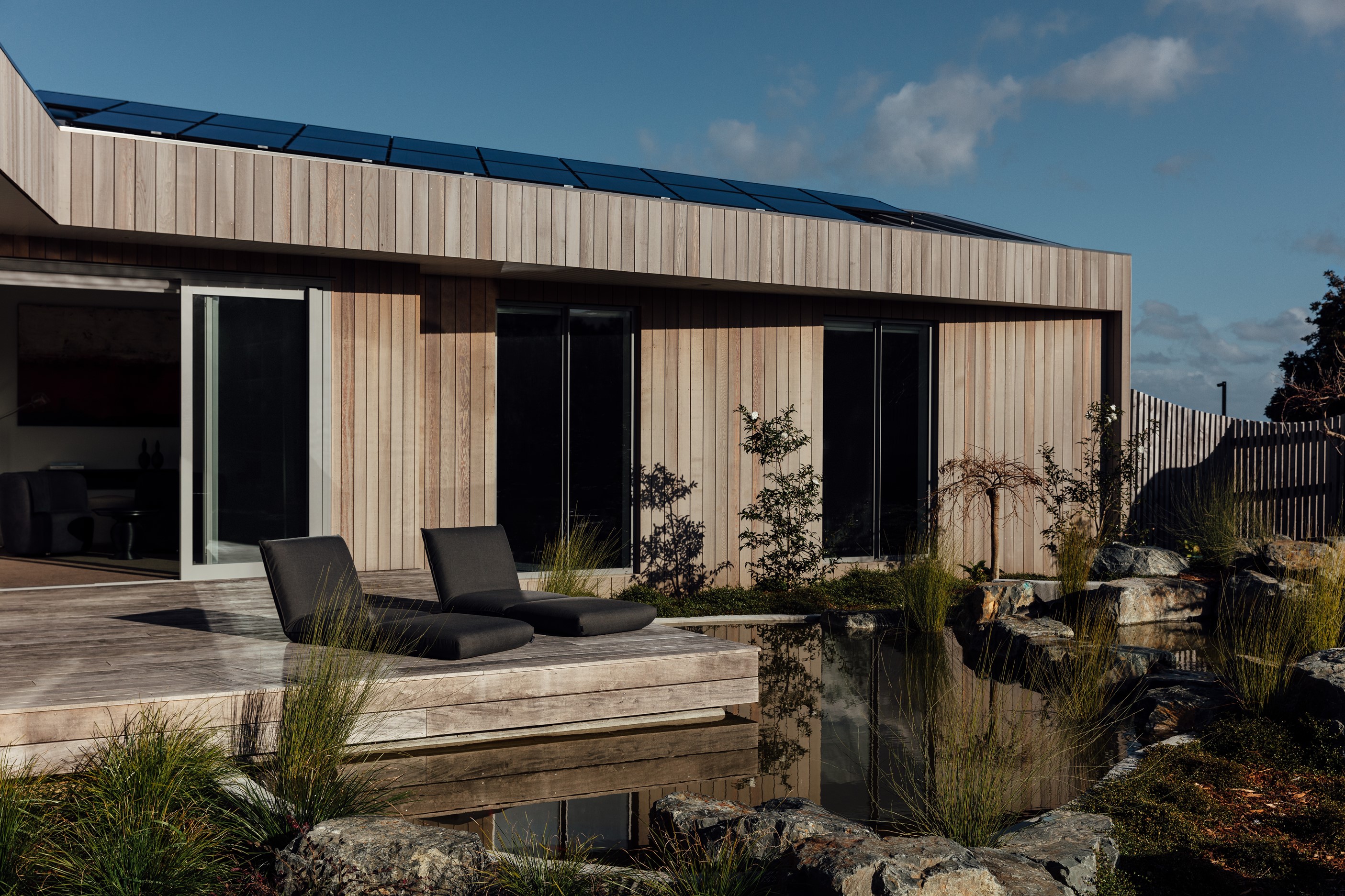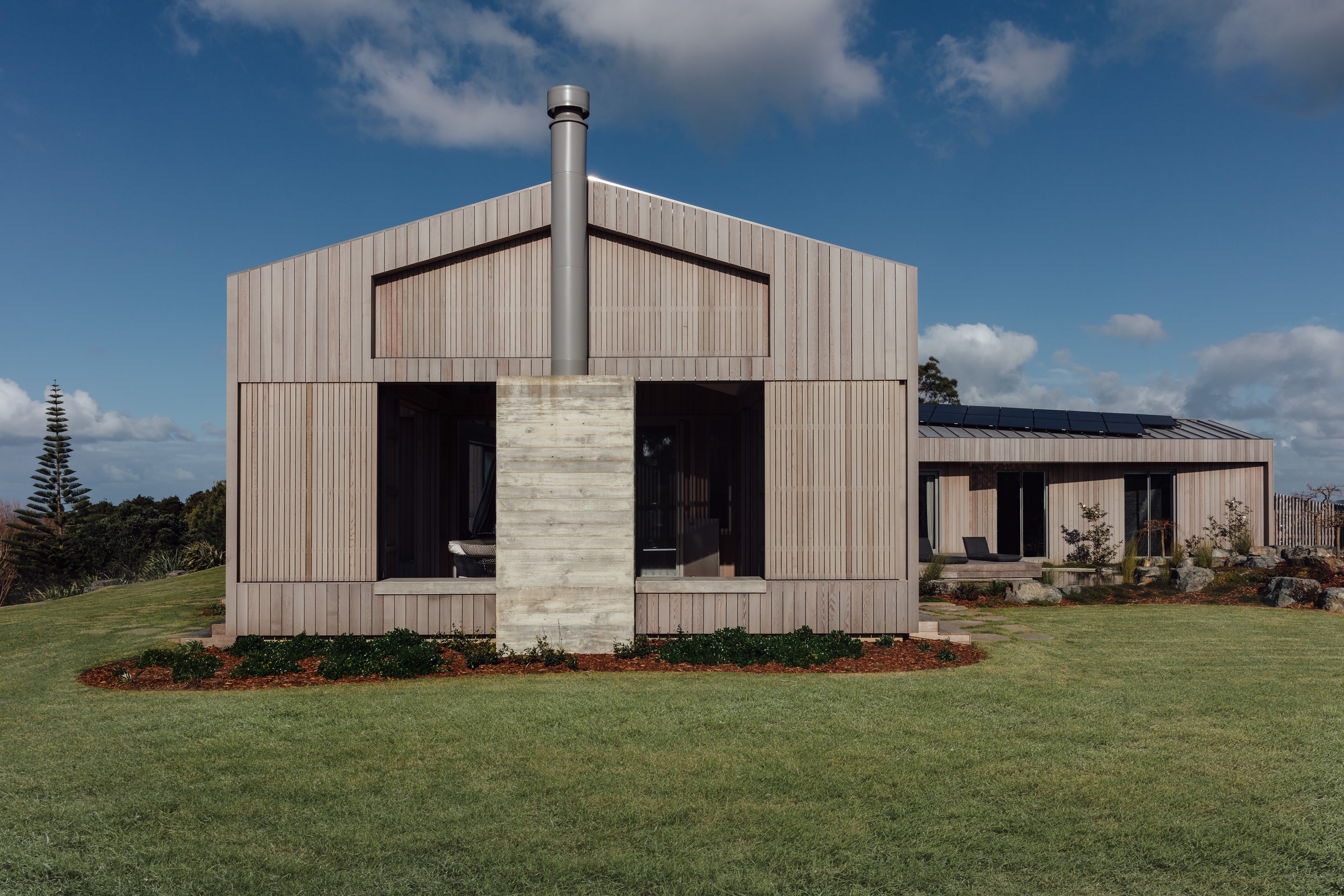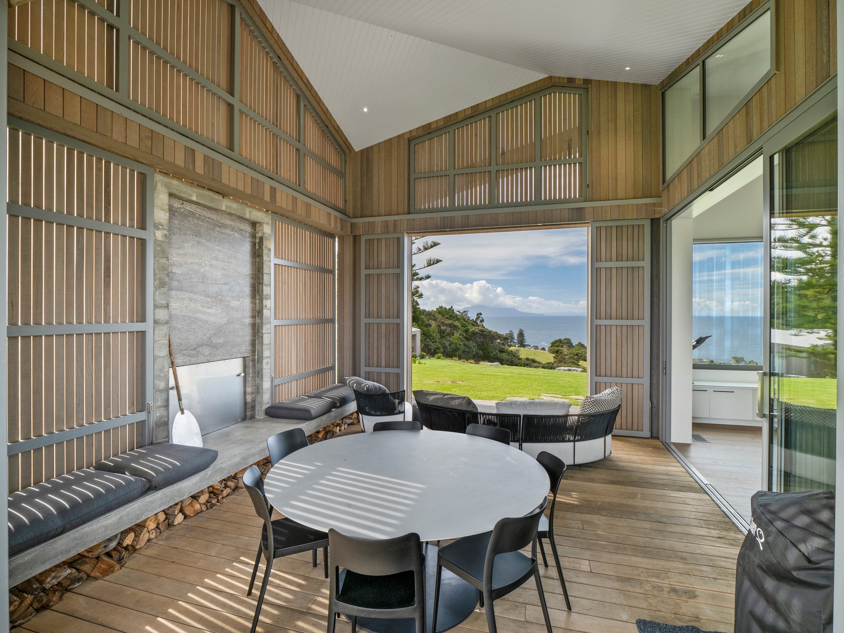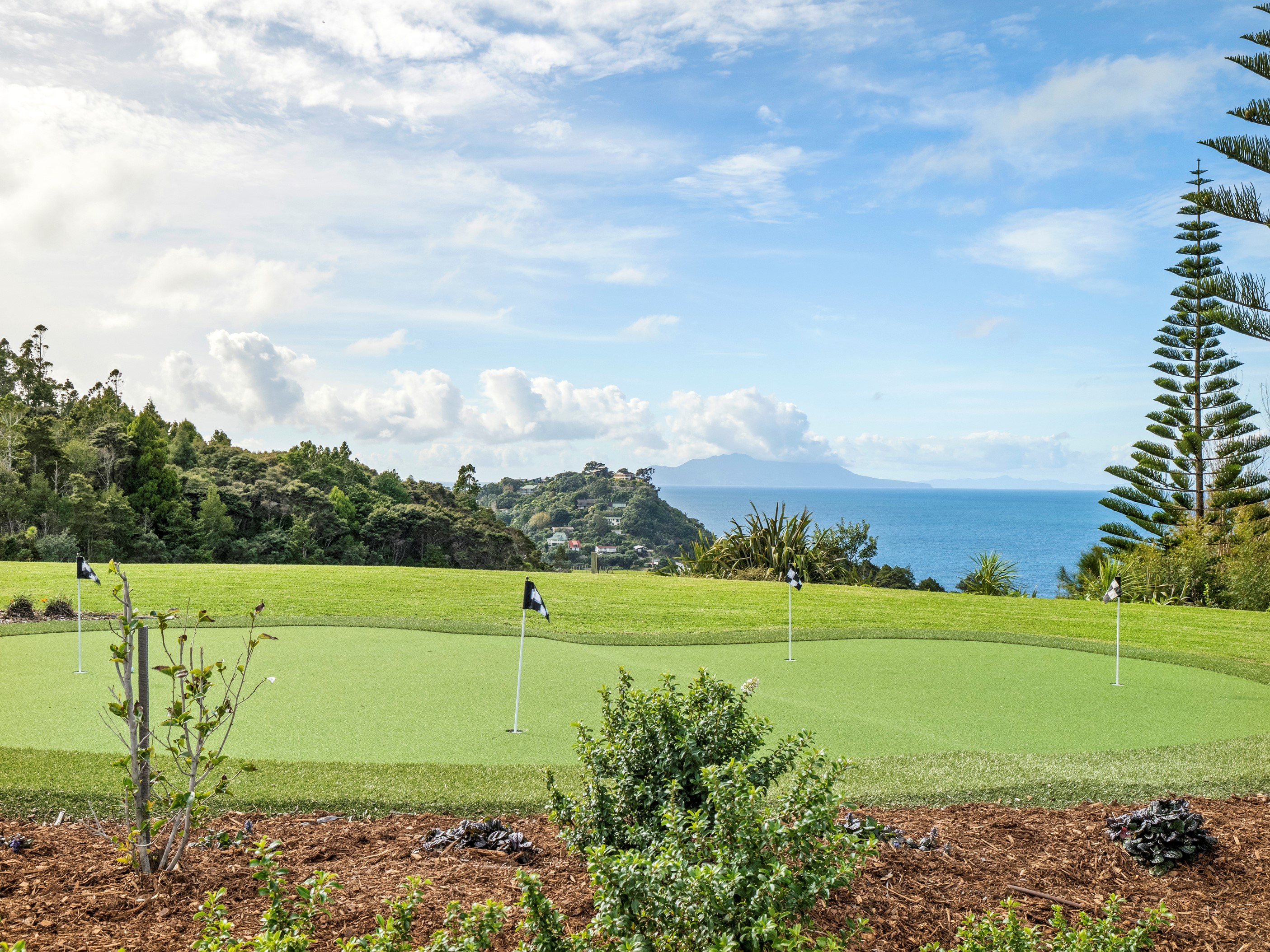 Grandstand views towards Matheson Bay and Matakana Hill make this coastal site extremely special, but also exposed. So, how do you enjoy the benefits without any compromise? You create “pockets of shelter with view shafts”, as the architect of this luxury 332sqm home, Belinda George says on her website. In her response to site, George designed outdoor rooms to the north, east and west of the four-bedroom home, allowing the owners to connect with the outdoors, no matter the time of year, no matter the weather. Vertical cedar wraps the distinct and intriguing forms of the house and also a 64sqm cottage. Pared-back linear faces are punctuated with recesses and windows that open up towards the views. Meanwhile, the spaces facing the inland part of the section are scaled back and more intimate. A Japanese-style garden in the north-west can be enjoyed from the deck and there’s a putting green on the lawn. A little further afield a village of solar panels provides energy. As you’d imagine in a build of this calibre, the fit-out is high-end, yet it remains understated and welcoming. The abiding themes here are of cleverness, coastal elegance and next-level craftsmanship.