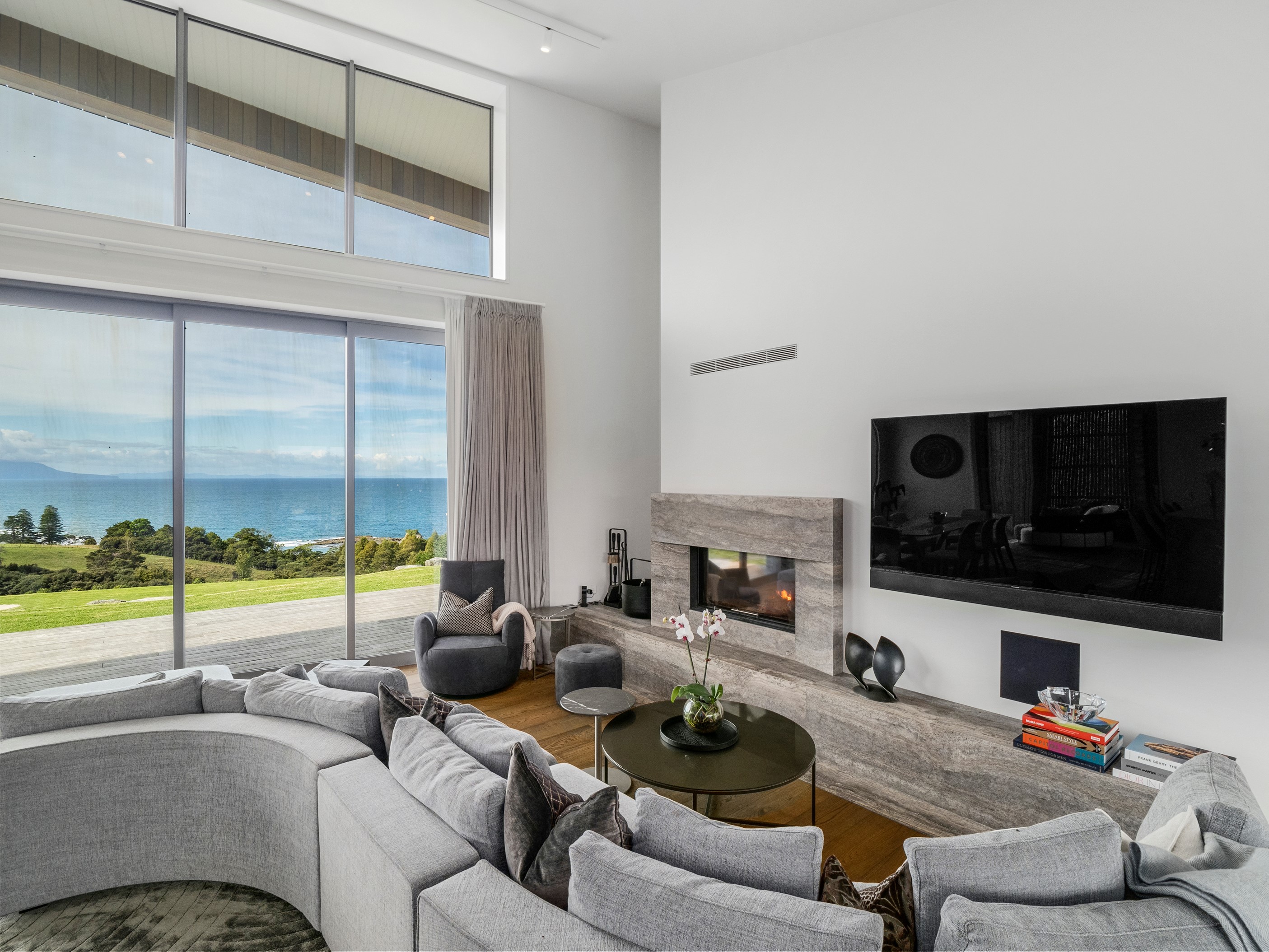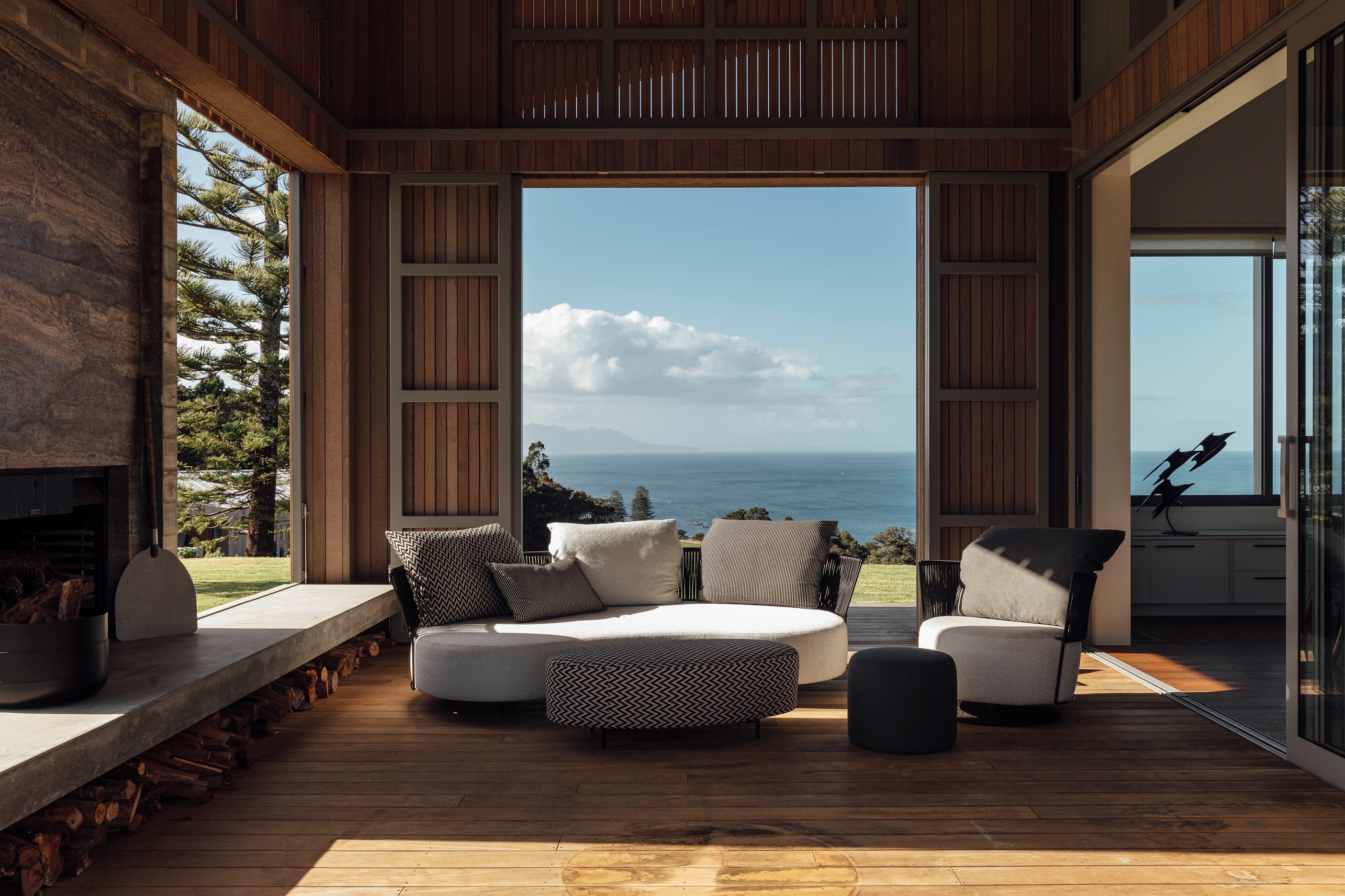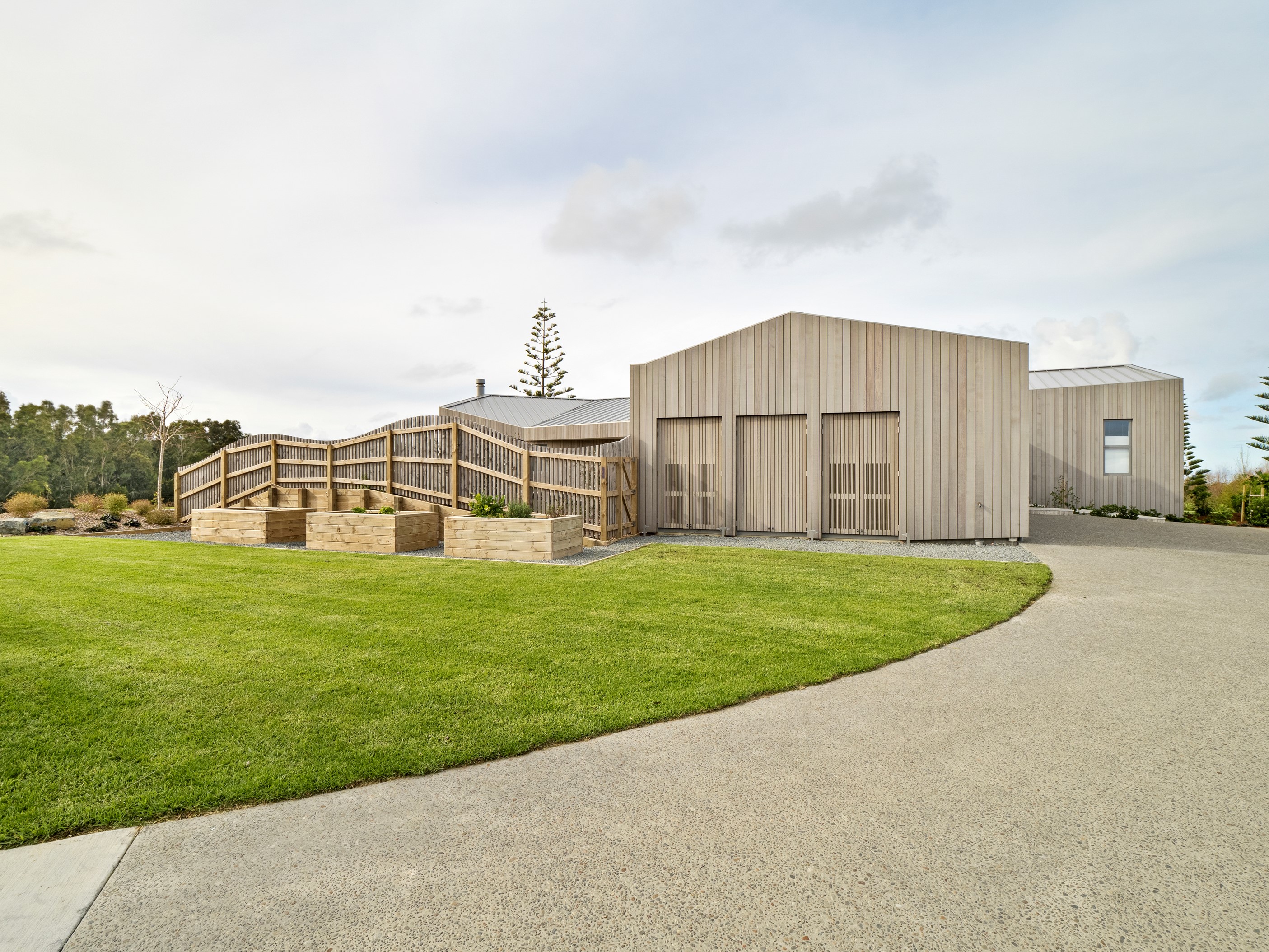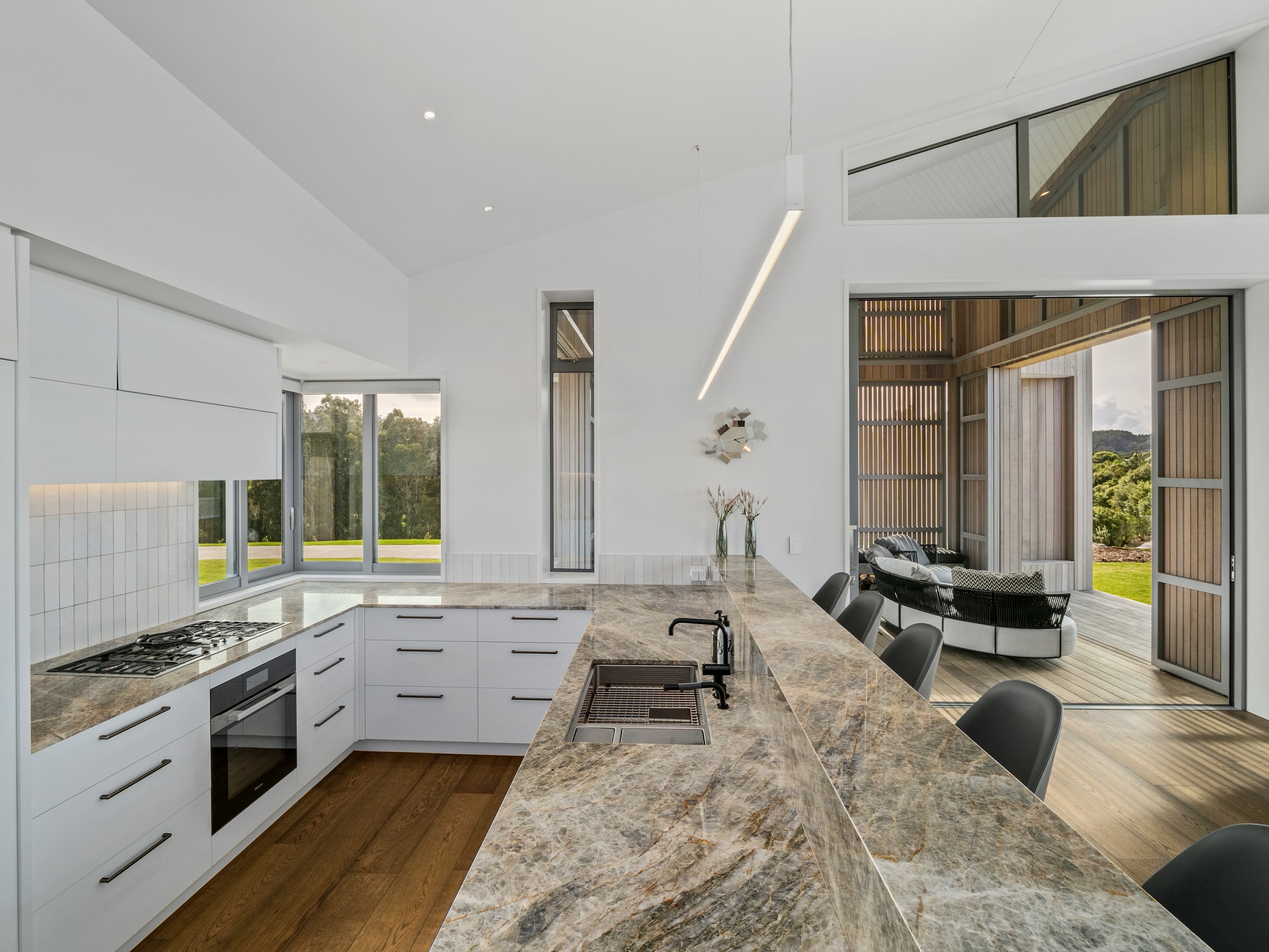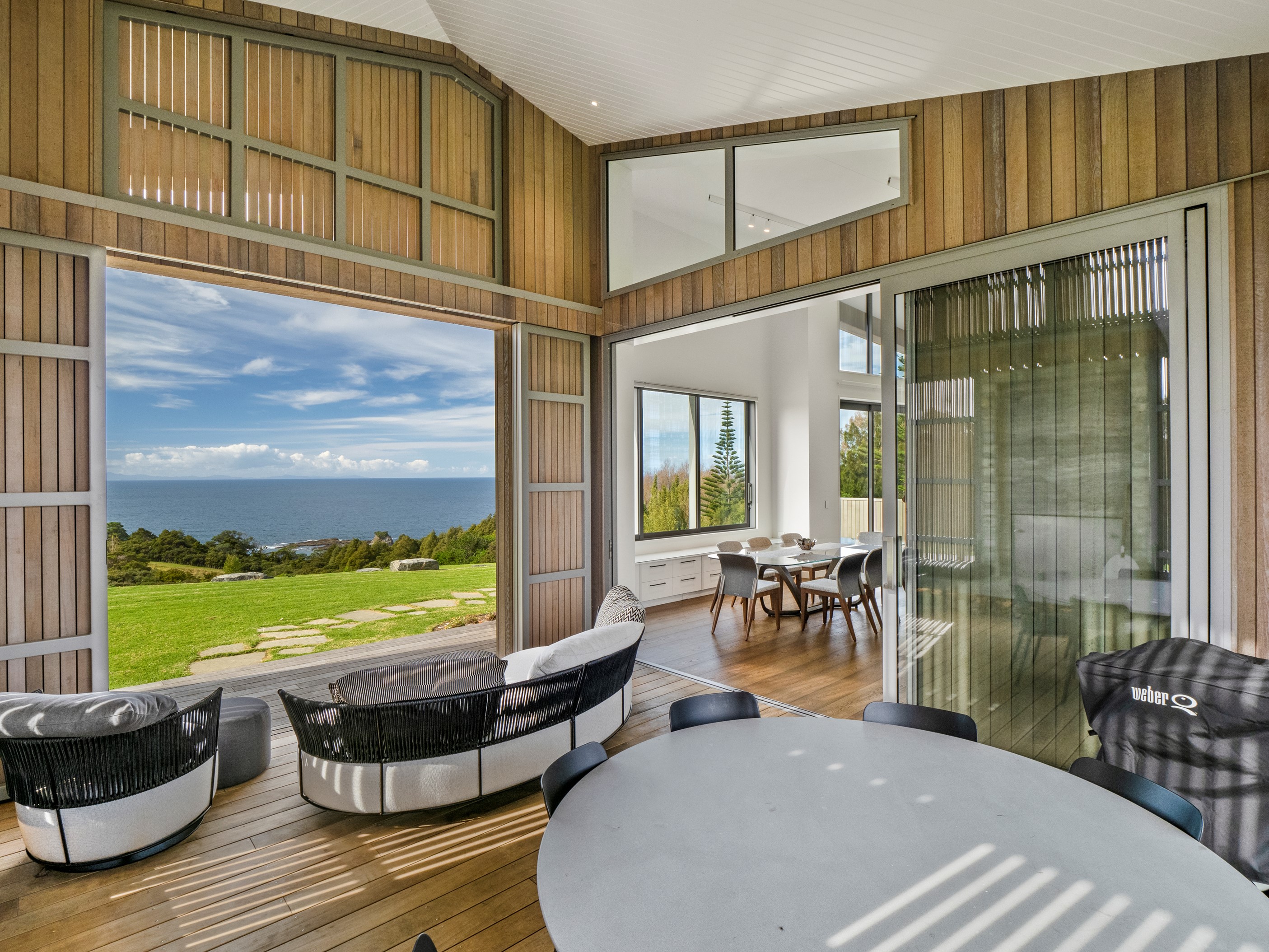 Grandstand views towards Matheson Bay and Matakana Hill make this coastal site extremely special, but also exposed. So, how do you enjoy the benefits without any compromise? You create “pockets of shelter with view shafts”, as the architect of this luxury 332sqm home, Belinda George says on her website. In her response to site, George designed outdoor rooms to the north, east and west of the four-bedroom home, allowing the owners to connect with the outdoors, no matter the time of year, no matter the weather. Vertical cedar wraps the distinct and intriguing forms of the house and also a 64sqm cottage. Pared-back linear faces are punctuated with recesses and windows that open up towards the views. Meanwhile, the spaces facing the inland part of the section are scaled back and more intimate. A Japanese-style garden in the north-west can be enjoyed from the deck and there’s a putting green on the lawn. A little further afield a village of solar panels provides energy. As you’d imagine in a build of this calibre, the fit-out is high-end, yet it remains understated and welcoming. The abiding themes here are of cleverness, coastal elegance and next-level craftsmanship.