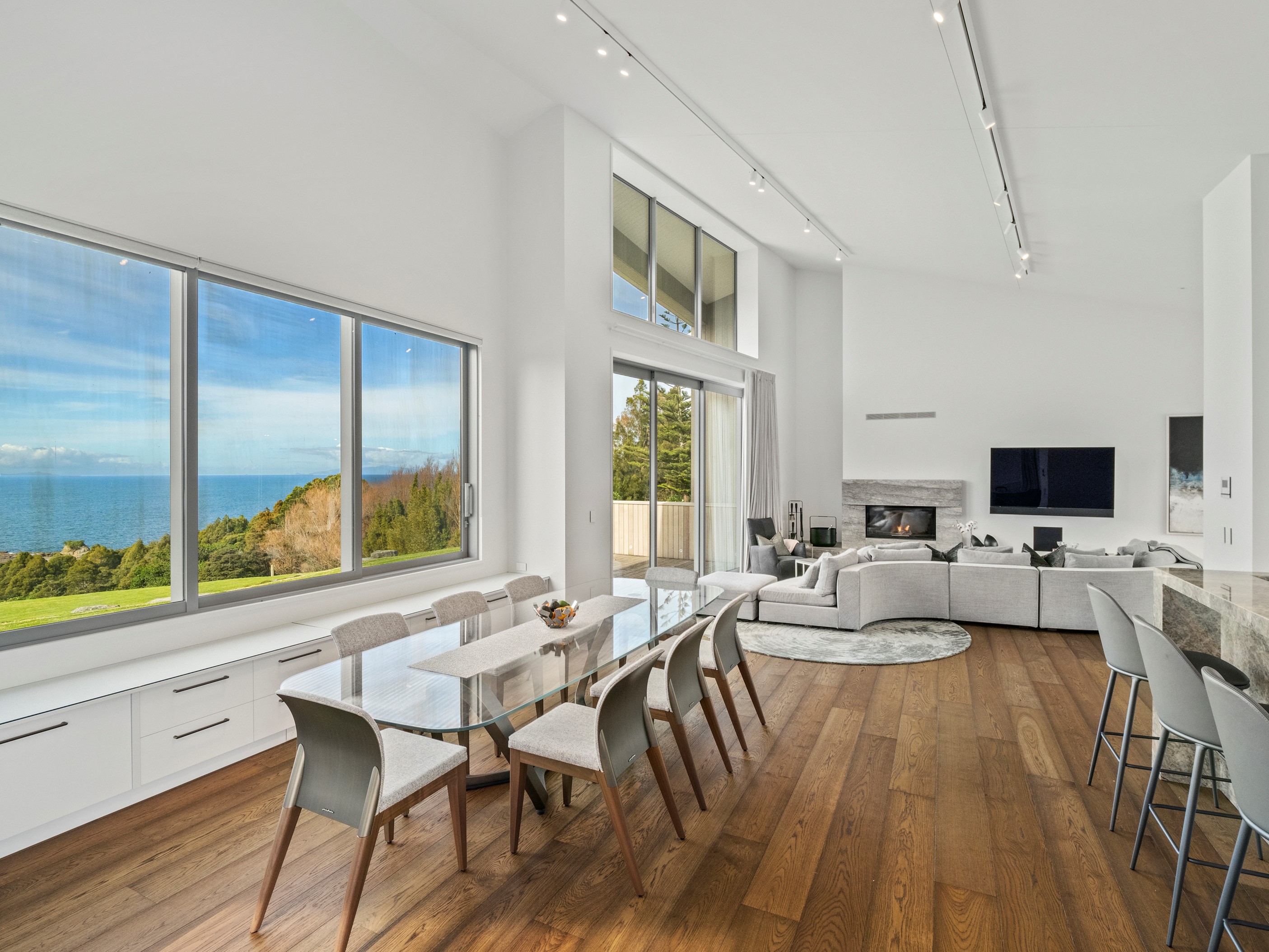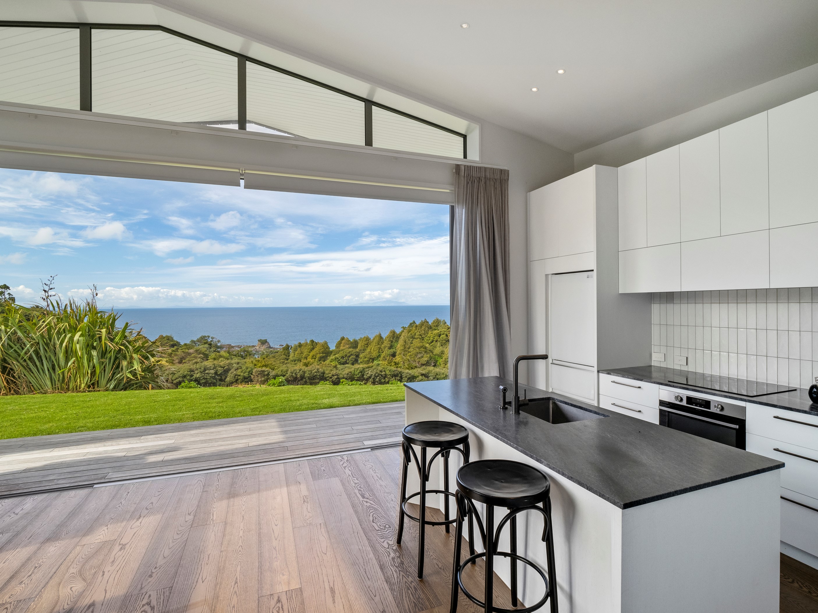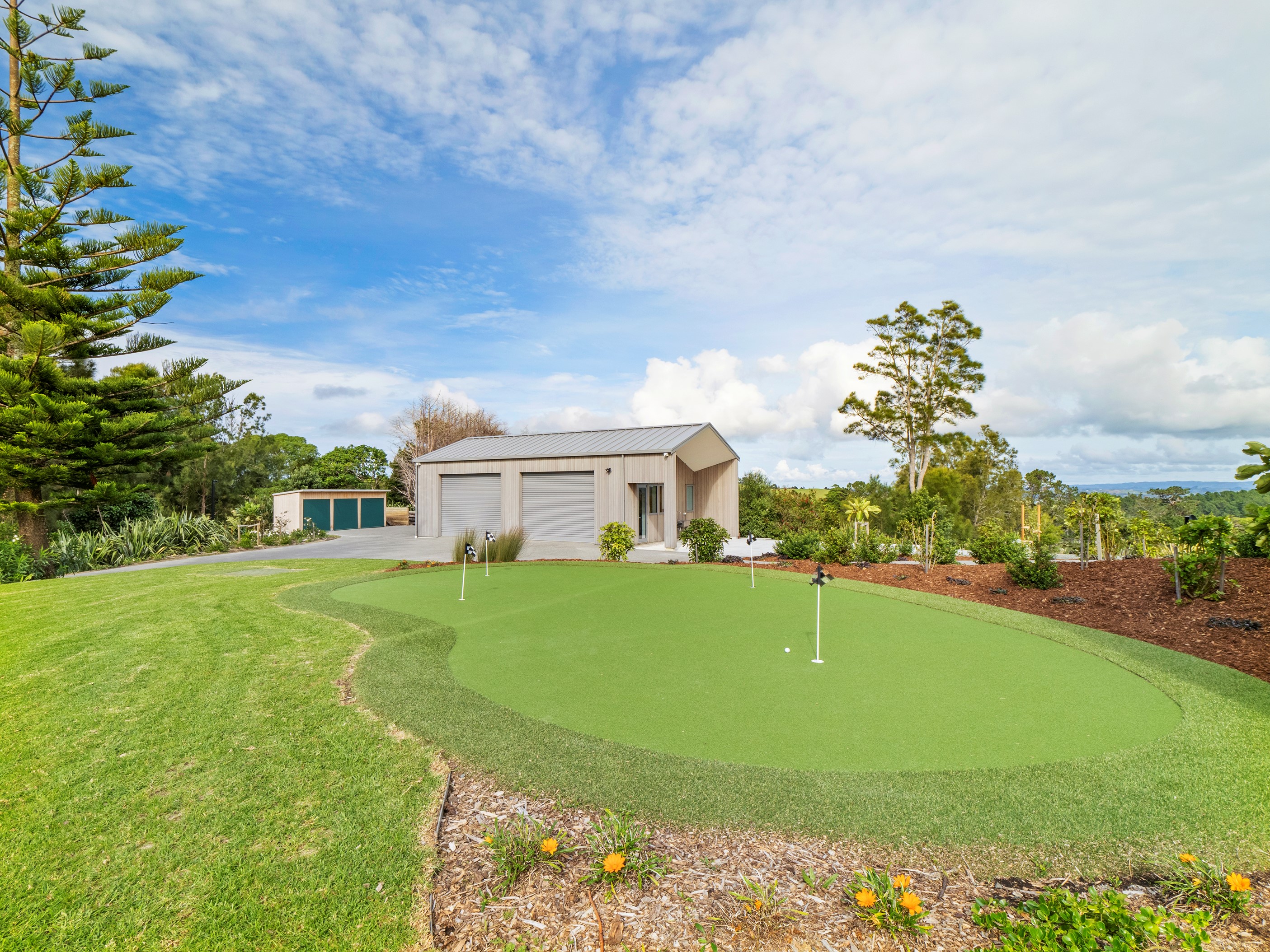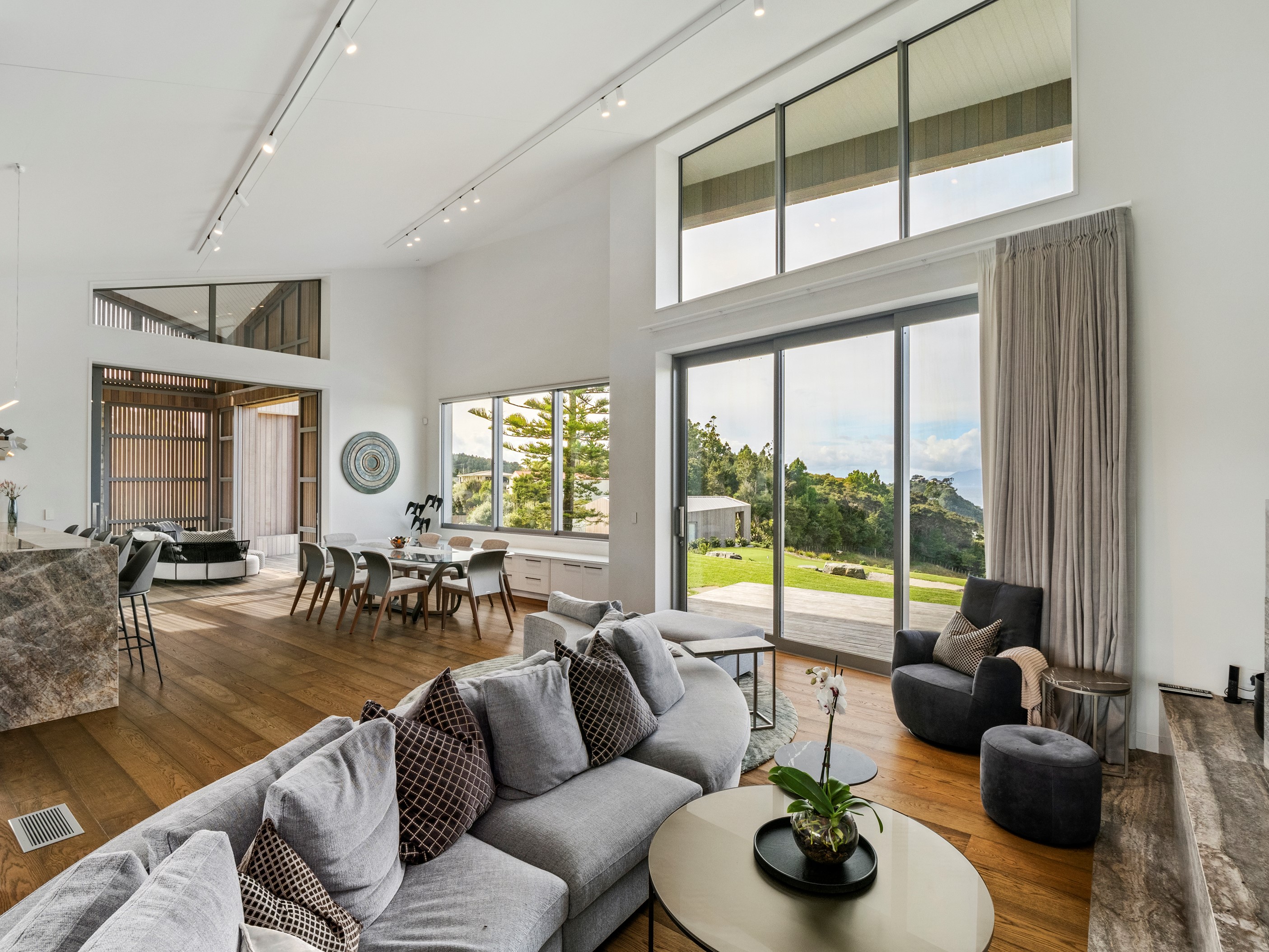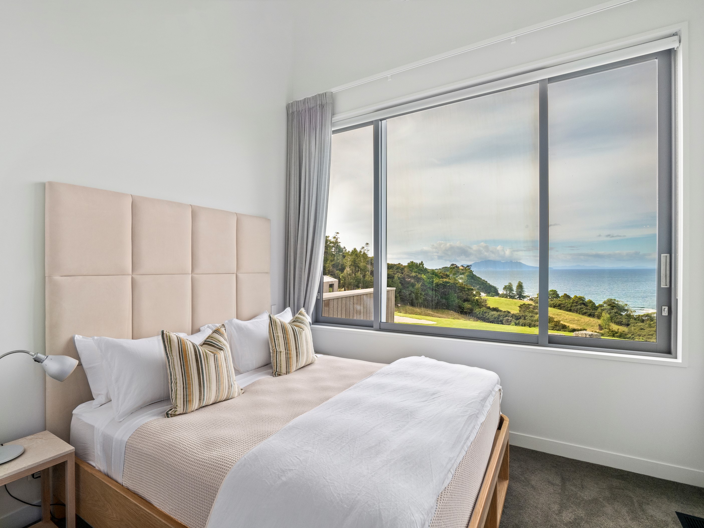Grandstand views towards Matheson Bay and Matakana Hill make this coastal site extremely special, but also exposed. So, how do you enjoy the benefits without any compromise? You create “pockets of shelter with view shafts”, as the architect of this luxury 332sqm home, Belinda George says on her website. In her response to site, George designed outdoor rooms to the north, east and west of the four-bedroom home, allowing the owners to connect with the outdoors, no matter the time of year, no matter the weather. Vertical cedar wraps the distinct and intriguing forms of the house and also a 64sqm cottage. Pared-back linear faces are punctuated with recesses and windows that open up towards the views. Meanwhile, the spaces facing the inland part of the section are scaled back and more intimate. A Japanese-style garden in the north-west can be enjoyed from the deck and there’s a putting green on the lawn. A little further afield a village of solar panels provides energy. As you’d imagine in a build of this calibre, the fit-out is high-end, yet it remains understated and welcoming. The abiding themes here are of cleverness, coastal elegance and next-level craftsmanship.
