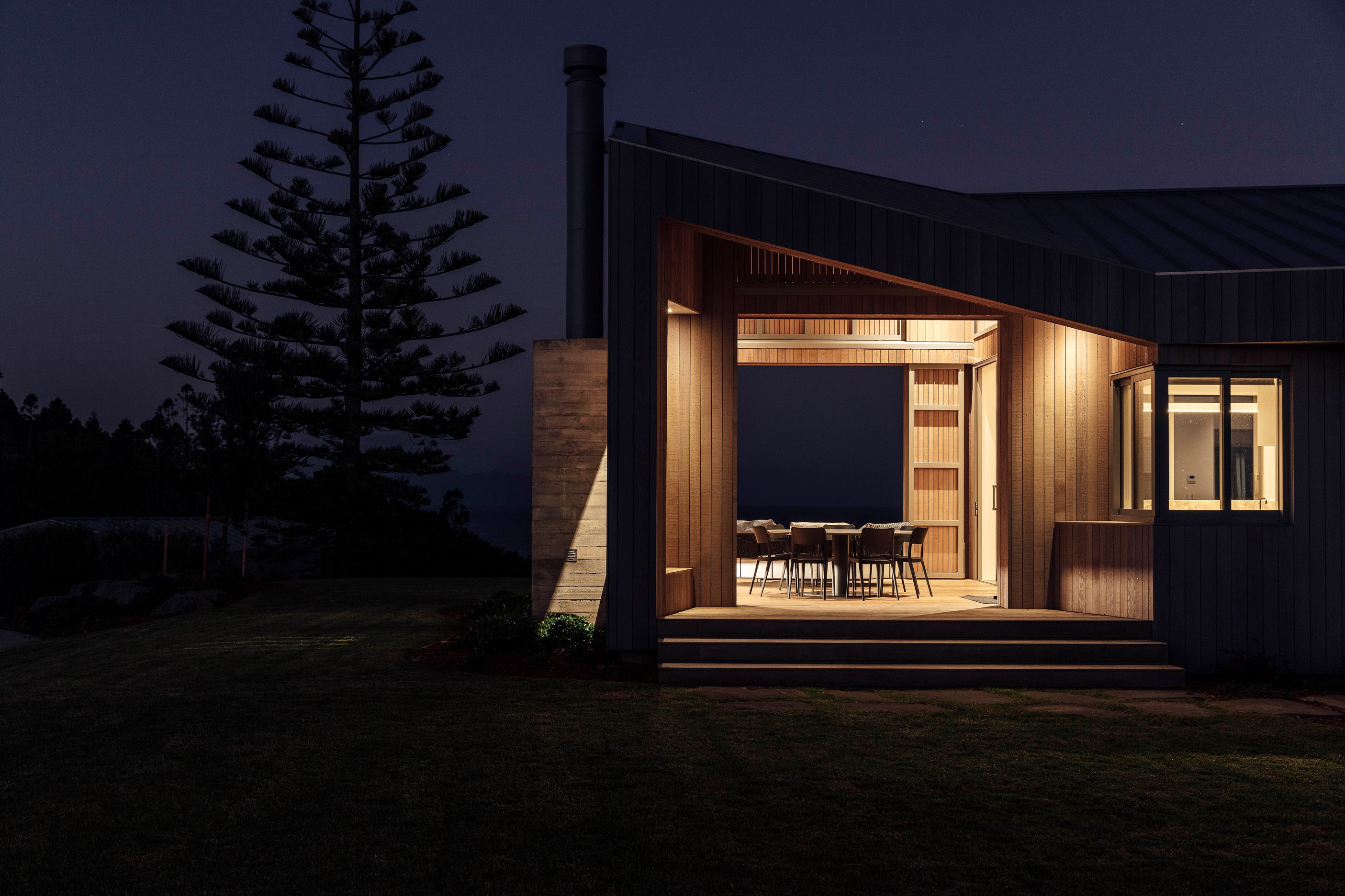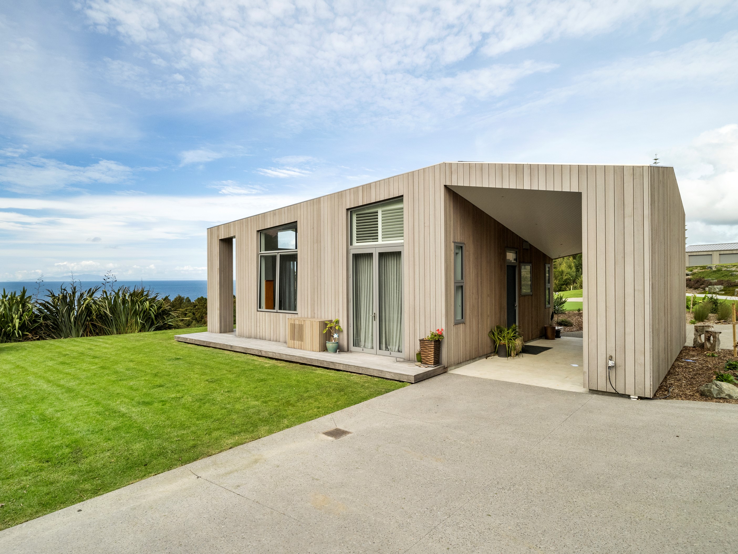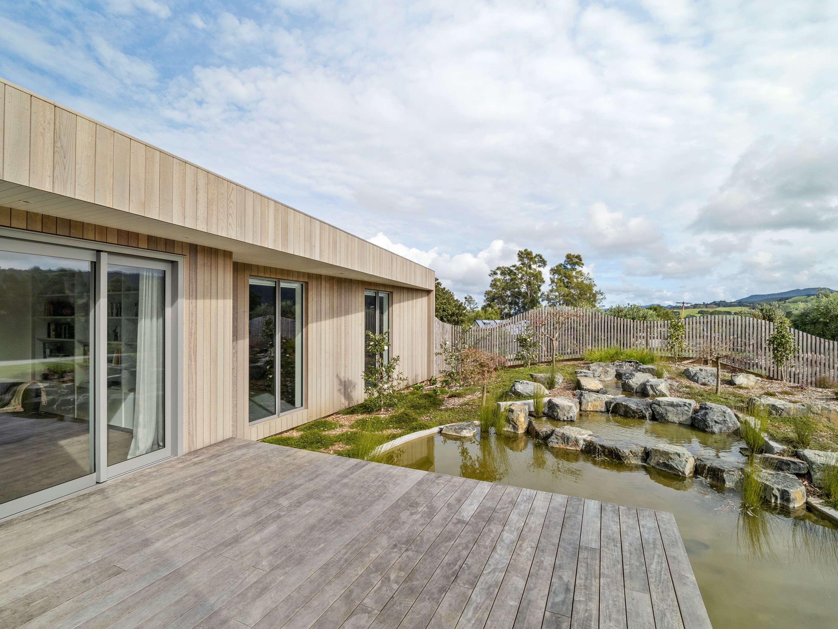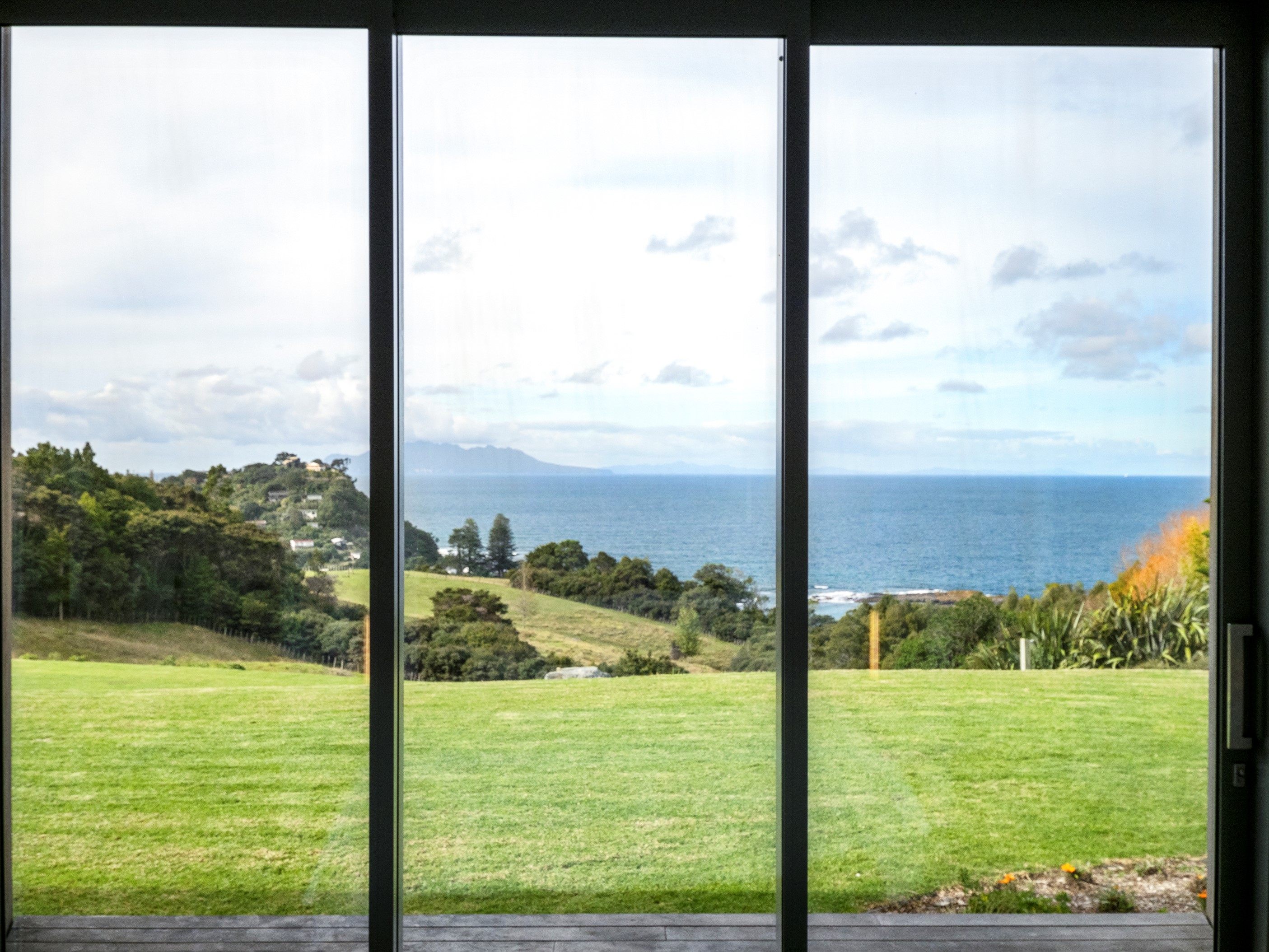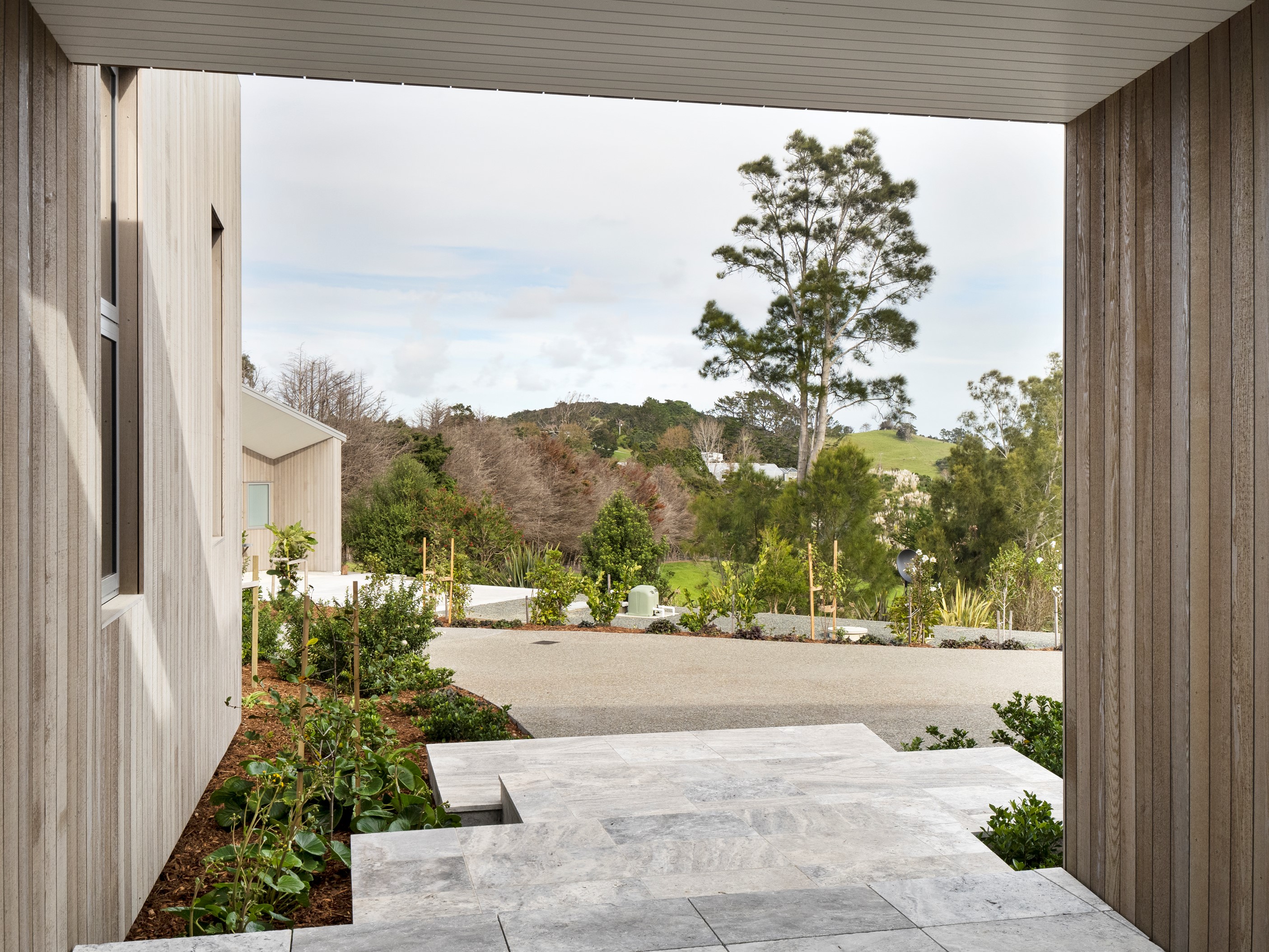 Grandstand views towards Matheson Bay and Matakana Hill make this coastal site extremely special, but also exposed. So, how do you enjoy the benefits without any compromise? You create “pockets of shelter with view shafts”, as the architect of this luxury 332sqm home, Belinda George says on her website. In her response to site, George designed outdoor rooms to the north, east and west of the four-bedroom home, allowing the owners to connect with the outdoors, no matter the time of year, no matter the weather. Vertical cedar wraps the distinct and intriguing forms of the house and also a 64sqm cottage. Pared-back linear faces are punctuated with recesses and windows that open up towards the views. Meanwhile, the spaces facing the inland part of the section are scaled back and more intimate. A Japanese-style garden in the north-west can be enjoyed from the deck and there’s a putting green on the lawn. A little further afield a village of solar panels provides energy. As you’d imagine in a build of this calibre, the fit-out is high-end, yet it remains understated and welcoming. The abiding themes here are of cleverness, coastal elegance and next-level craftsmanship.