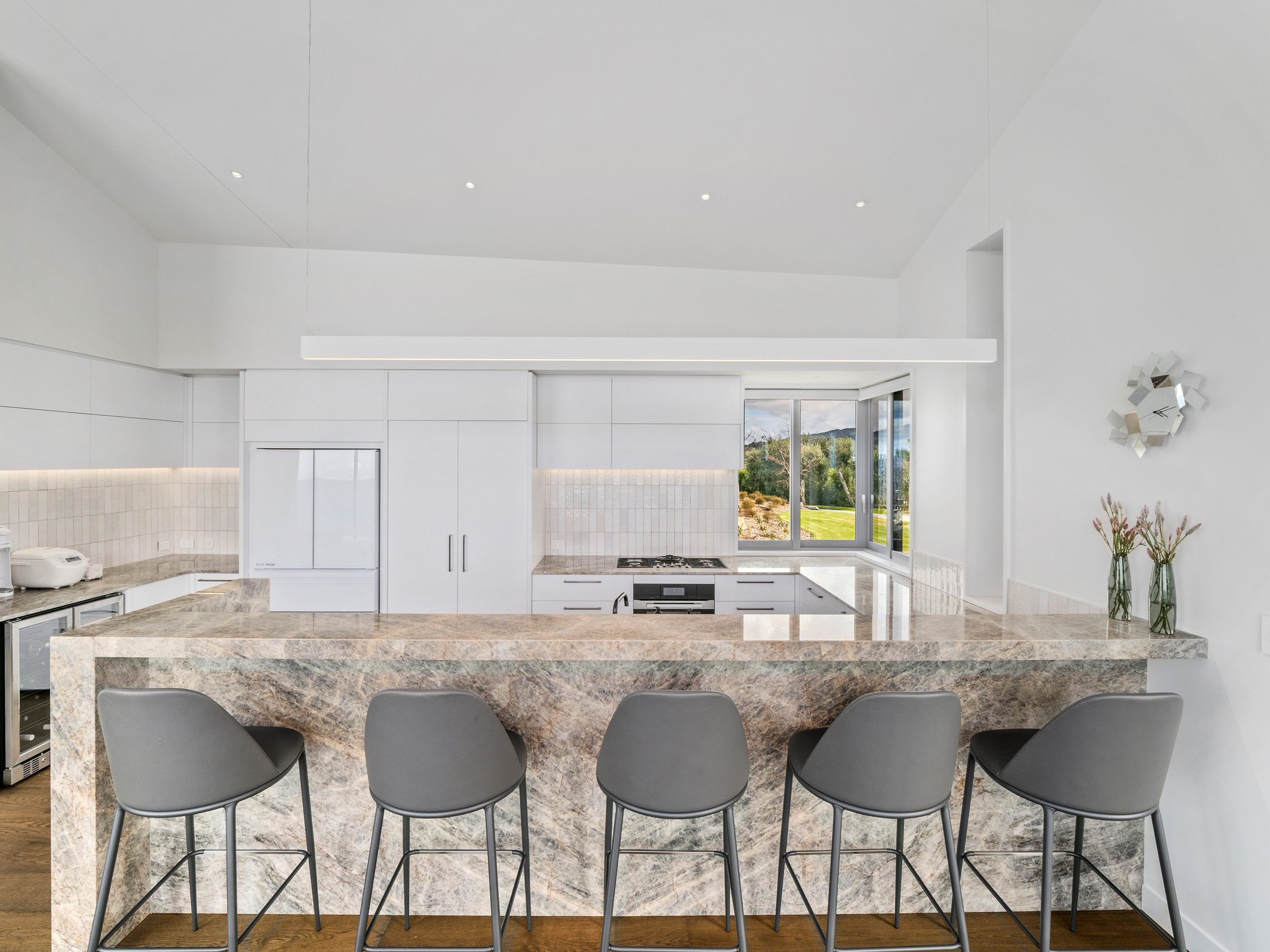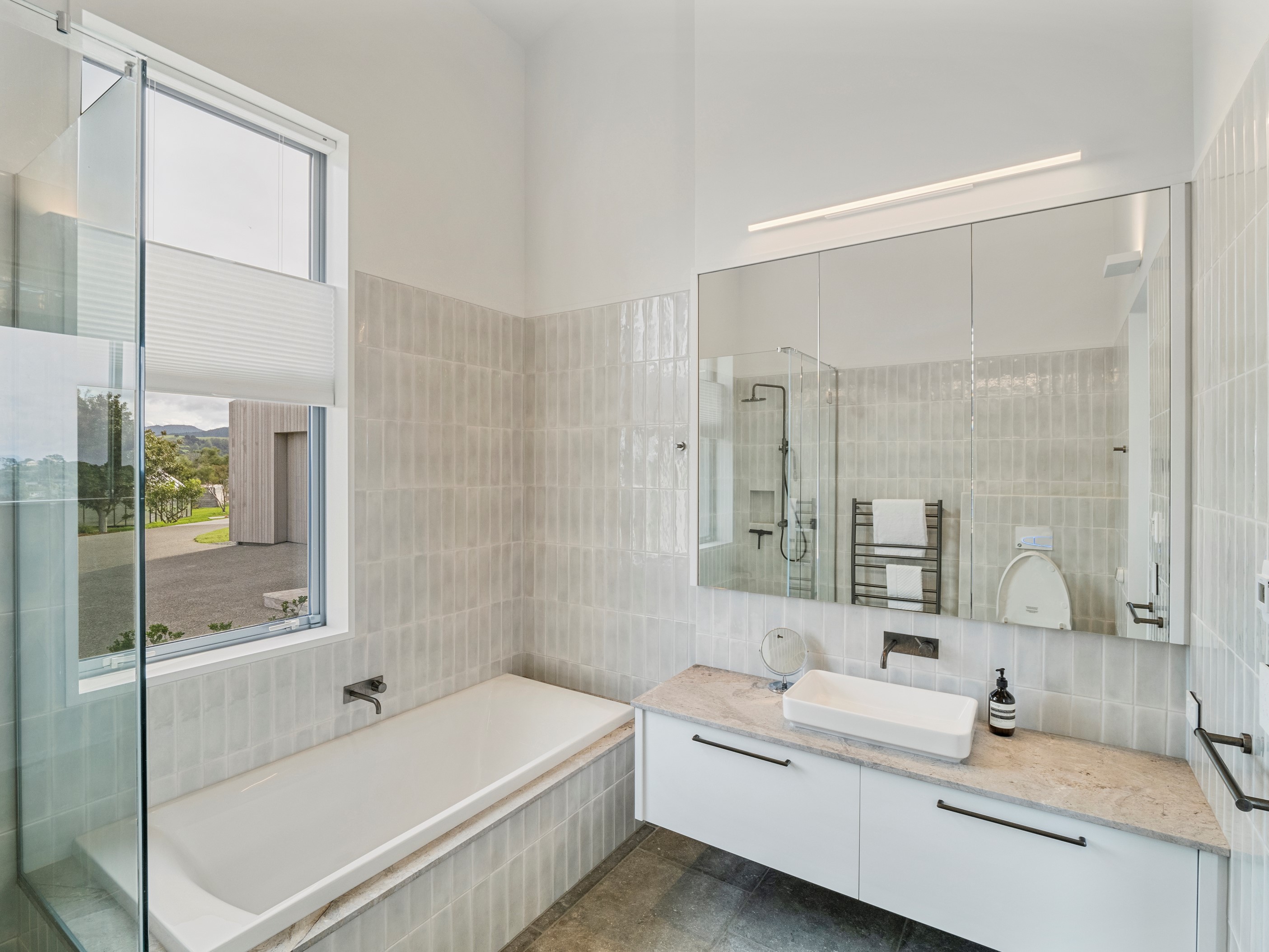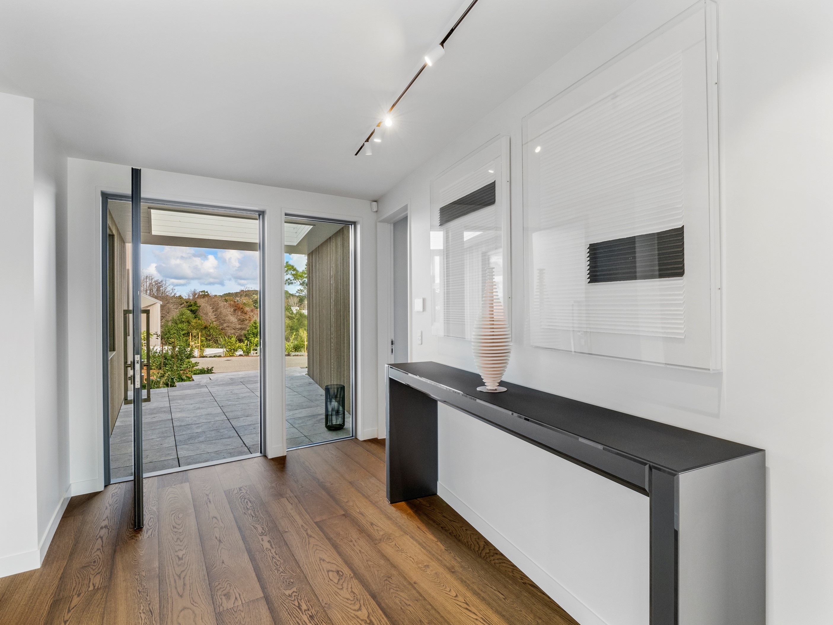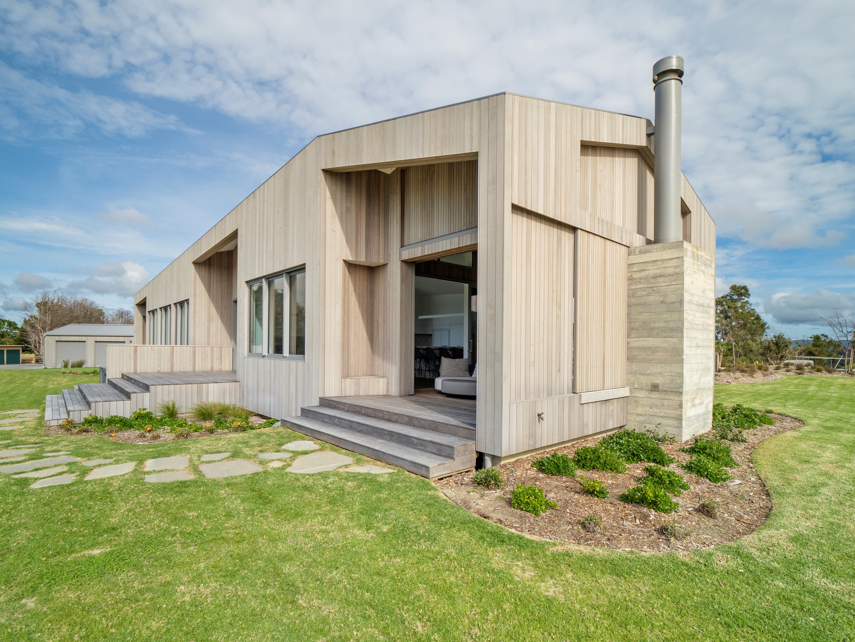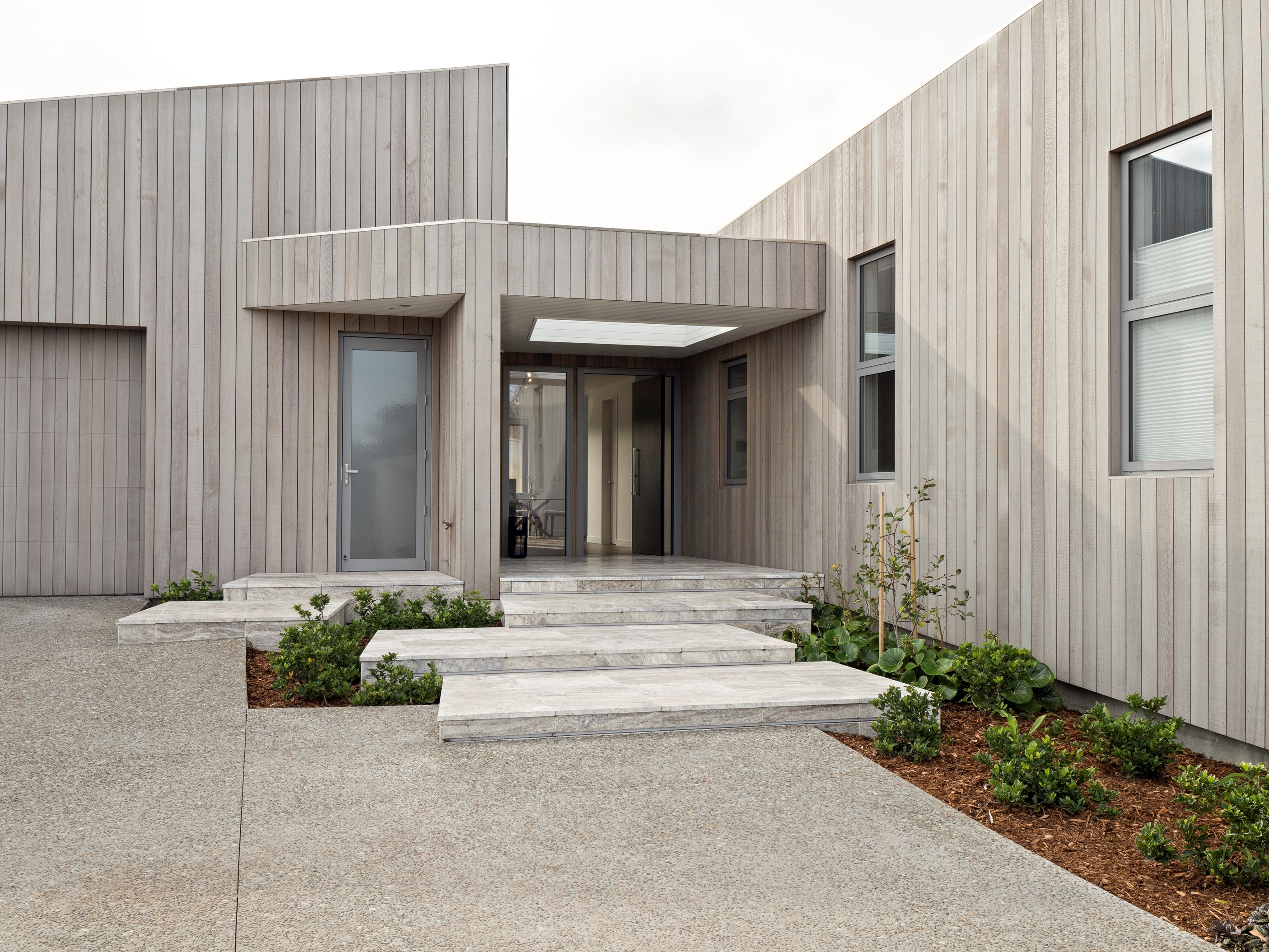 Grandstand views towards Matheson Bay and Matakana Hill make this coastal site extremely special, but also exposed. So, how do you enjoy the benefits without any compromise? You create “pockets of shelter with view shafts”, as the architect of this luxury 332sqm home, Belinda George says on her website. In her response to site, George designed outdoor rooms to the north, east and west of the four-bedroom home, allowing the owners to connect with the outdoors, no matter the time of year, no matter the weather. Vertical cedar wraps the distinct and intriguing forms of the house and also a 64sqm cottage. Pared-back linear faces are punctuated with recesses and windows that open up towards the views. Meanwhile, the spaces facing the inland part of the section are scaled back and more intimate. A Japanese-style garden in the north-west can be enjoyed from the deck and there’s a putting green on the lawn. A little further afield a village of solar panels provides energy. As you’d imagine in a build of this calibre, the fit-out is high-end, yet it remains understated and welcoming. The abiding themes here are of cleverness, coastal elegance and next-level craftsmanship.