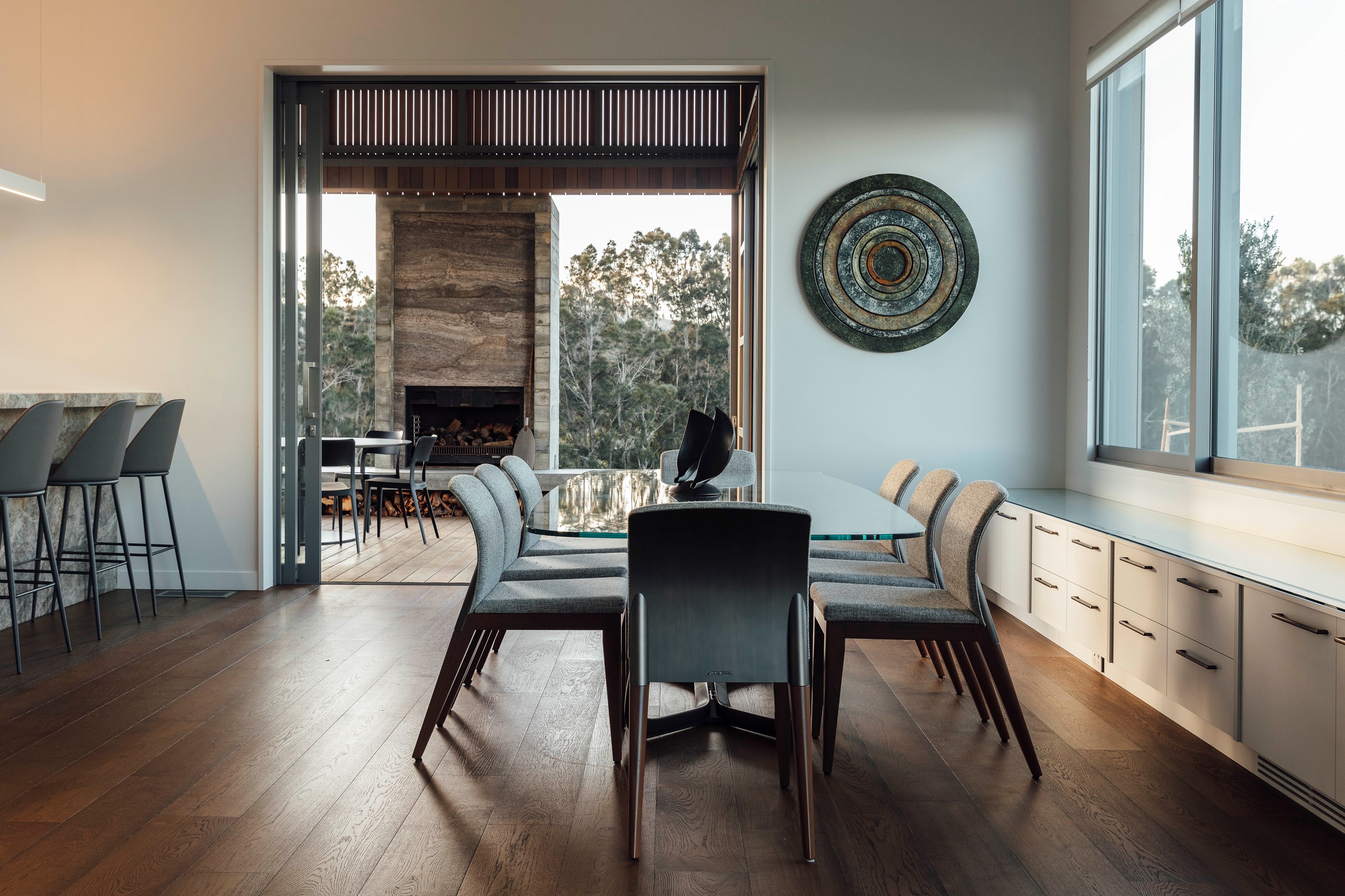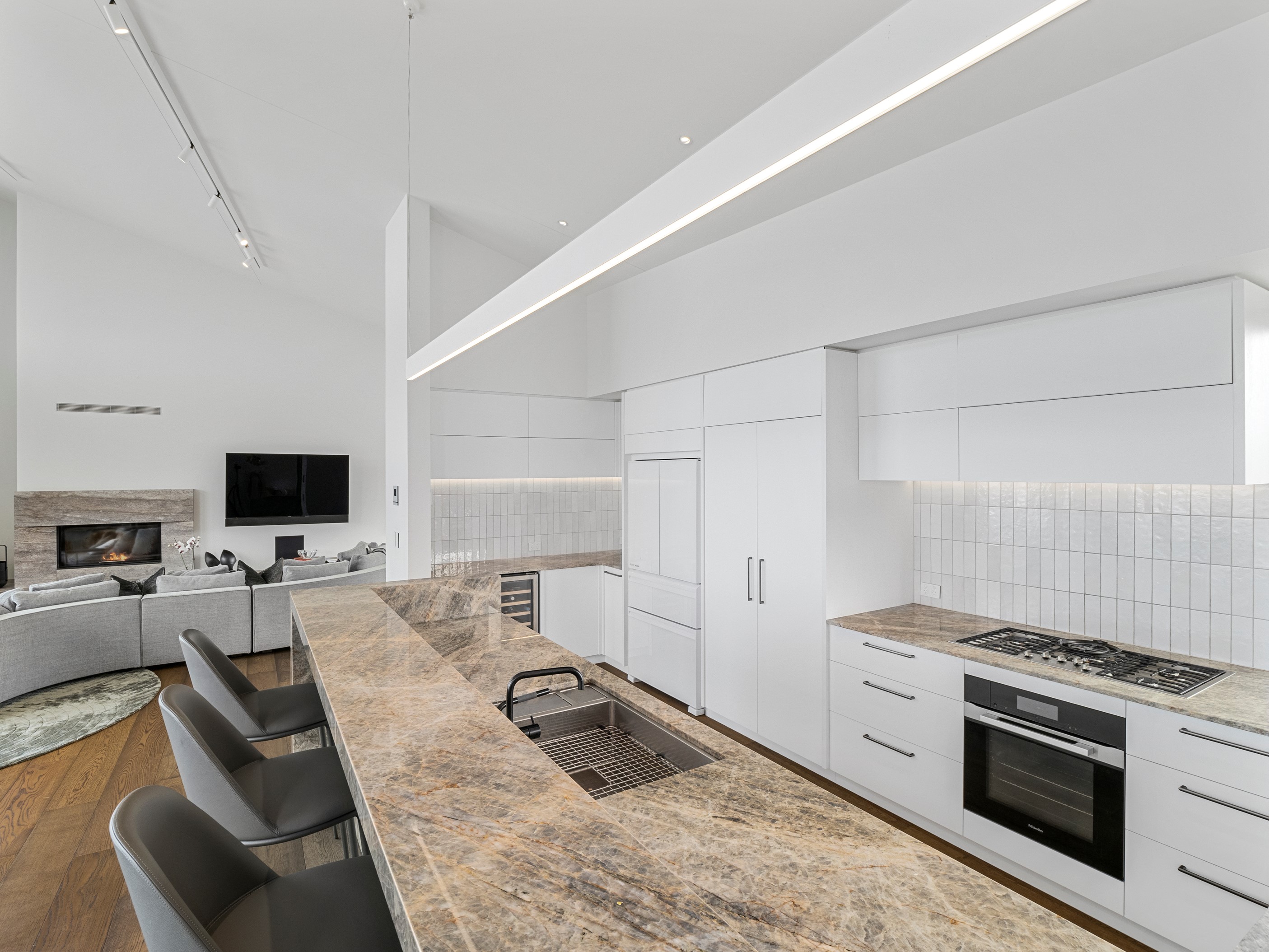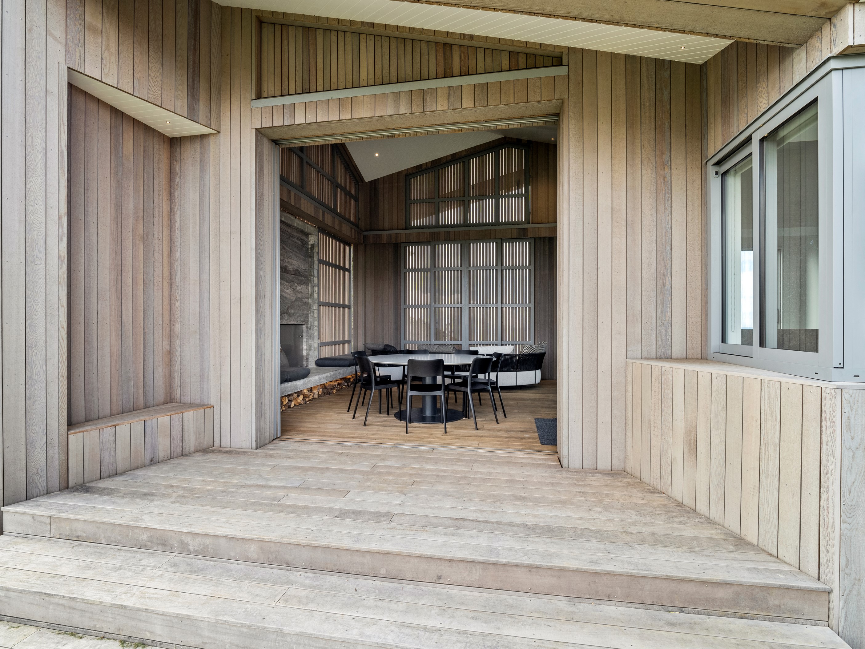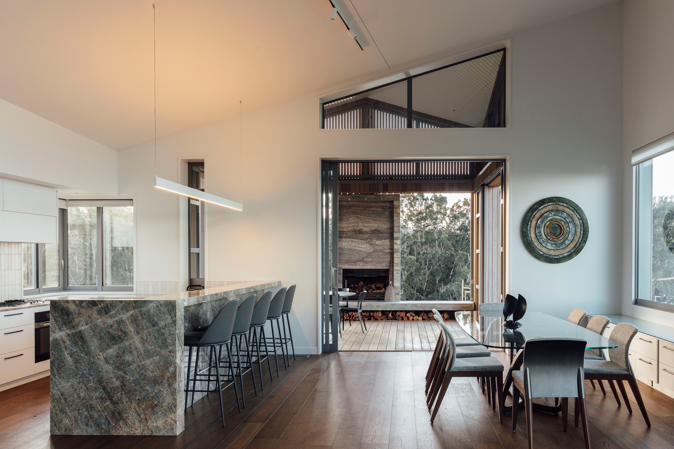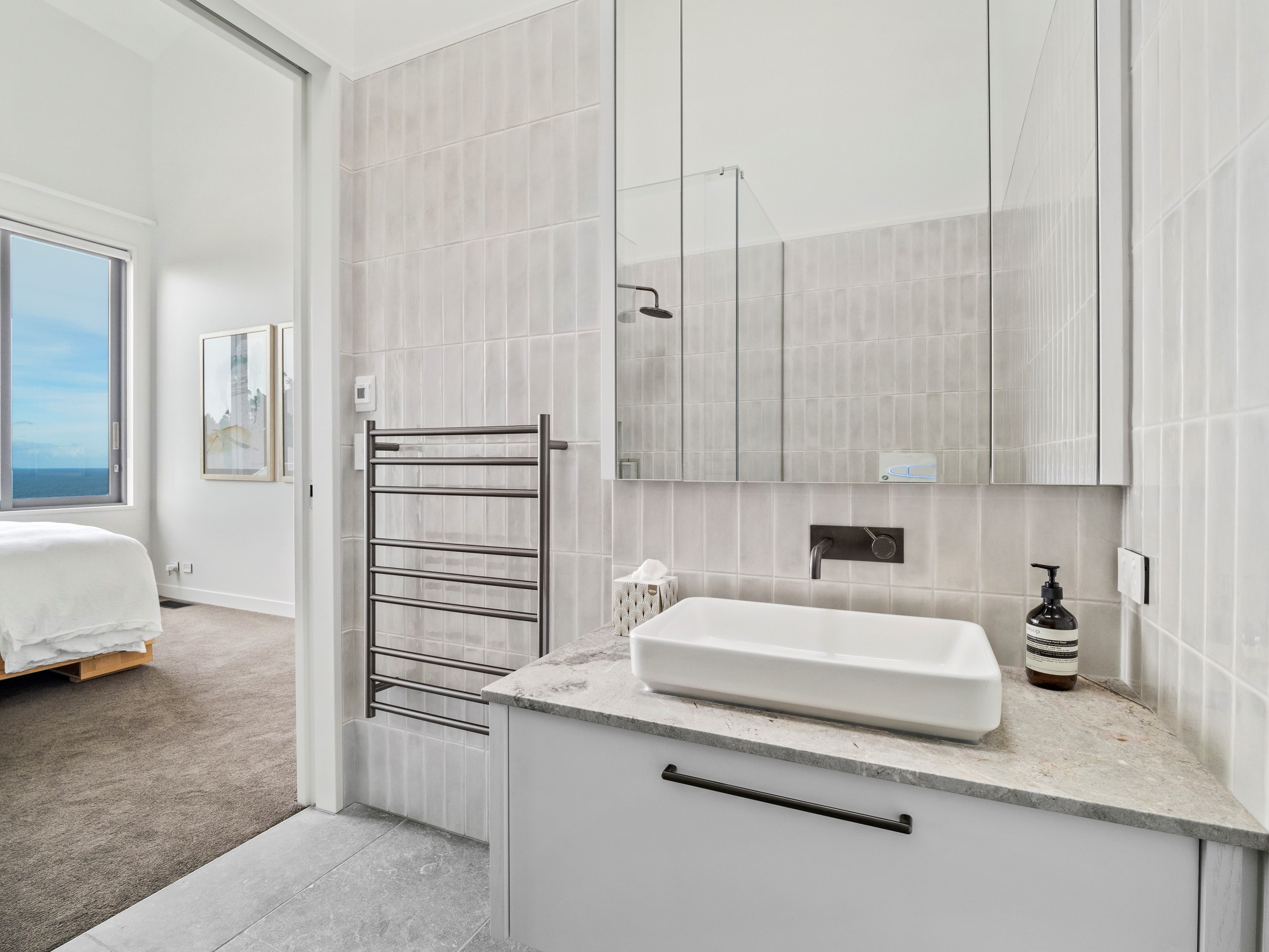 Grandstand views towards Matheson Bay and Matakana Hill make this coastal site extremely special, but also exposed. So, how do you enjoy the benefits without any compromise? You create “pockets of shelter with view shafts”, as the architect of this luxury 332sqm home, Belinda George says on her website. In her response to site, George designed outdoor rooms to the north, east and west of the four-bedroom home, allowing the owners to connect with the outdoors, no matter the time of year, no matter the weather. Vertical cedar wraps the distinct and intriguing forms of the house and also a 64sqm cottage. Pared-back linear faces are punctuated with recesses and windows that open up towards the views. Meanwhile, the spaces facing the inland part of the section are scaled back and more intimate. A Japanese-style garden in the north-west can be enjoyed from the deck and there’s a putting green on the lawn. A little further afield a village of solar panels provides energy. As you’d imagine in a build of this calibre, the fit-out is high-end, yet it remains understated and welcoming. The abiding themes here are of cleverness, coastal elegance and next-level craftsmanship.