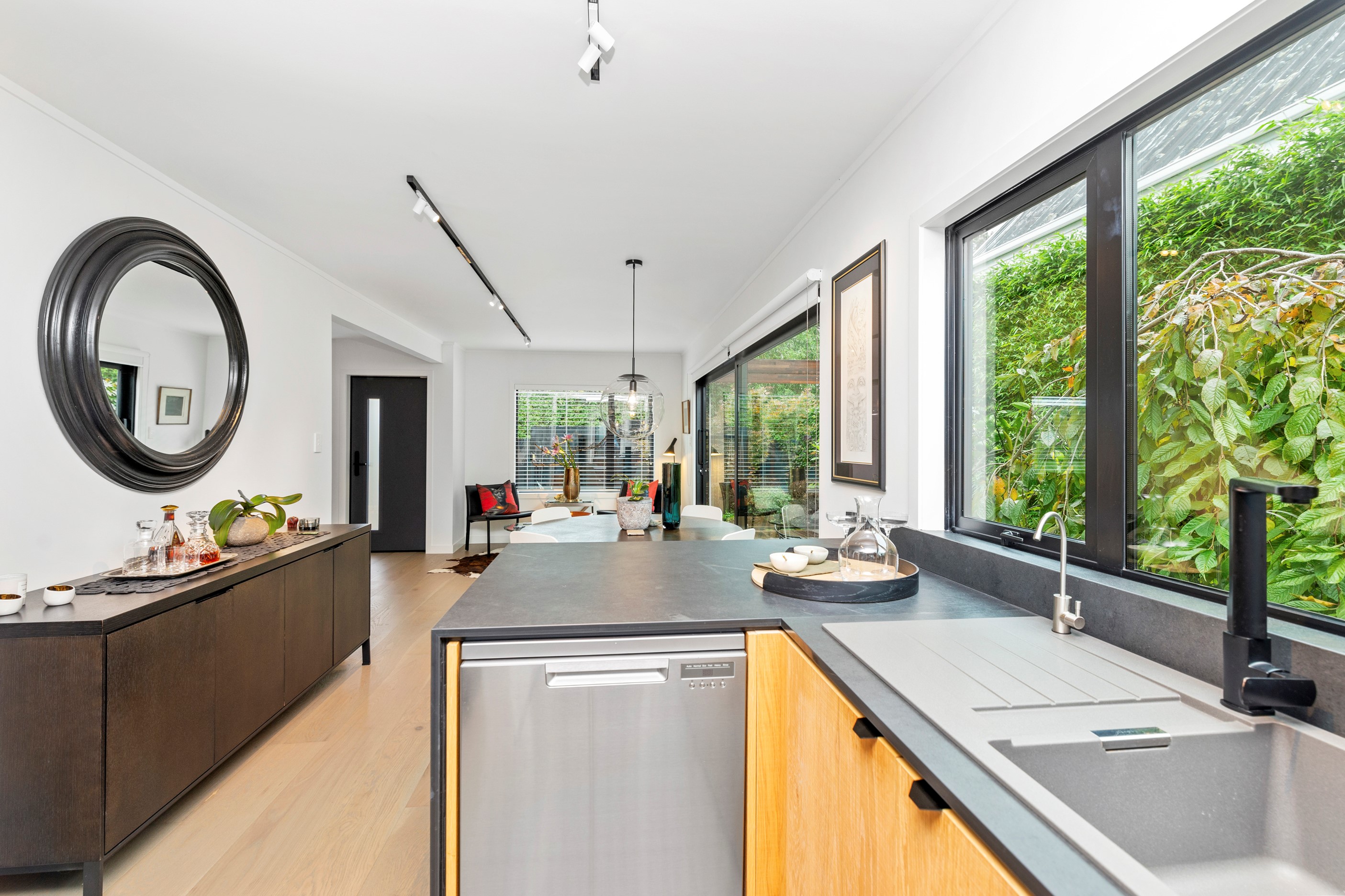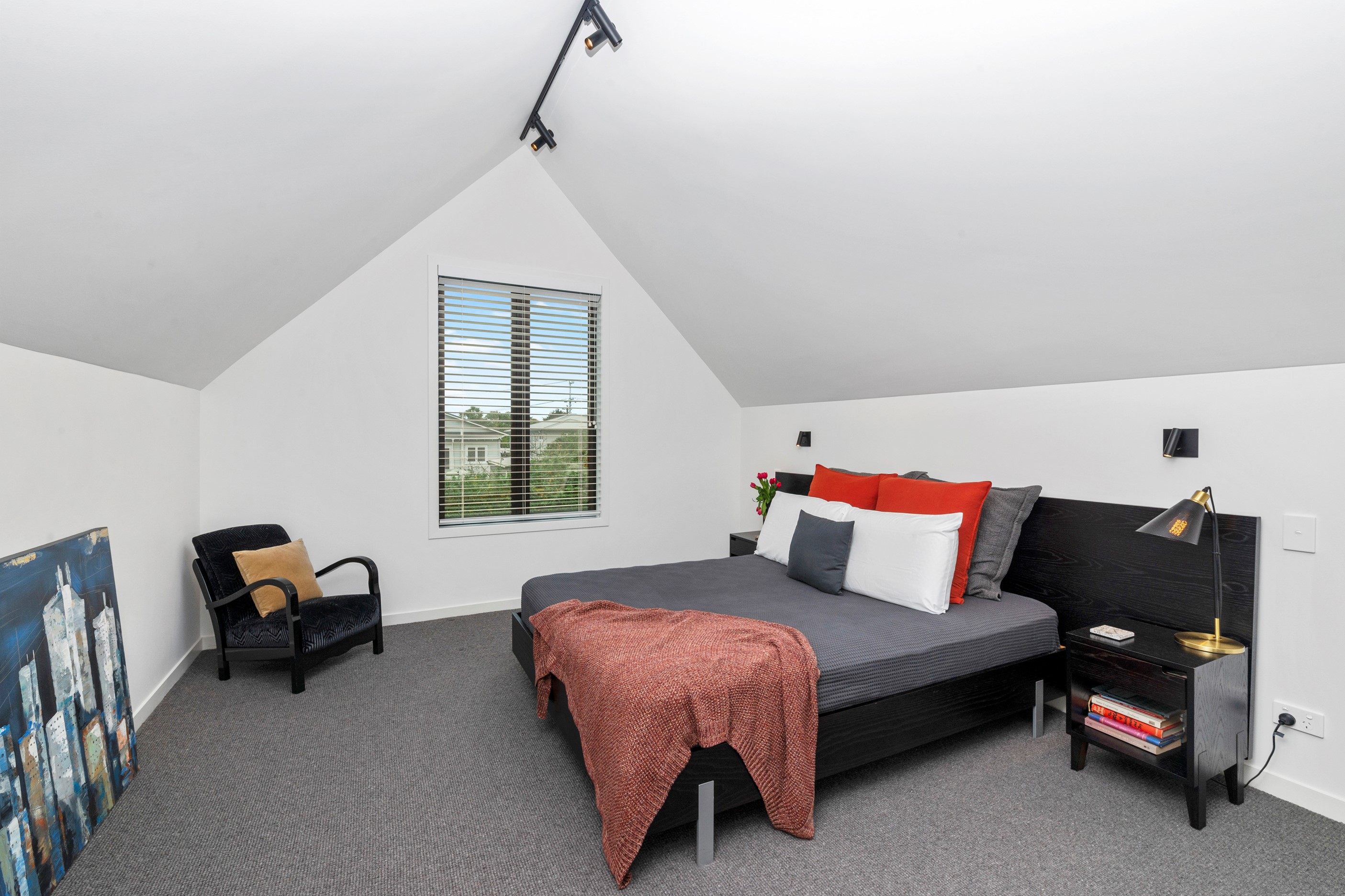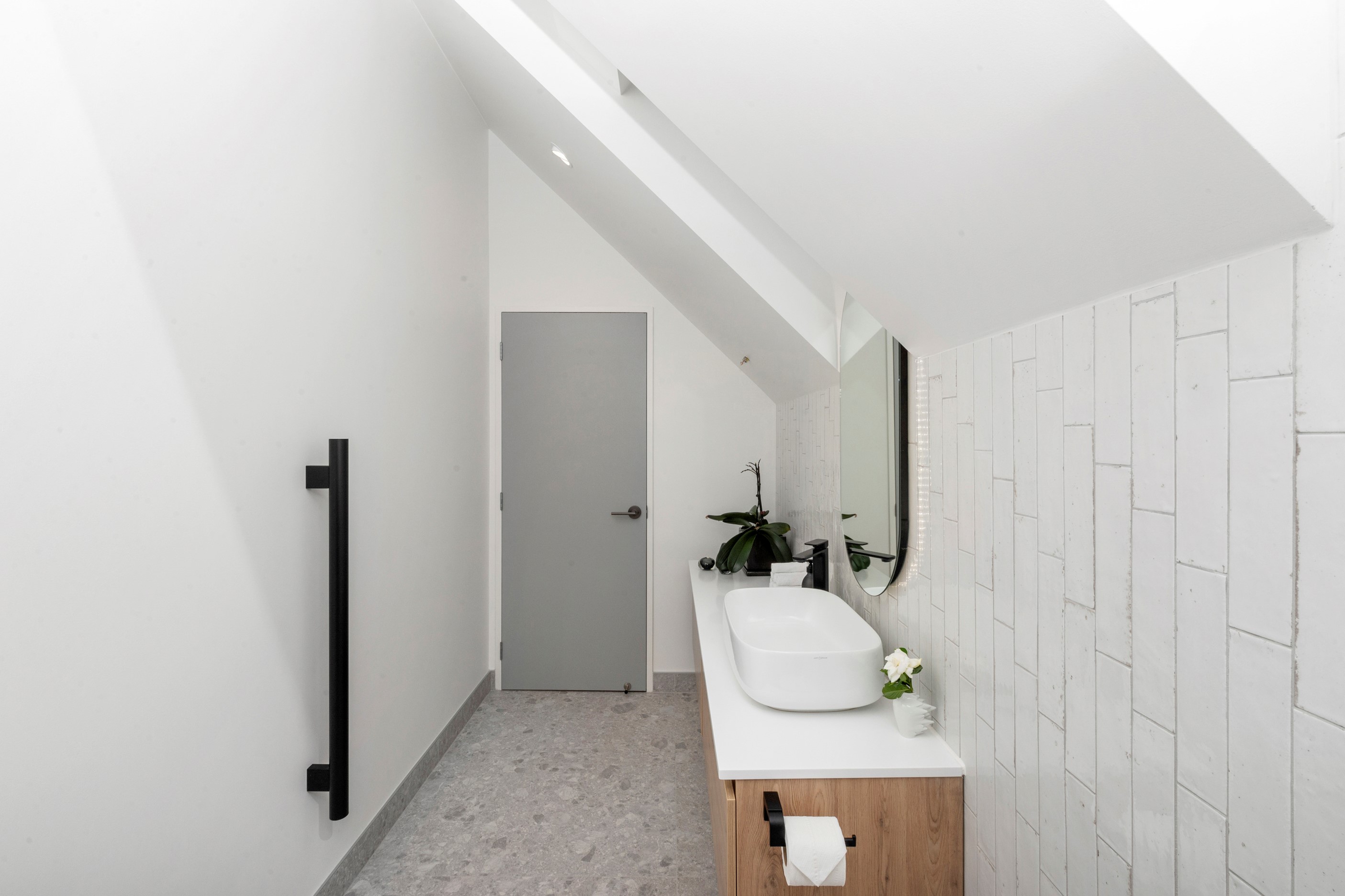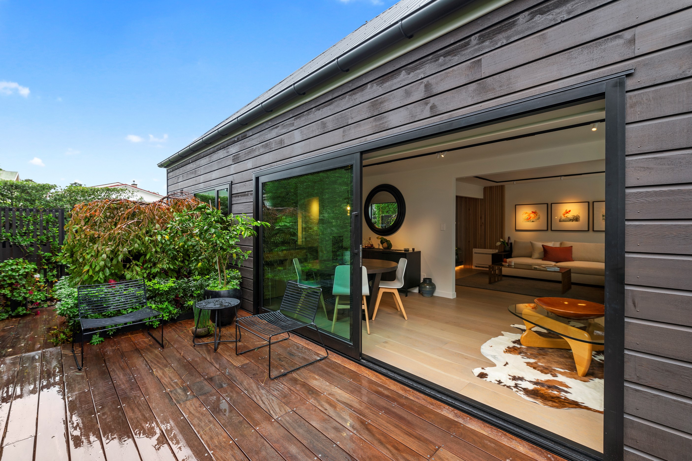 If it wasn’t for the roofline, you might not recognise this house, such is the transformation. Once tired, and with joinery and cladding that had seen better days, the 80s townhouse is now a stylish low-maintenance oasis in one of the central city’s vibrant beach suburbs. It took a head-to-toe refurbishment to elevate the 155sqm home from fatigued to fabulous. A new roof, windows, skylights, cladding, interior and landscaping are major features of the renovation, and the architect-owner now has the light-filled retreat he wanted. The north face of the three-bedroom home juxtaposes horizontal dark-stained cedar weatherboard with pale vertical cedar, and hardwood decking wraps around it, adding another layer of timber. Inside, the aesthetic is calm and soothing. Cedar features and subway tiles have been applied vertically– white in bathrooms and jade green in the kitchen. Upstairs, two bedrooms and a bathroom make the most of the 45-degree roof space. On the ground floor you’ll find everything else, including living spaces linking to a deck. It’s warm, too. The upgrade exceeds building-code requirements, ensuring comfy living conditions and Lower energy bills.