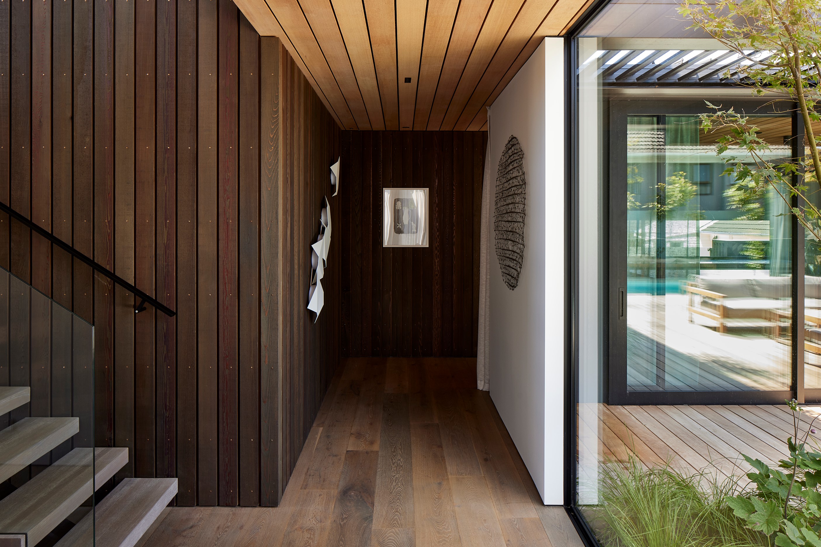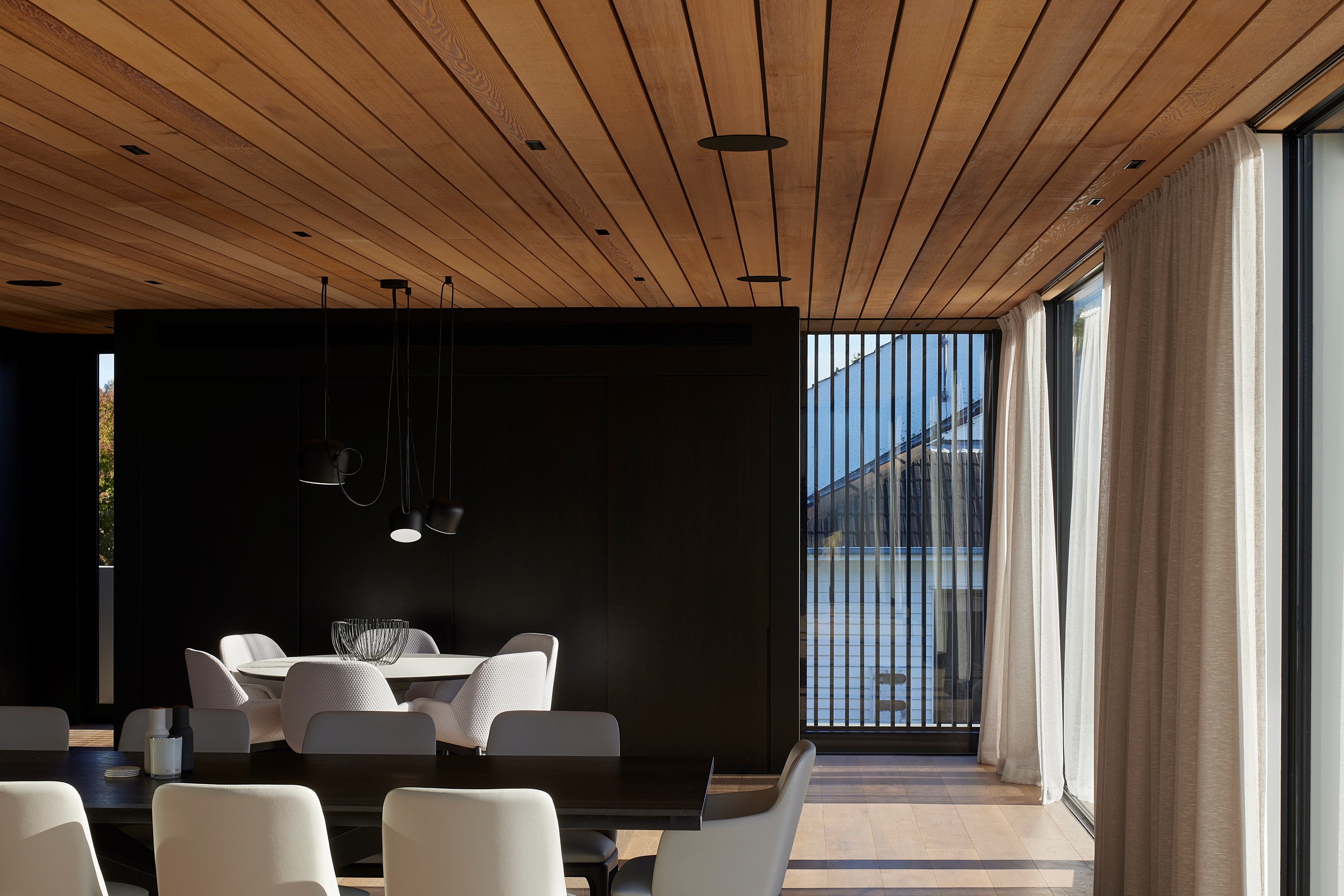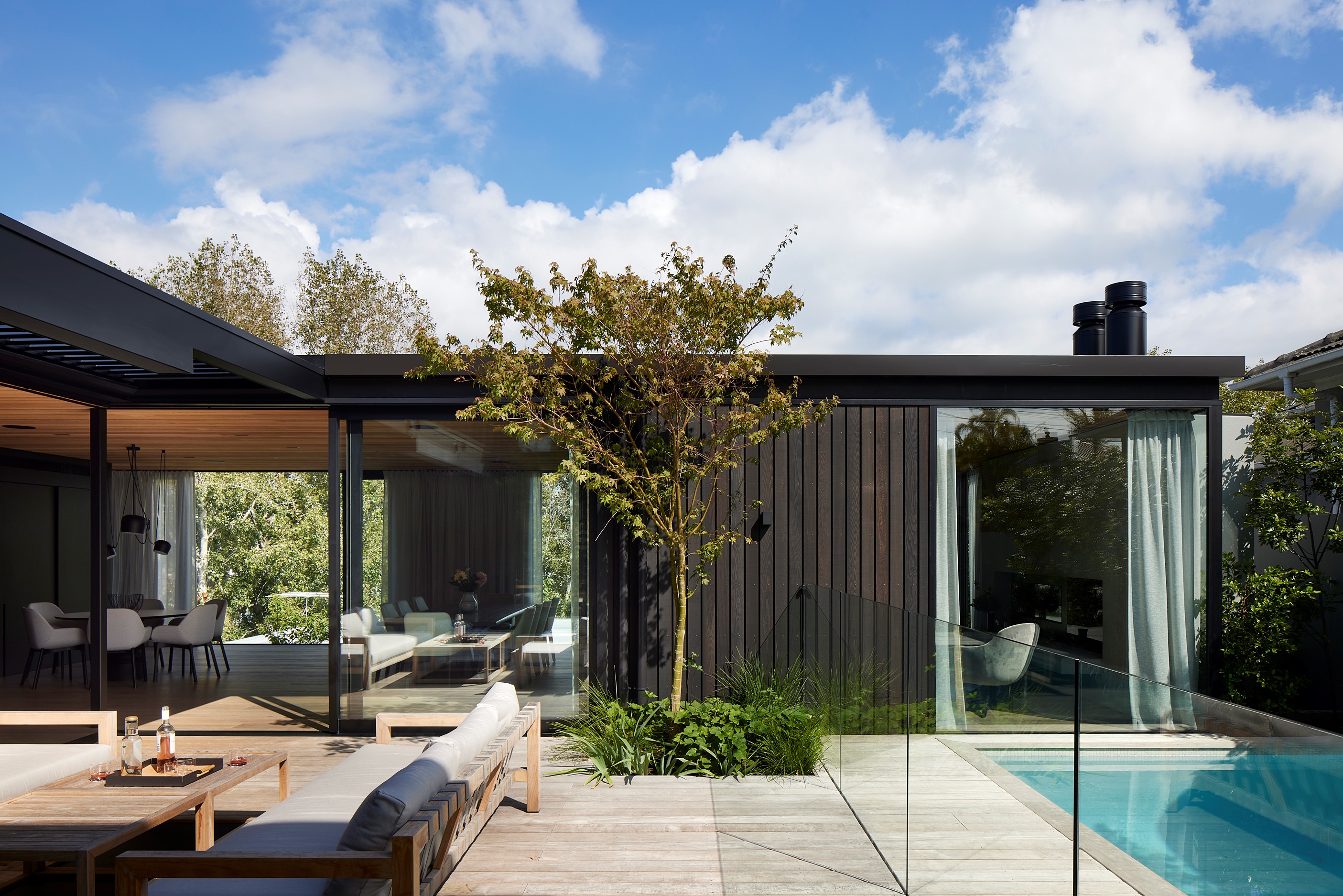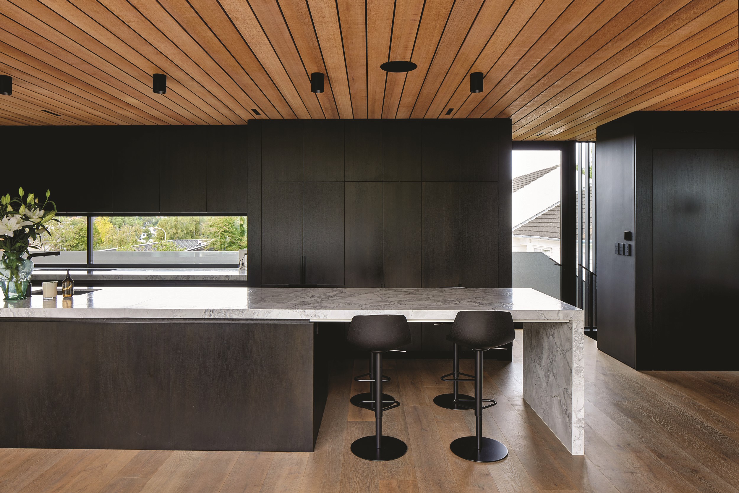 You can’t miss it. This dark, elegant home in a coastal Auckland suburb is much talked about and admired. Vertical black screens and cedar cladding make a strong architectural statement against the lush greenery of a reserve. This is precision craftsmanship at its finest. A black cedar pivot door opens up to the entrance lobby where a solid-oak floating staircase is an elegant feature. From here, cedar-clad walls lead to the inner sanctum – the courtyard, a private oasis. The courtyard is wrapped by the kitchen, dining and living area, and a TV snug. The setting is sublime: smoky plaster, timber floors, cedar ceilings, jet-black joinery and filtered light. Every detail at every turn is high-end and high-spec. Material richness throughout the 310sqm four-bedroom home creates harmony, luxury and a sense of calm. The primary living area takes in views of the rear garden and swimming pool. The courtyard connects to external views of established greenery through full-height glazing. The elegant kitchen features a waterfall granite island and full-height oak-veneer cabinetry. With the courtyard at its heart, every space is beautifully connected and articulated.