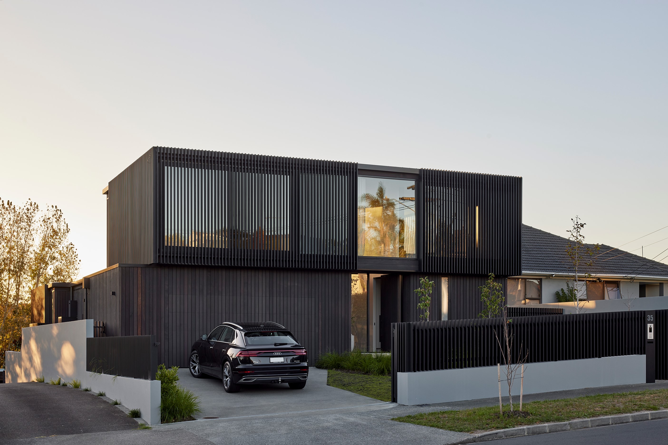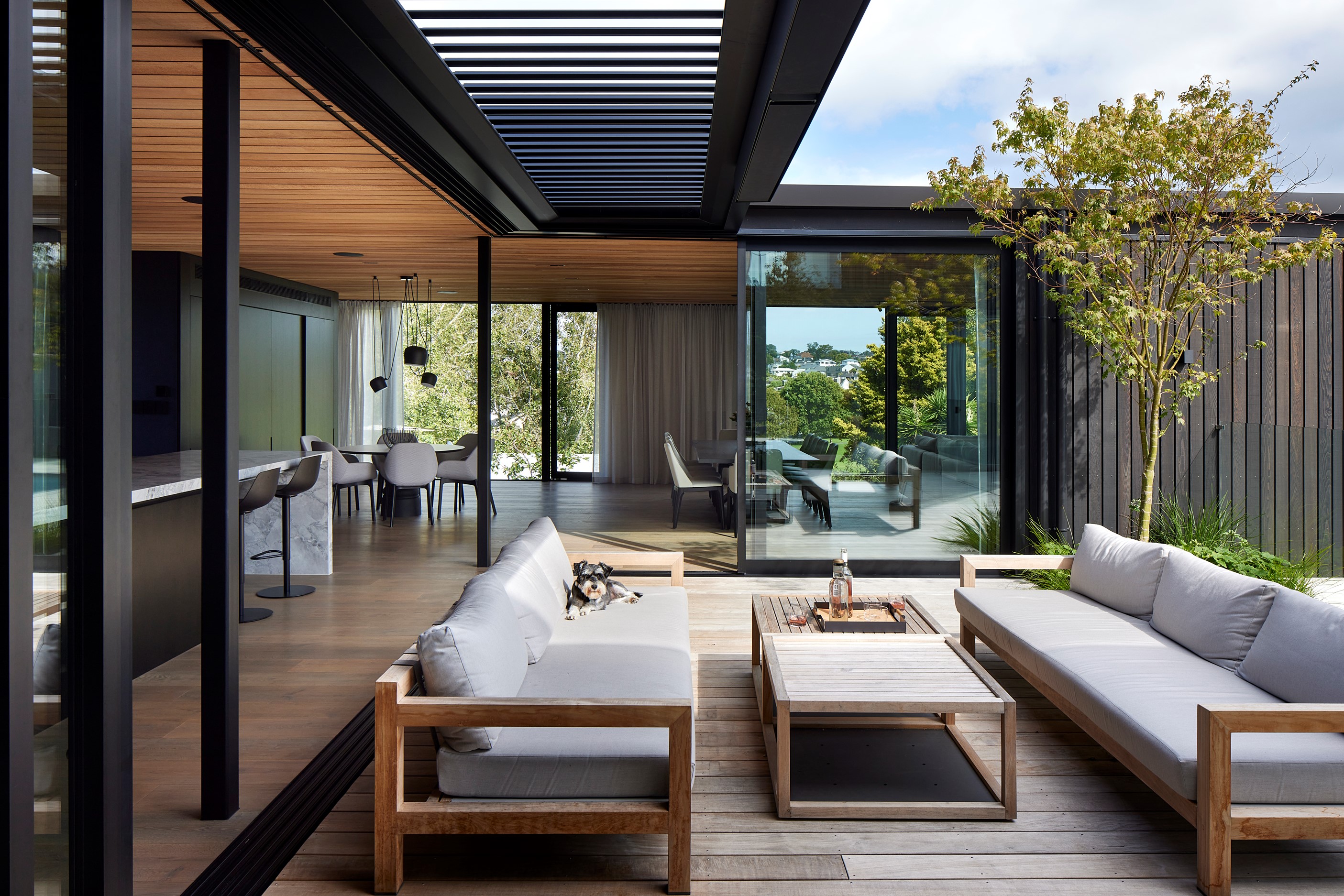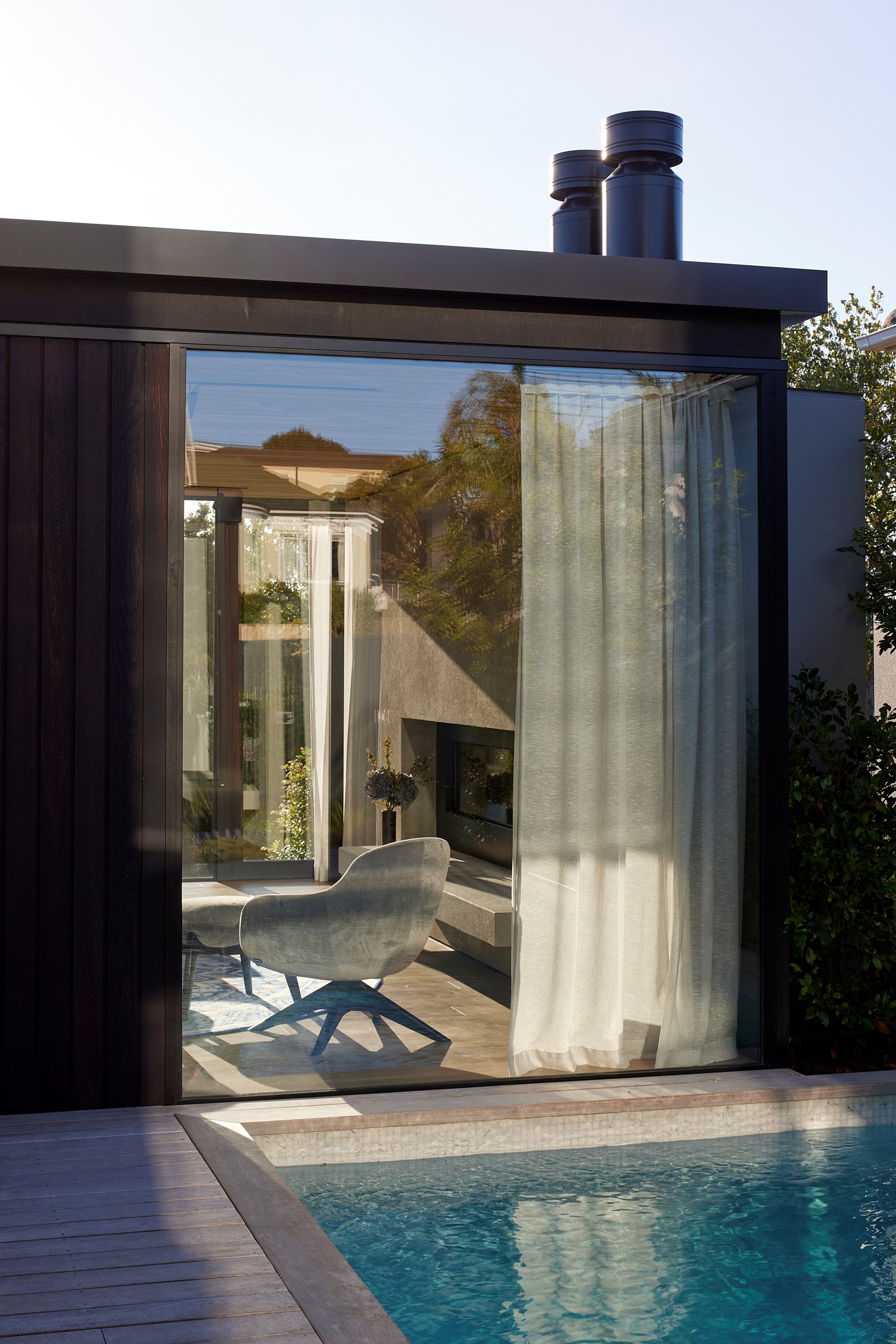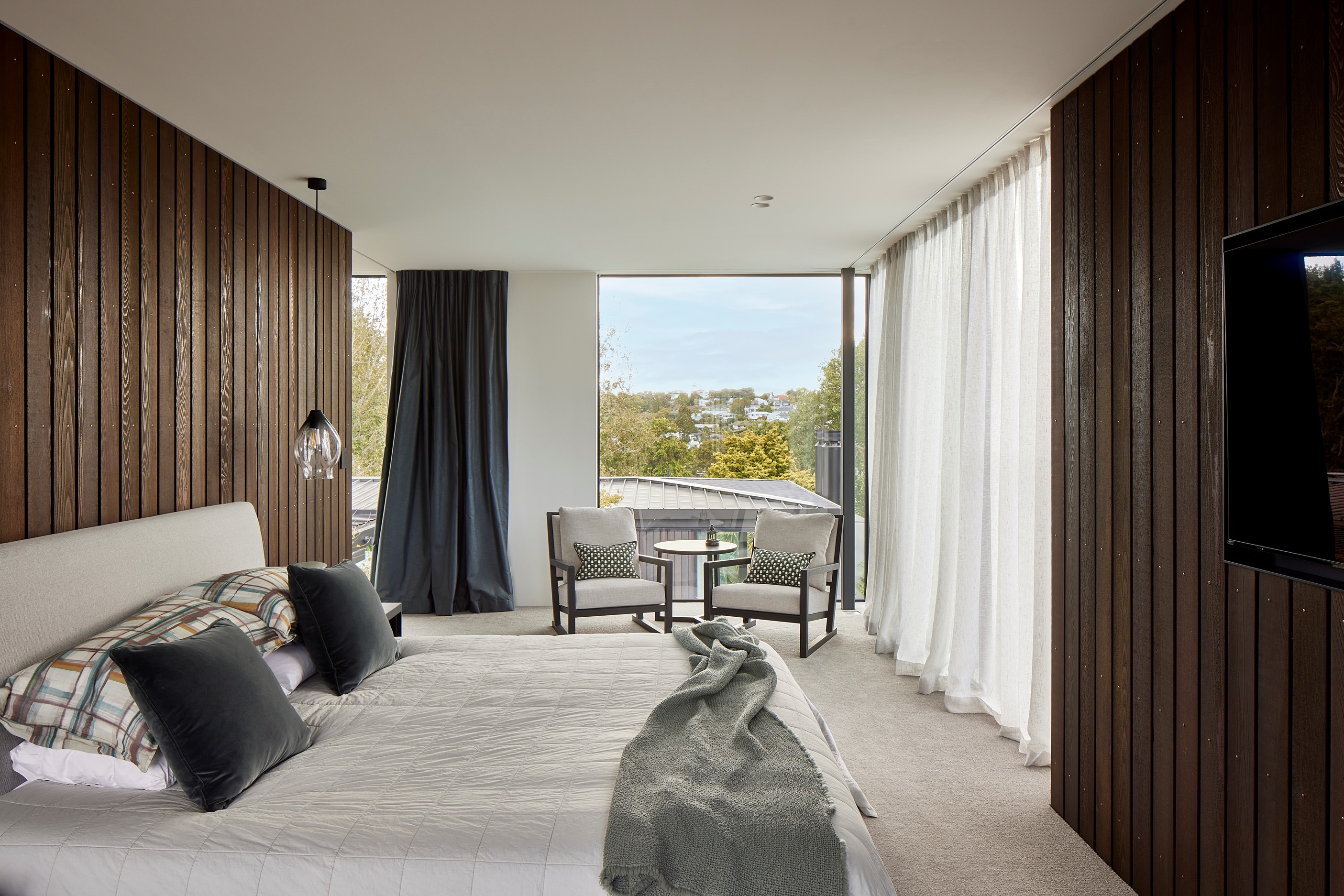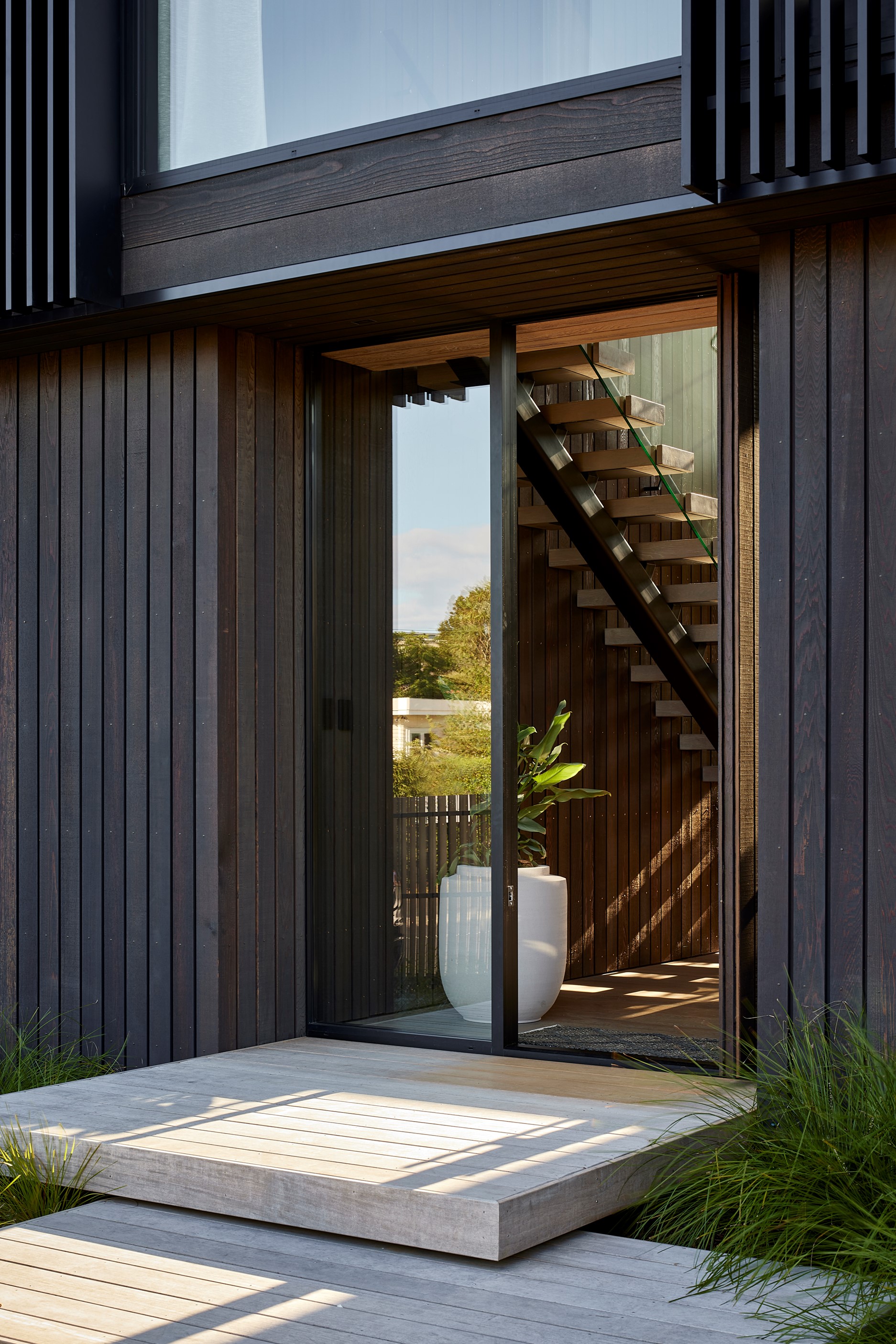 You can’t miss it. This dark, elegant home in a coastal Auckland suburb is much talked about and admired. Vertical black screens and cedar cladding make a strong architectural statement against the lush greenery of a reserve. This is precision craftsmanship at its finest. A black cedar pivot door opens up to the entrance lobby where a solid-oak floating staircase is an elegant feature. From here, cedar-clad walls lead to the inner sanctum – the courtyard, a private oasis. The courtyard is wrapped by the kitchen, dining and living area, and a TV snug. The setting is sublime: smoky plaster, timber floors, cedar ceilings, jet-black joinery and filtered light. Every detail at every turn is high-end and high-spec. Material richness throughout the 310sqm four-bedroom home creates harmony, luxury and a sense of calm. The primary living area takes in views of the rear garden and swimming pool. The courtyard connects to external views of established greenery through full-height glazing. The elegant kitchen features a waterfall granite island and full-height oak-veneer cabinetry. With the courtyard at its heart, every space is beautifully connected and articulated.