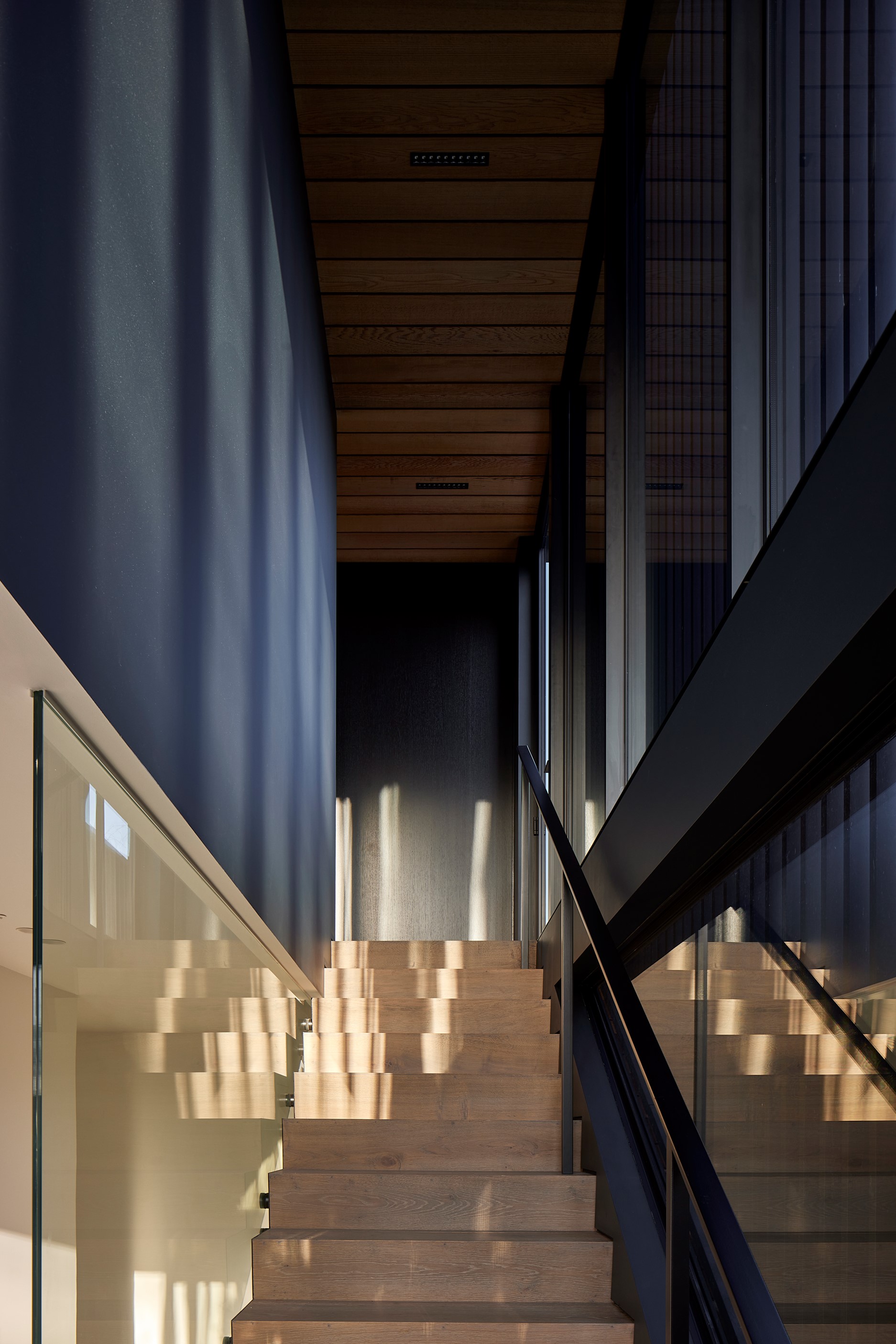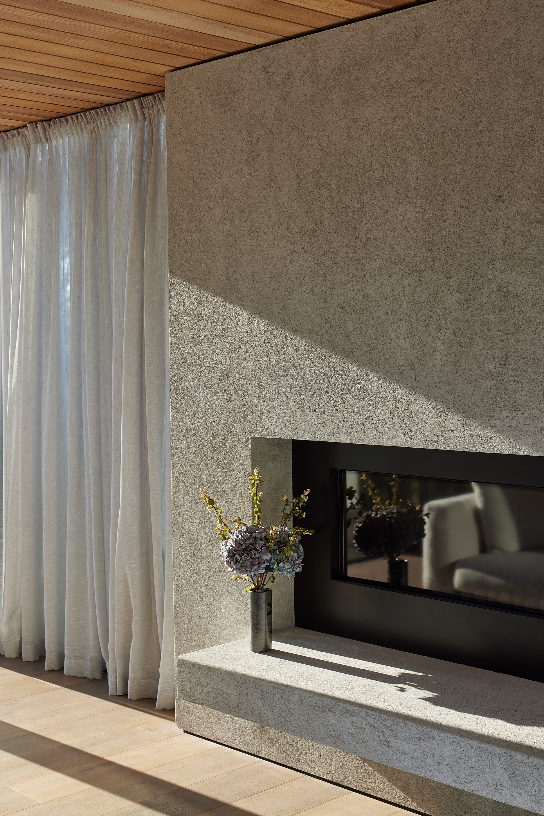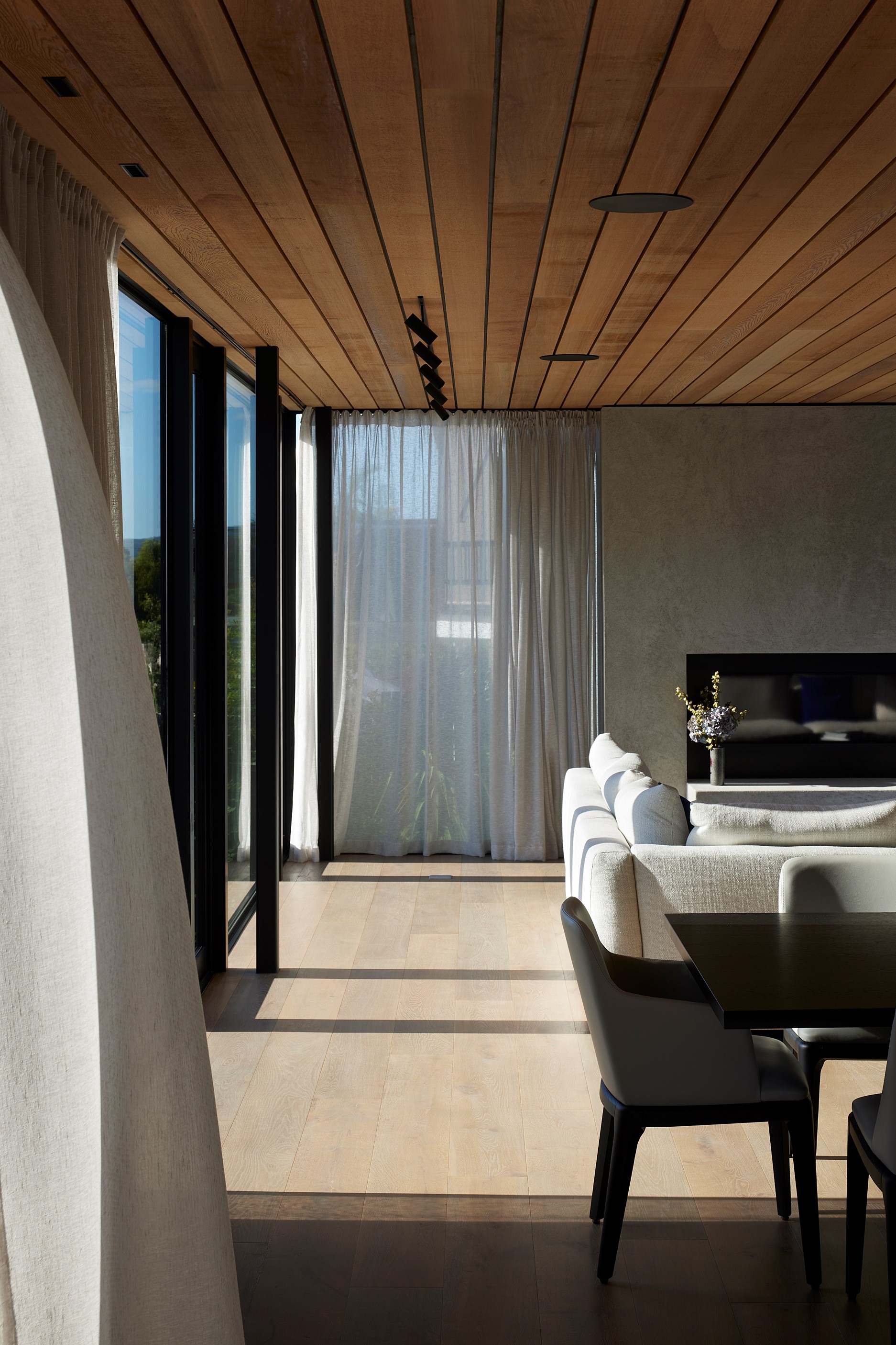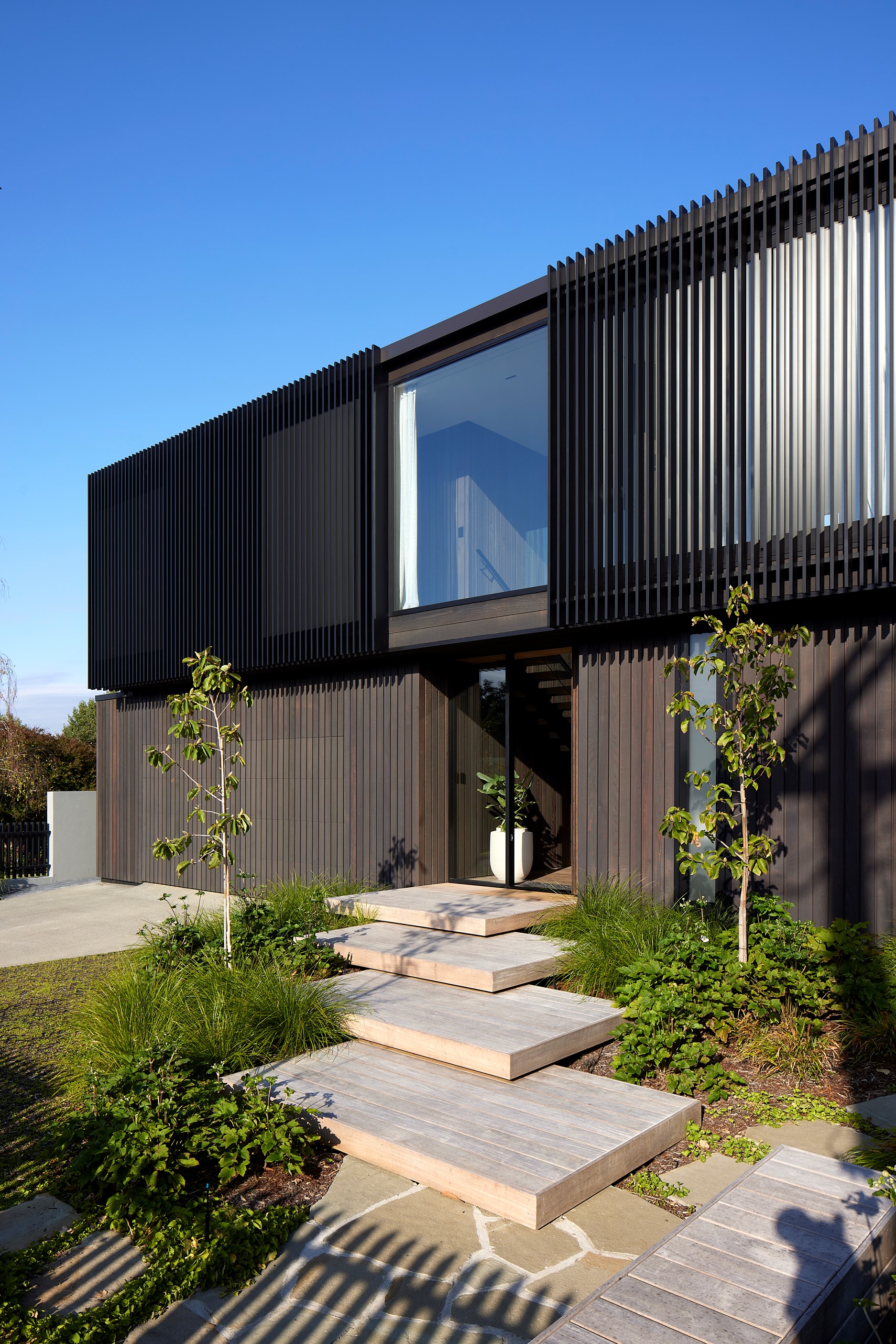 You can’t miss it. This dark, elegant home in a coastal Auckland suburb is much talked about and admired. Vertical black screens and cedar cladding make a strong architectural statement against the lush greenery of a reserve. This is precision craftsmanship at its finest. A black cedar pivot door opens up to the entrance lobby where a solid-oak floating staircase is an elegant feature. From here, cedar-clad walls lead to the inner sanctum – the courtyard, a private oasis. The courtyard is wrapped by the kitchen, dining and living area, and a TV snug. The setting is sublime: smoky plaster, timber floors, cedar ceilings, jet-black joinery and filtered light. Every detail at every turn is high-end and high-spec. Material richness throughout the 310sqm four-bedroom home creates harmony, luxury and a sense of calm. The primary living area takes in views of the rear garden and swimming pool. The courtyard connects to external views of established greenery through full-height glazing. The elegant kitchen features a waterfall granite island and full-height oak-veneer cabinetry. With the courtyard at its heart, every space is beautifully connected and articulated.