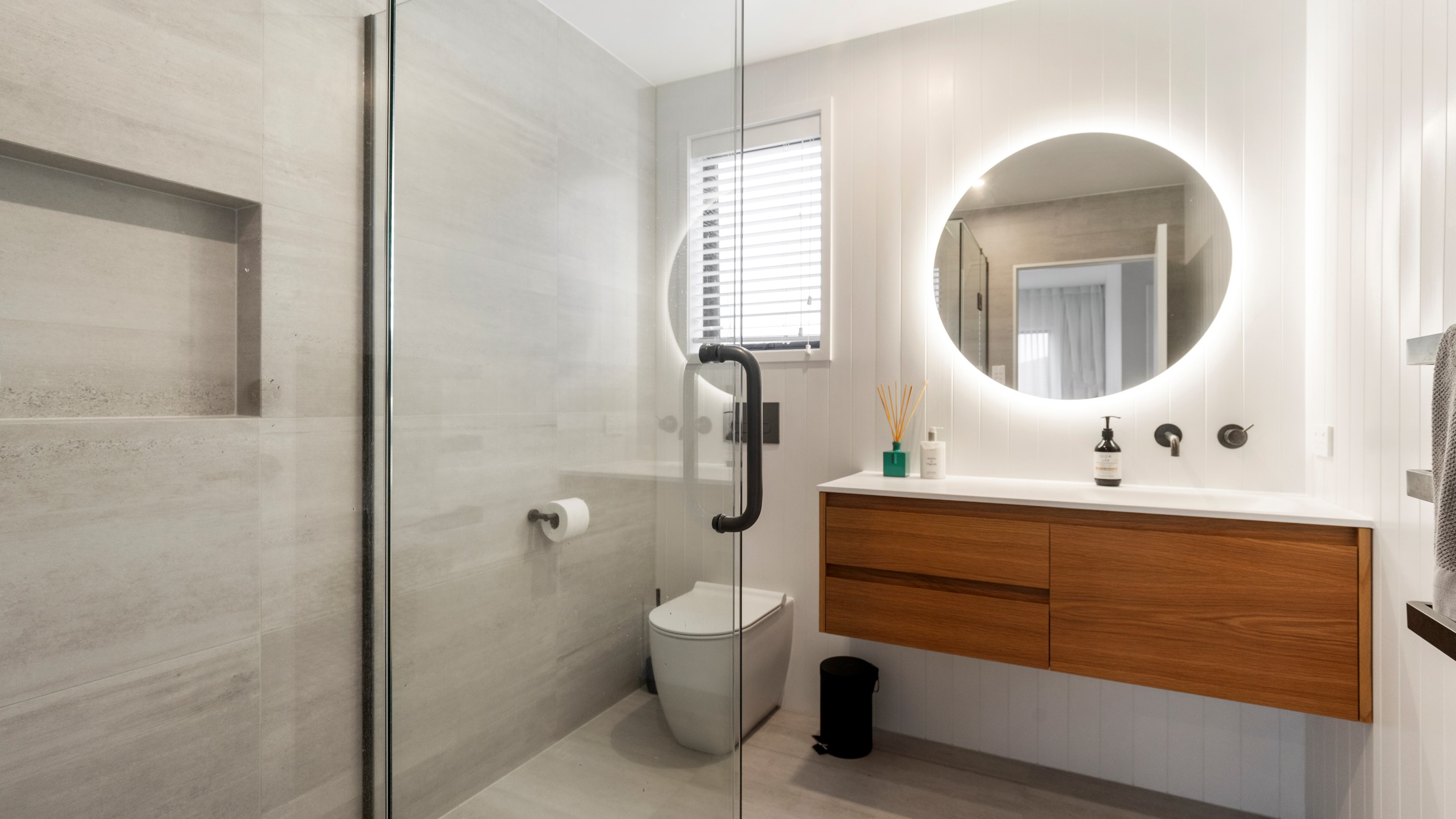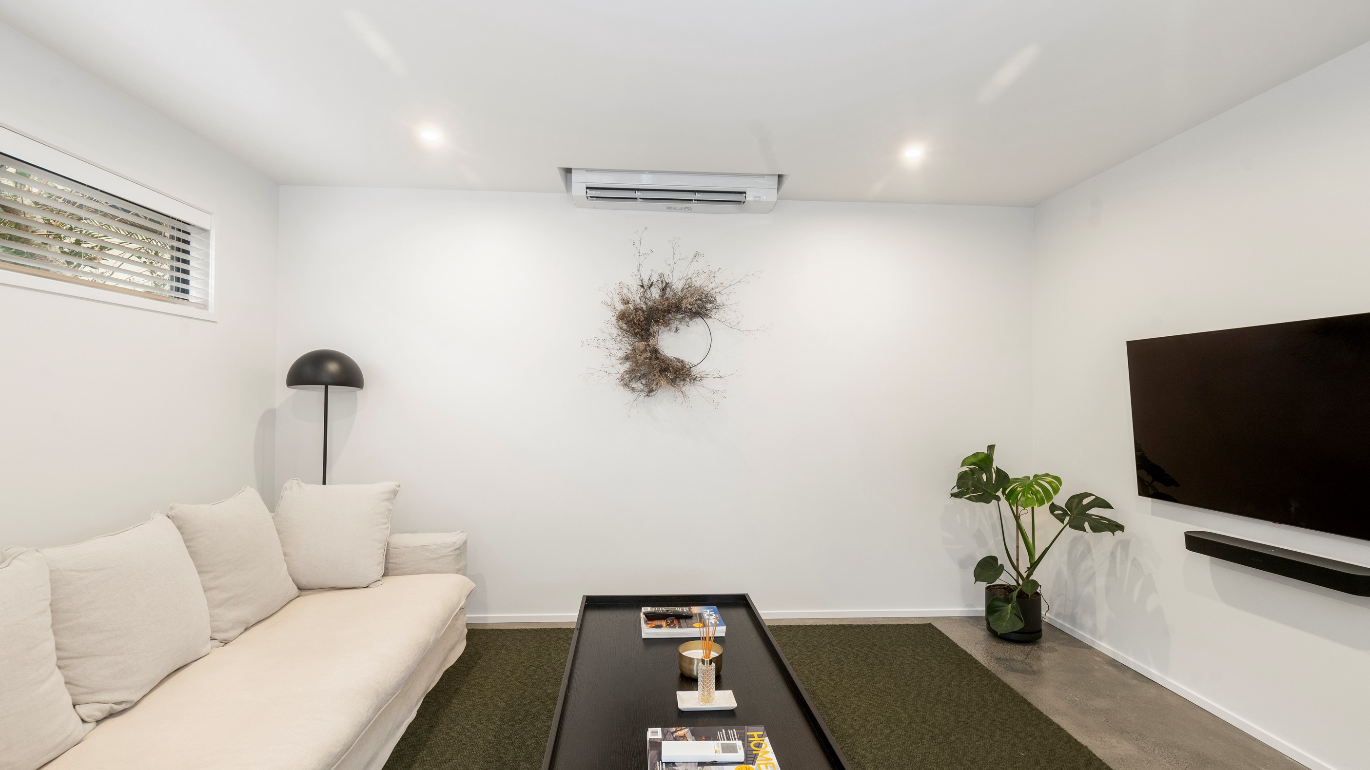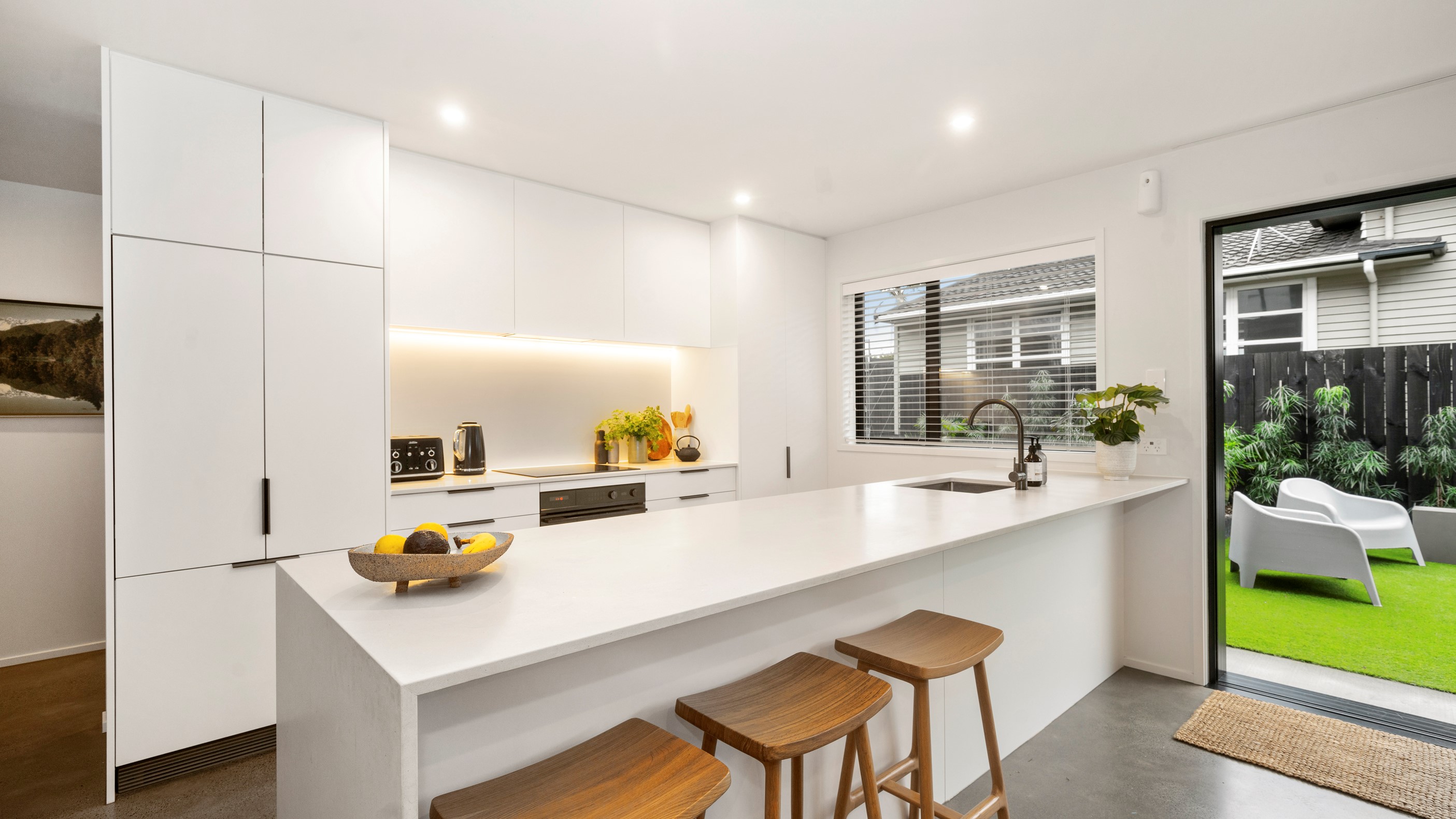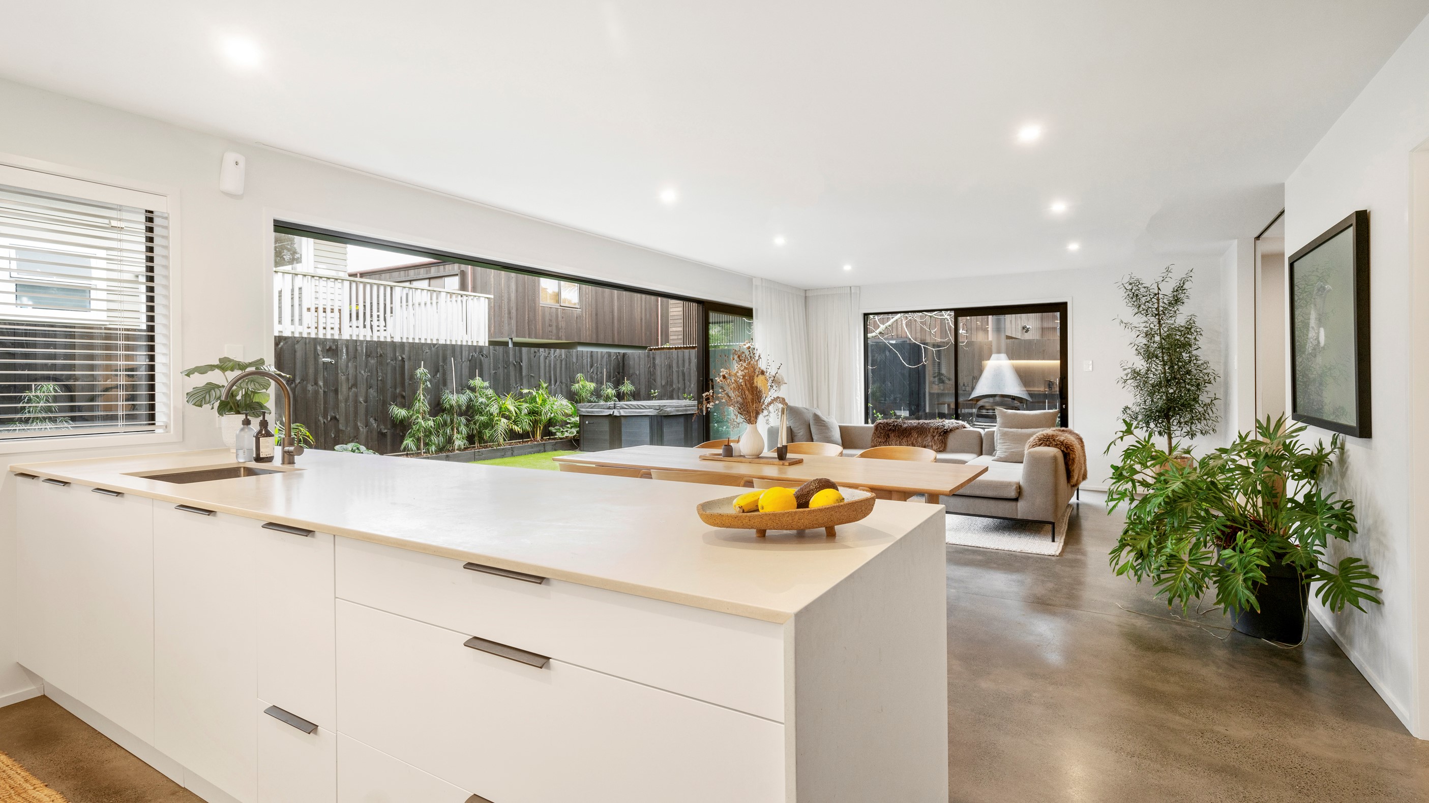 In this instance, the term ‘builder’s own home’ means more than just the fact he constructed his 211sqm house. He also completed the subdivision of the section and drew on seven years as a draughts person to design his family home. He also designed the kitchen and wardrobe systems. He shared the interior design tasks with his partner. And the landscaping? Yes, he did that, too. This four-bedroom, three bathroom residence has strong lines and is designed to be low maintenance. It was also created for easy living, and one look inside the tasteful interior tells you that has been achieved. Open the doors from the dining and living space and suddenly the area becomes a whole lot bigger. Sliders blur the line between inside and out, especially when you can step directly out to a concrete patio. The double garage has plenty of room for the cars, but was designed to double as a hangout for the family’s teens. With polished concrete floors, acoustic insulation, a TV and sofas, it’s a smart idea that has been smartly executed. This home is a showcase for the builder’s many skills.