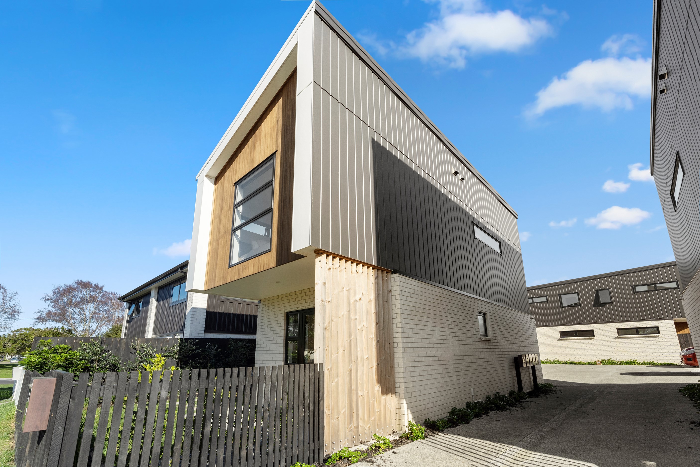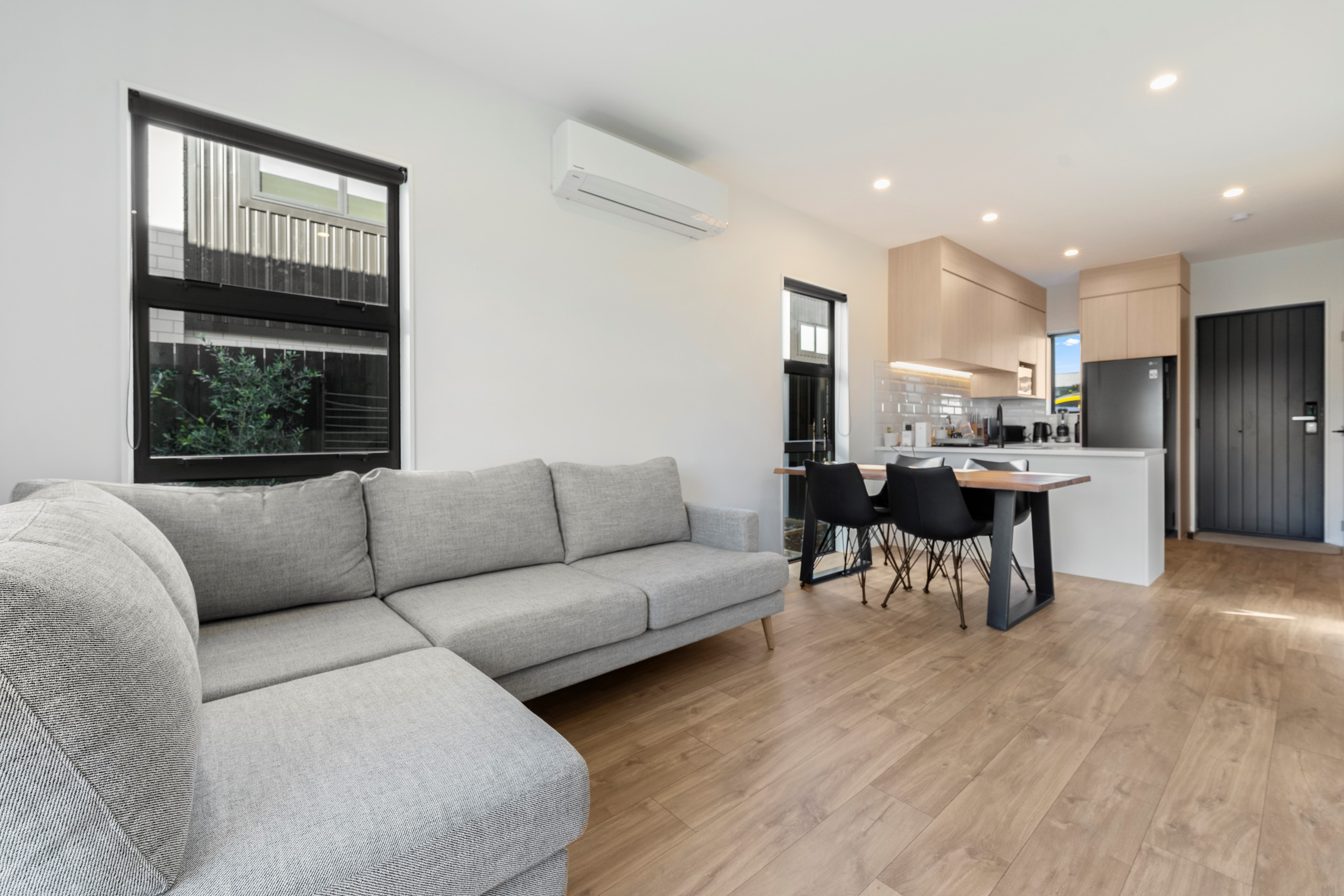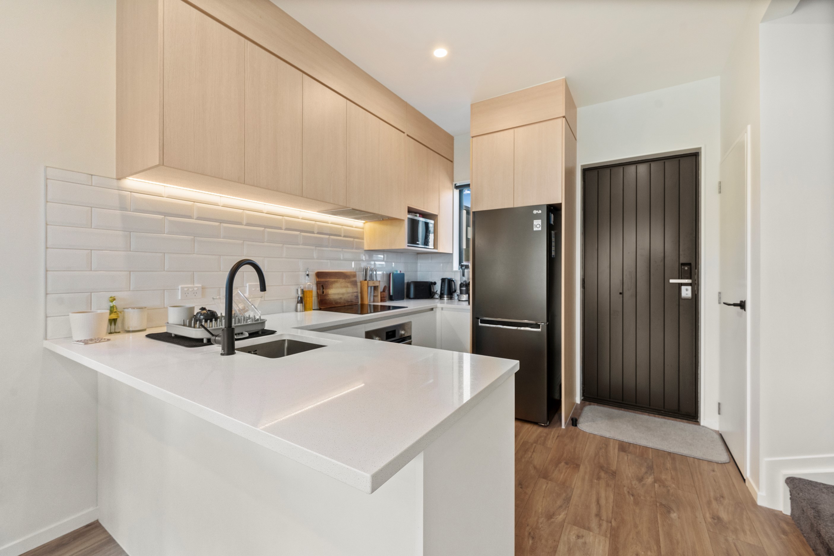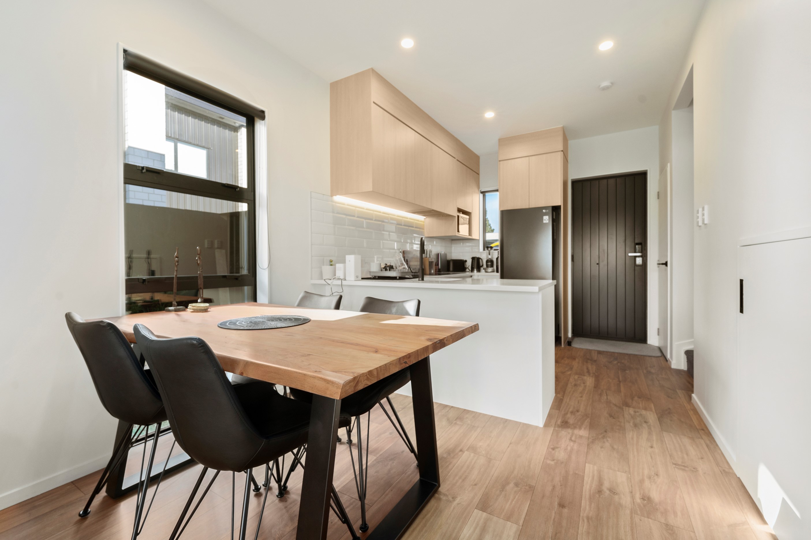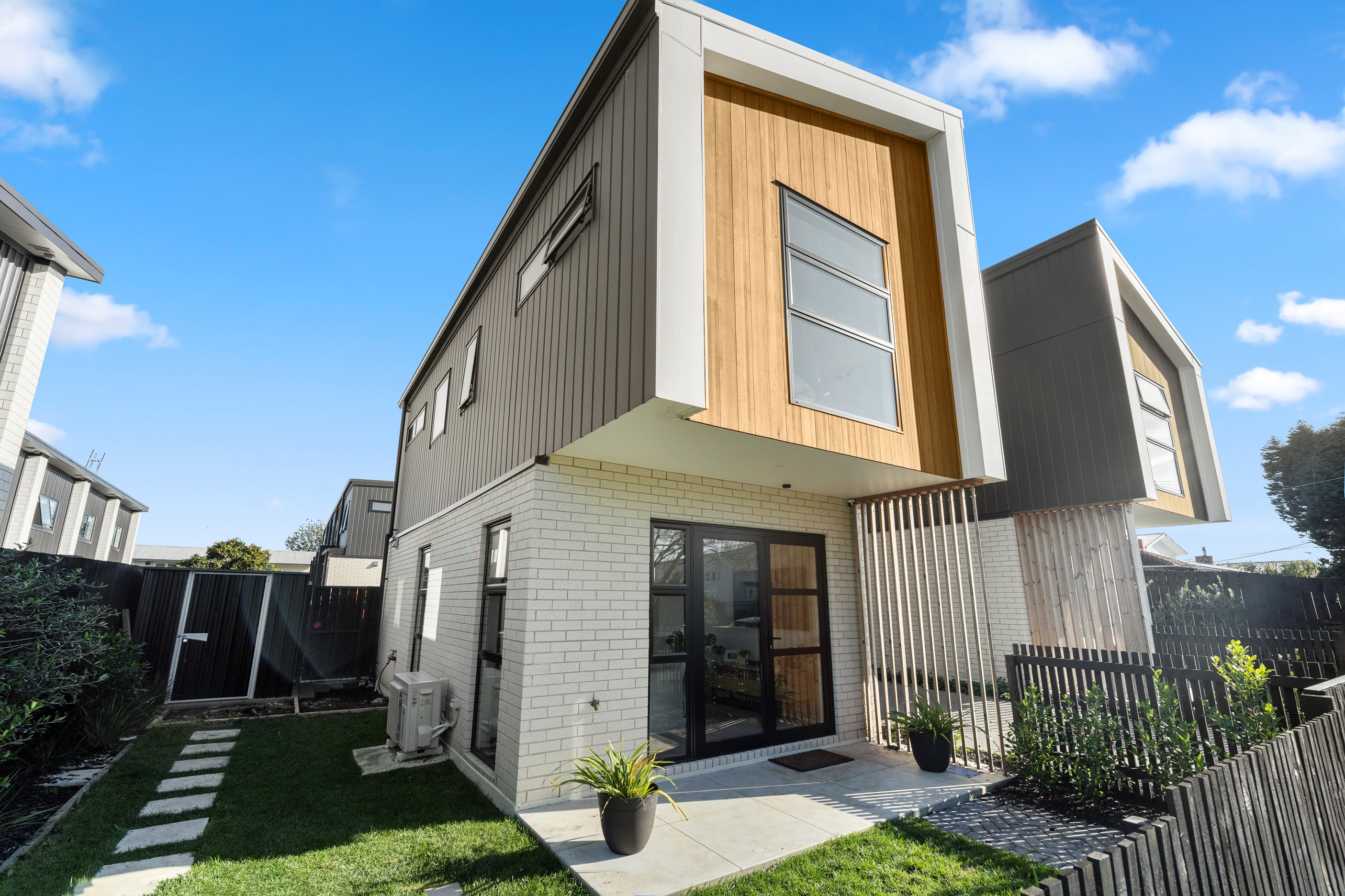 There’s a lot more to this two-level architecturally designed home than initially meets the eye – and what meets the eye initially is very pleasing indeed. There’s street appeal in spades here, with an attractive combination of light brick, dark and light vertical cladding and a raking roofline framed in white. Angled vertical battens separate the dwelling from its neighbour, giving privacy but allowing the sun inside. The 76sqm footprint encompasses two bedrooms, one bathroom, an open-plan kitchen and living area, and it does so effortlessly thanks to smart spatial and interior design. Downstairs, crisp white walls pair with lovely light timber floors and upstairs, light grey carpet, creating a modern and minimalist feel throughout. Well-placed windows allow in plenty of natural light. The small, sleek kitchen has everything you need. The use of above-bench strip lighting and a pale palette make the space seem bigger. Eco-friendly features such as above-code insulation have helped these homes receive a very respectable 7 Homestar New Zealand Green Building Council rating, ensuring they are warm and dry.