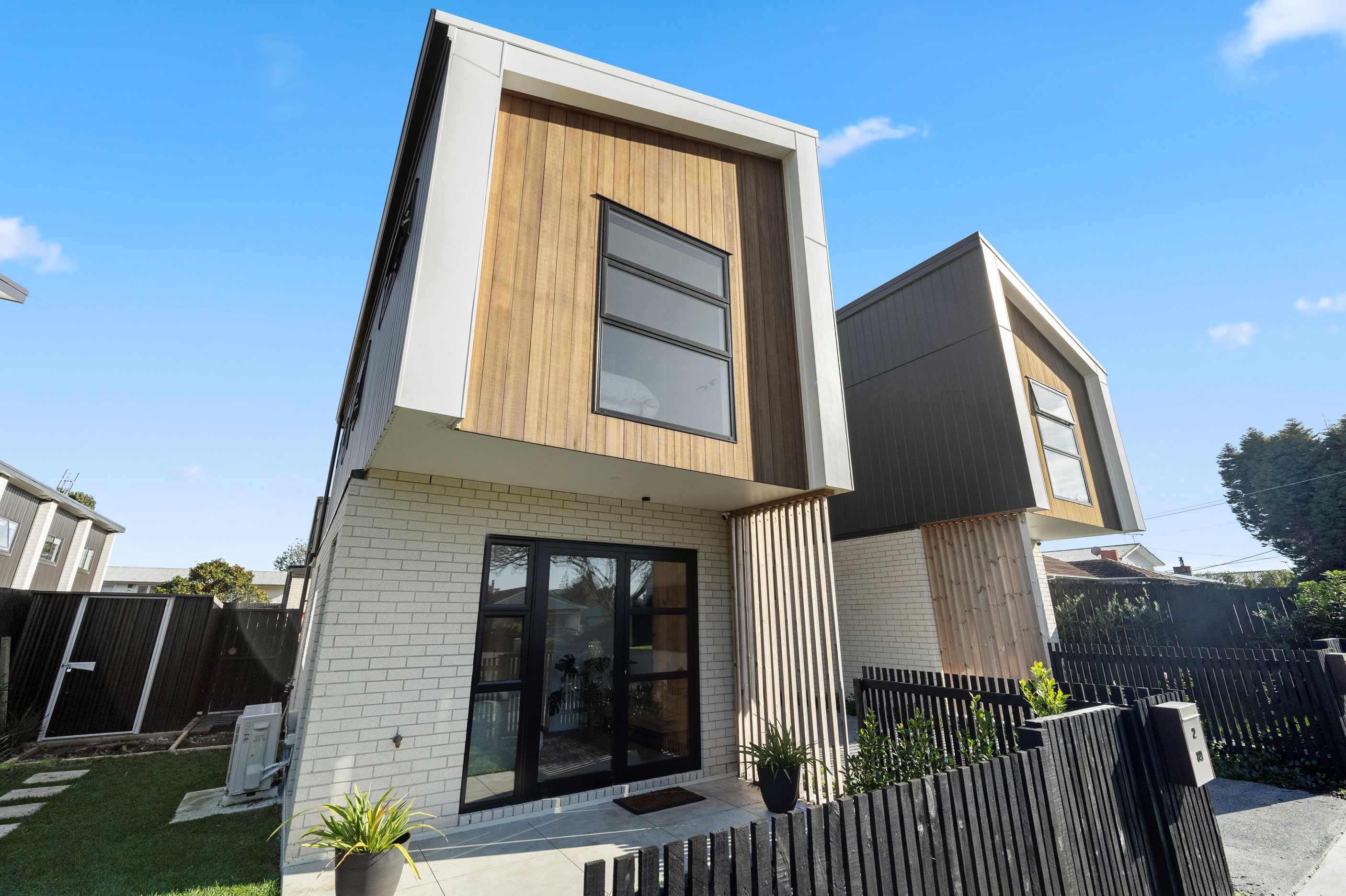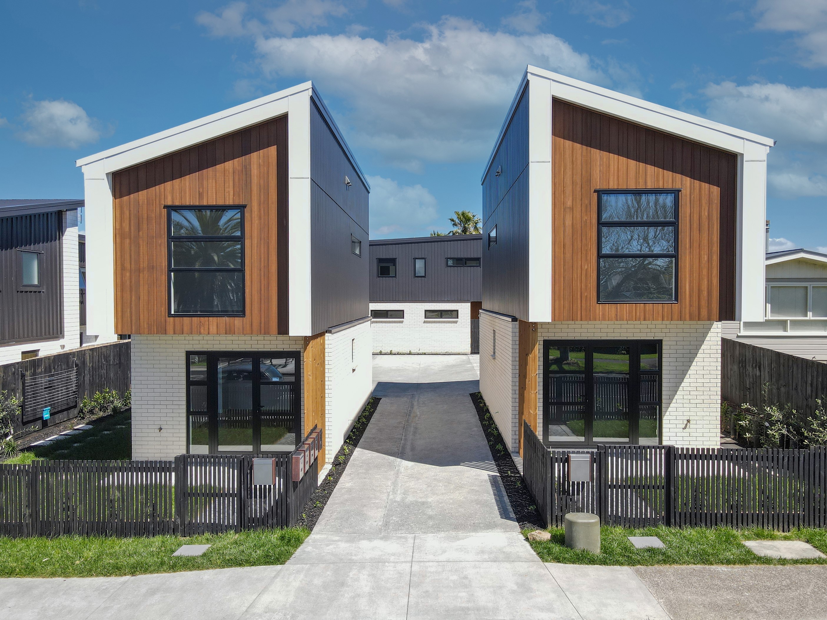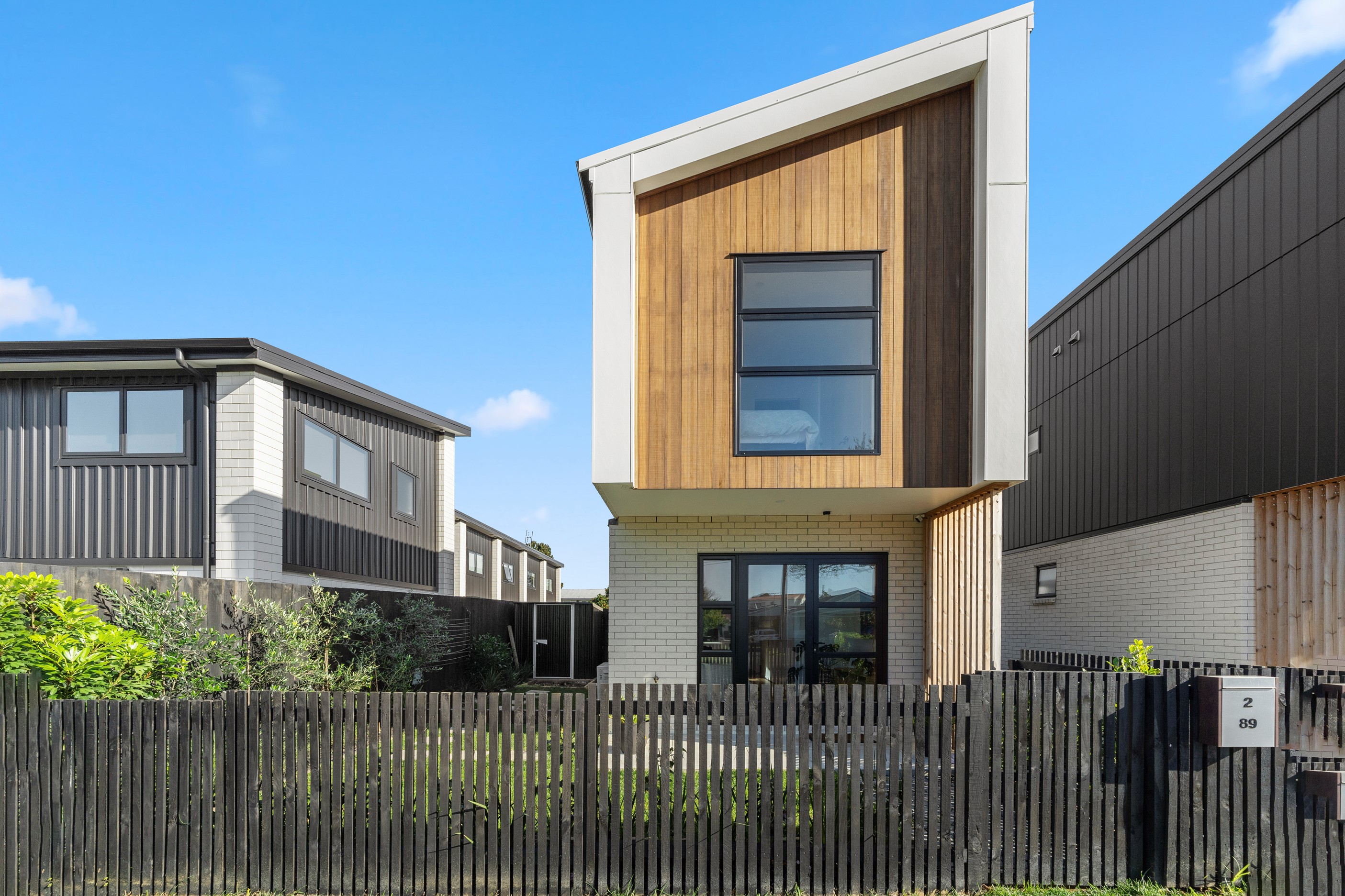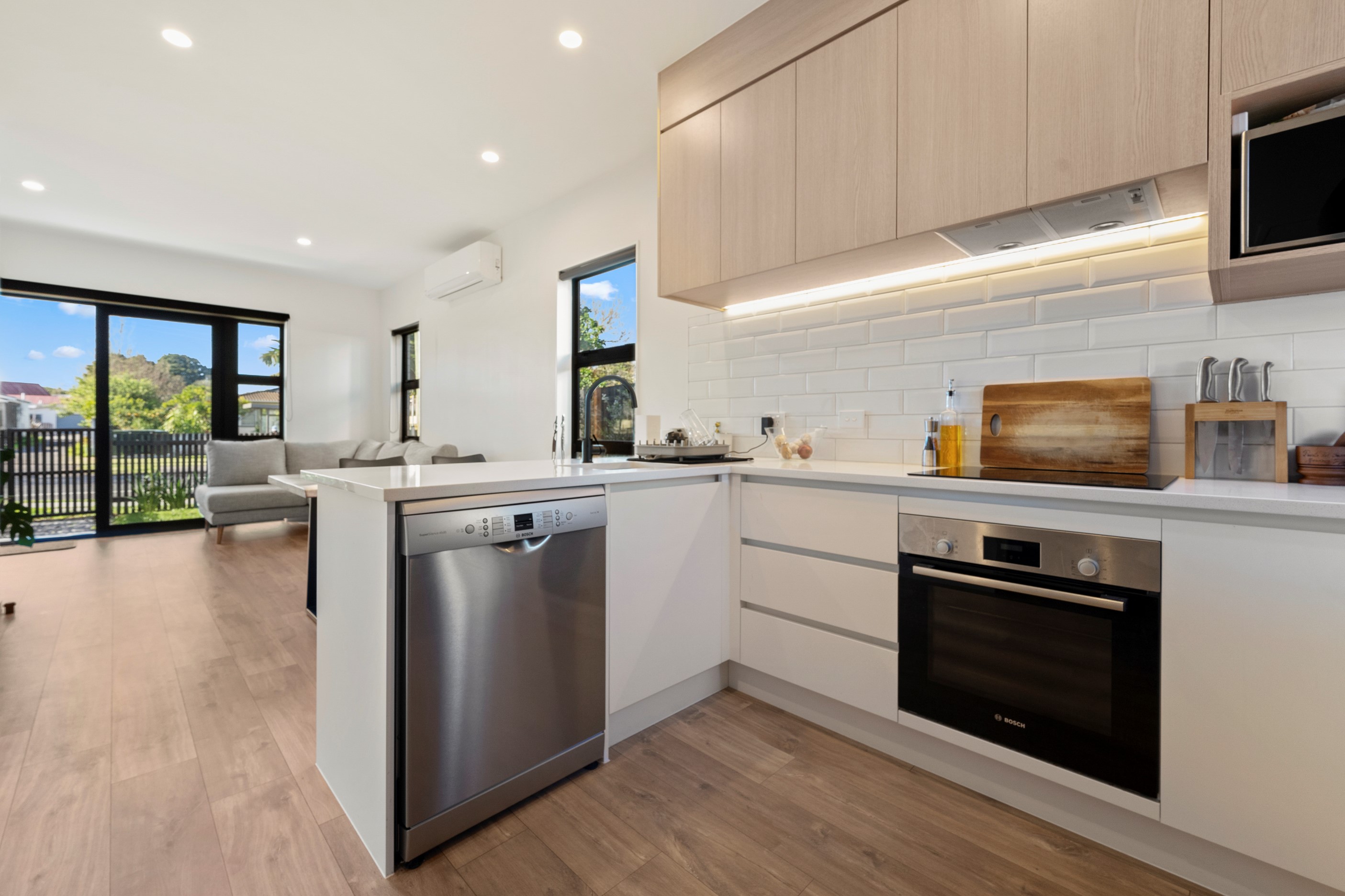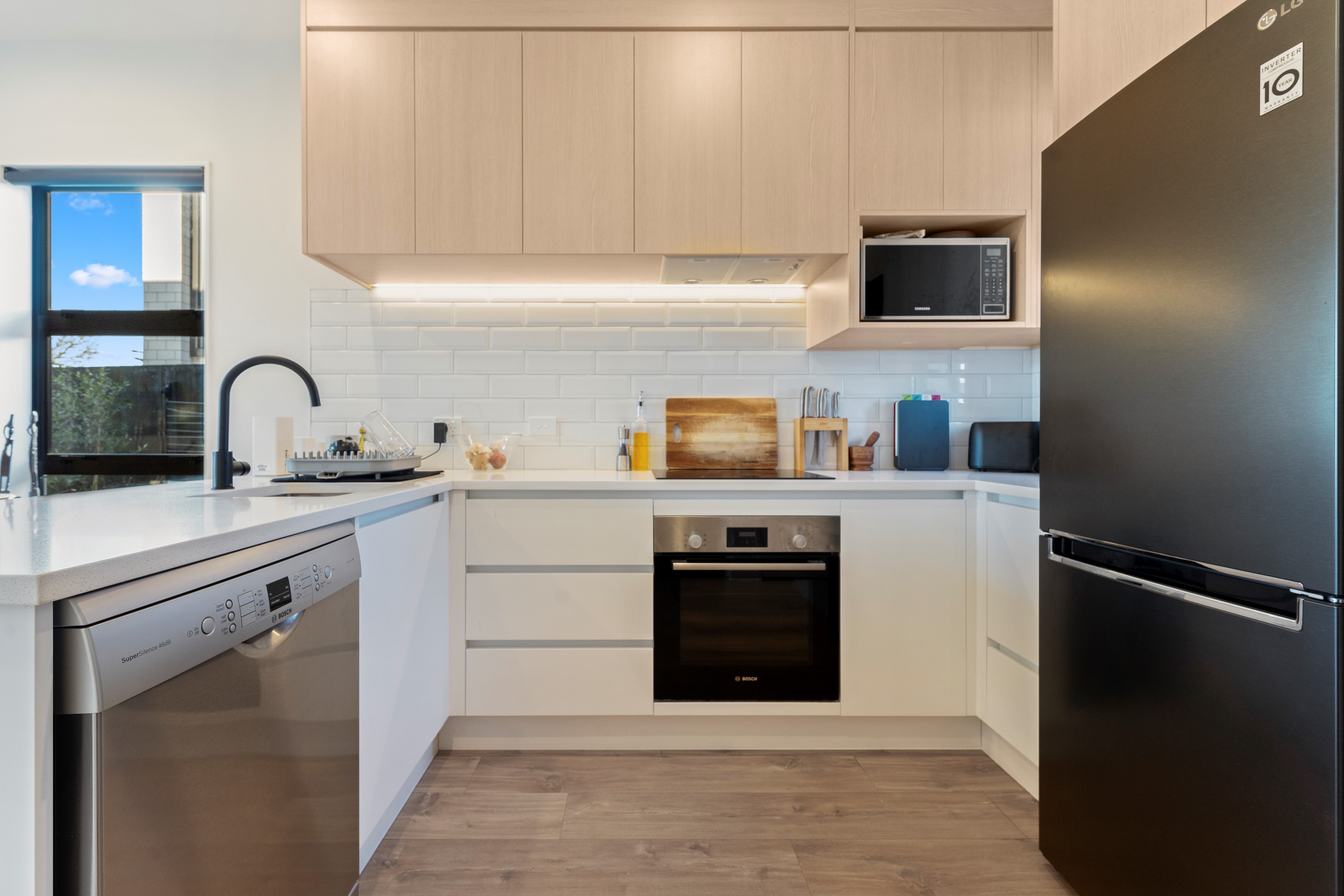 There’s a lot more to this two-level architecturally designed home than initially meets the eye – and what meets the eye initially is very pleasing indeed. There’s street appeal in spades here, with an attractive combination of light brick, dark and light vertical cladding and a raking roofline framed in white. Angled vertical battens separate the dwelling from its neighbour, giving privacy but allowing the sun inside. The 76sqm footprint encompasses two bedrooms, one bathroom, an open-plan kitchen and living area, and it does so effortlessly thanks to smart spatial and interior design. Downstairs, crisp white walls pair with lovely light timber floors and upstairs, light grey carpet, creating a modern and minimalist feel throughout. Well-placed windows allow in plenty of natural light. The small, sleek kitchen has everything you need. The use of above-bench strip lighting and a pale palette make the space seem bigger. Eco-friendly features such as above-code insulation have helped these homes receive a very respectable 7 Homestar New Zealand Green Building Council rating, ensuring they are warm and dry.