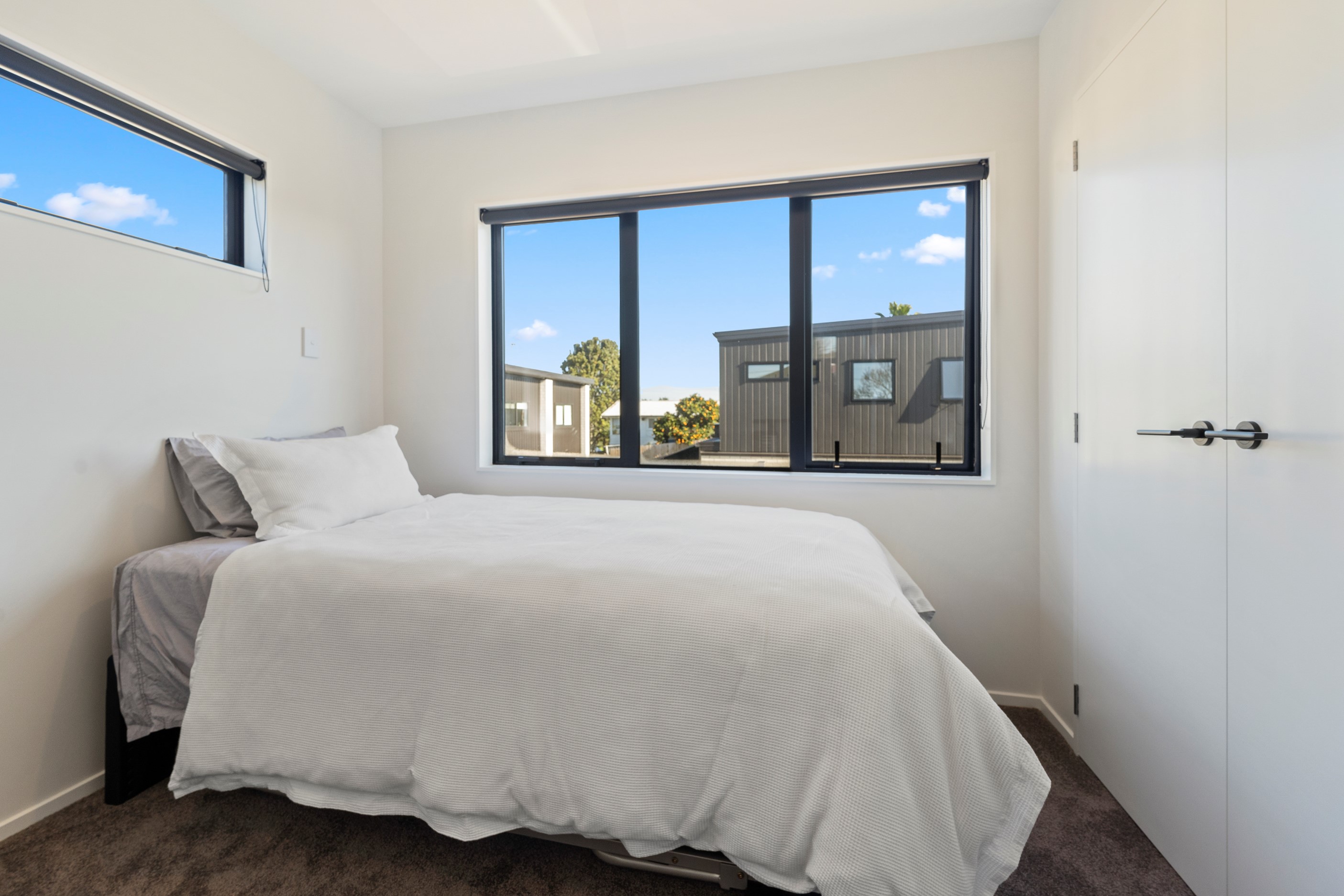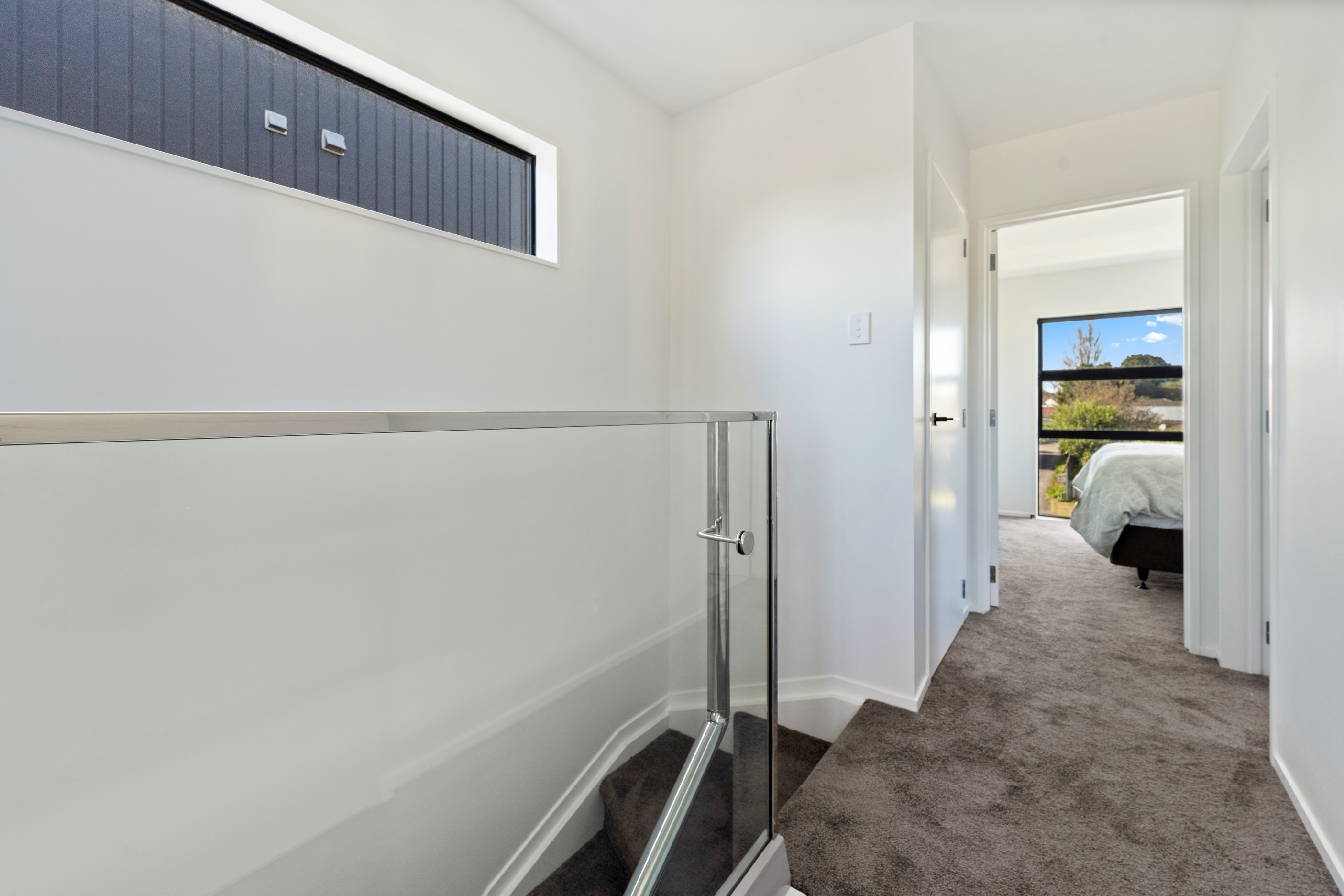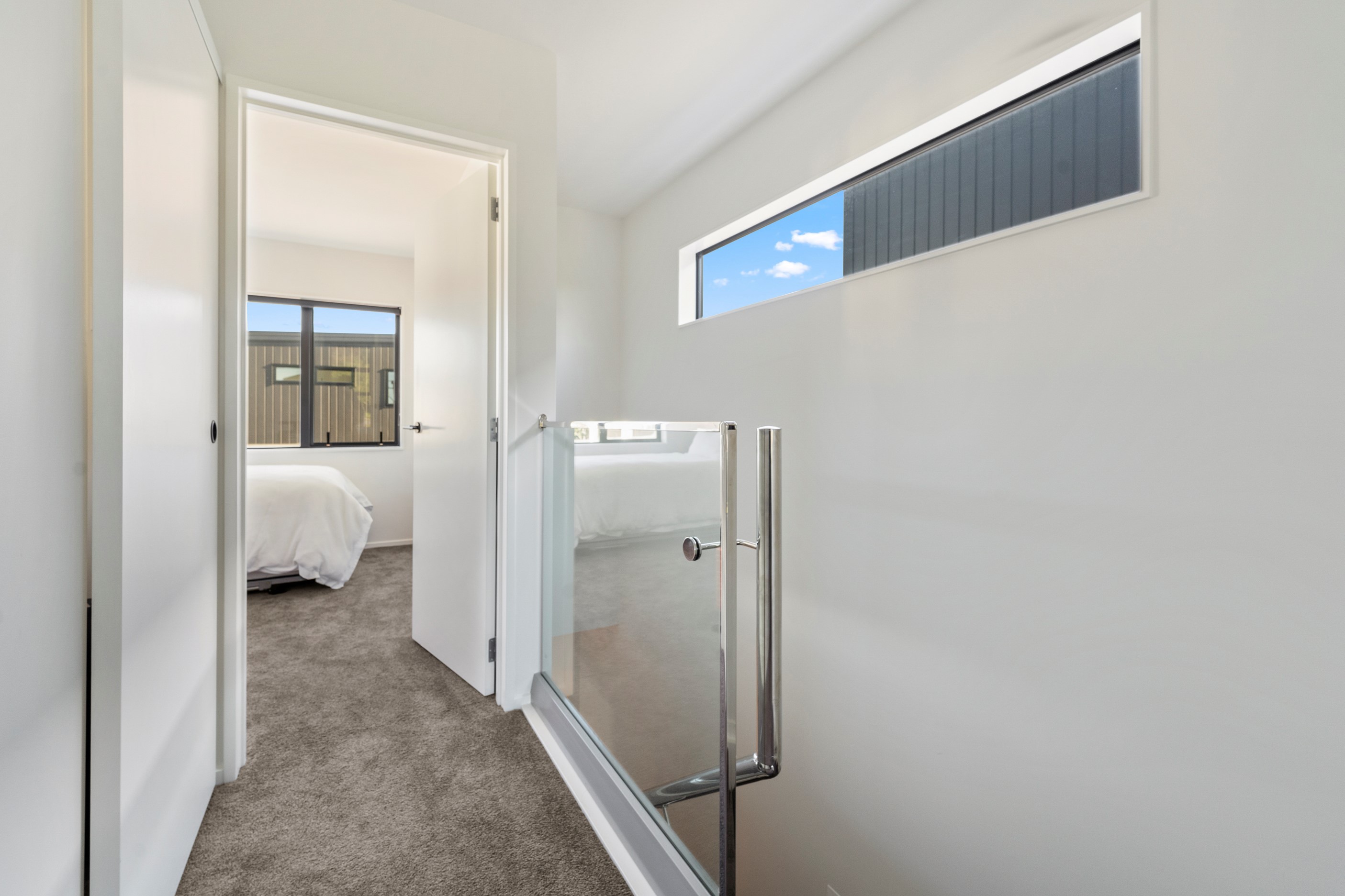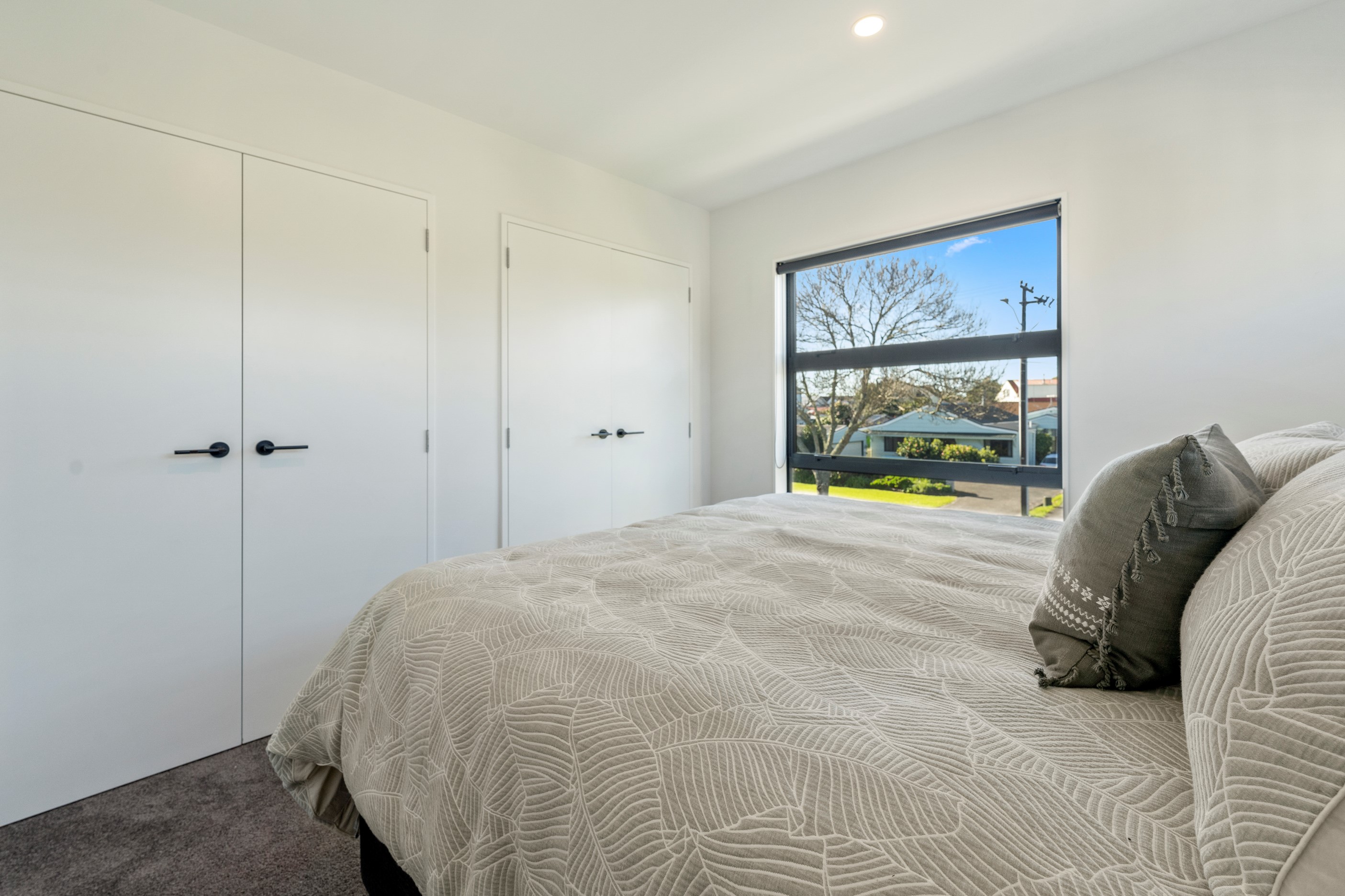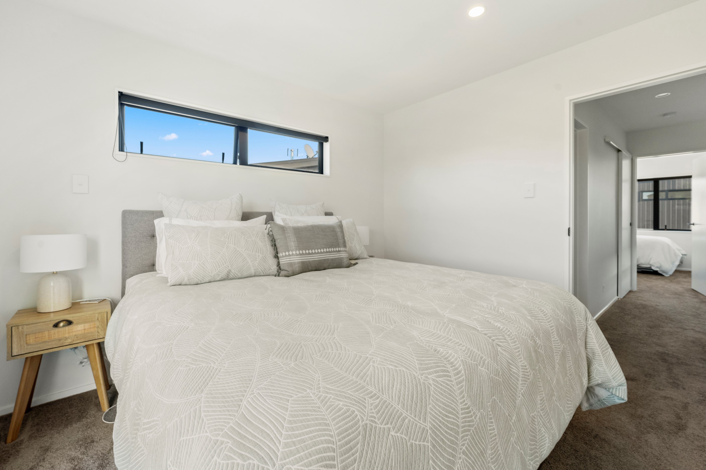There’s a lot more to this two-level architecturally designed home than initially meets the eye – and what meets the eye initially is very pleasing indeed. There’s street appeal in spades here, with an attractive combination of light brick, dark and light vertical cladding and a raking roofline framed in white. Angled vertical battens separate the dwelling from its neighbour, giving privacy but allowing the sun inside. The 76sqm footprint encompasses two bedrooms, one bathroom, an open-plan kitchen and living area, and it does so effortlessly thanks to smart spatial and interior design. Downstairs, crisp white walls pair with lovely light timber floors and upstairs, light grey carpet, creating a modern and minimalist feel throughout. Well-placed windows allow in plenty of natural light. The small, sleek kitchen has everything you need. The use of above-bench strip lighting and a pale palette make the space seem bigger. Eco-friendly features such as above-code insulation have helped these homes receive a very respectable 7 Homestar New Zealand Green Building Council rating, ensuring they are warm and dry.