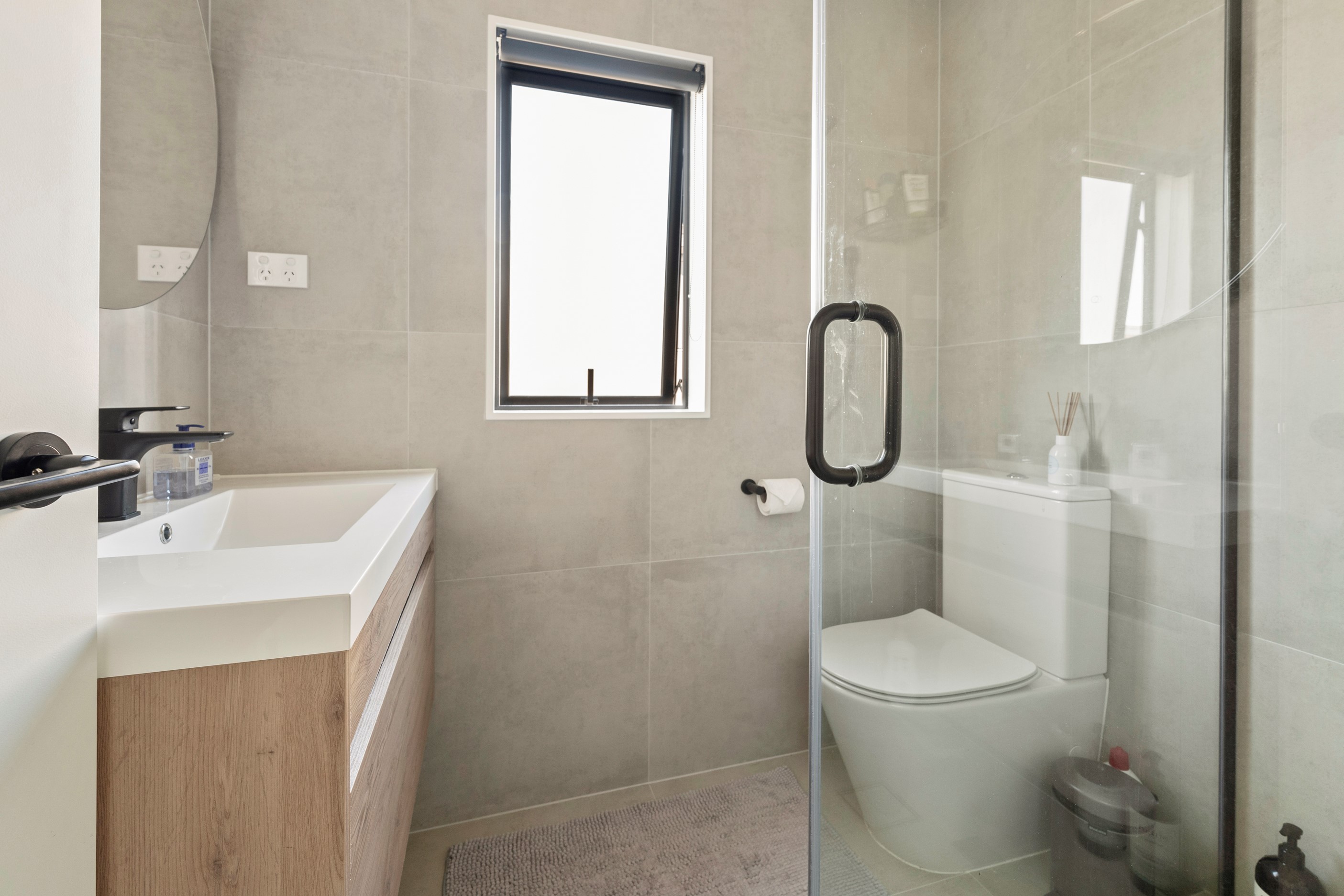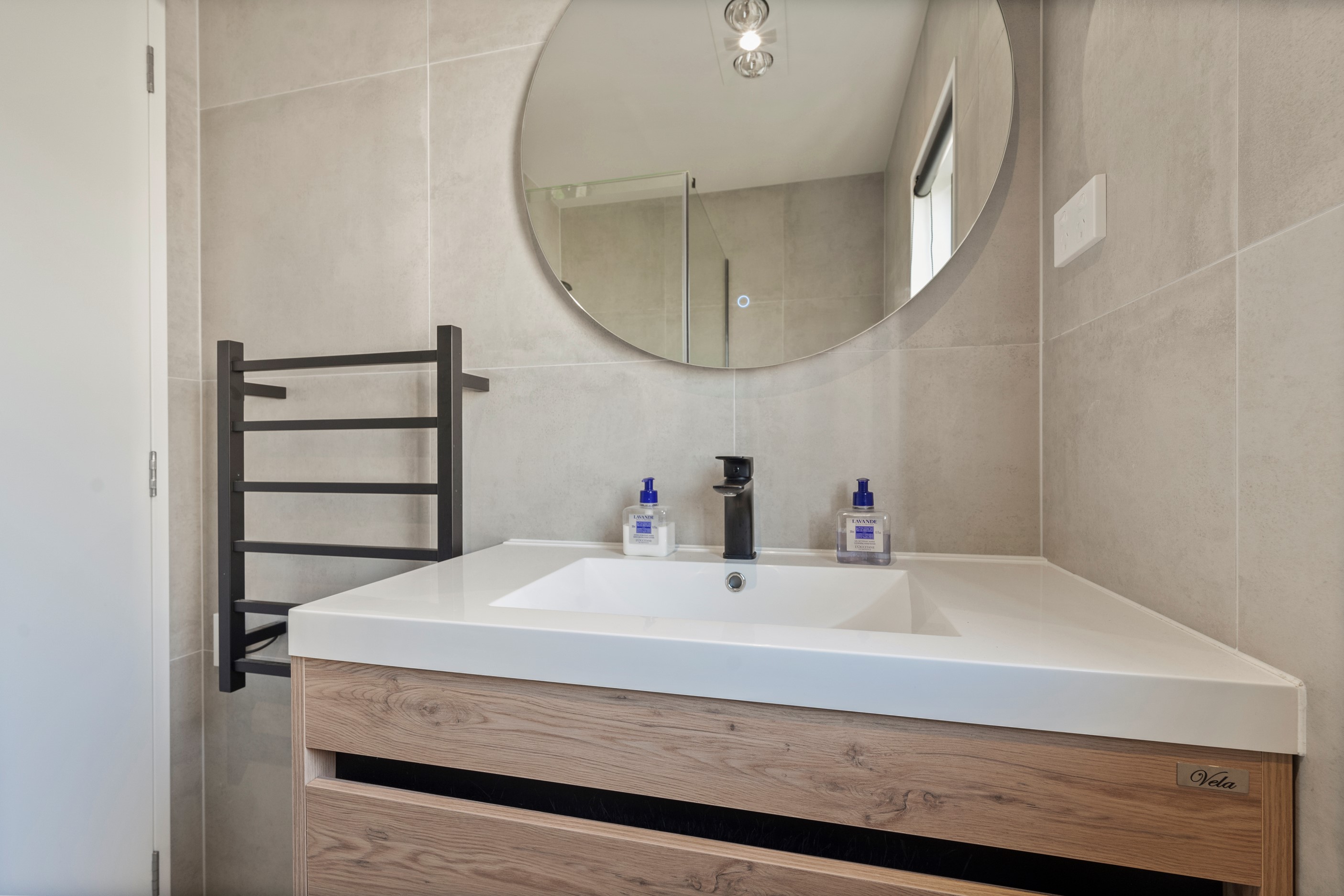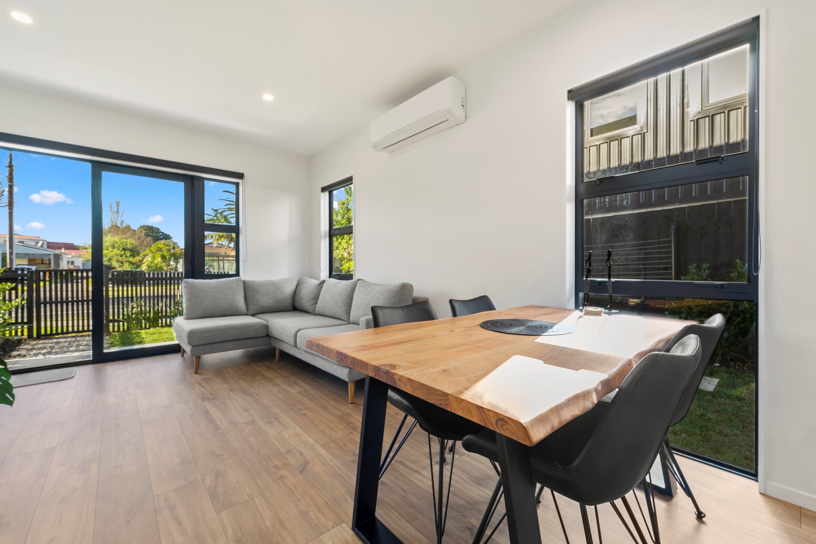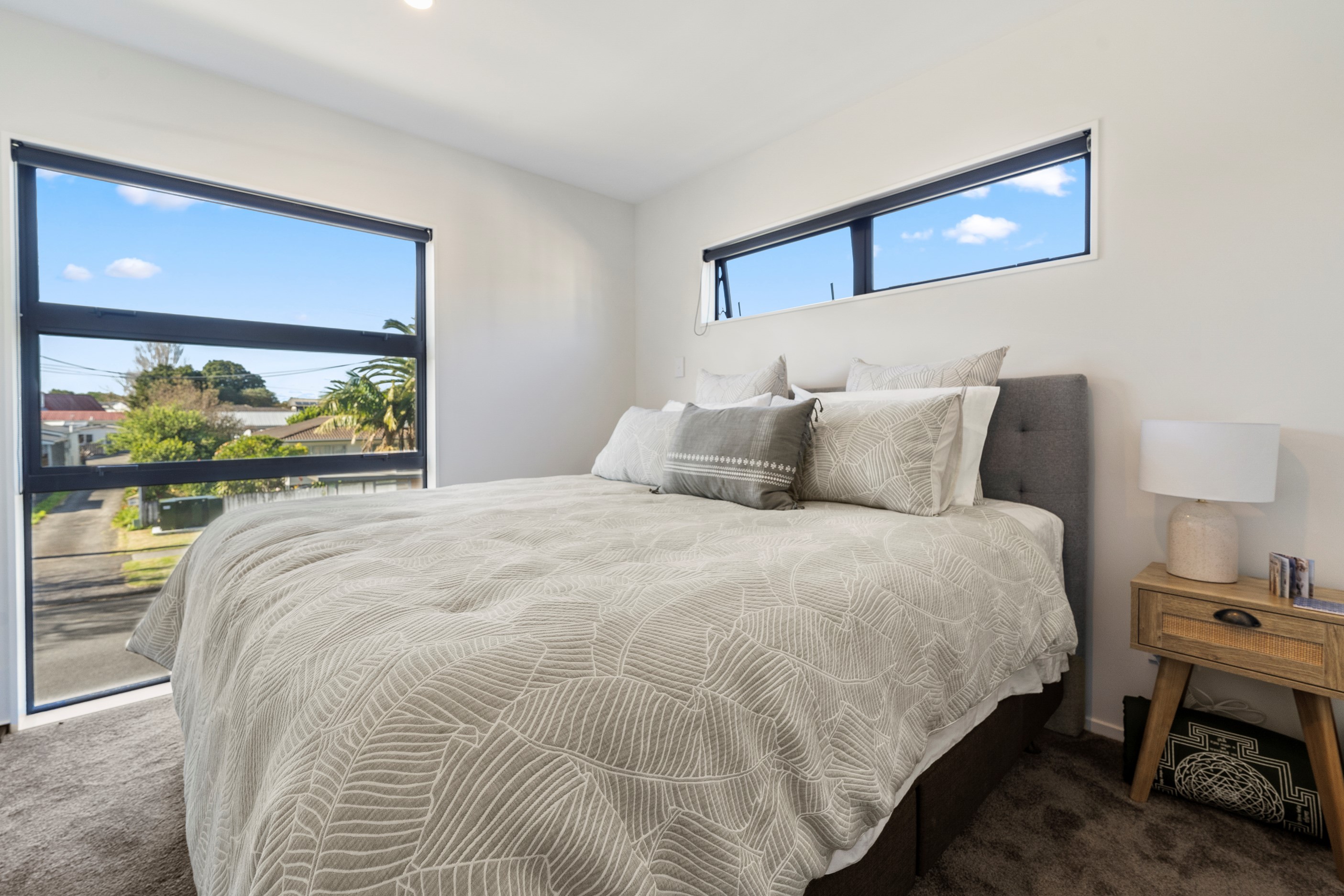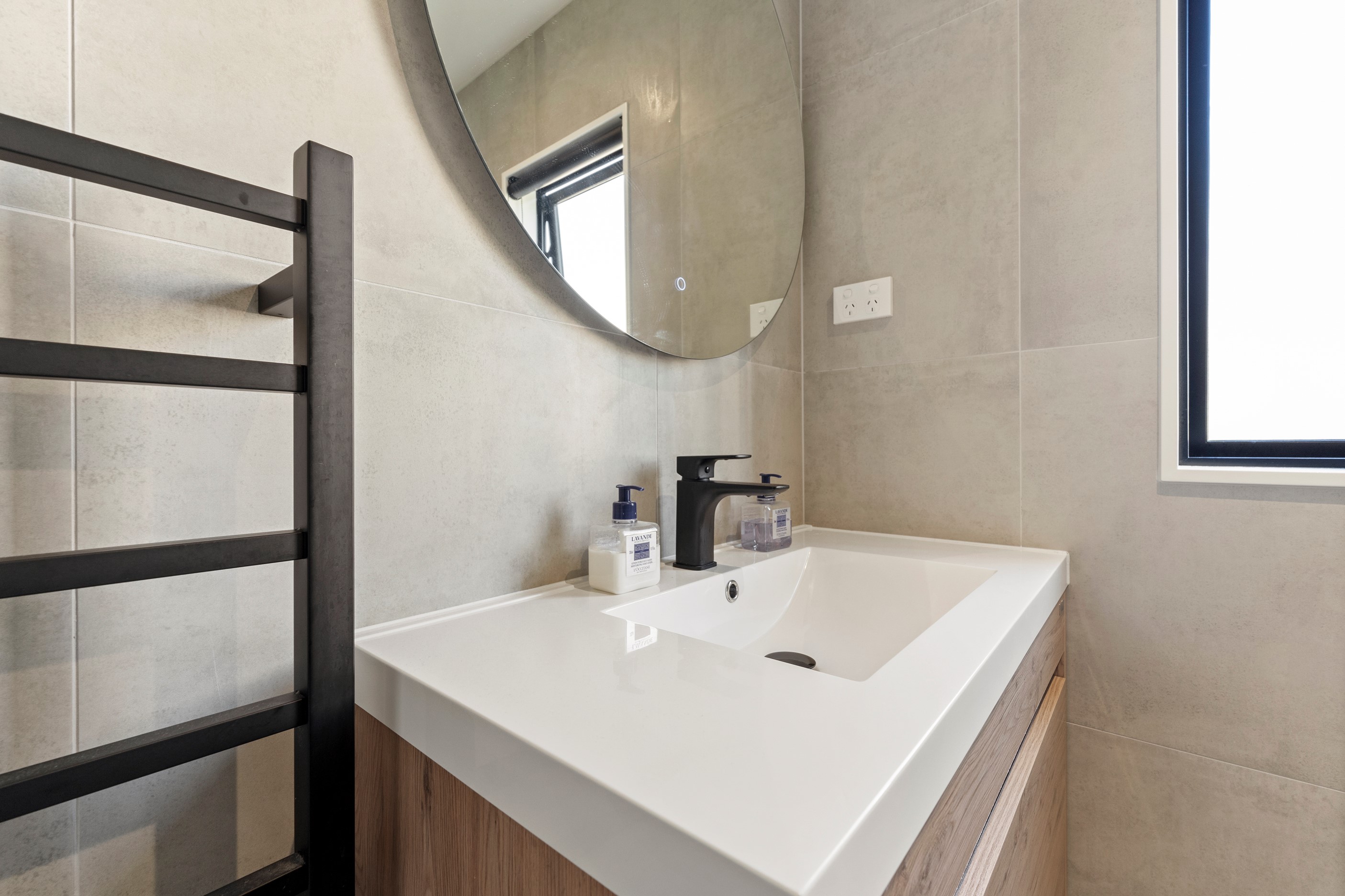 There’s a lot more to this two-level architecturally designed home than initially meets the eye – and what meets the eye initially is very pleasing indeed. There’s street appeal in spades here, with an attractive combination of light brick, dark and light vertical cladding and a raking roofline framed in white. Angled vertical battens separate the dwelling from its neighbour, giving privacy but allowing the sun inside. The 76sqm footprint encompasses two bedrooms, one bathroom, an open-plan kitchen and living area, and it does so effortlessly thanks to smart spatial and interior design. Downstairs, crisp white walls pair with lovely light timber floors and upstairs, light grey carpet, creating a modern and minimalist feel throughout. Well-placed windows allow in plenty of natural light. The small, sleek kitchen has everything you need. The use of above-bench strip lighting and a pale palette make the space seem bigger. Eco-friendly features such as above-code insulation have helped these homes receive a very respectable 7 Homestar New Zealand Green Building Council rating, ensuring they are warm and dry.