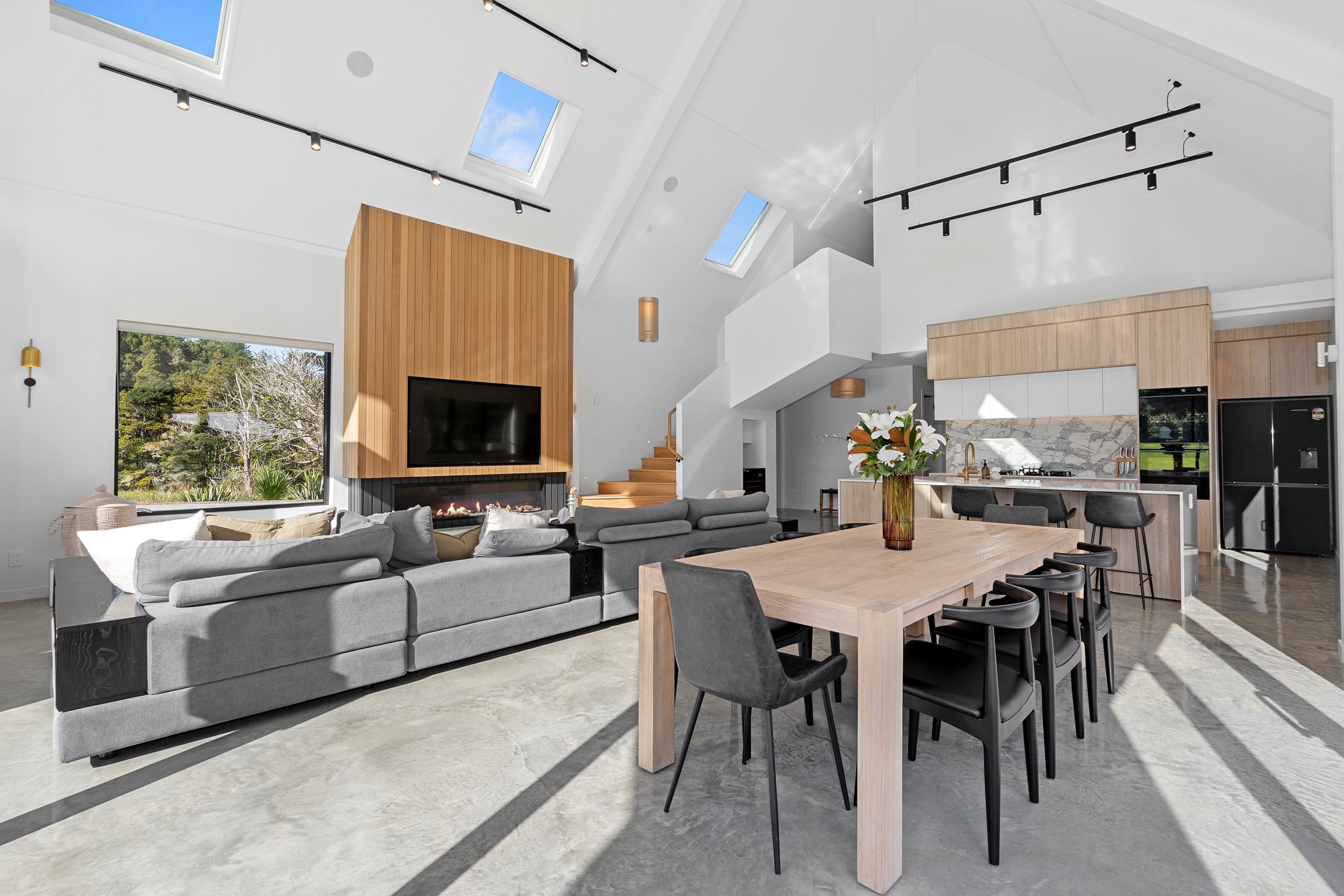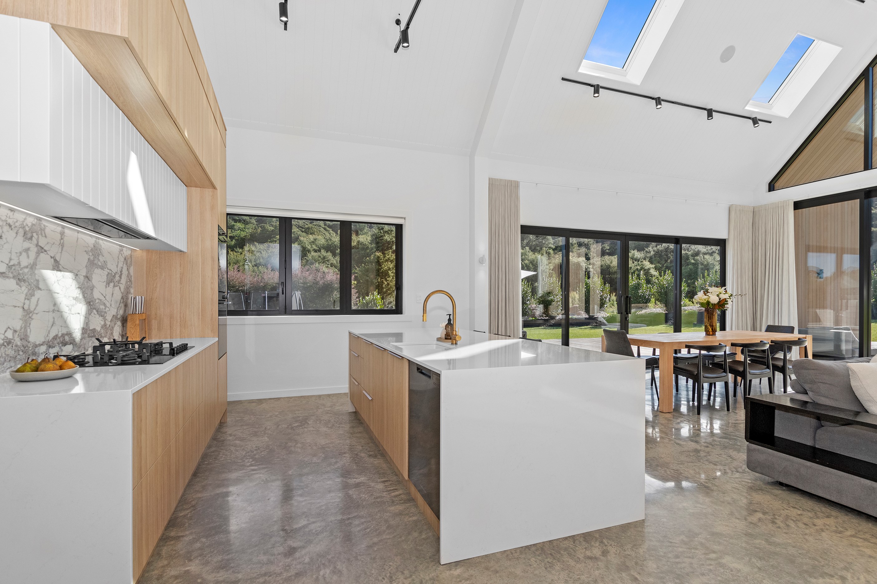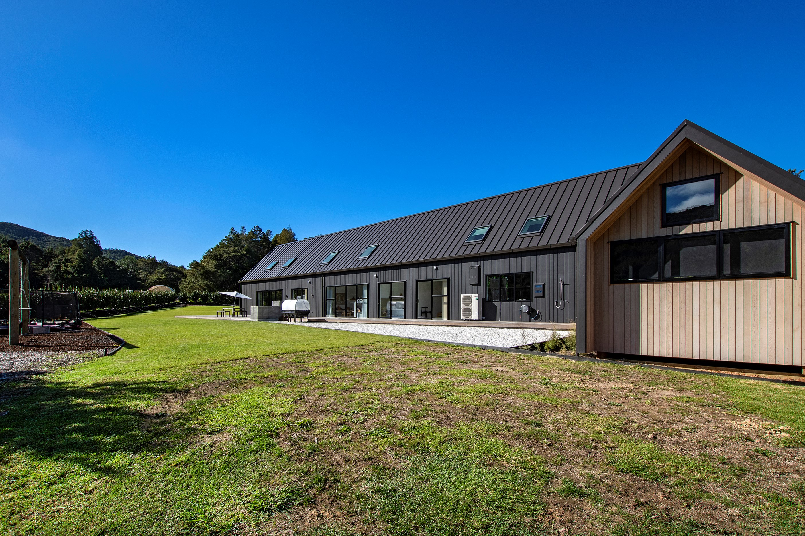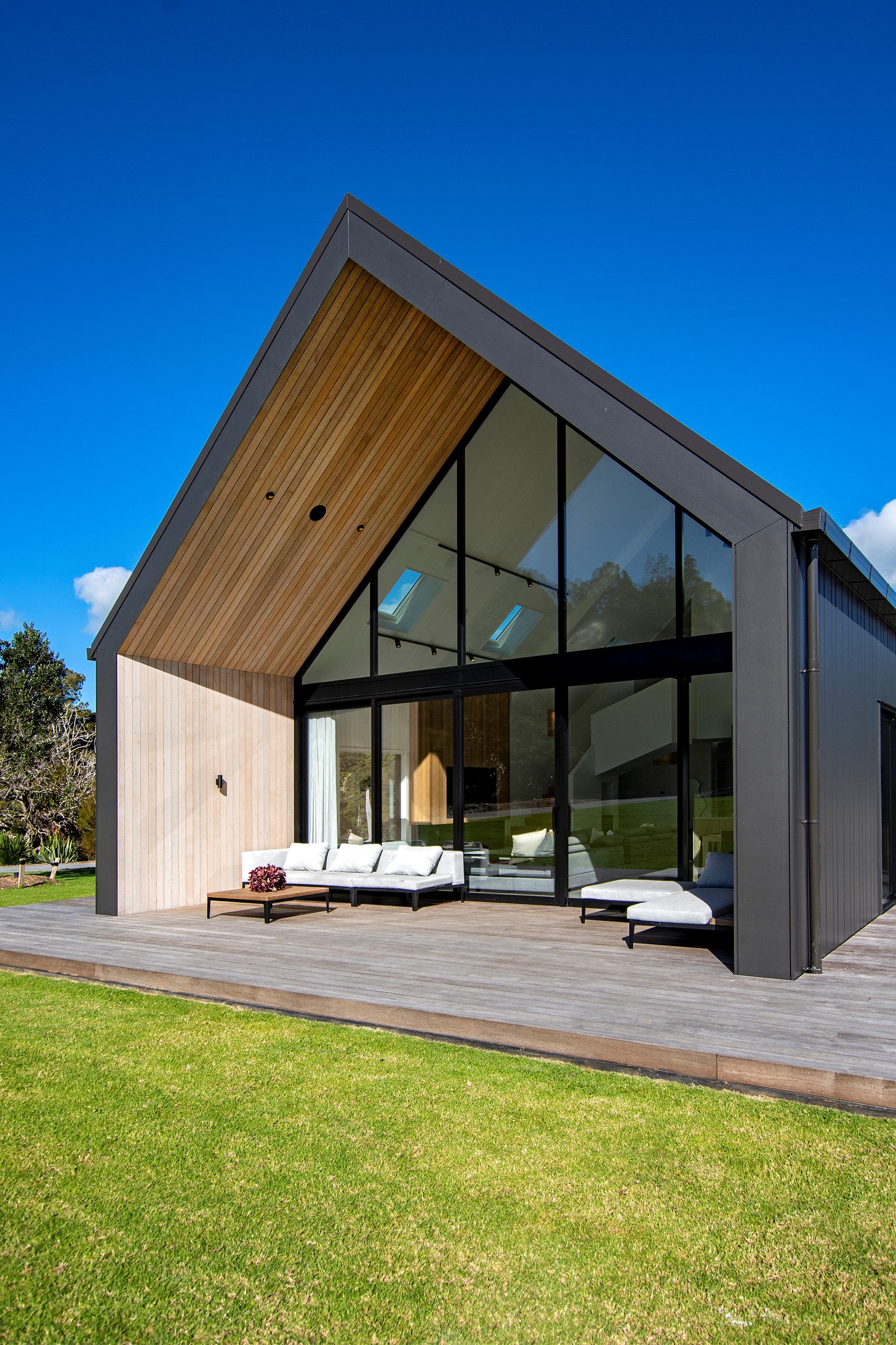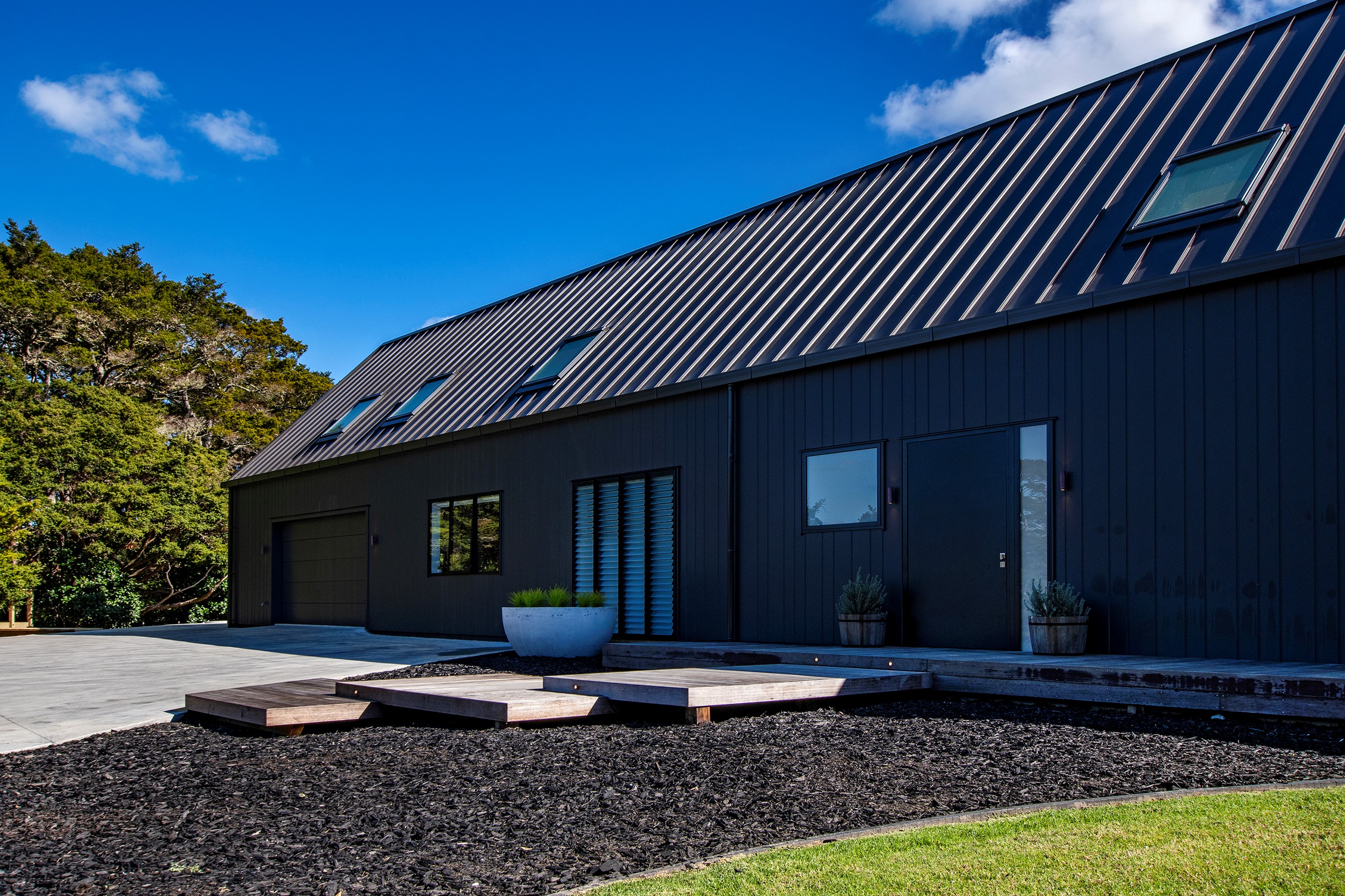 If ever a home demonstrated spare, restrained elegance this is it. A pure form and clean lines are hallmarks of this contemporary barn-style home. Stretching out long on a semi-rural site, the 400sqm five-bedroom builder’s house is cutting-edge and filled with luxury comforts. Lying between the bush line and Mangawhai Heads, the house is clad in dark weatherboards and the covered entertaining area is trimmed with vertical cedar. The hardwood decking, which flanks the majority of the house, and golden cedar are wonderful counterpoints to the almost all-black structure. Skylights punctuate the dark steel roof, bringing in an abundance of natural light. On the ground floor, ceilings in the living area soar to trace the 45-degree roofline. The main-bedroom suite, which has its own balcony, occupies most of the upstairs level. It’s a lovely sanctuary. Bedrooms and bathrooms– there are four – are split between the levels. An L-shaped living space flows naturally from the kitchen to the dining and lounge areas, and then out to the covered deck. This home has everything needed for family life, and never deviates from being a showcase for craftsmanship and sublime pared-back style.