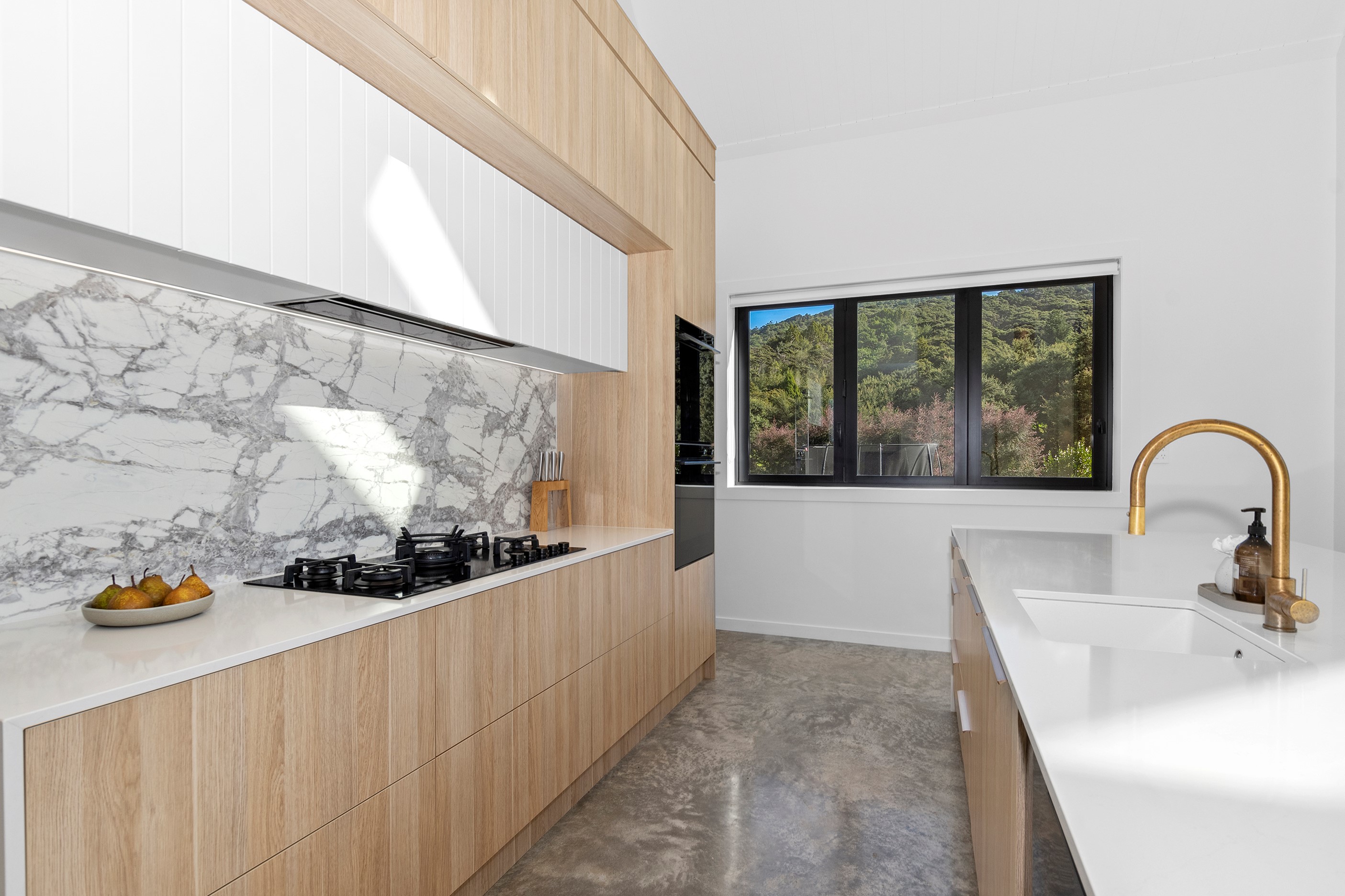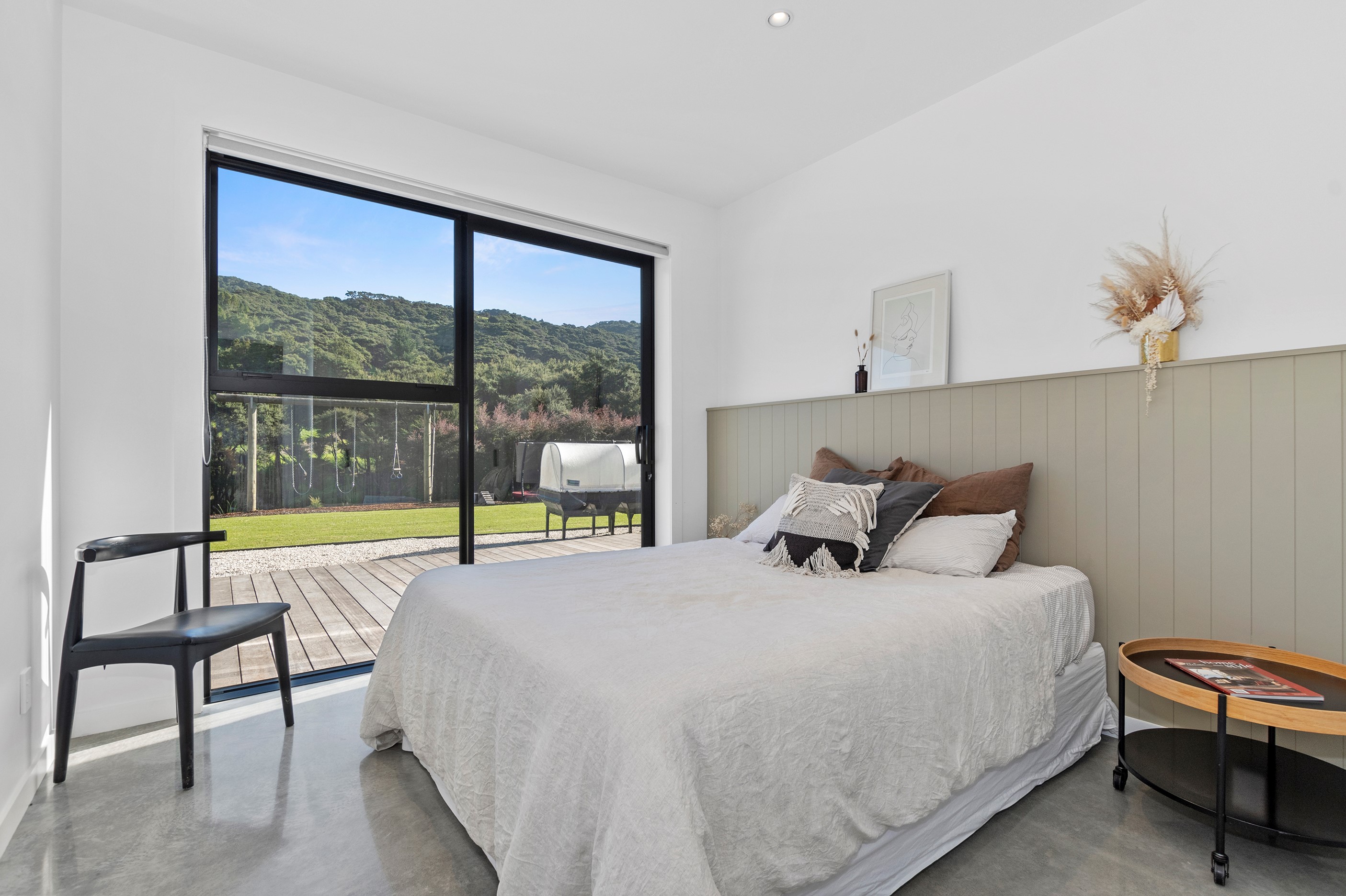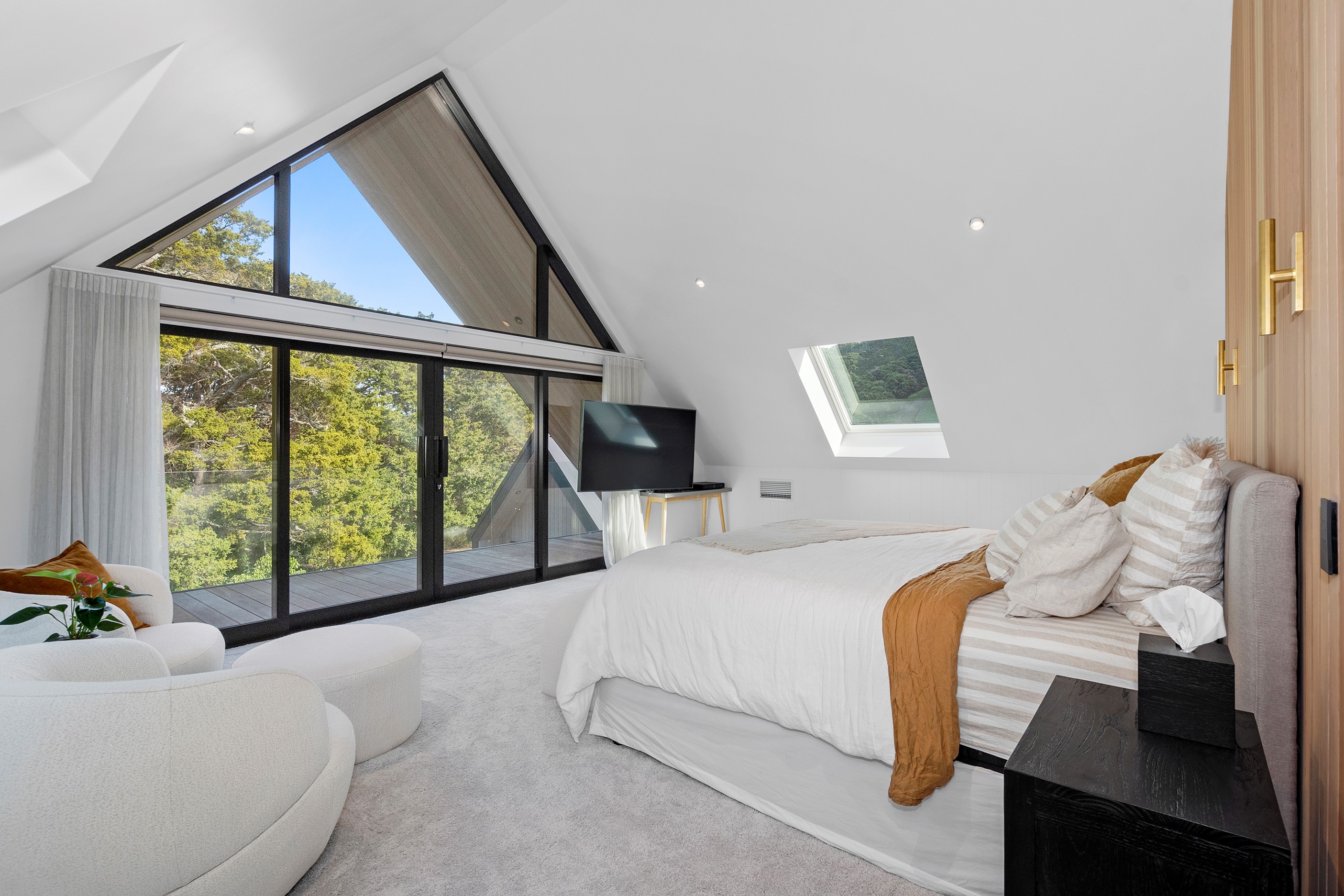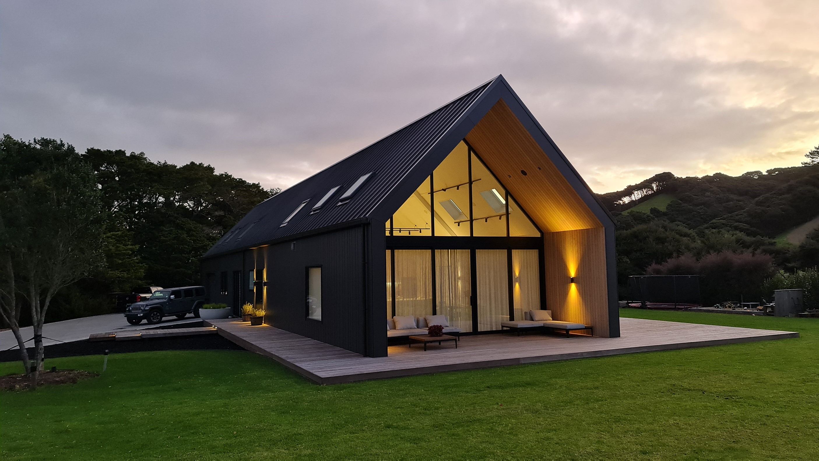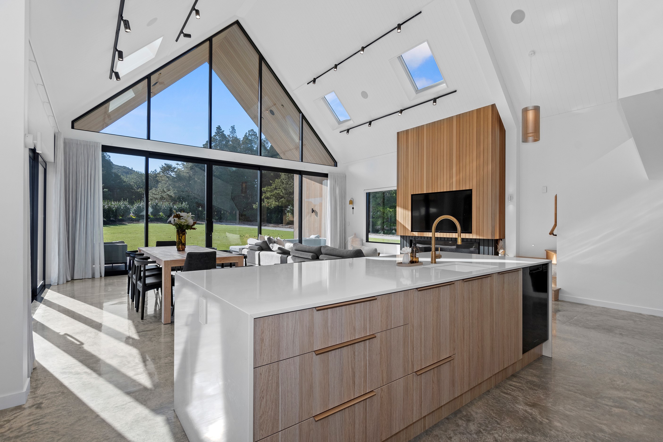 If ever a home demonstrated spare, restrained elegance this is it. A pure form and clean lines are hallmarks of this contemporary barn-style home. Stretching out long on a semi-rural site, the 400sqm five-bedroom builder’s house is cutting-edge and filled with luxury comforts. Lying between the bush line and Mangawhai Heads, the house is clad in dark weatherboards and the covered entertaining area is trimmed with vertical cedar. The hardwood decking, which flanks the majority of the house, and golden cedar are wonderful counterpoints to the almost all-black structure. Skylights punctuate the dark steel roof, bringing in an abundance of natural light. On the ground floor, ceilings in the living area soar to trace the 45-degree roofline. The main-bedroom suite, which has its own balcony, occupies most of the upstairs level. It’s a lovely sanctuary. Bedrooms and bathrooms– there are four – are split between the levels. An L-shaped living space flows naturally from the kitchen to the dining and lounge areas, and then out to the covered deck. This home has everything needed for family life, and never deviates from being a showcase for craftsmanship and sublime pared-back style.