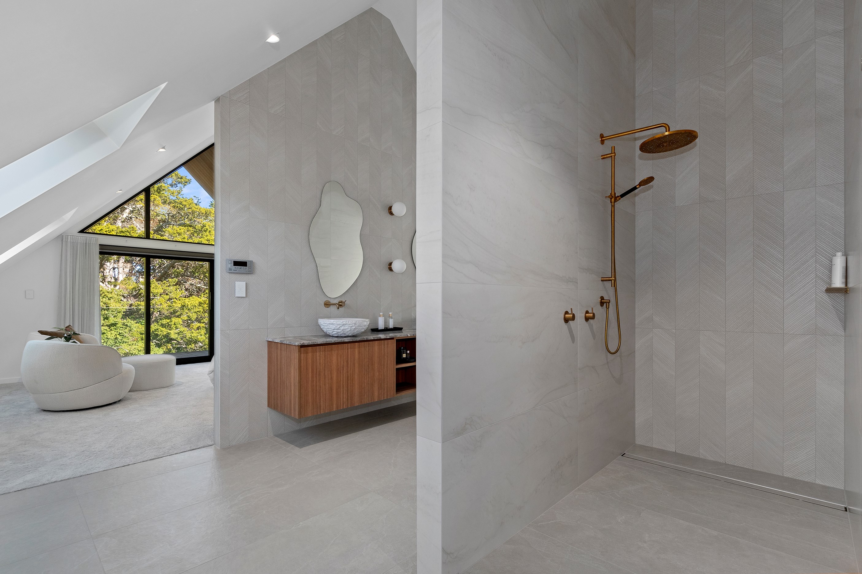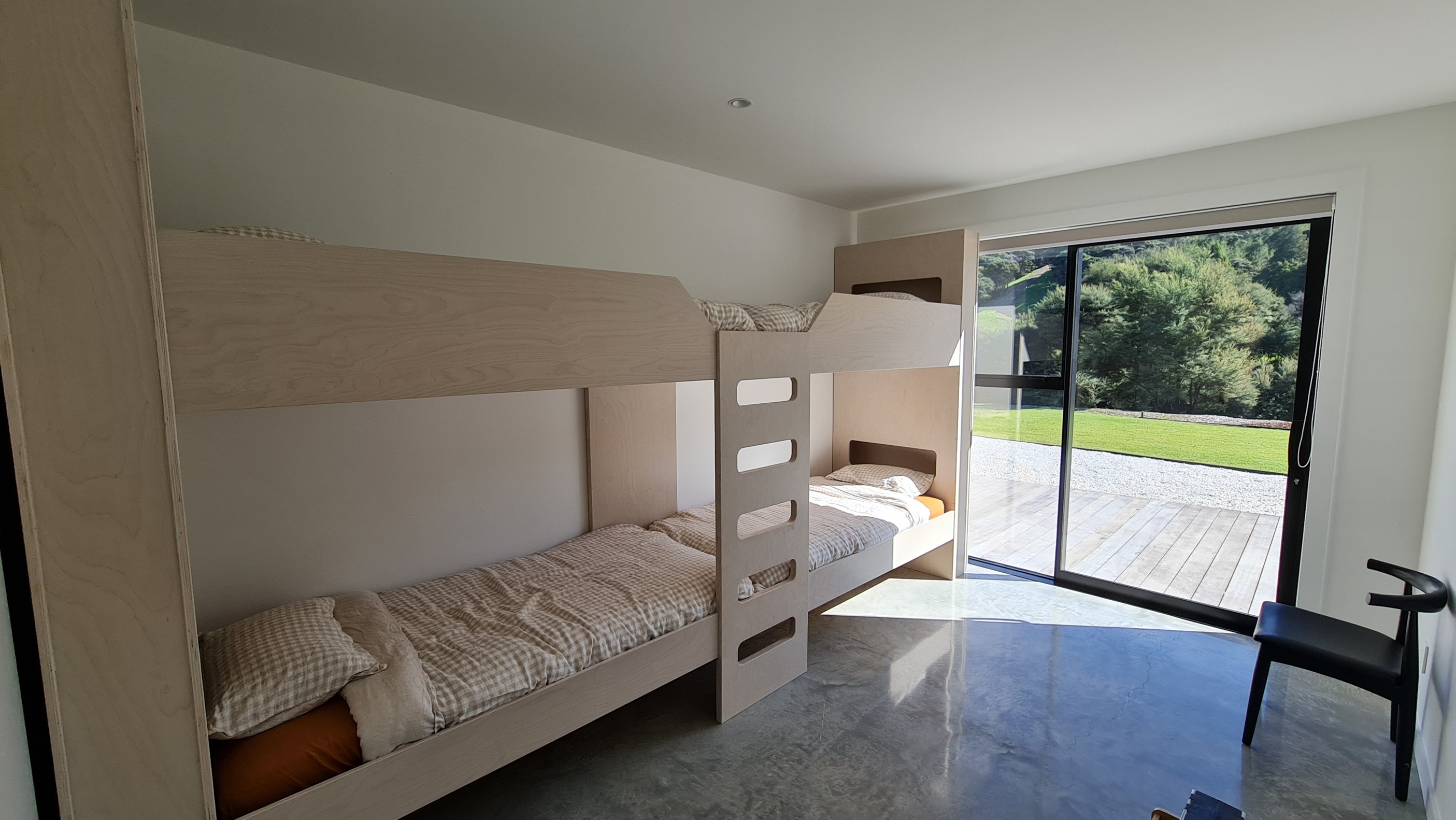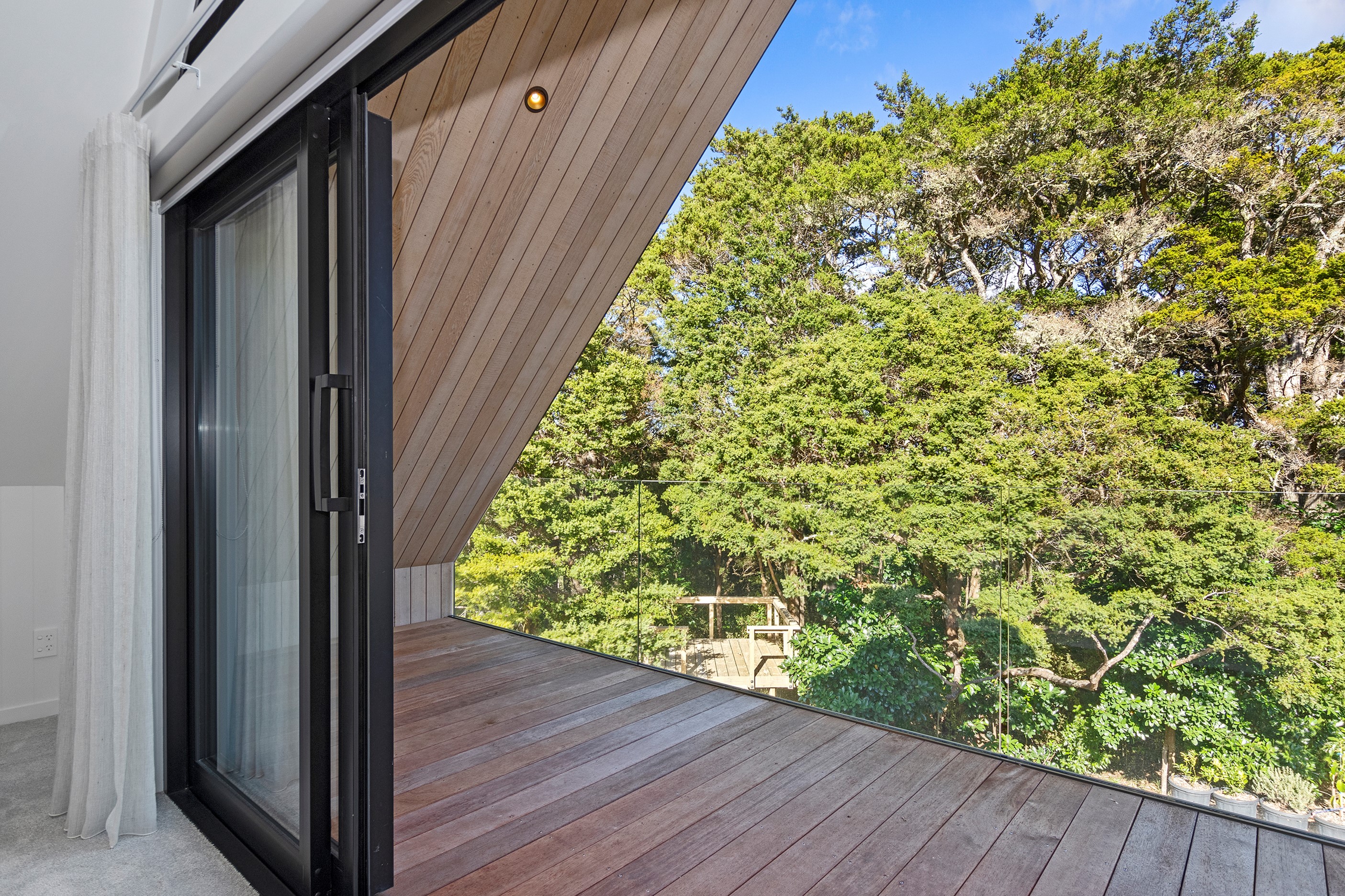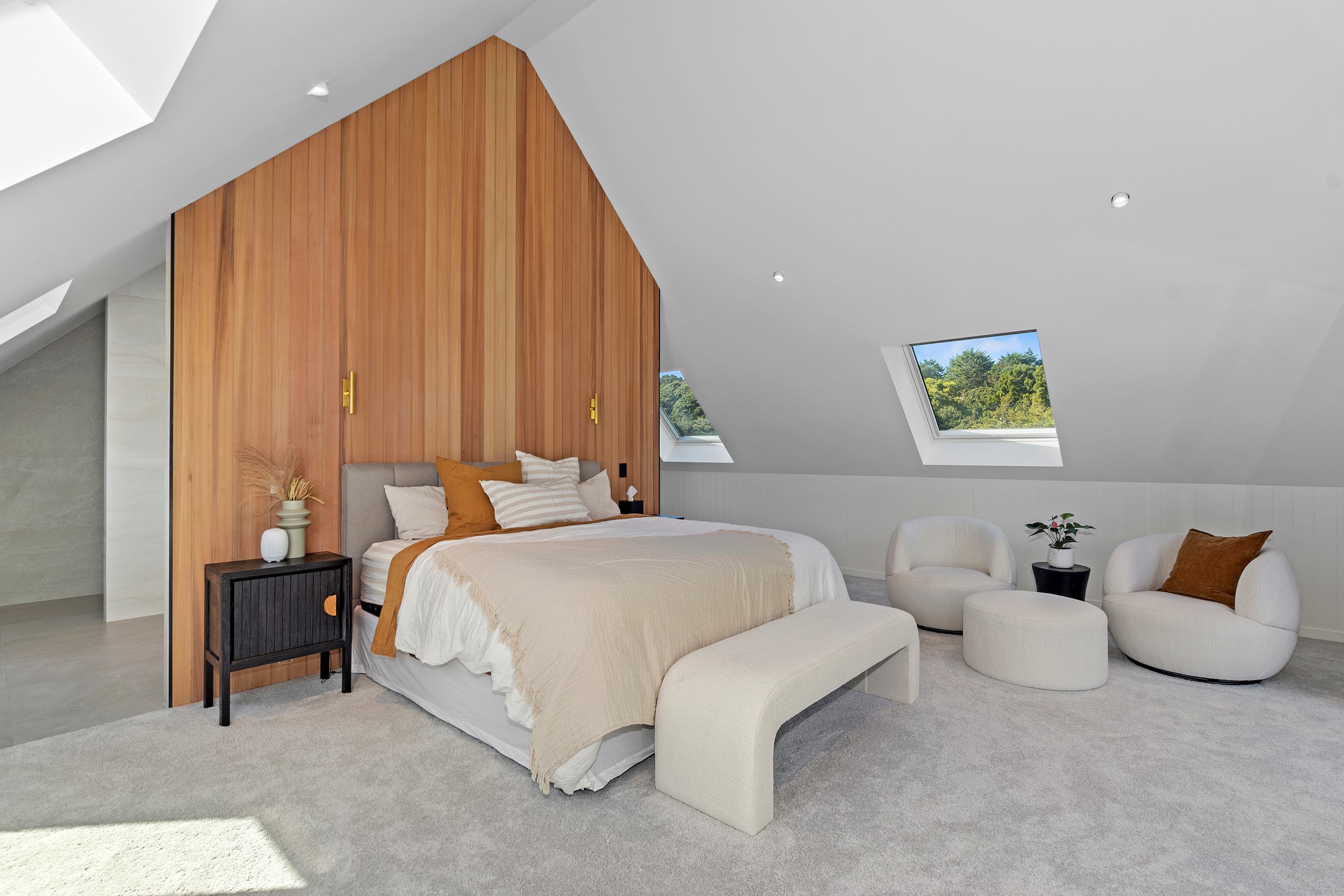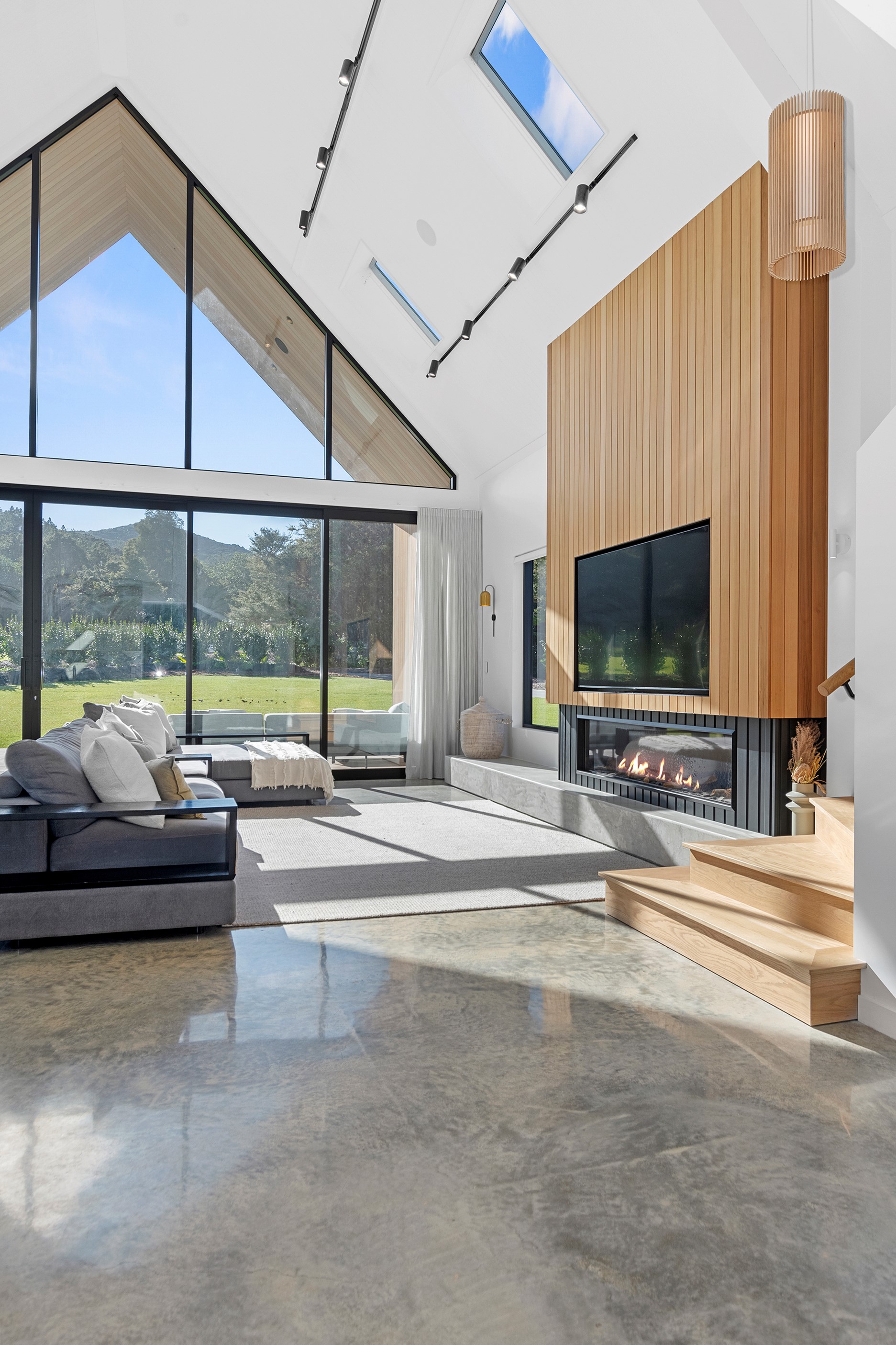 If ever a home demonstrated spare, restrained elegance this is it. A pure form and clean lines are hallmarks of this contemporary barn-style home. Stretching out long on a semi-rural site, the 400sqm five-bedroom builder’s house is cutting-edge and filled with luxury comforts. Lying between the bush line and Mangawhai Heads, the house is clad in dark weatherboards and the covered entertaining area is trimmed with vertical cedar. The hardwood decking, which flanks the majority of the house, and golden cedar are wonderful counterpoints to the almost all-black structure. Skylights punctuate the dark steel roof, bringing in an abundance of natural light. On the ground floor, ceilings in the living area soar to trace the 45-degree roofline. The main-bedroom suite, which has its own balcony, occupies most of the upstairs level. It’s a lovely sanctuary. Bedrooms and bathrooms– there are four – are split between the levels. An L-shaped living space flows naturally from the kitchen to the dining and lounge areas, and then out to the covered deck. This home has everything needed for family life, and never deviates from being a showcase for craftsmanship and sublime pared-back style.